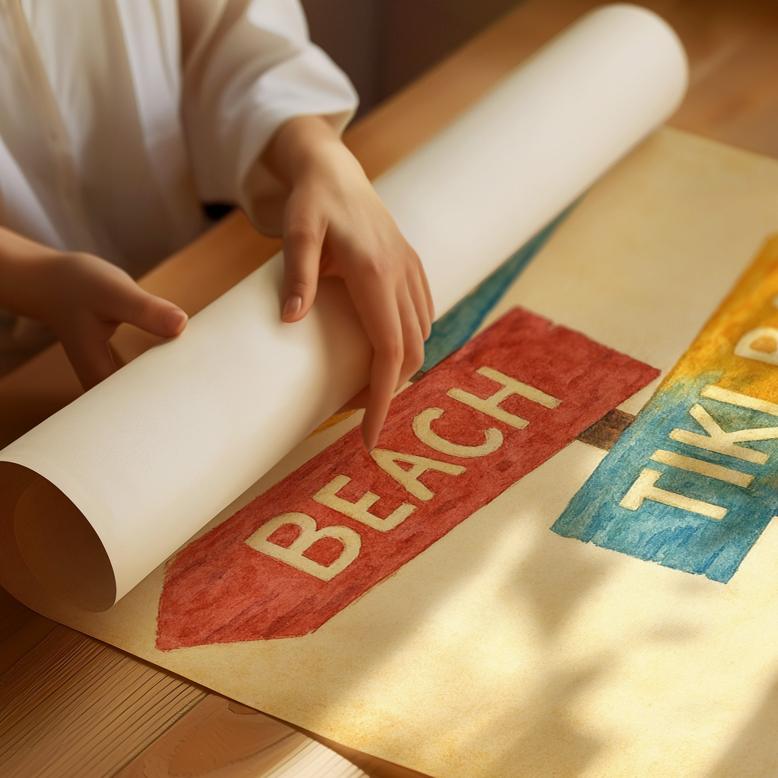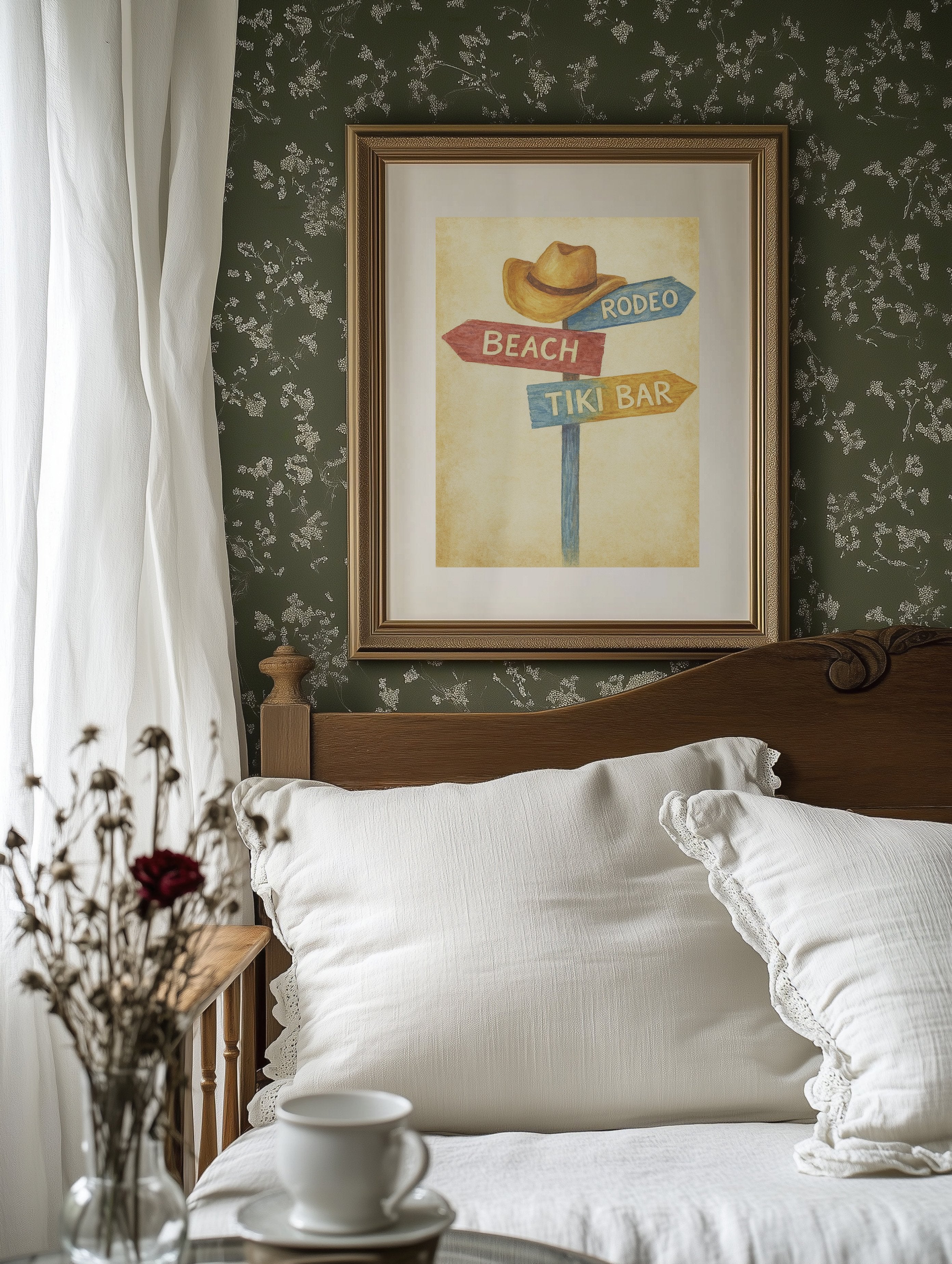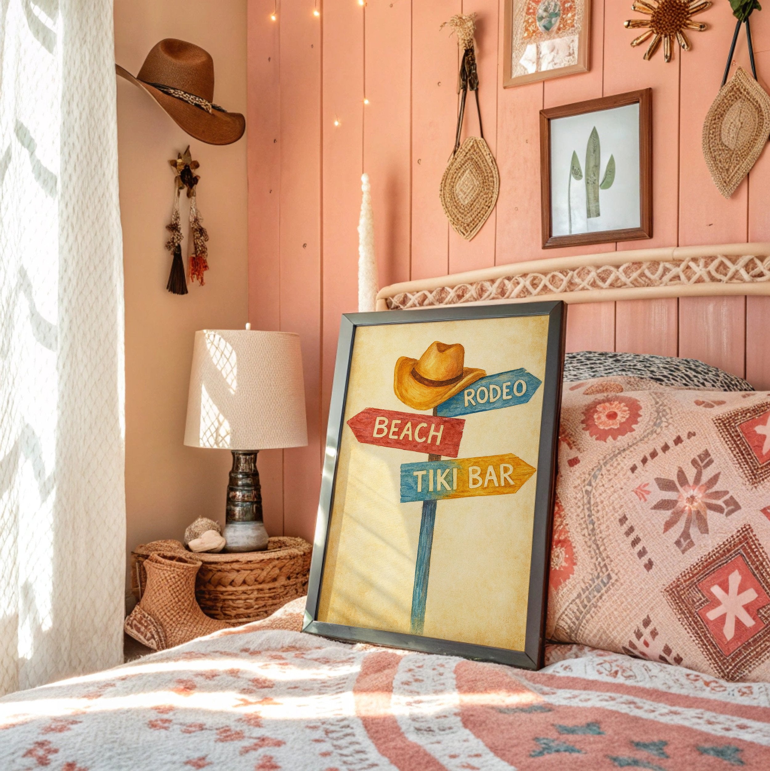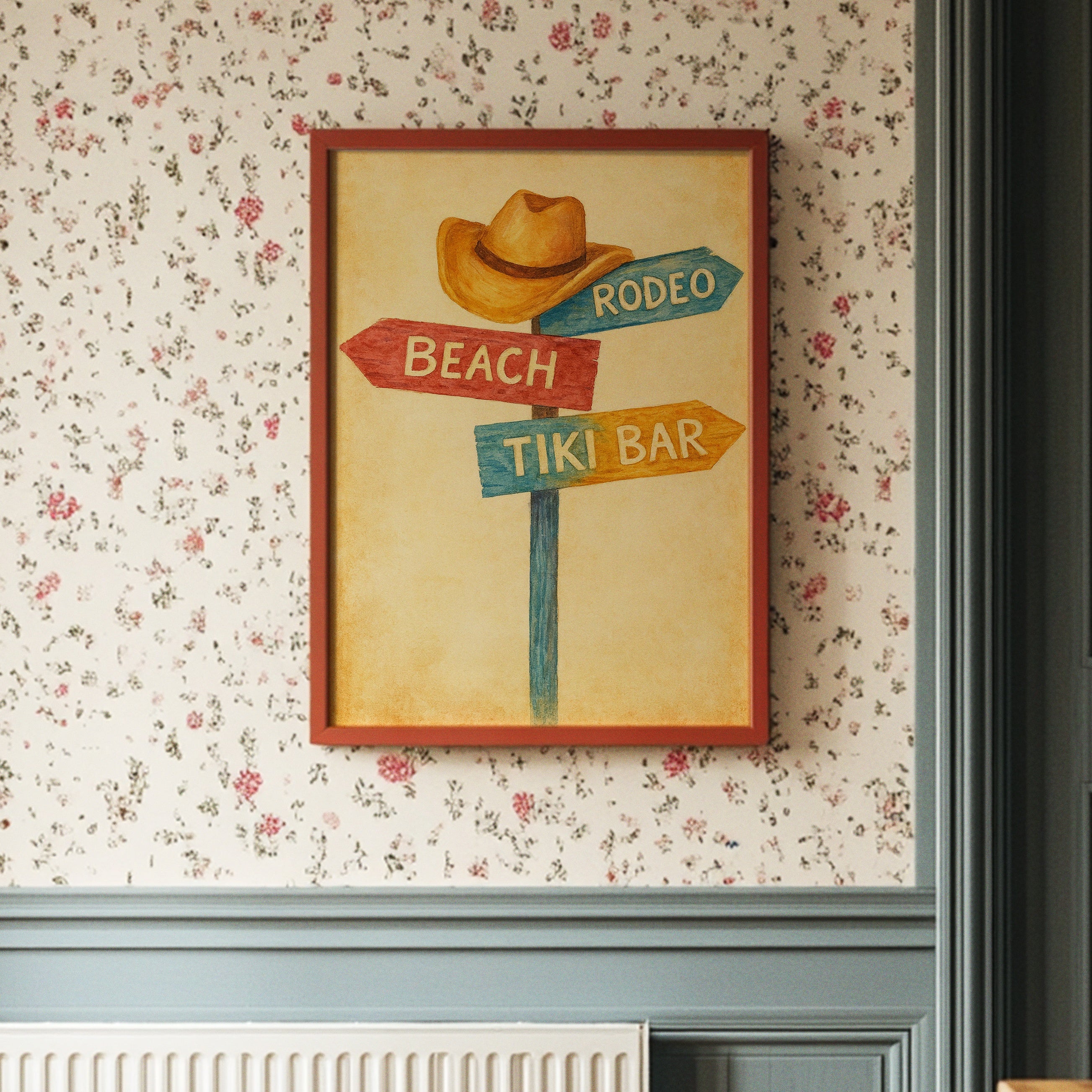 Rustic charm meets carefree wanderlust in this inviting scene where paths diverge toward distant pleasures. The weathered signpost pointing to ""Beach,"" ""Rodeo,"" and ""Tiki Bar"" captures that delicious moment of possibility, rendered in warm, nostalgic hues against a sun-faded background. The surrounding space complements the artwork perfectly weathered wood planking, warm leather, and desert touches create a harmonious blend of Western comfort and coastal ease. This piece brings playful direction to a home office, vacation rental, or any space where you dream of your next escape.