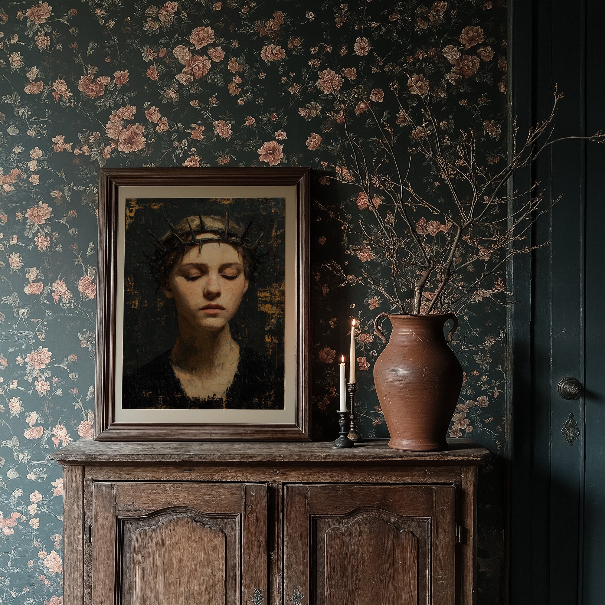 Stillness hangs in the air as closed eyes turn inward, seeking peace amid pain. The portrait captures a moment of profound introspection, where muted earth tones and textured brushstrokes create a haunting dialogue between light and shadow. Golden accents break through the darkness like memories trying to surface through troubled waters. This striking piece commands attention in a minimalist living space, creating a powerful focal point against dark walls where sunlight can dance across its contemplative surface.