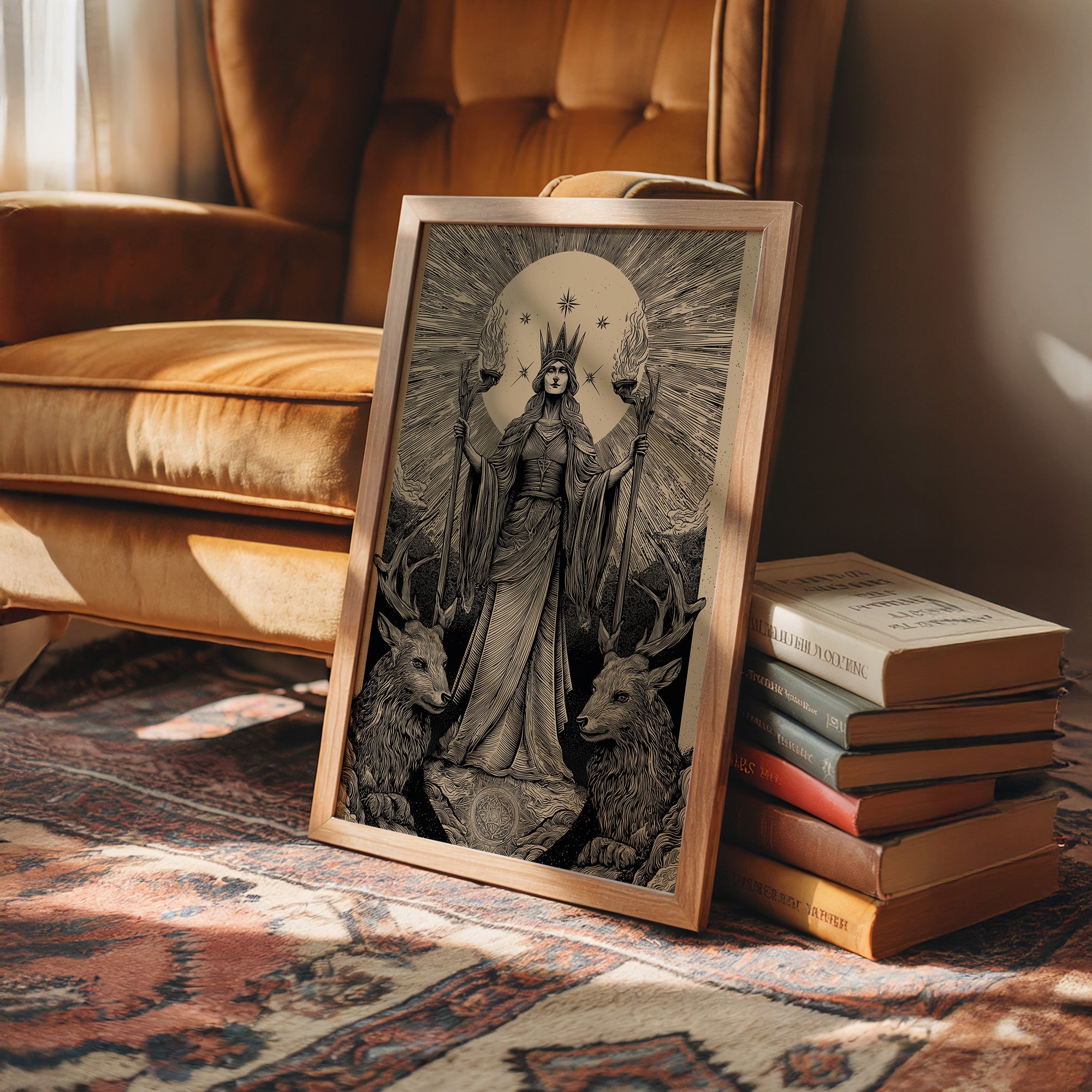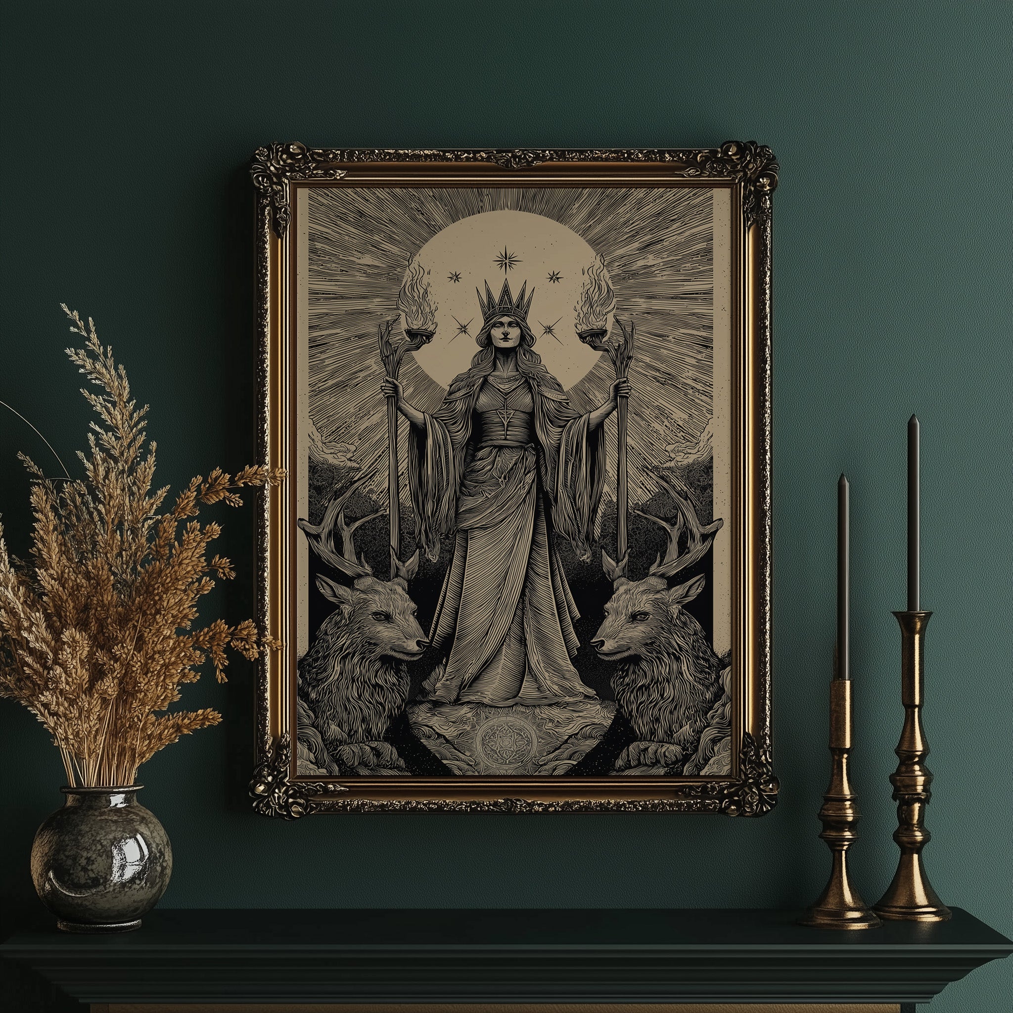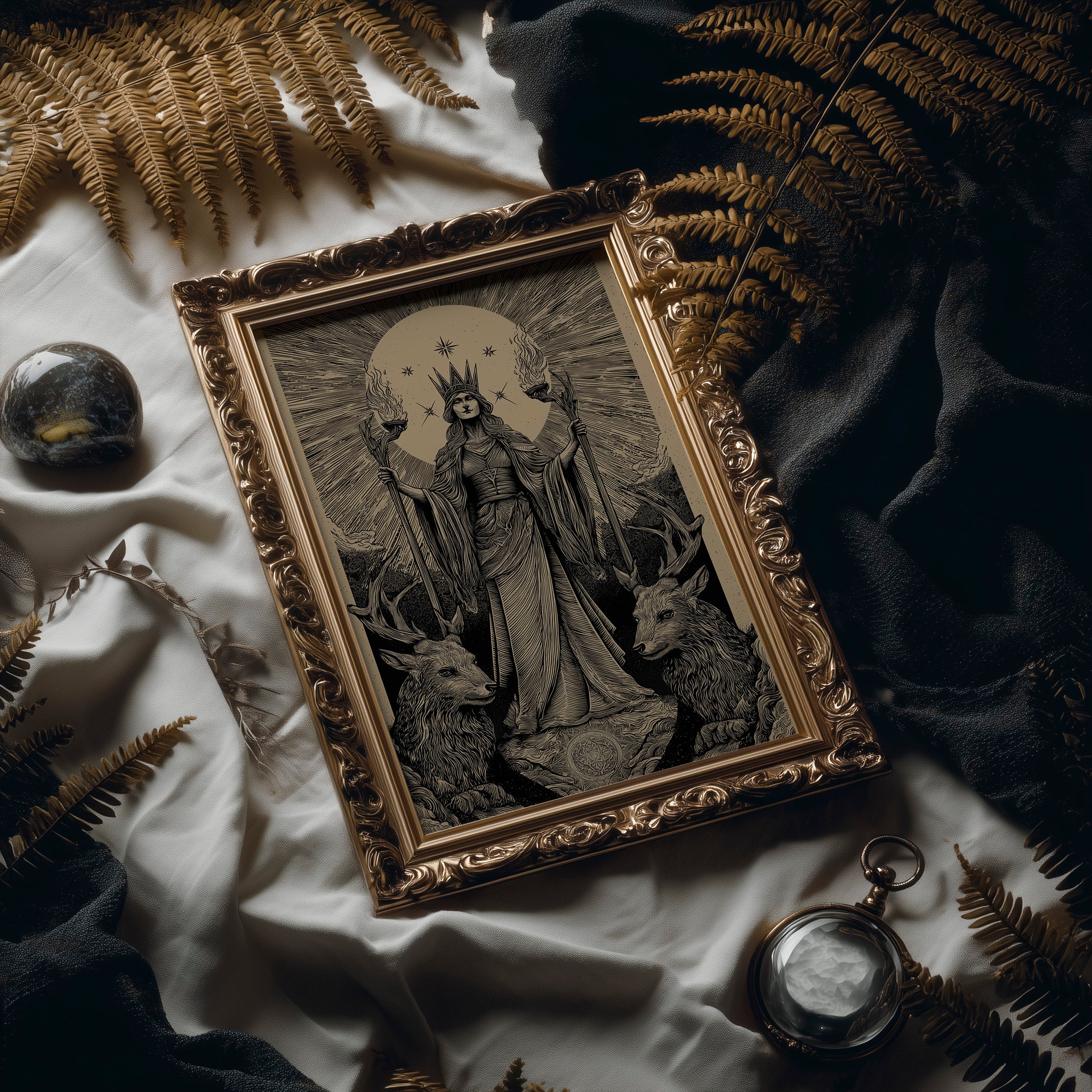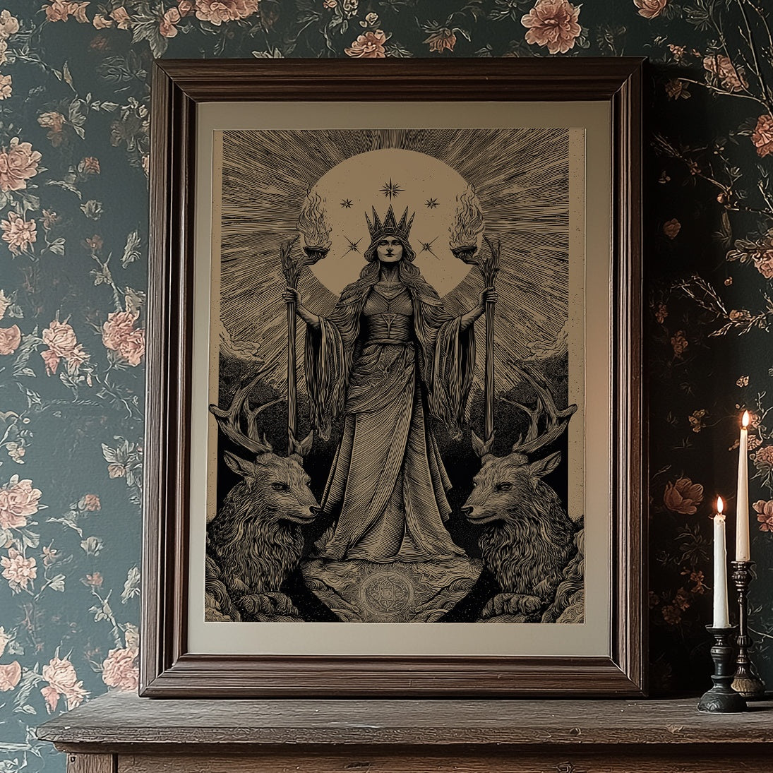 Ancient power radiates from this monochromatic illustration, where a crowned figure stands in solemn authority between two watchful stags. Fine linework creates an ethereal glow behind the subject, with celestial stars punctuating the cosmic backdrop. The detailed etching style reveals flowing robes, antlered guardians, and a commanding presence that bridges earthly and mystical realms.