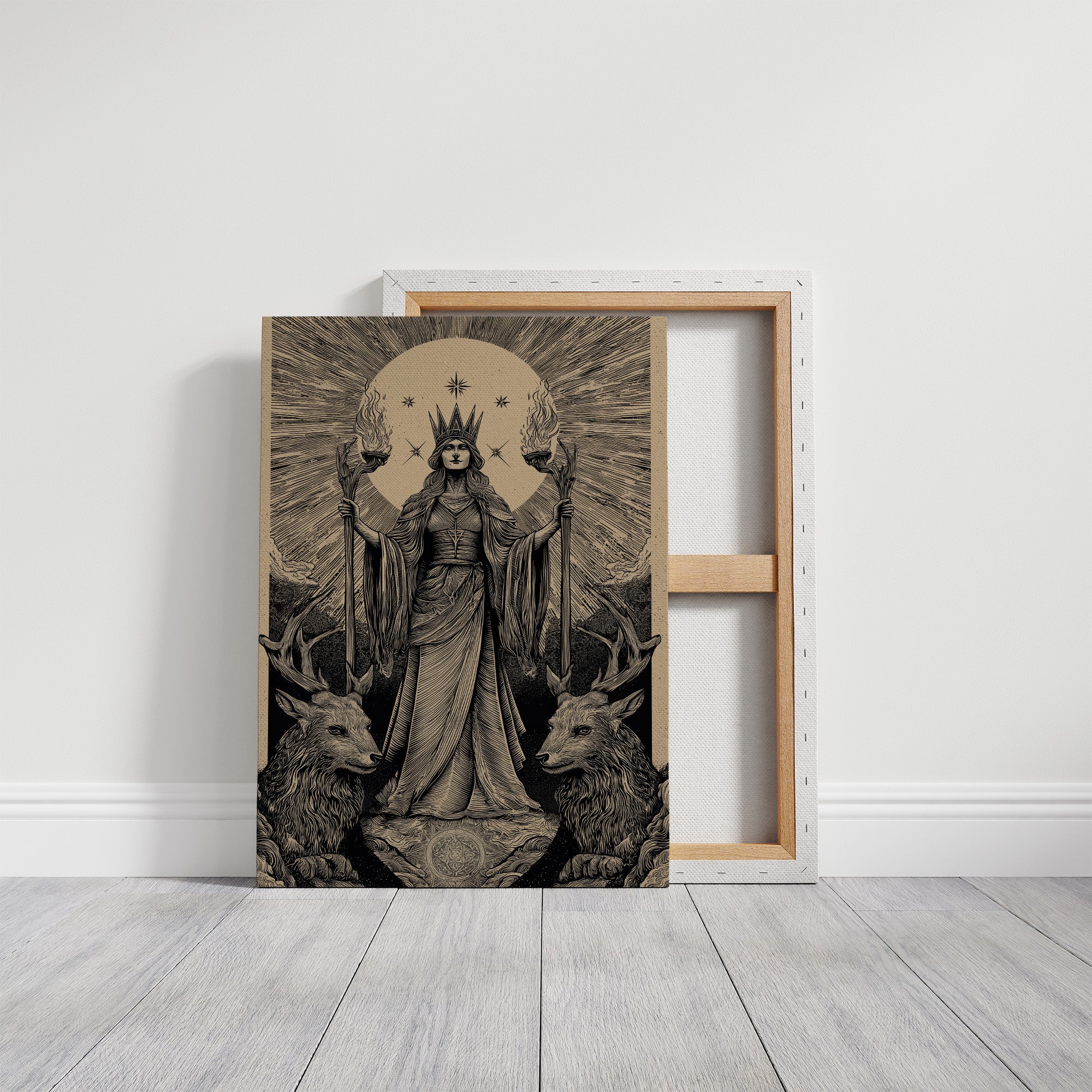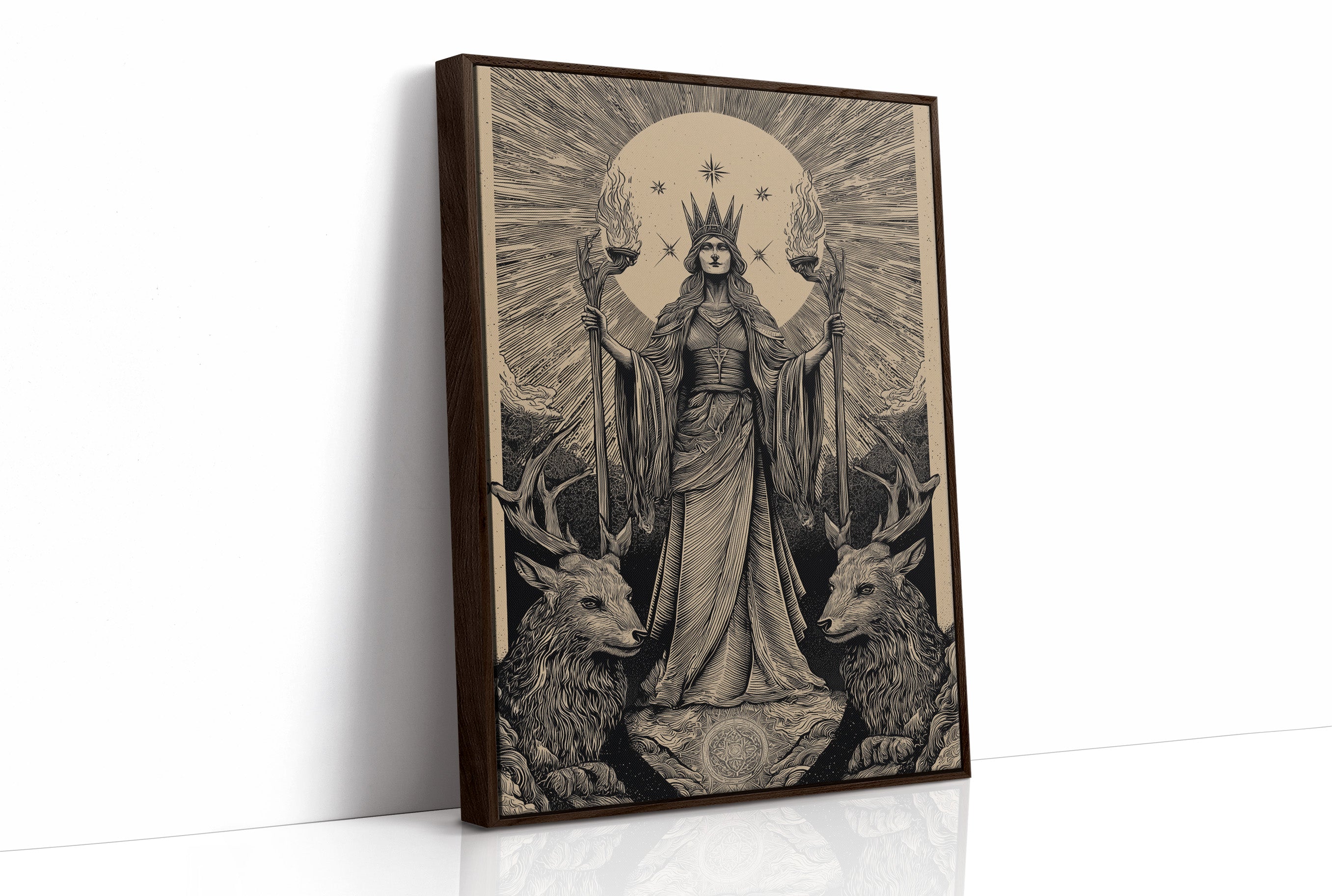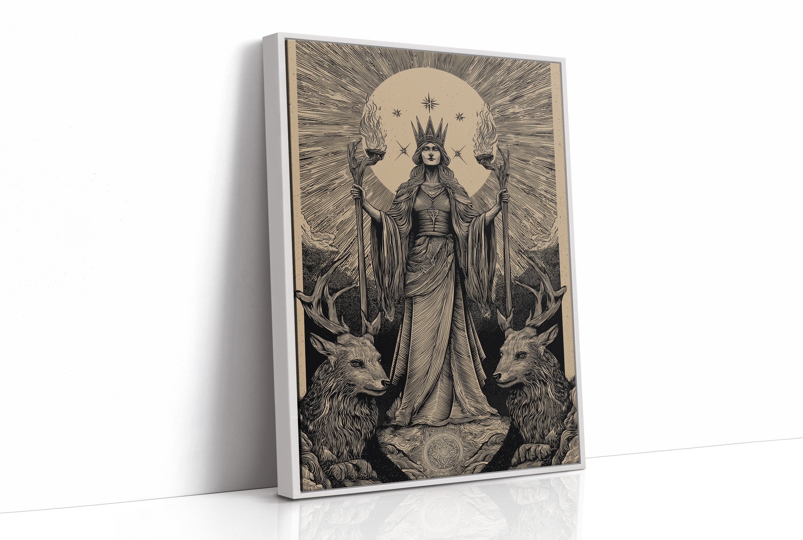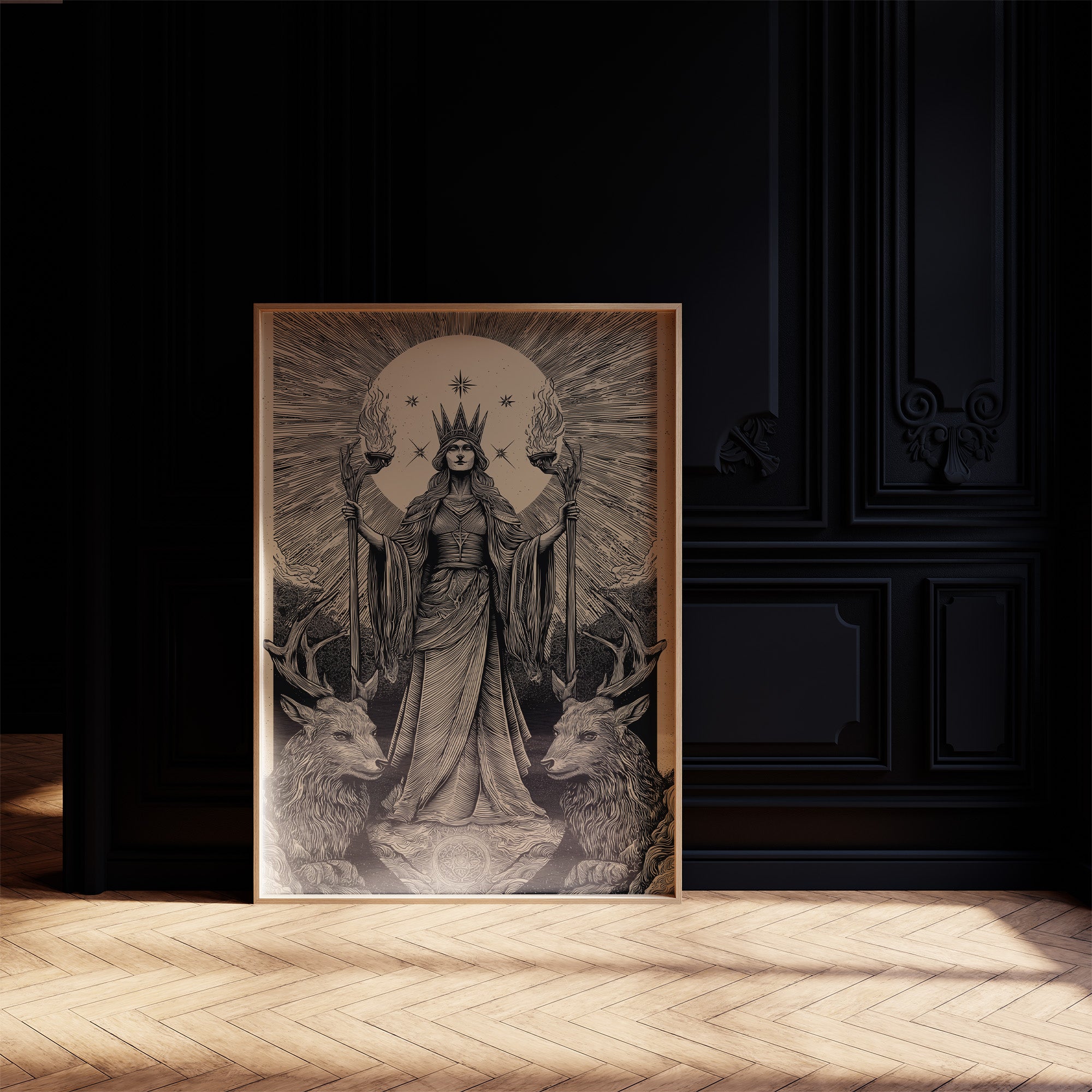 Ancient power radiates from this monochromatic illustration, where a crowned figure stands in solemn authority between two watchful stags. Fine linework creates an ethereal glow behind the subject, with celestial stars punctuating the cosmic backdrop. The detailed etching style reveals flowing robes, antlered guardians, and a commanding presence that bridges earthly and mystical realms.
