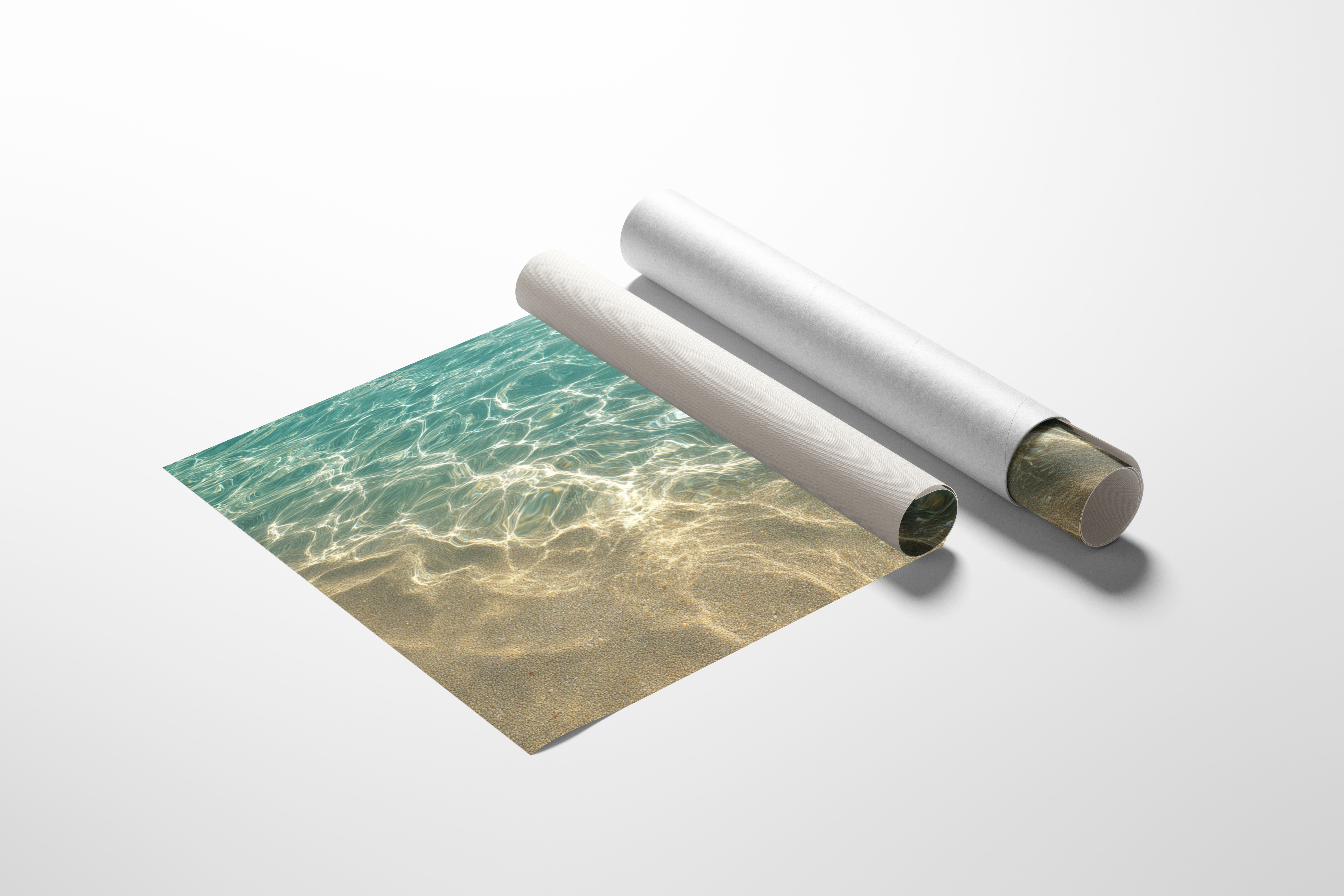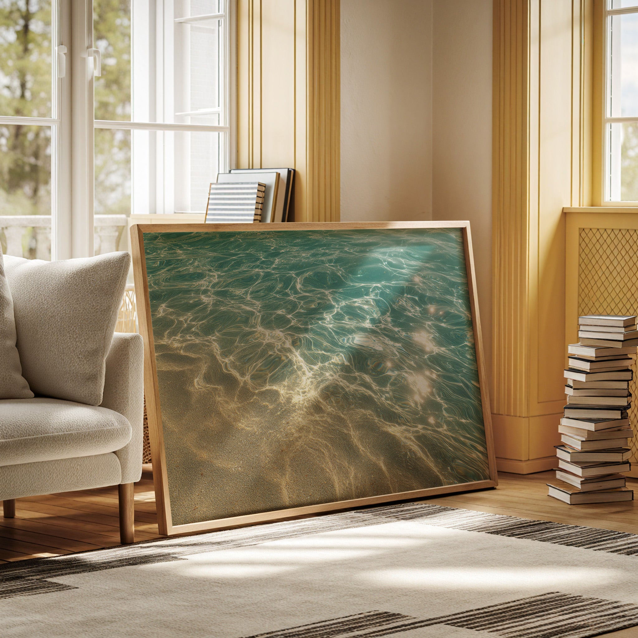 Sunlight dances across crystal-clear waters as they gently lap against pristine sand, creating a mesmerizing display of nature's artistry. The aquamarine waters ripple with ethereal patterns, their translucent surface catching and reflecting golden light like liquid diamonds. Where water meets shore, there's a delicate interplay of textures - smooth, wet sand gradually blending into the sparkling, turquoise depths.