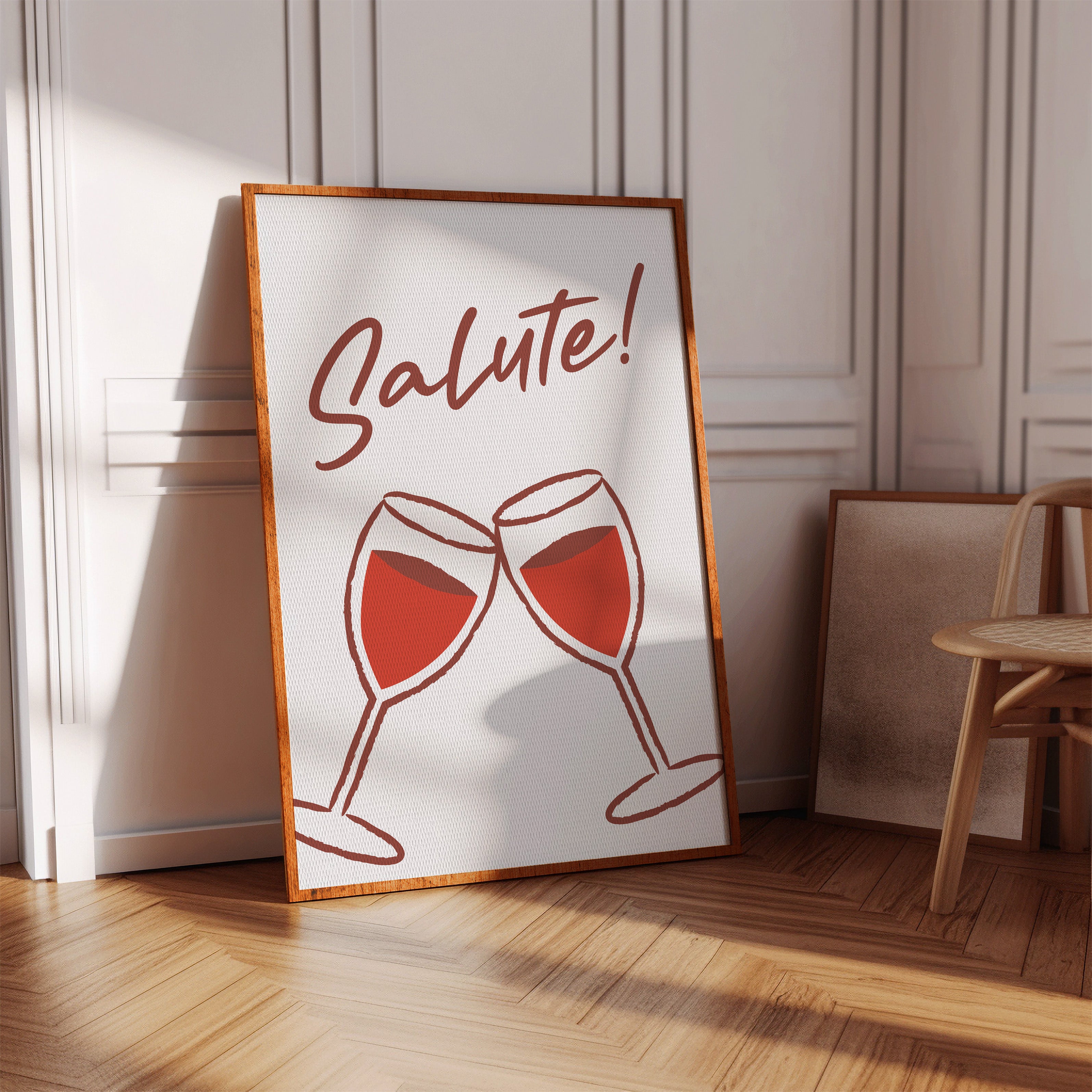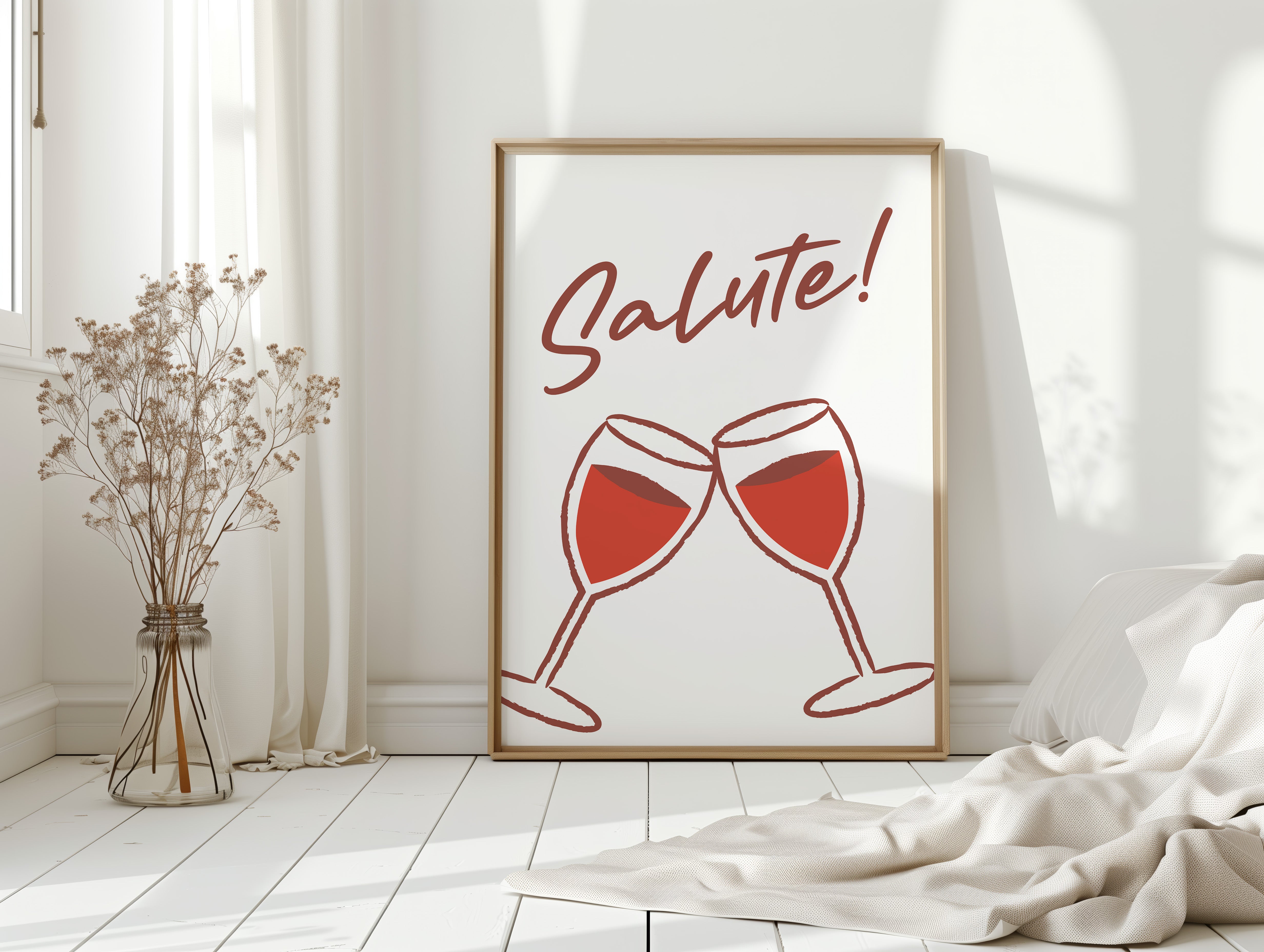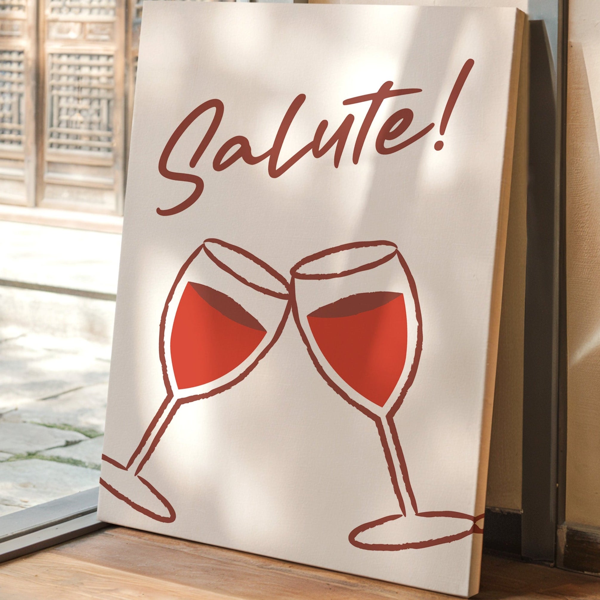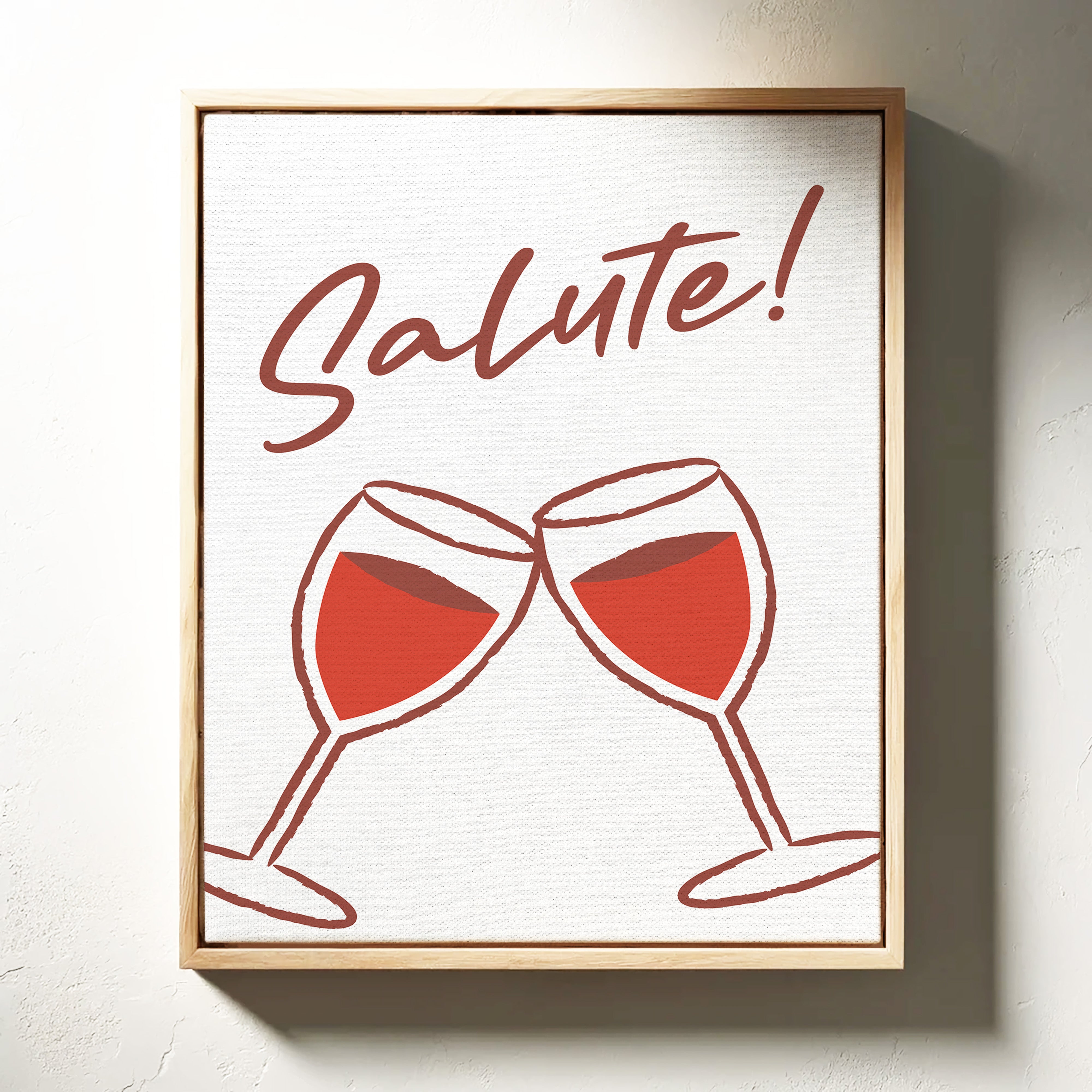 The gentle clink of wine glasses rings out like a bell of celebration, capturing that perfect moment when joy becomes tangible. This piece from our Contemporary collection brings minimalist elegance to life through simple, confident strokes. The warm terracotta hues against crisp white space create a sophisticated dance of color and line, while the playful 'Salute!' exclamation adds a spark of spontaneous delight. This piece transforms any space into a celebration of life's beautiful moments, making it perfect for dining rooms, kitchen nooks, or entertaining spaces where memories are made. Each glance serves as a reminder to pause and savor life's special occasions, big and small.