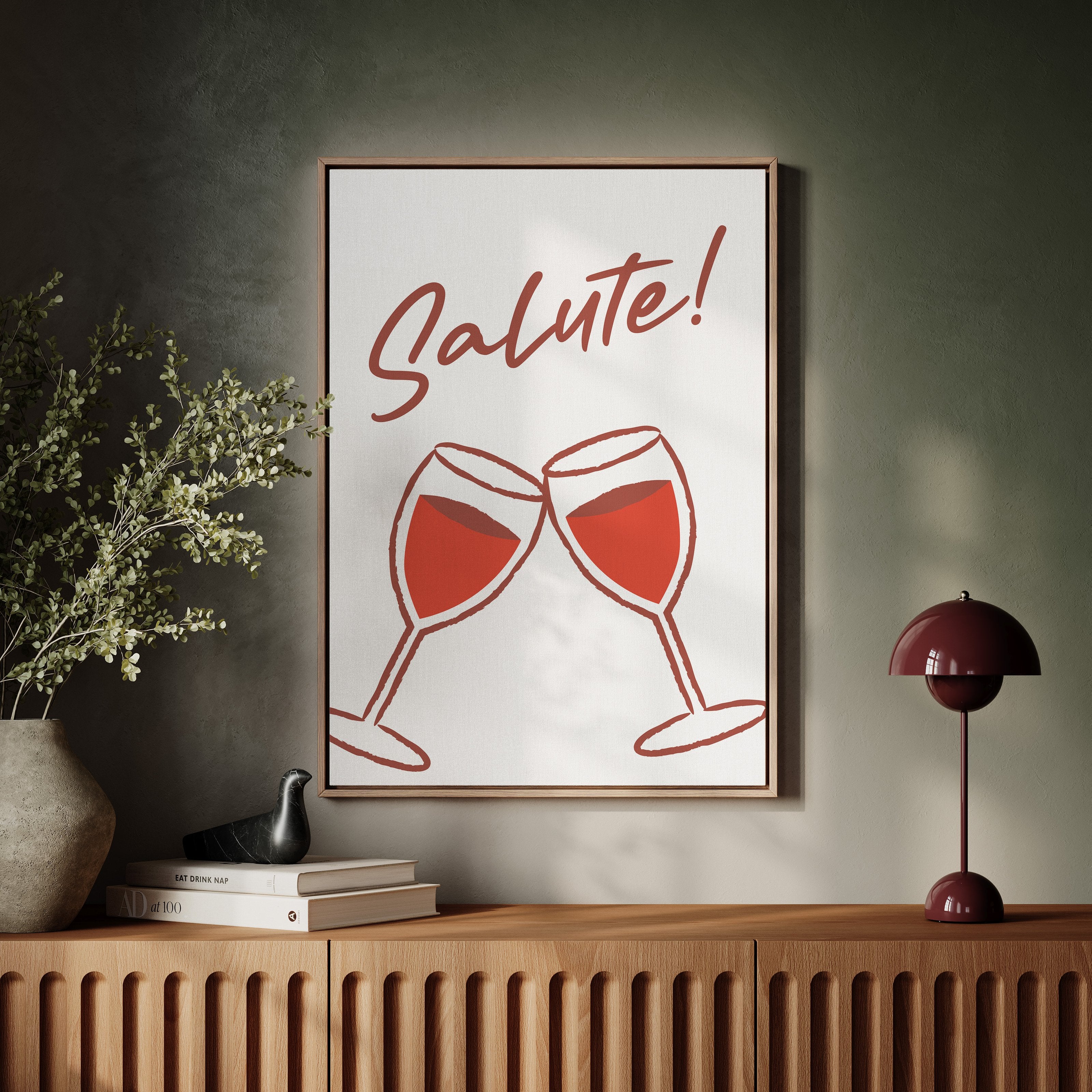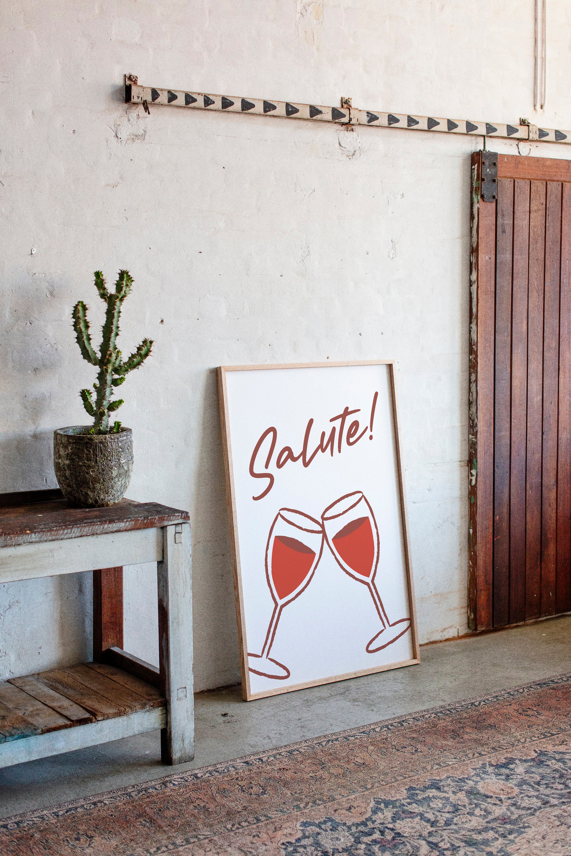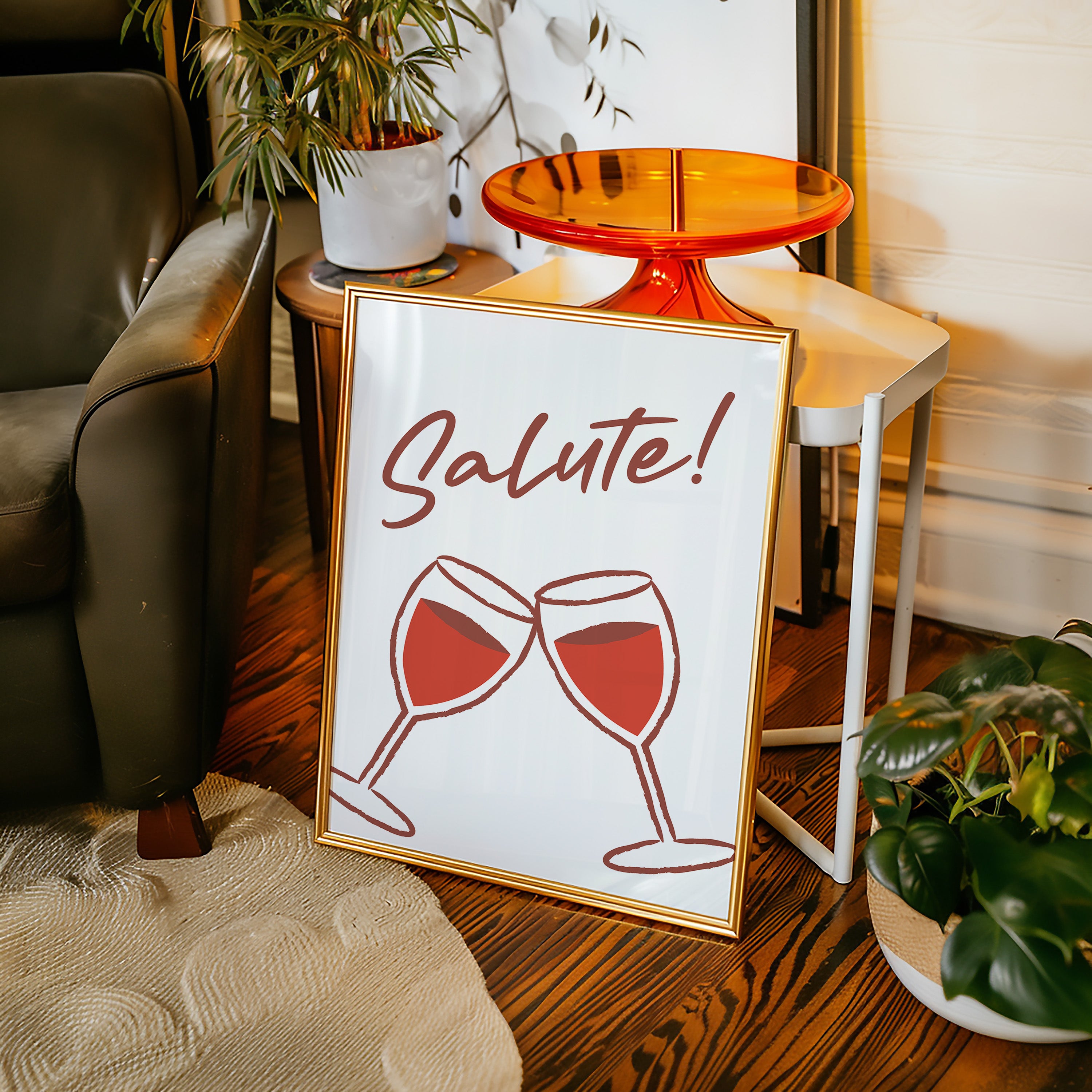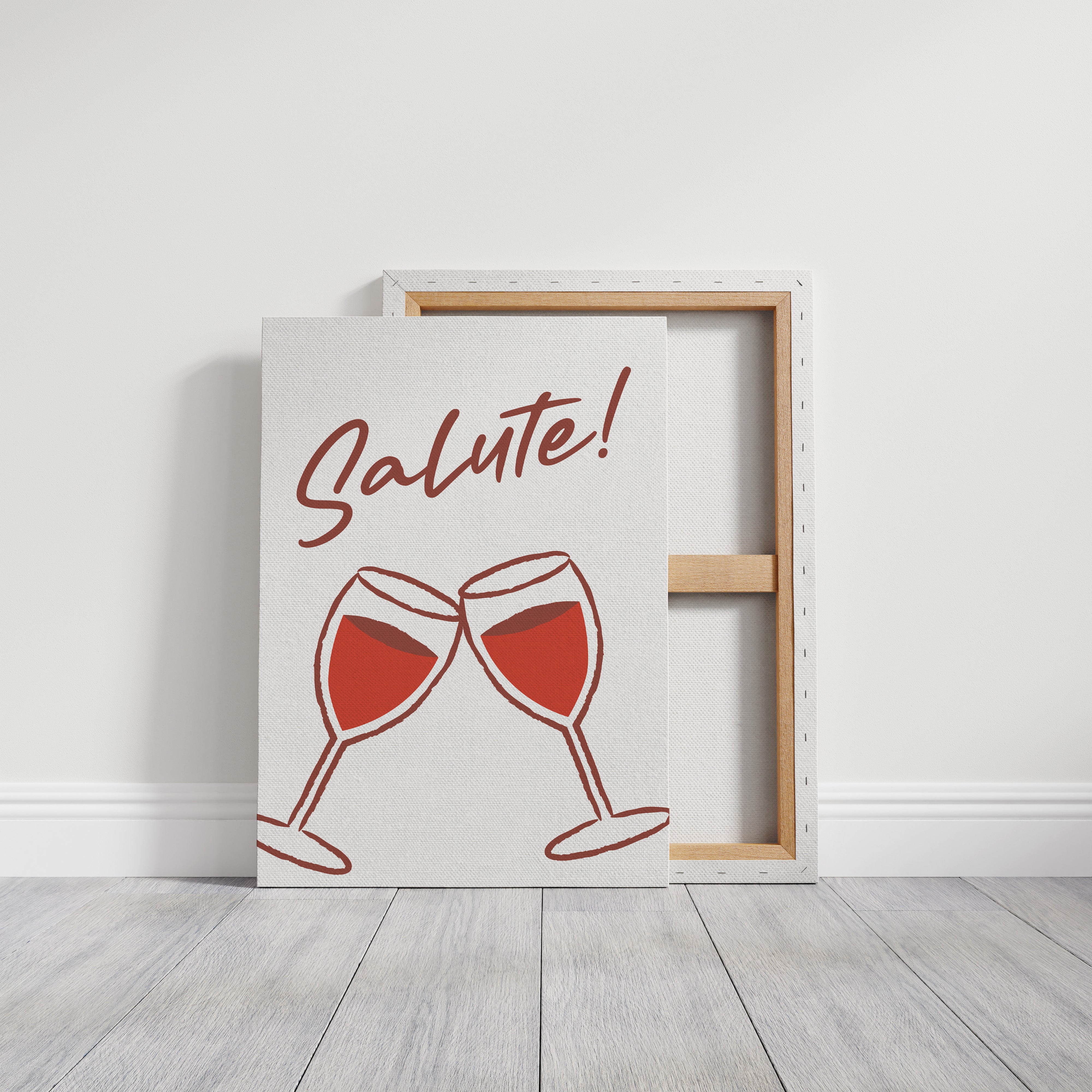 The gentle clink of wine glasses rings out like a bell of celebration, capturing that perfect moment when joy becomes tangible. This piece from our Contemporary collection brings minimalist elegance to life through simple, confident strokes. The warm terracotta hues against crisp white space create a sophisticated dance of color and line, while the playful 'Salute!' exclamation adds a spark of spontaneous delight. This piece transforms any space into a celebration of life's beautiful moments, making it perfect for dining rooms, kitchen nooks, or entertaining spaces where memories are made. Each glance serves as a reminder to pause and savor life's special occasions, big and small.