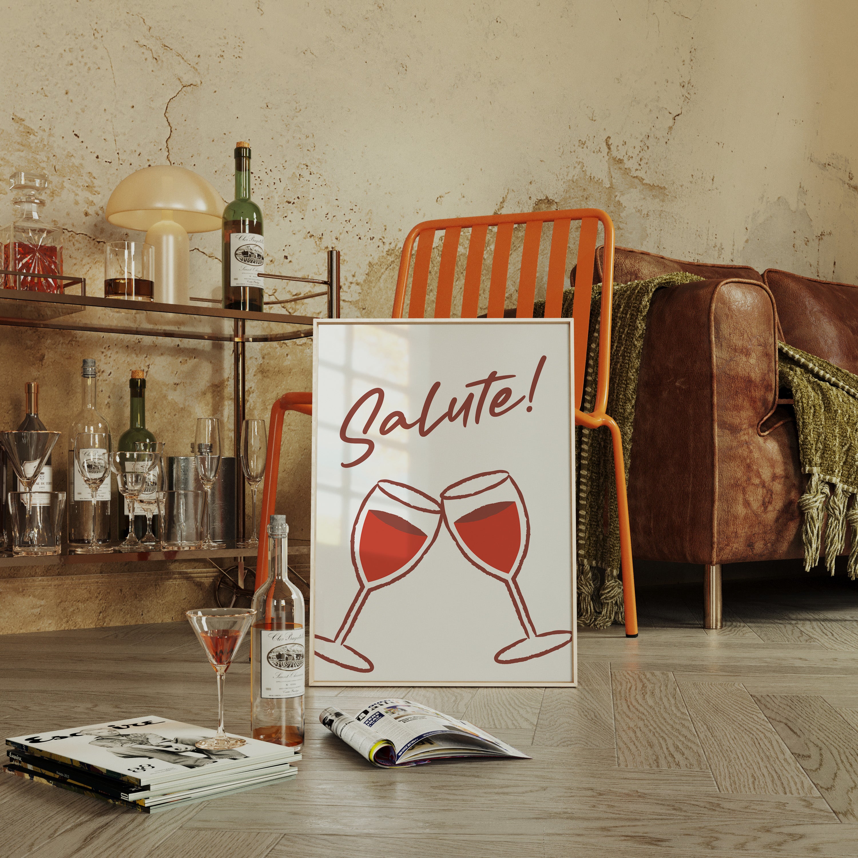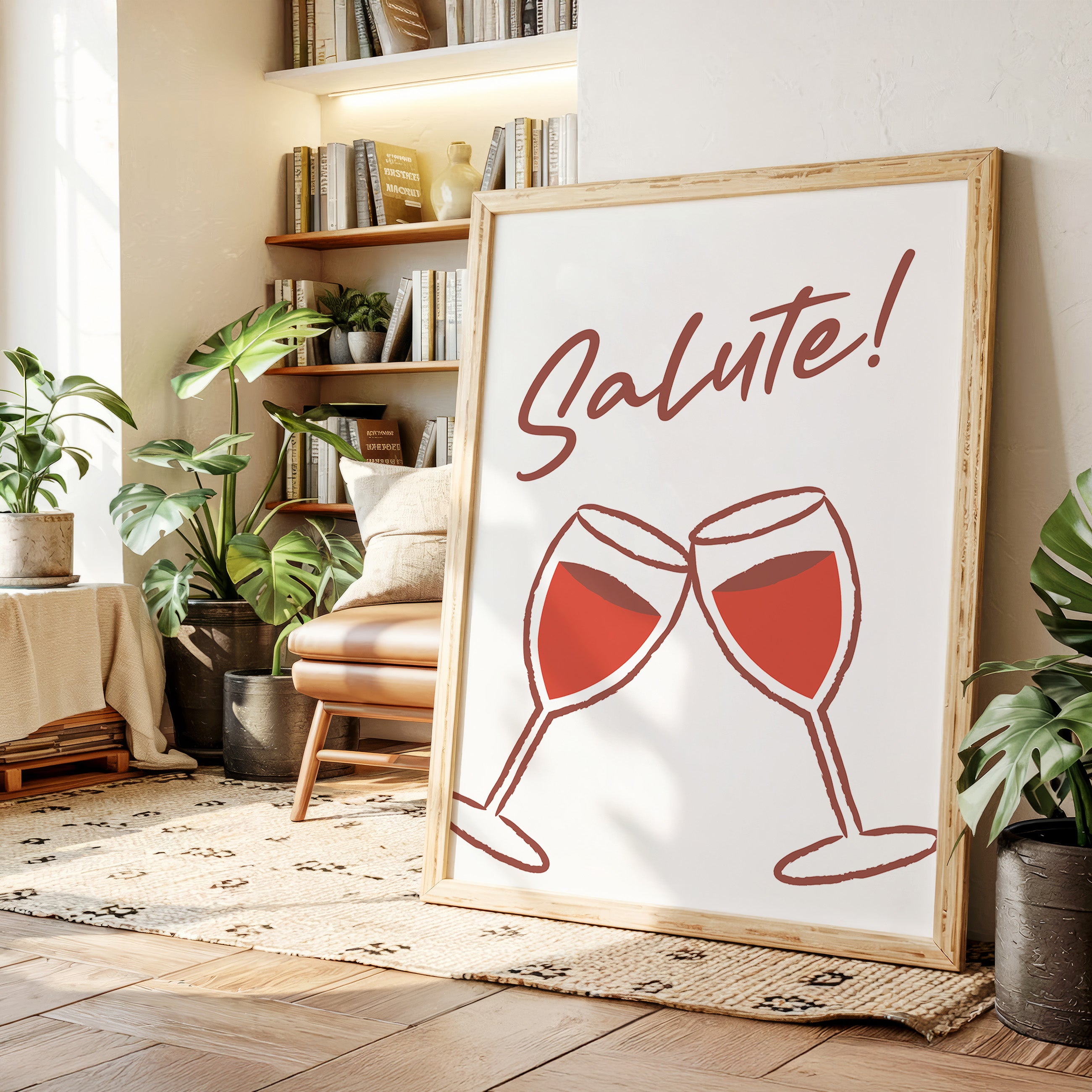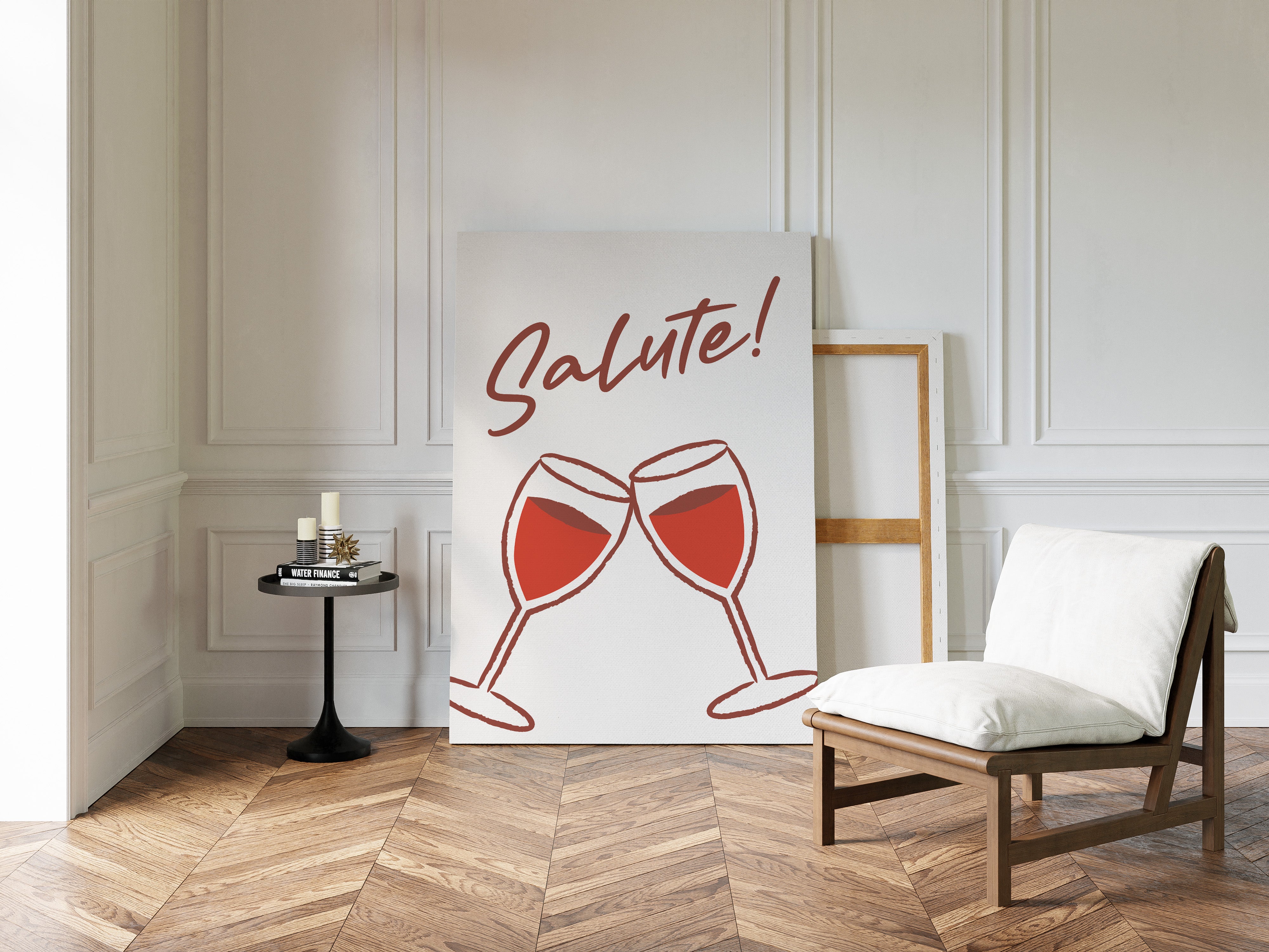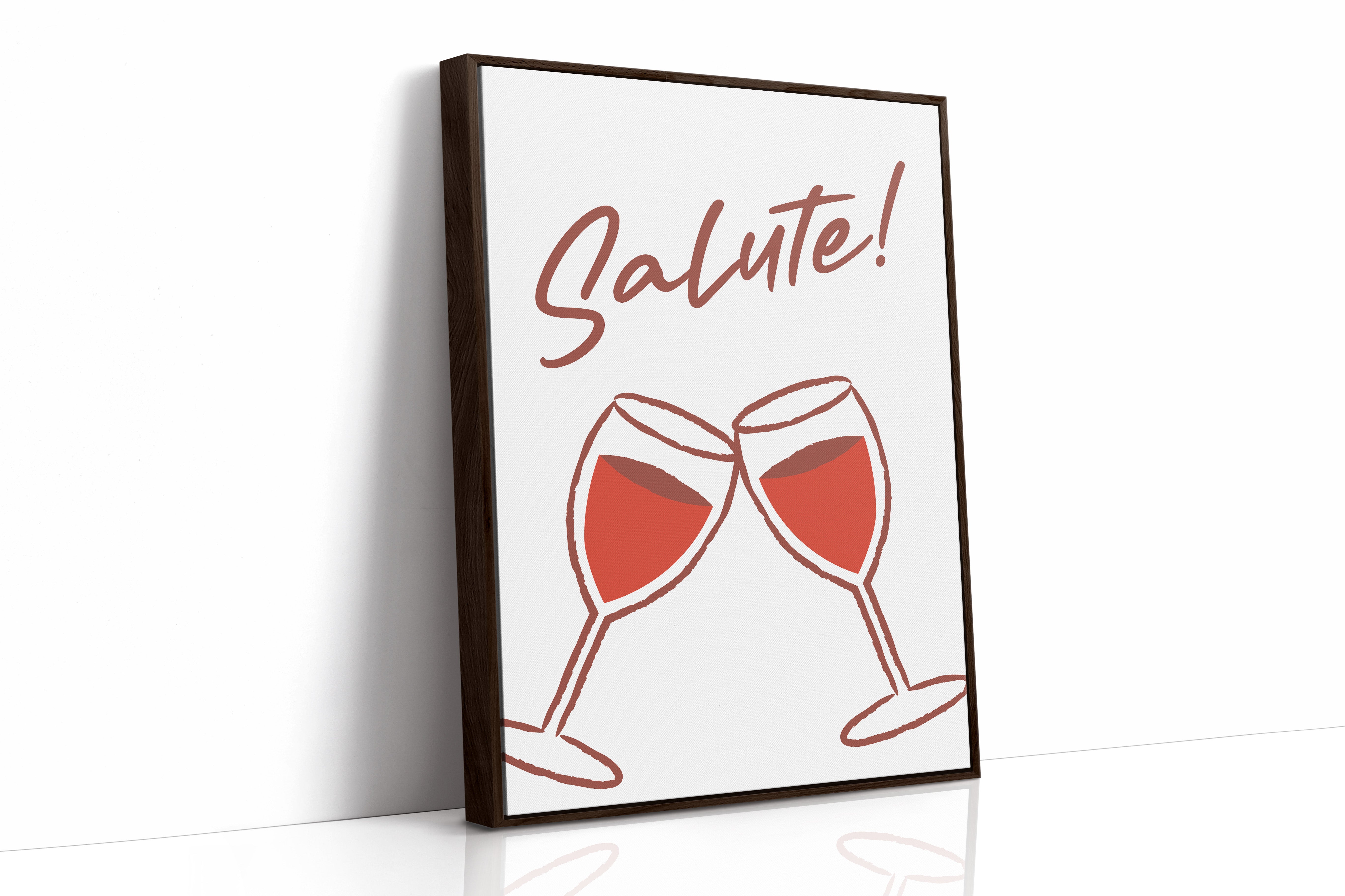 The gentle clink of wine glasses rings out like a bell of celebration, capturing that perfect moment when joy becomes tangible. This piece from our Contemporary collection brings minimalist elegance to life through simple, confident strokes. The warm terracotta hues against crisp white space create a sophisticated dance of color and line, while the playful 'Salute!' exclamation adds a spark of spontaneous delight. This piece transforms any space into a celebration of life's beautiful moments, making it perfect for dining rooms, kitchen nooks, or entertaining spaces where memories are made. Each glance serves as a reminder to pause and savor life's special occasions, big and small.