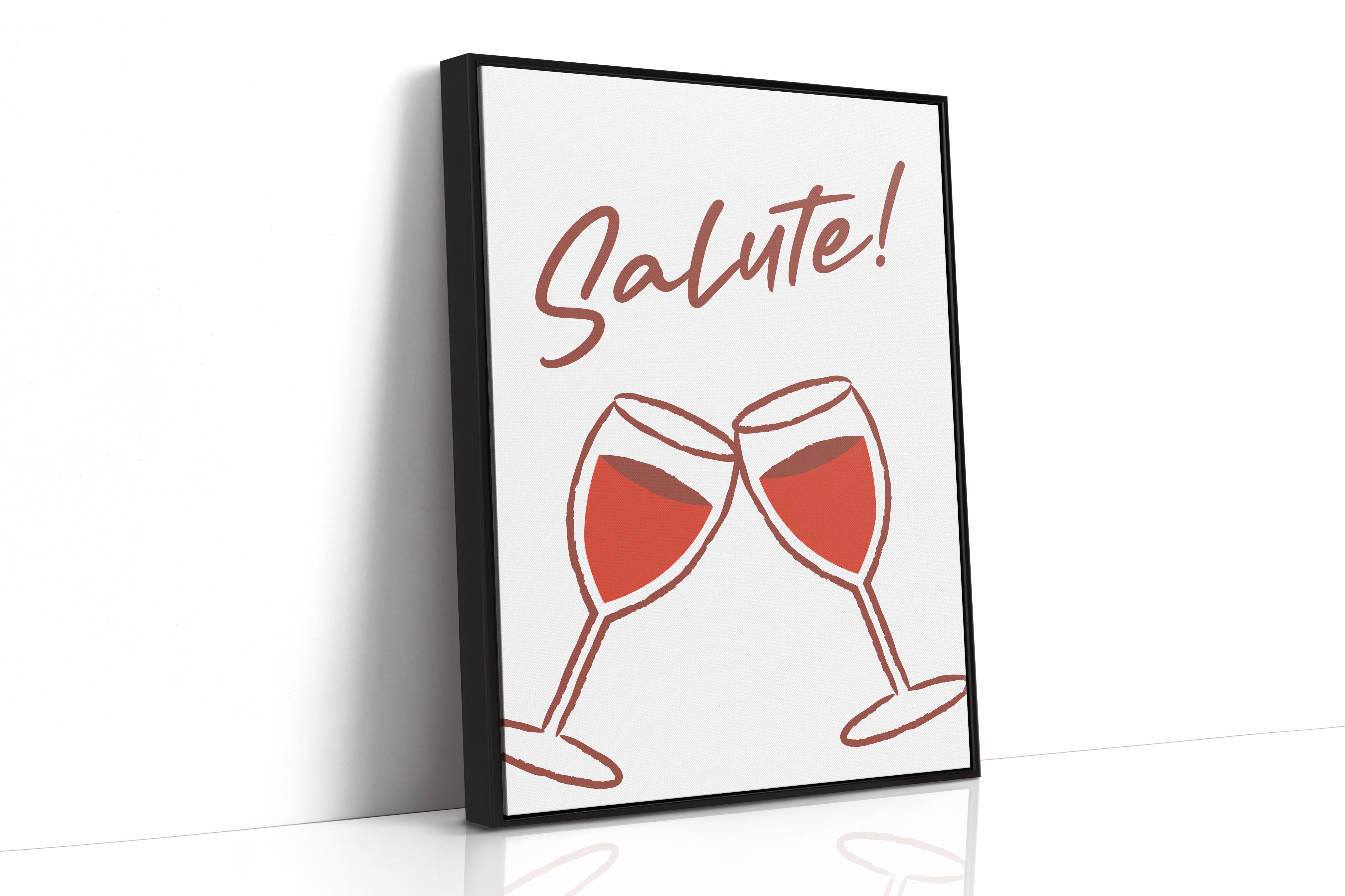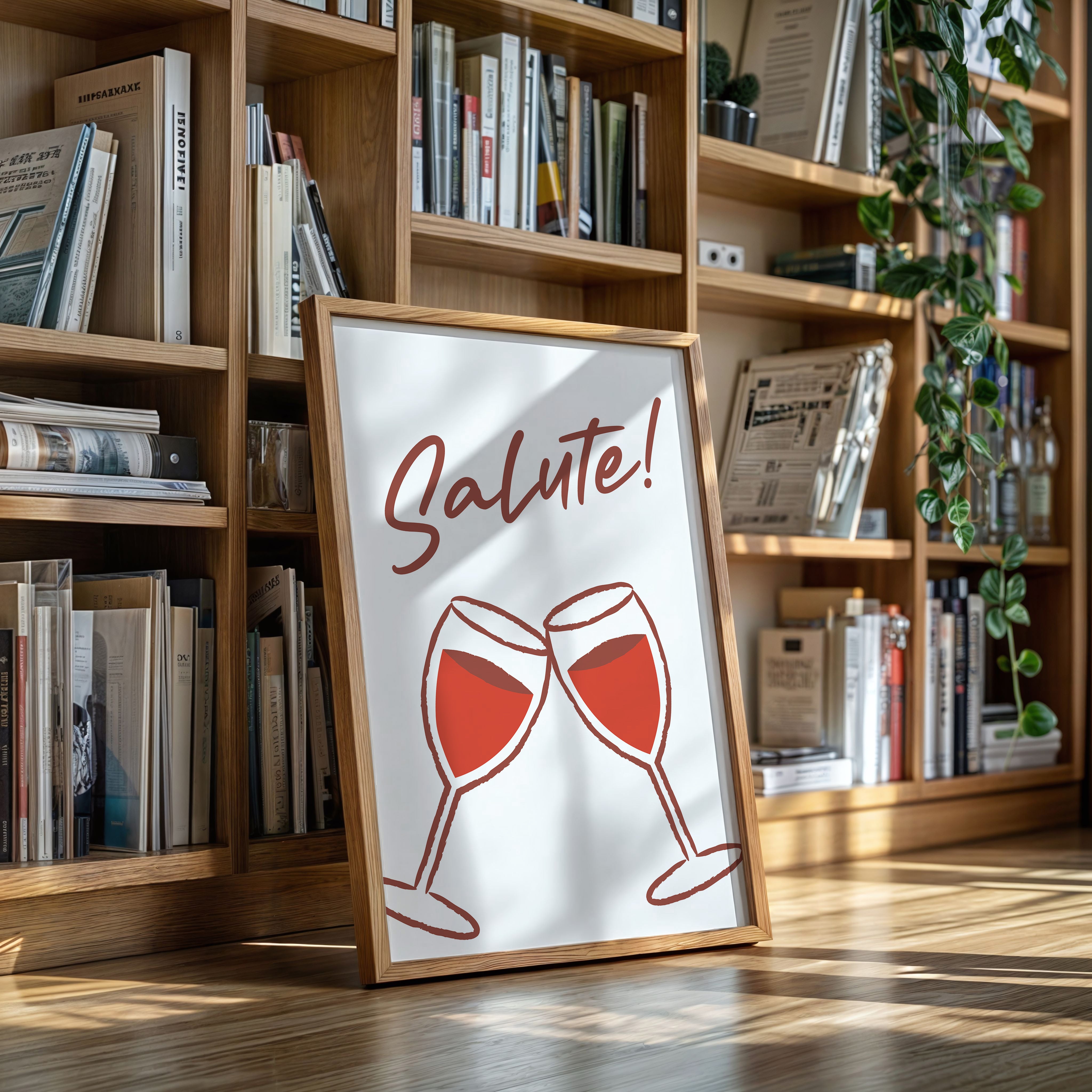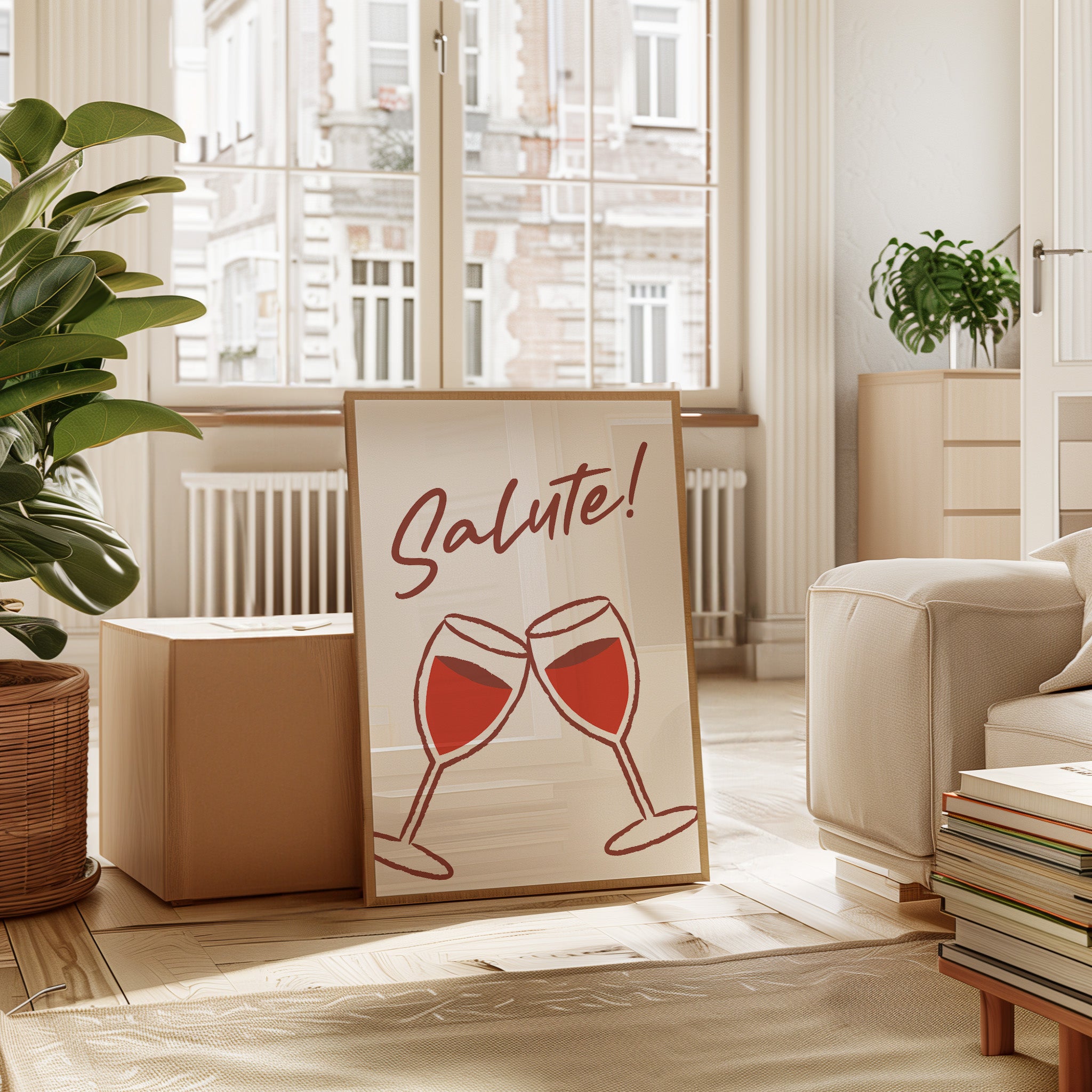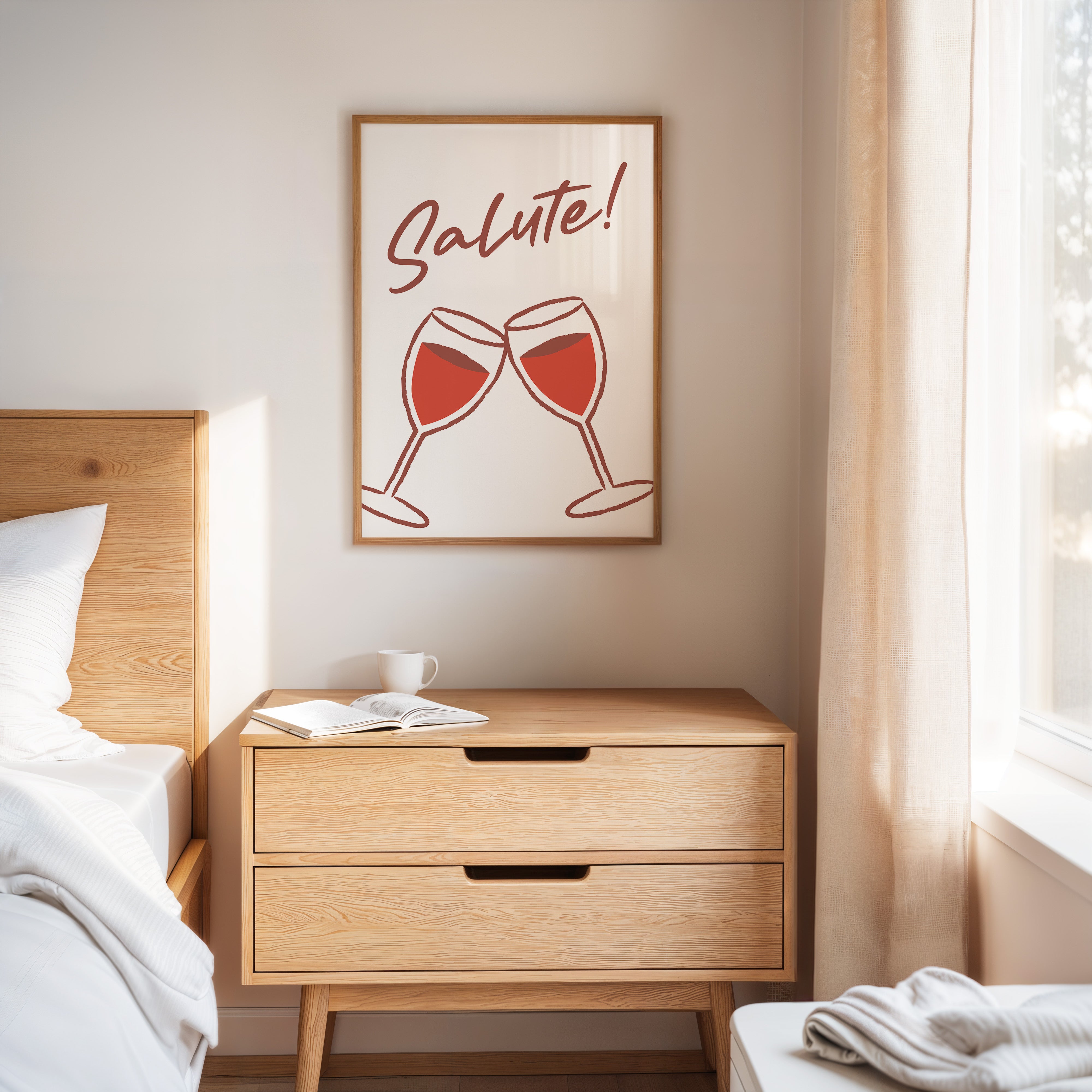 The gentle clink of wine glasses rings out like a bell of celebration, capturing that perfect moment when joy becomes tangible. This piece from our Contemporary collection brings minimalist elegance to life through simple, confident strokes. The warm terracotta hues against crisp white space create a sophisticated dance of color and line, while the playful 'Salute!' exclamation adds a spark of spontaneous delight. This piece transforms any space into a celebration of life's beautiful moments, making it perfect for dining rooms, kitchen nooks, or entertaining spaces where memories are made. Each glance serves as a reminder to pause and savor life's special occasions, big and small.