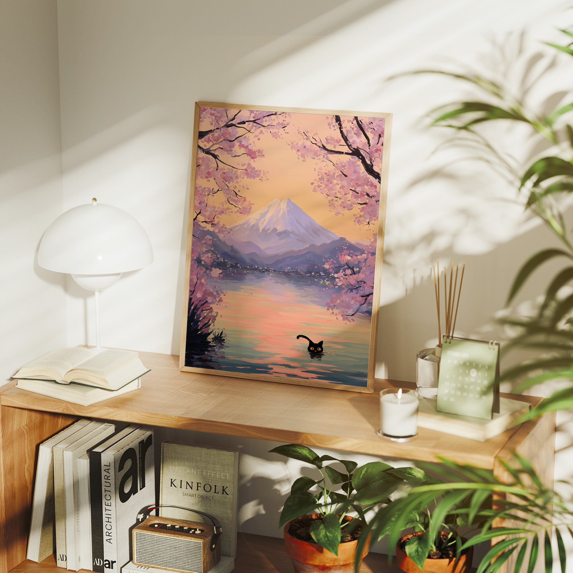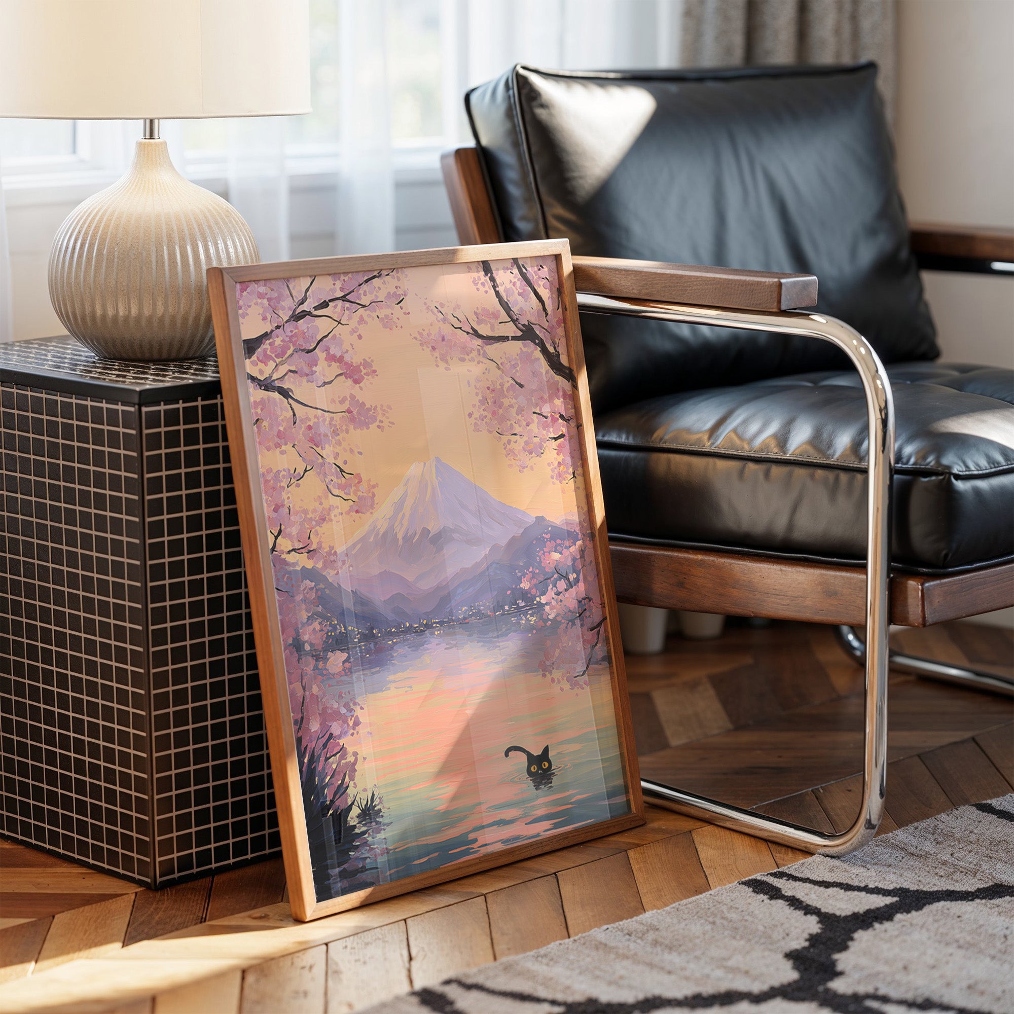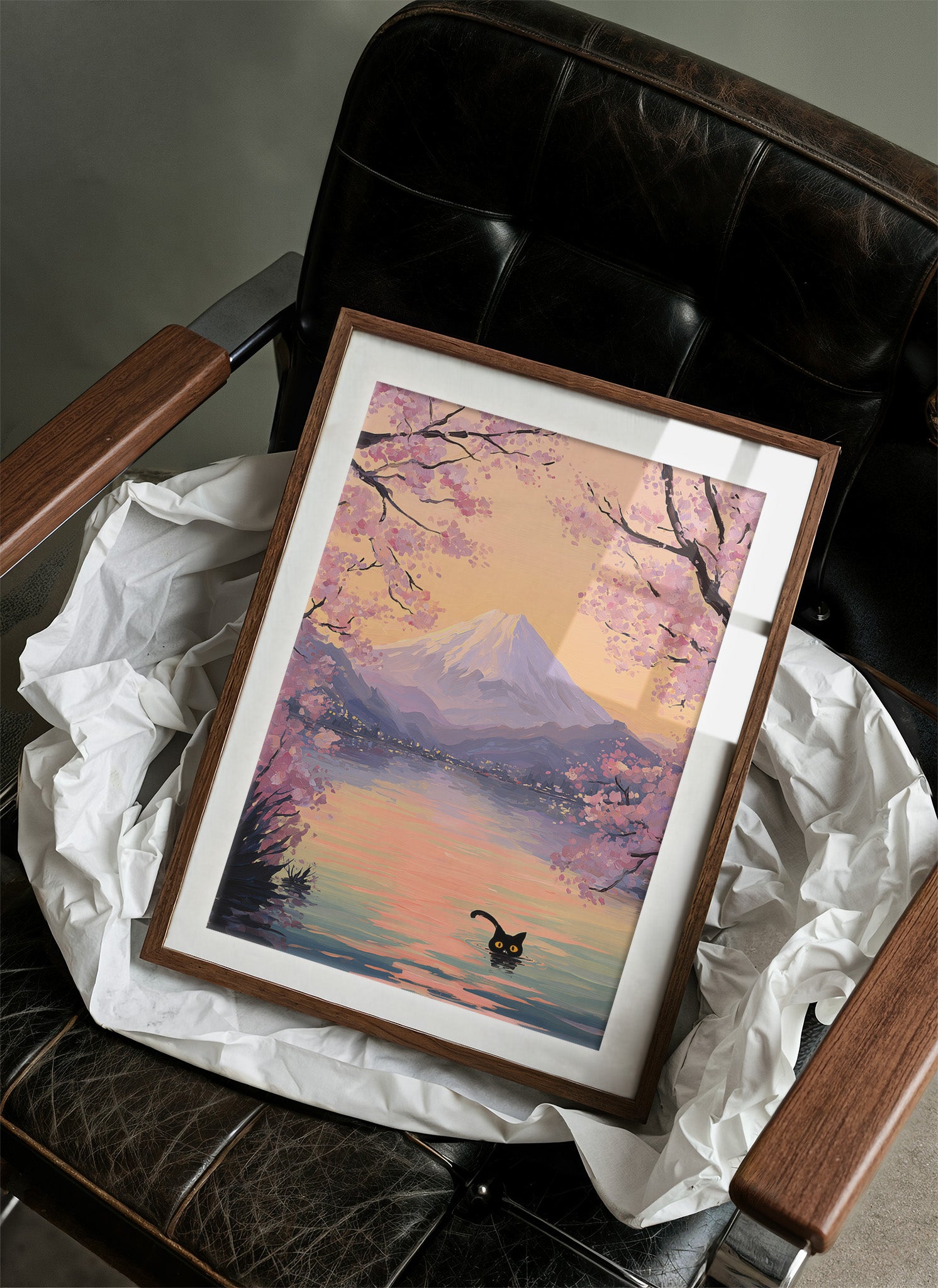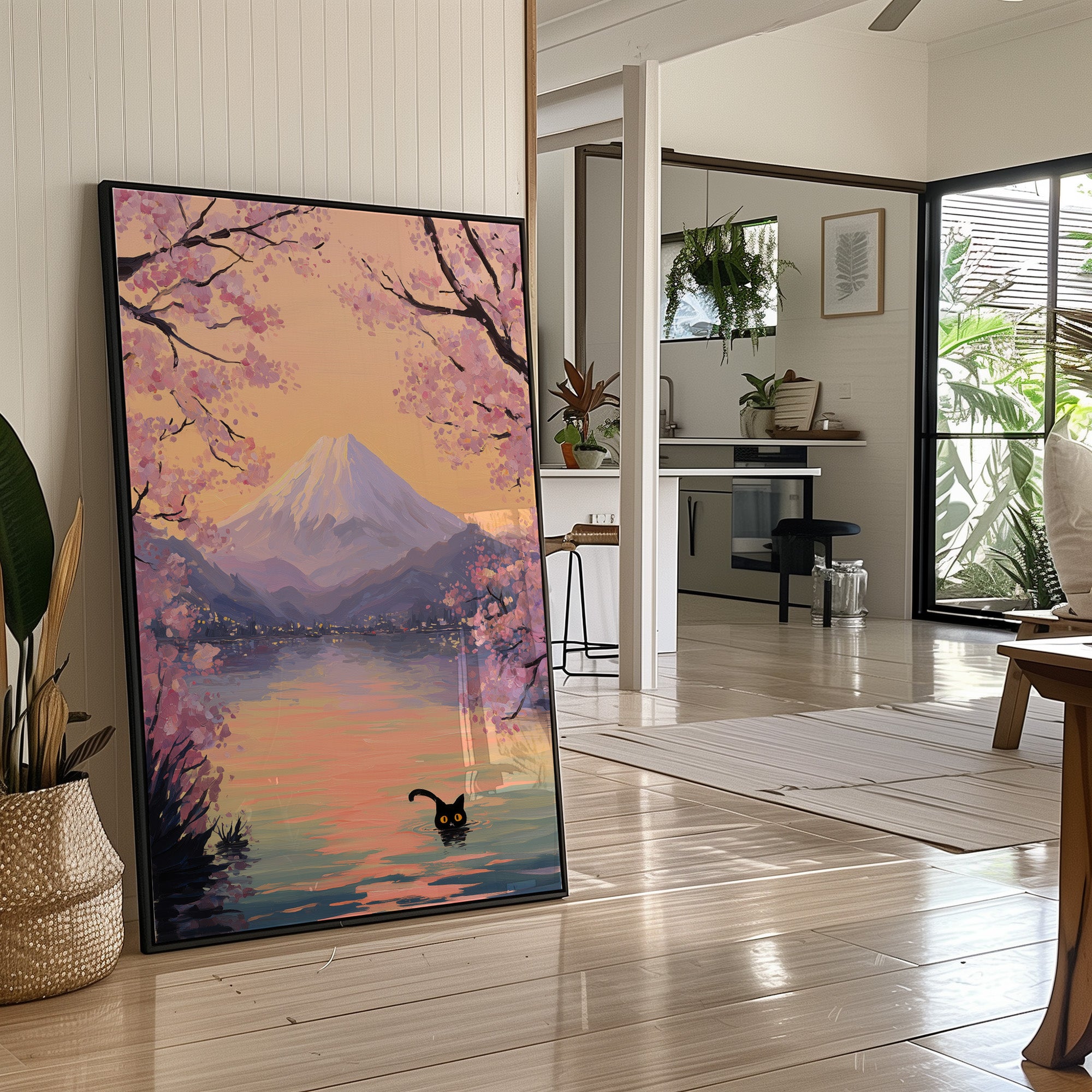 A playful black cat ventures into tranquil waters, its bright eyes peering above the surface against a dreamy landscape. Delicate cherry blossoms frame the scene in soft pinks and purples, their petals dancing above distant mountains bathed in golden light. The watercolor-style rendering creates a seamless blend of whimsy and serenity, where reality meets imagination in perfect harmony. This piece would bring a touch of enchantment to a reading nook, bedroom, or any space where you seek to create a sense of peaceful adventure.