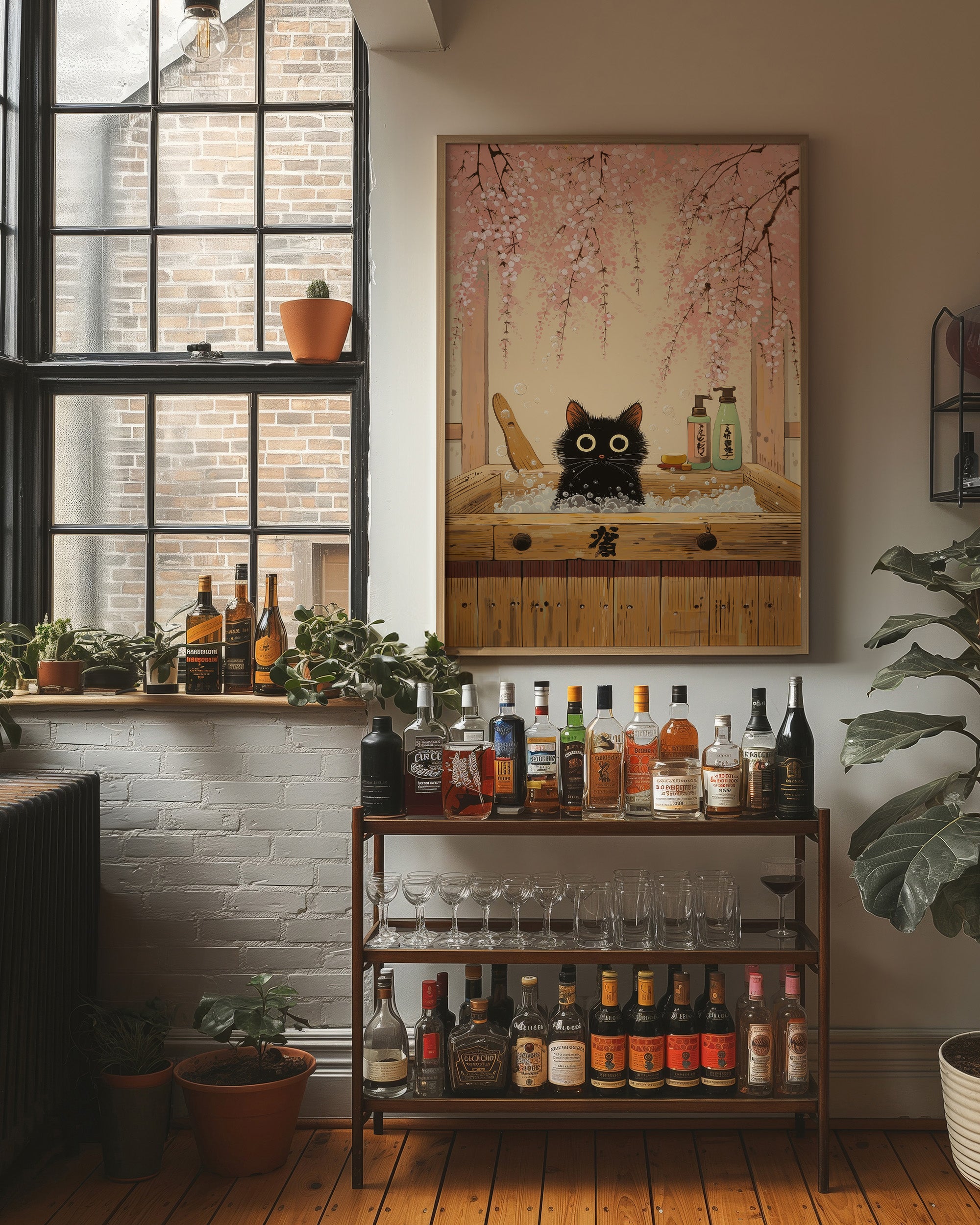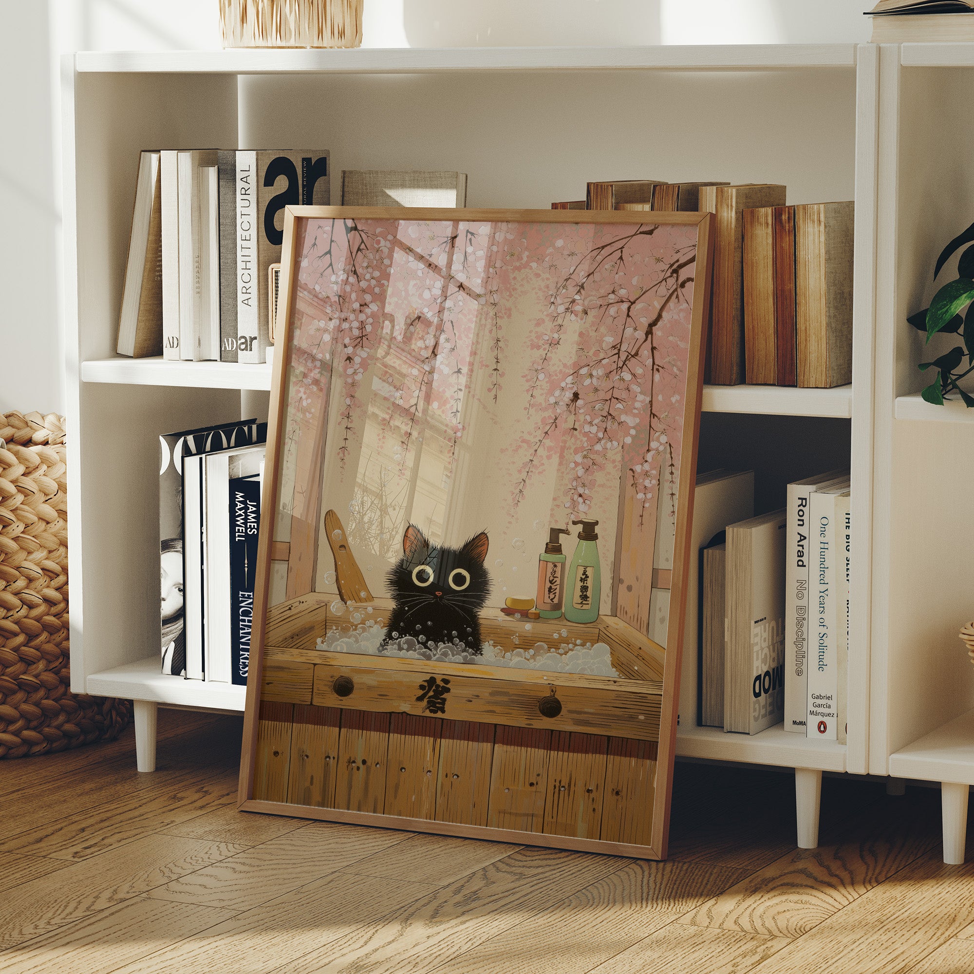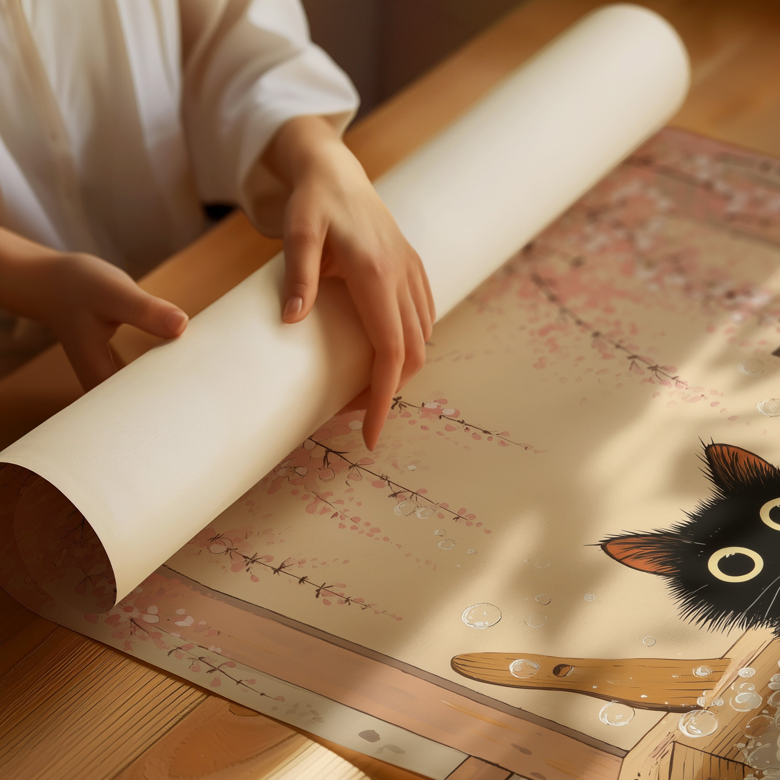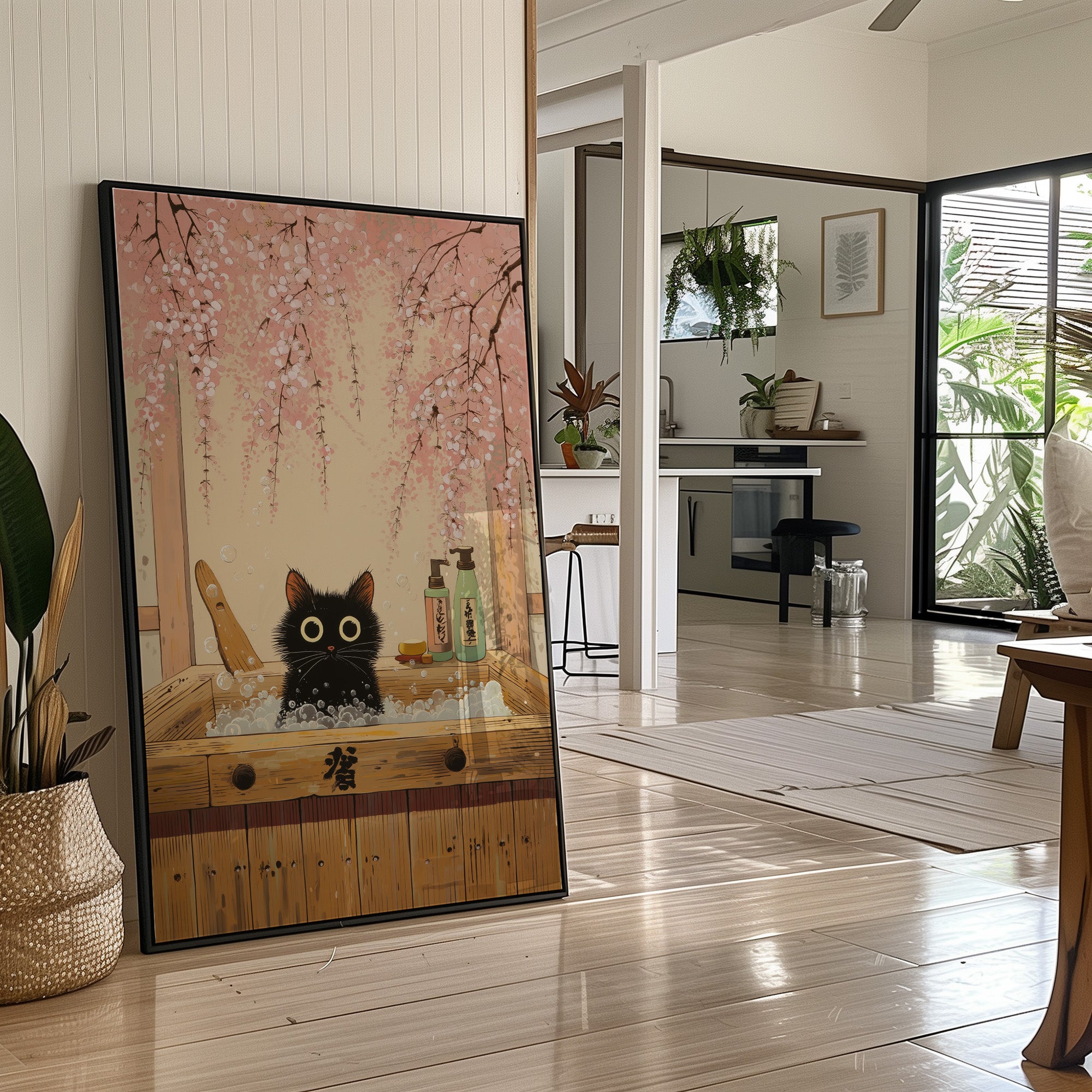A whimsical moment captures a wide-eyed black cat peeking over the edge of a traditional wooden bathtub, surrounded by falling cherry blossoms. The scene blends Japanese aesthetics with playful charm as delicate pink petals cascade against a warm, peaceful backdrop. The cat's expressive golden eyes and fluffy fur create an endearing contrast against the rustic wood grain and soft botanical elements. This charming piece would bring a touch of serenity and joy to a reading nook, bathroom, or any cozy corner seeking a blend of sophistication and whimsy.