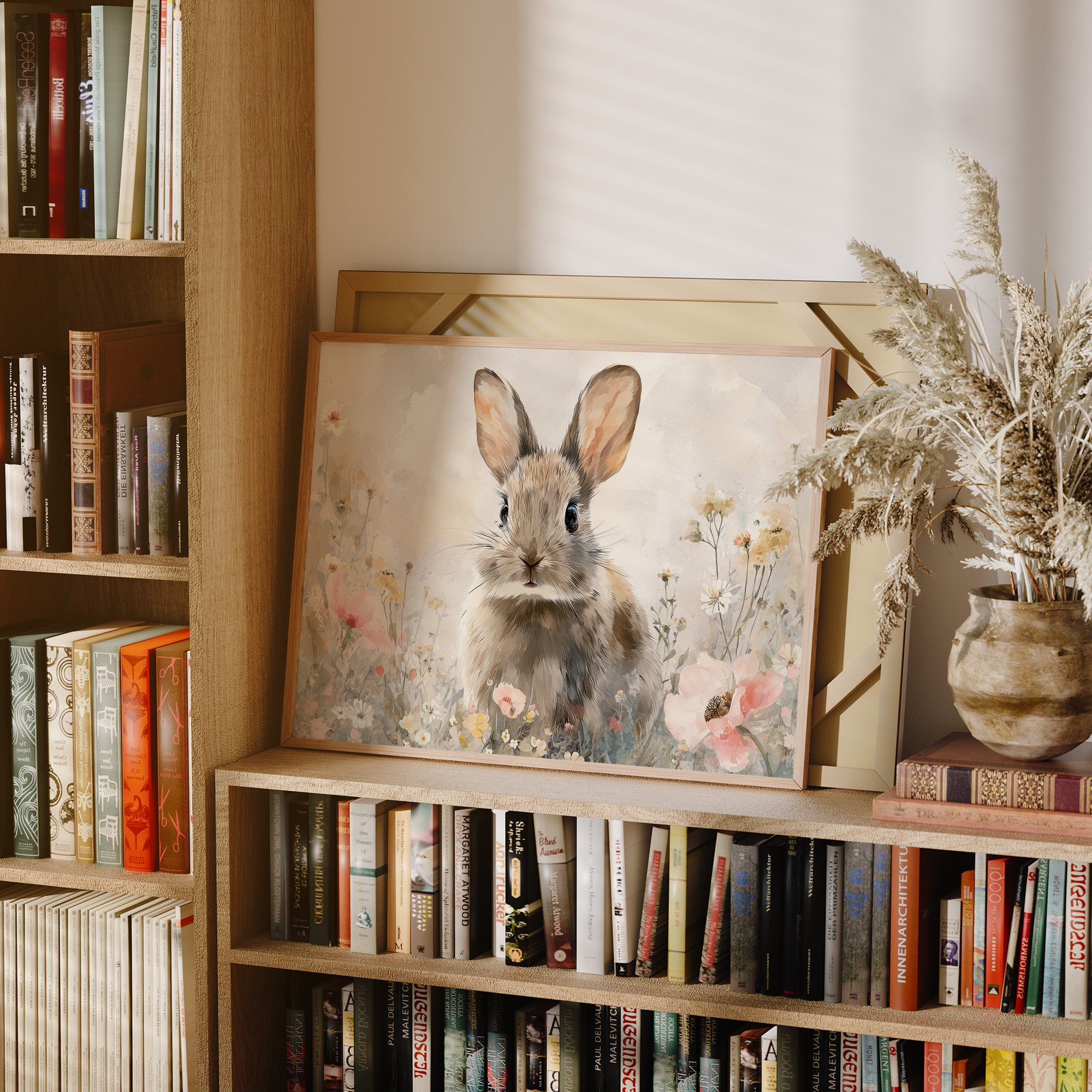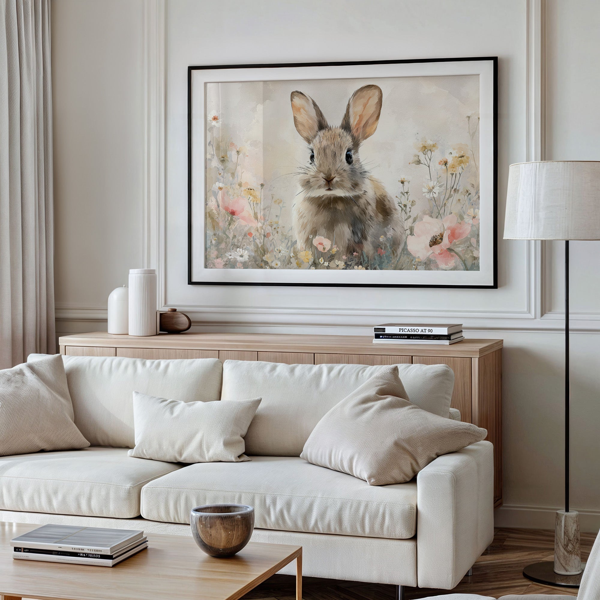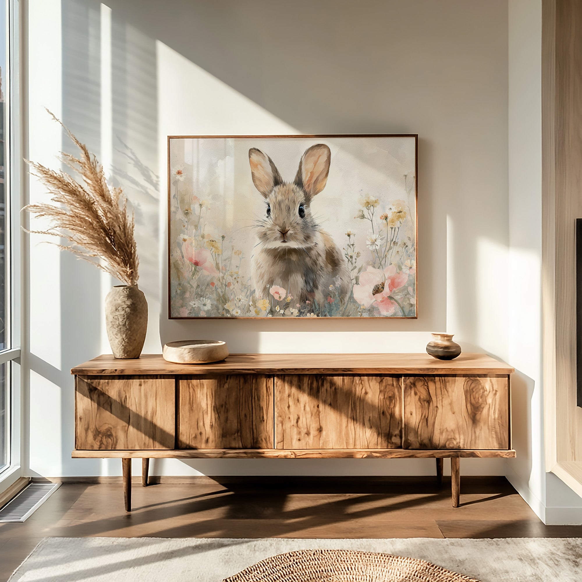 Soft morning light catches the inquisitive gaze of a rabbit nestled among delicate wildflowers. The gentle watercolor rendering captures the creature's alert ears and tender expression, surrounded by a hazy meadow of pastel poppies and daisies. The artwork's muted palette of creams, pinks, and earthy browns creates a serene harmony, inviting viewers into this quiet moment of natural wonder. This piece brings tranquil charm to reading nooks, nurseries, or any space seeking a touch of gentle whimsy.