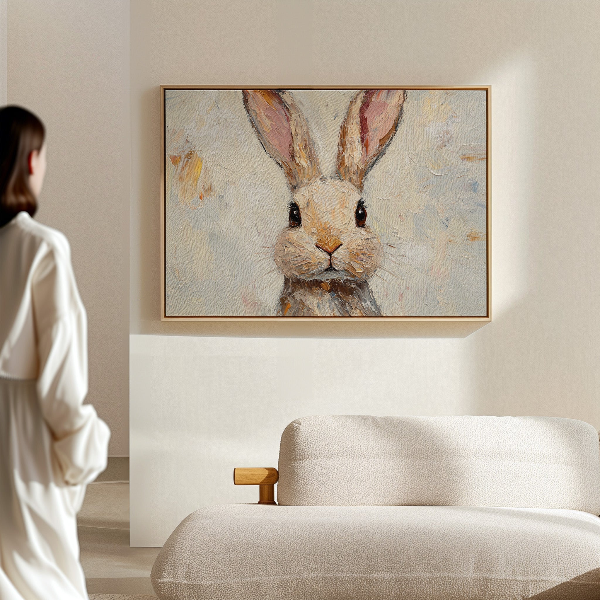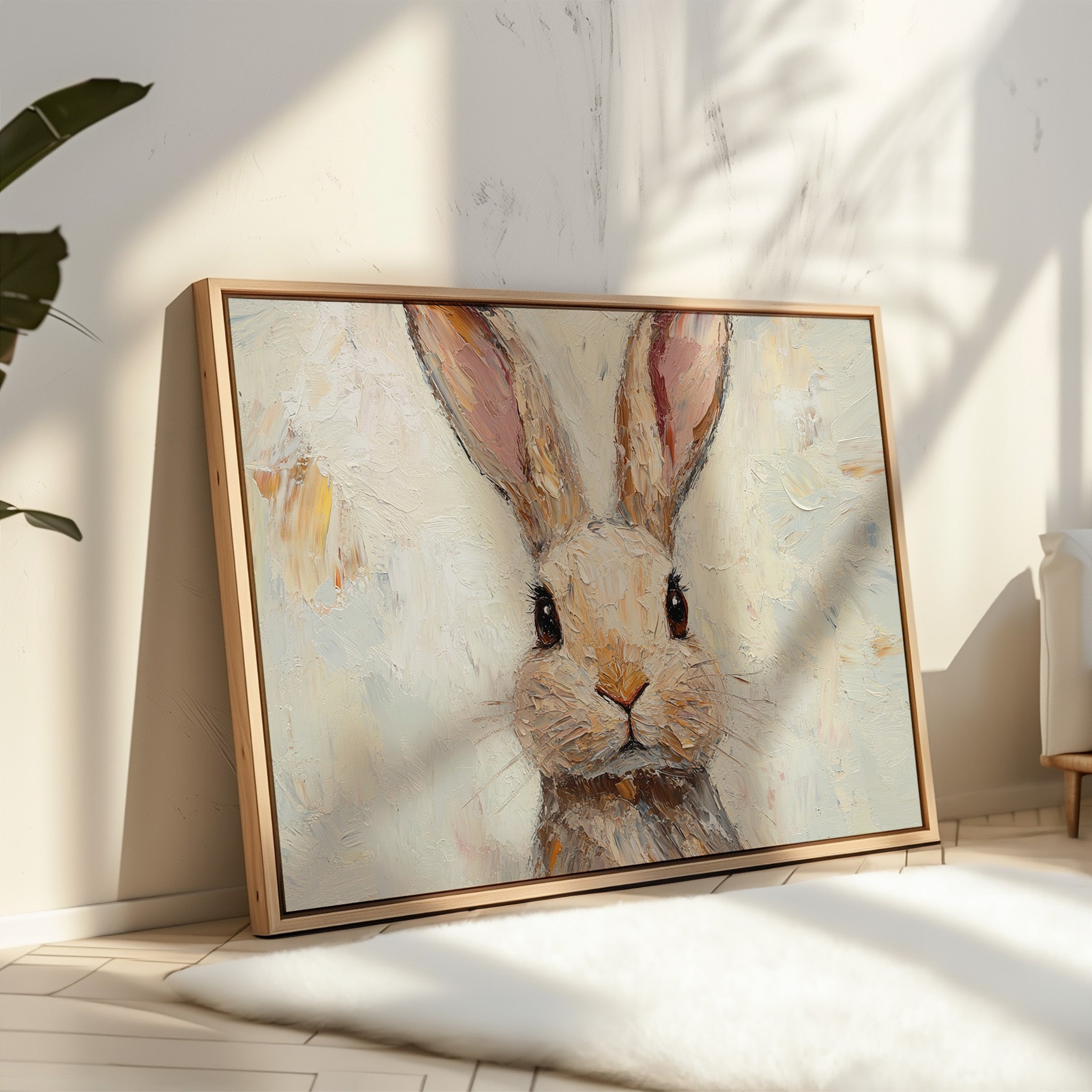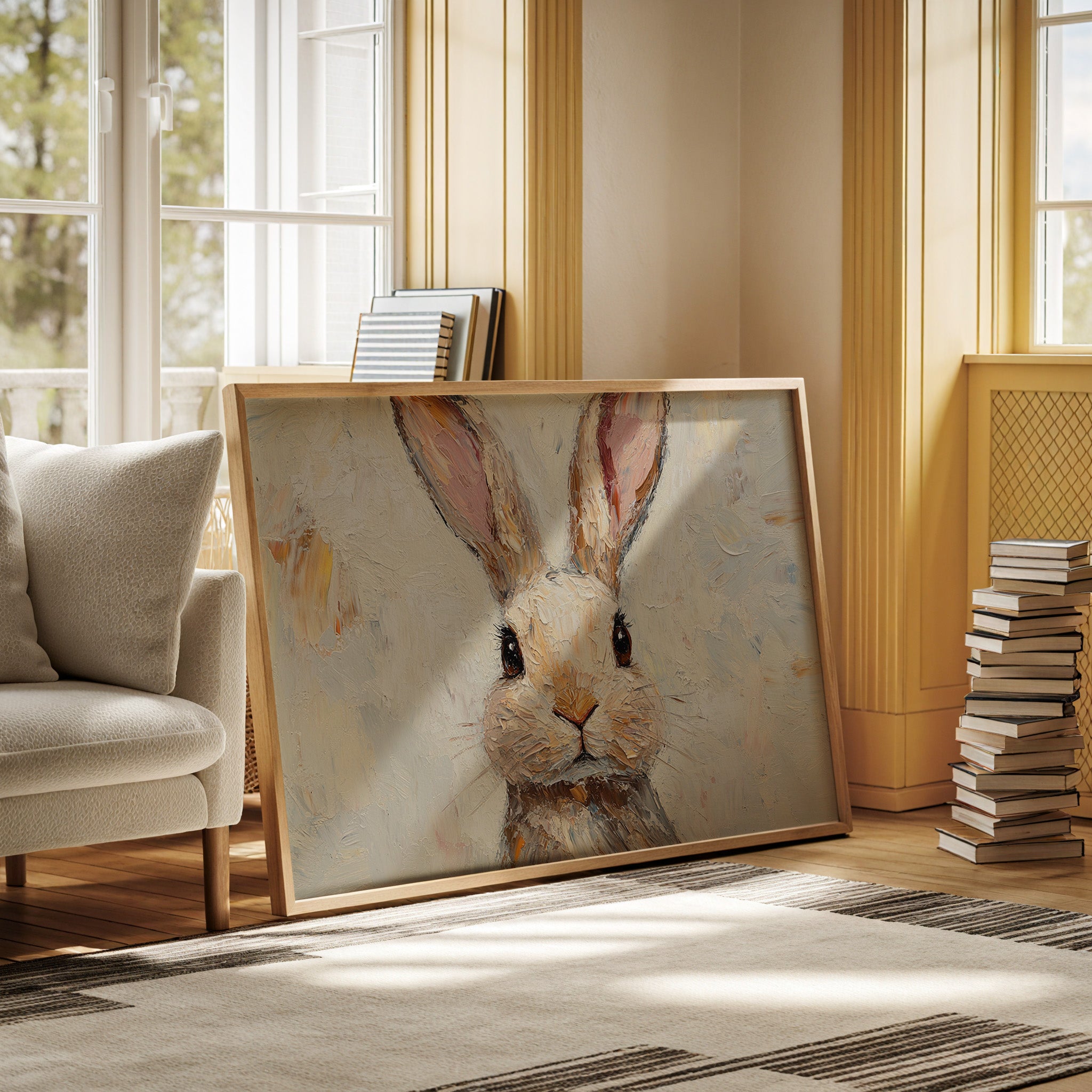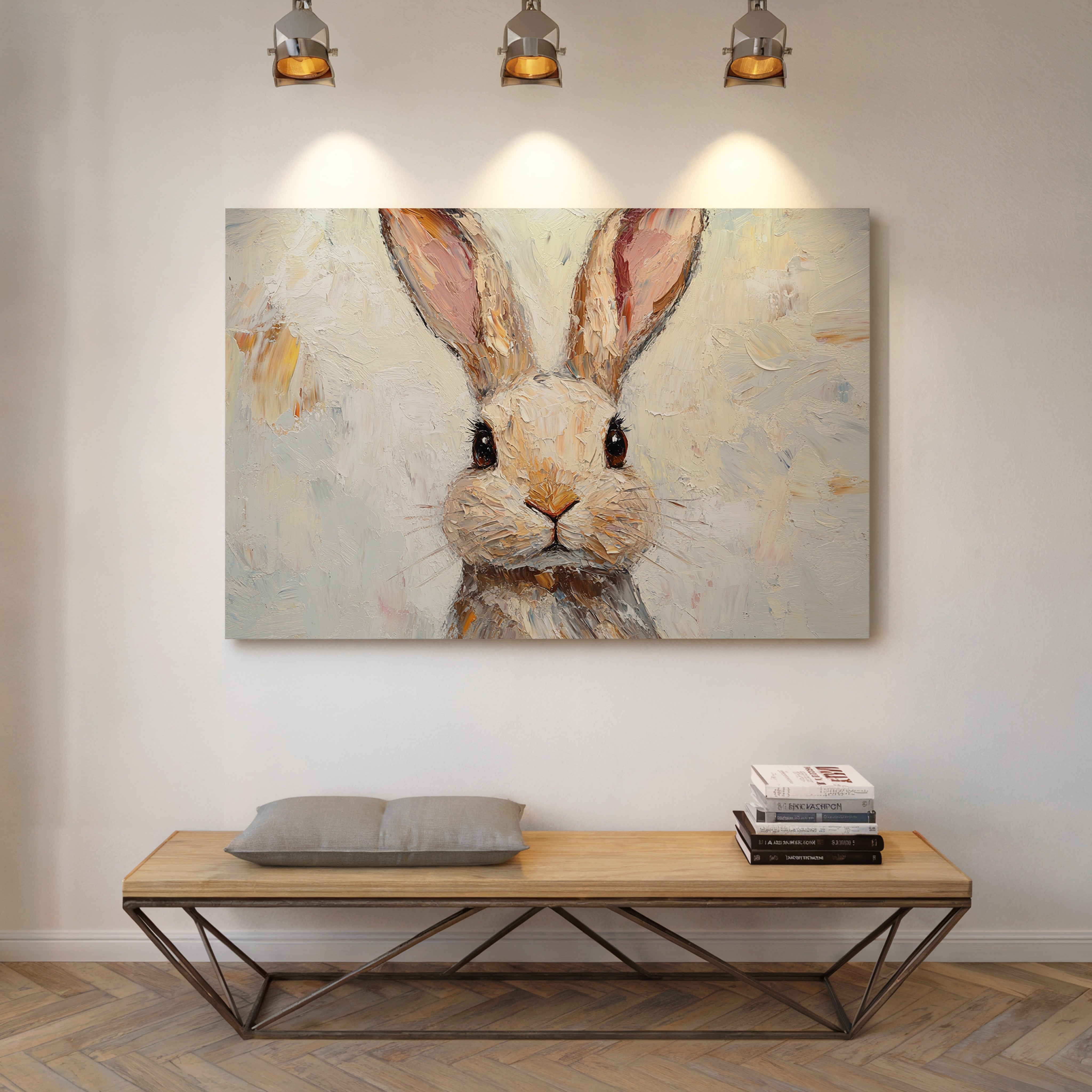 A close-up portrait captures the endearing gaze of a rabbit, its expression alive with gentle inquisitiveness. Thick, textured brushstrokes create a tactile fur effect, with delicate pink-tinged ears rising from a cream-colored face. The painting technique masterfully combines warm neutrals with subtle hints of blue and rose, bringing dimensional depth to each carefully placed stroke. This charming piece would bring a touch of whimsy and pastoral charm to a child's room or create an unexpected focal point in a modern farmhouse kitchen.