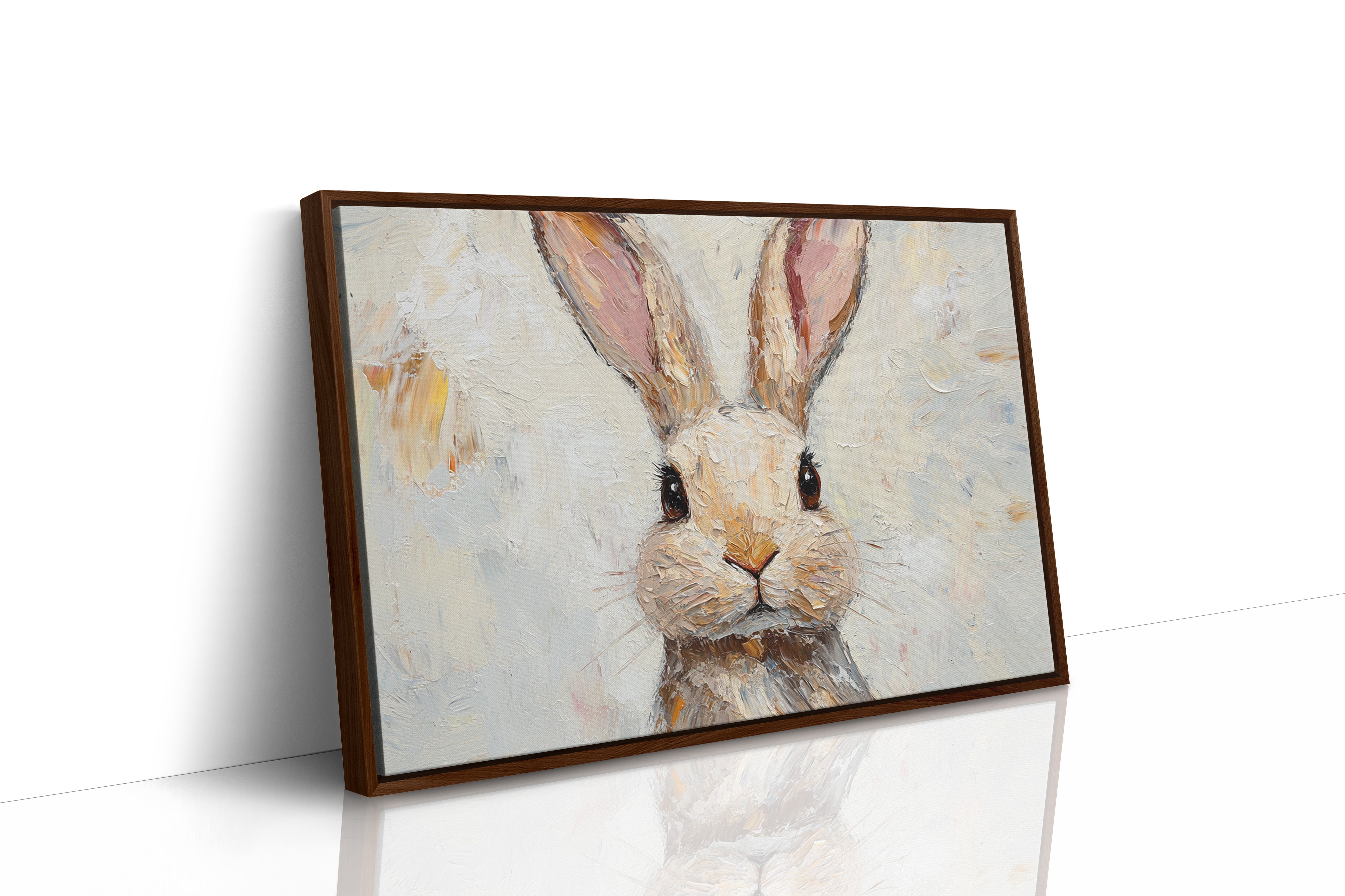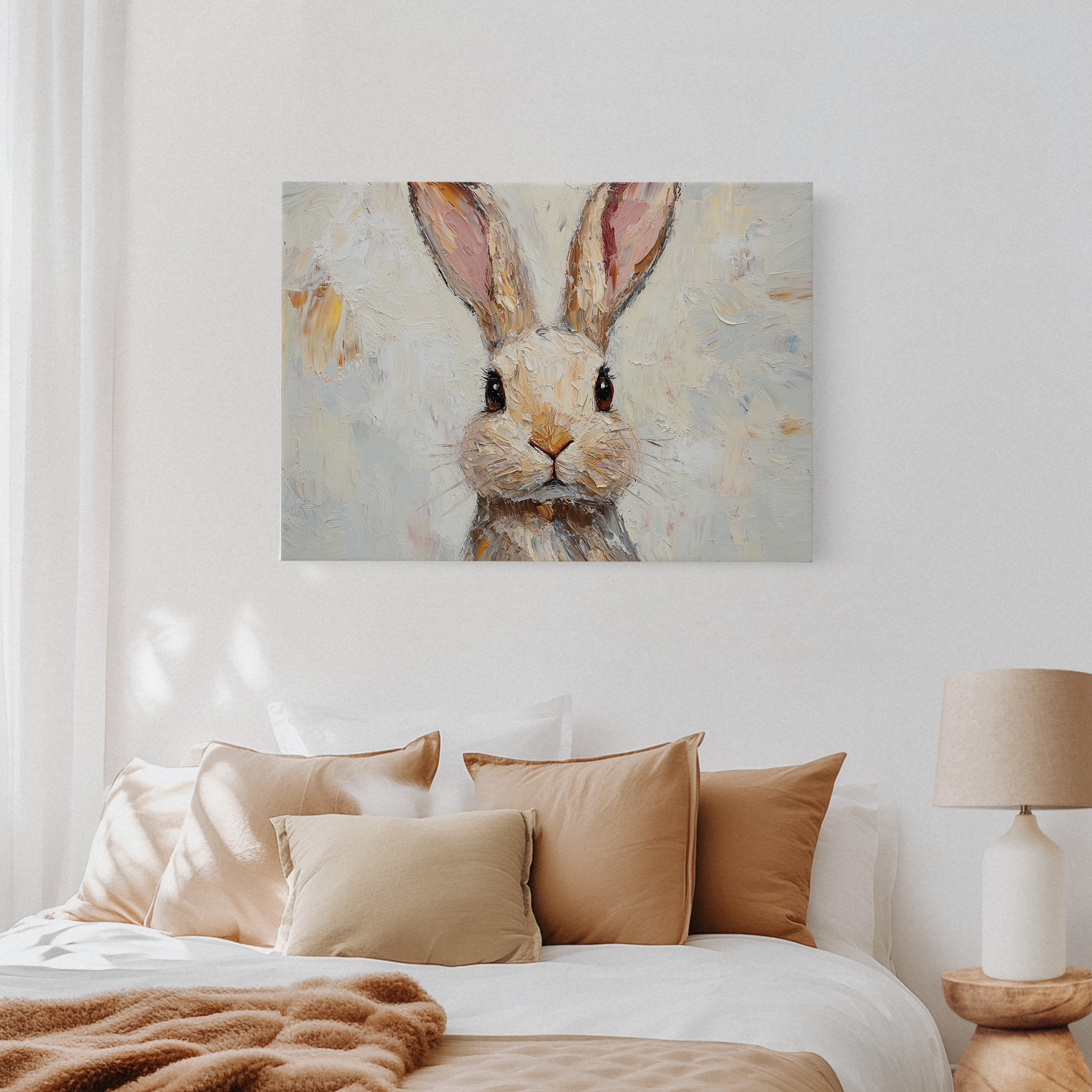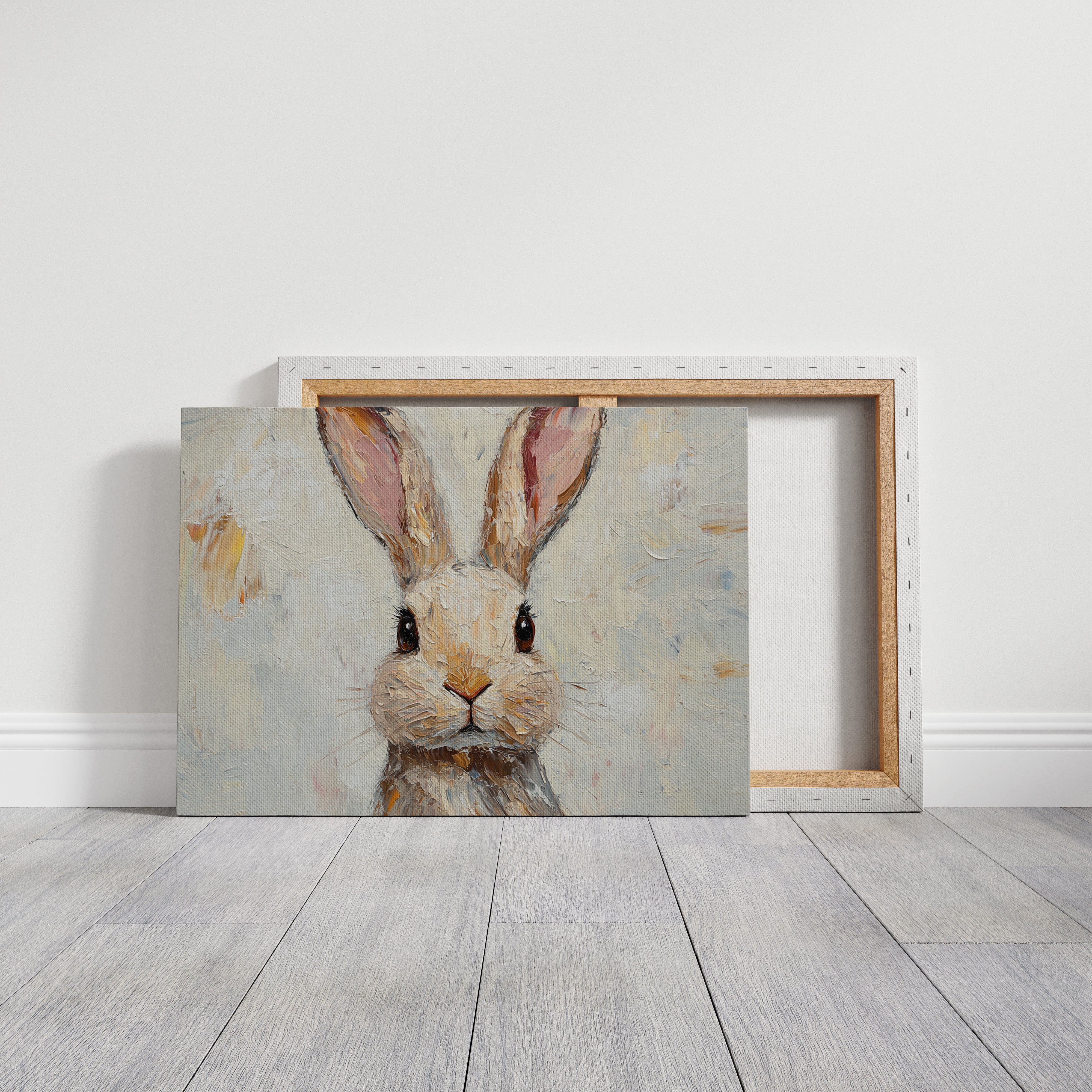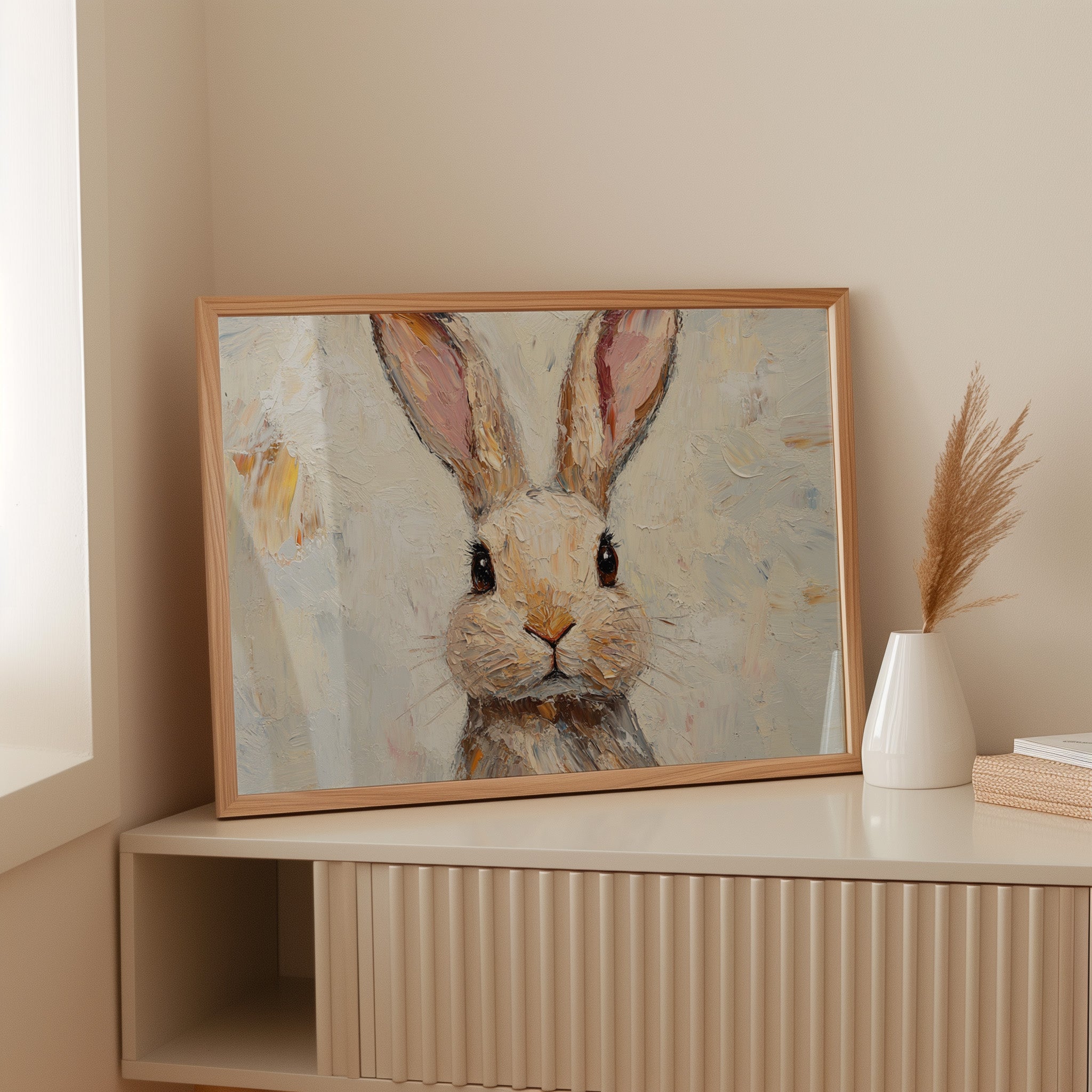 A close-up portrait captures the endearing gaze of a rabbit, its expression alive with gentle inquisitiveness. Thick, textured brushstrokes create a tactile fur effect, with delicate pink-tinged ears rising from a cream-colored face. The painting technique masterfully combines warm neutrals with subtle hints of blue and rose, bringing dimensional depth to each carefully placed stroke. This charming piece would bring a touch of whimsy and pastoral charm to a child's room or create an unexpected focal point in a modern farmhouse kitchen.