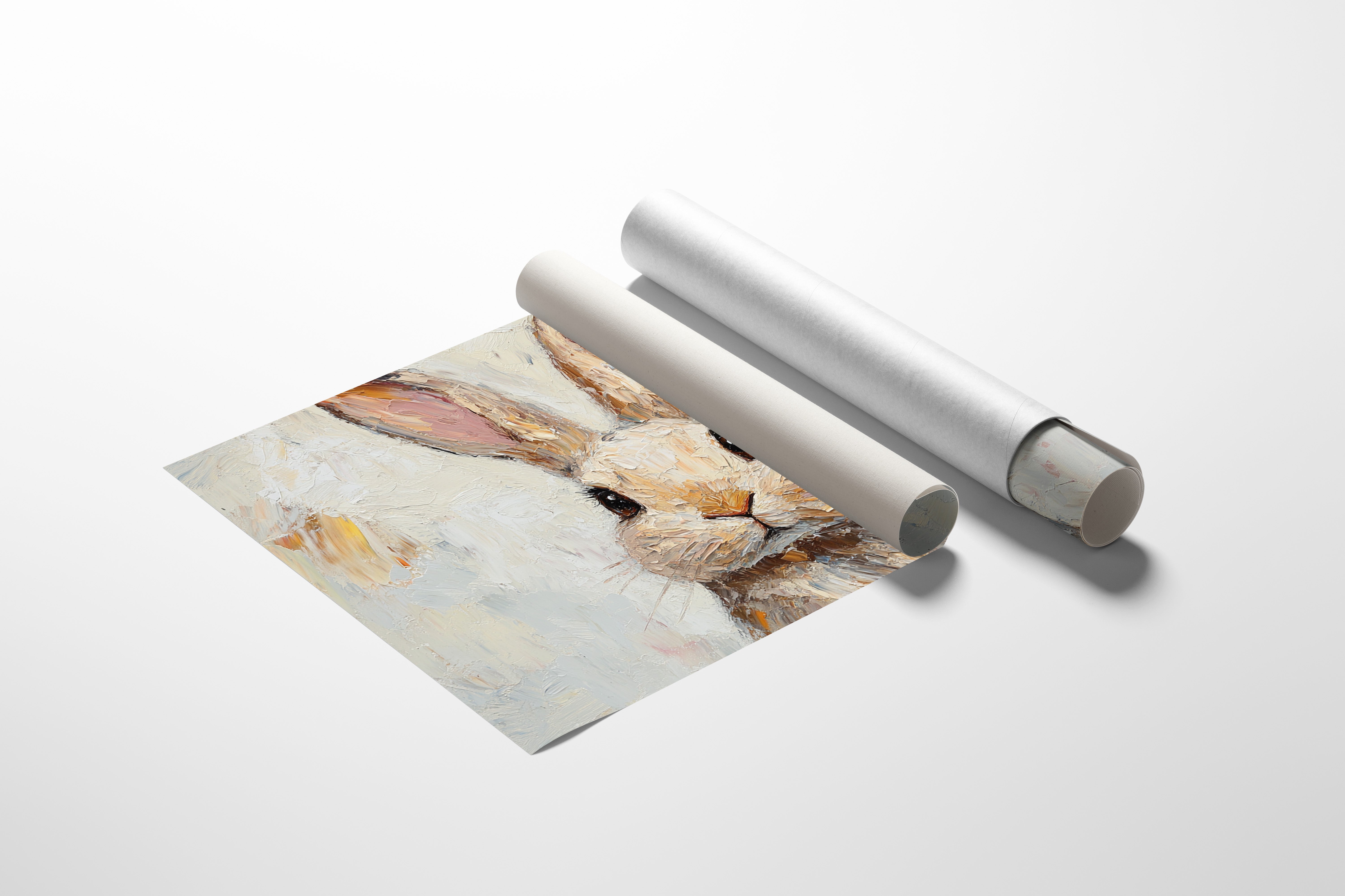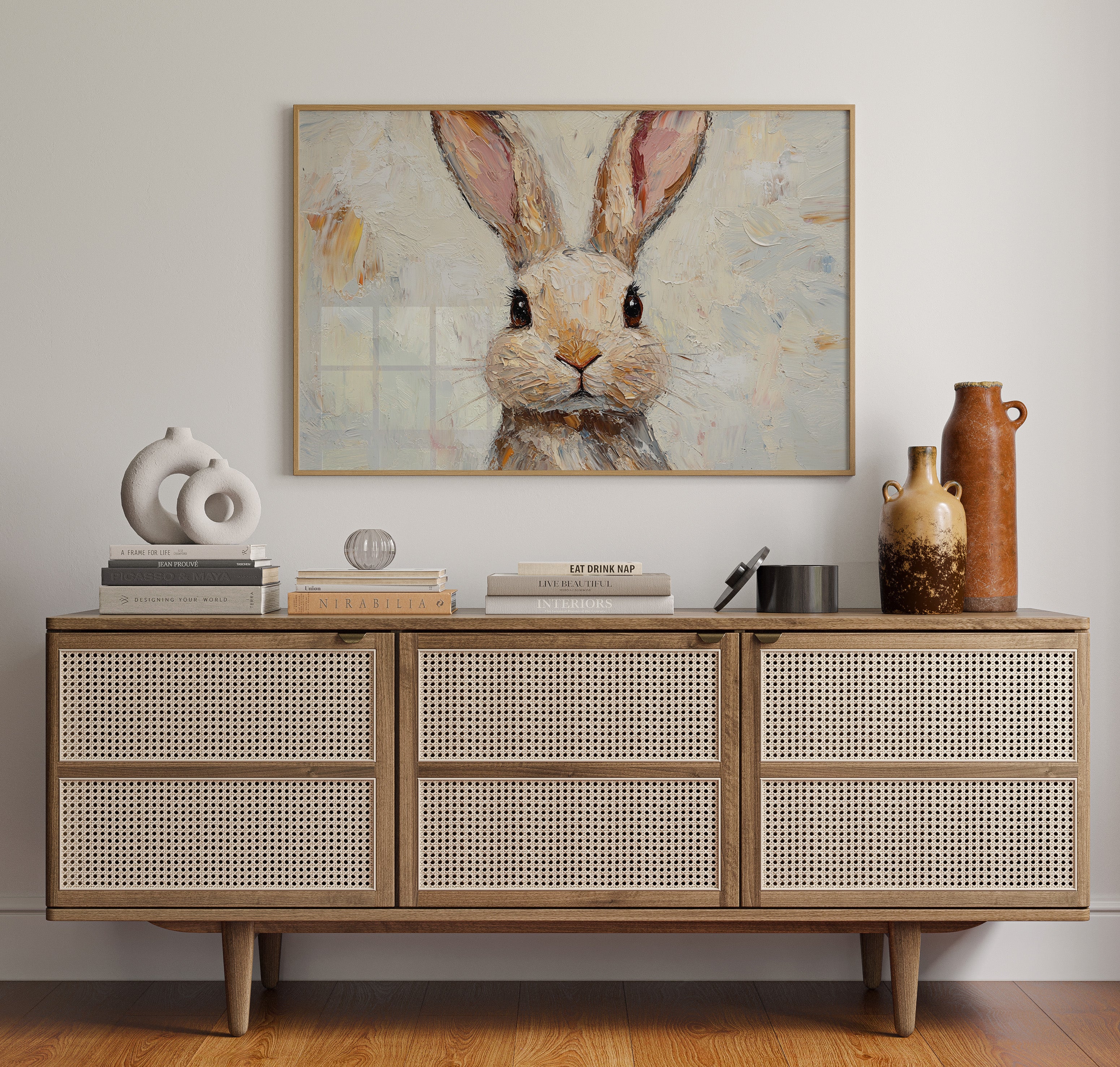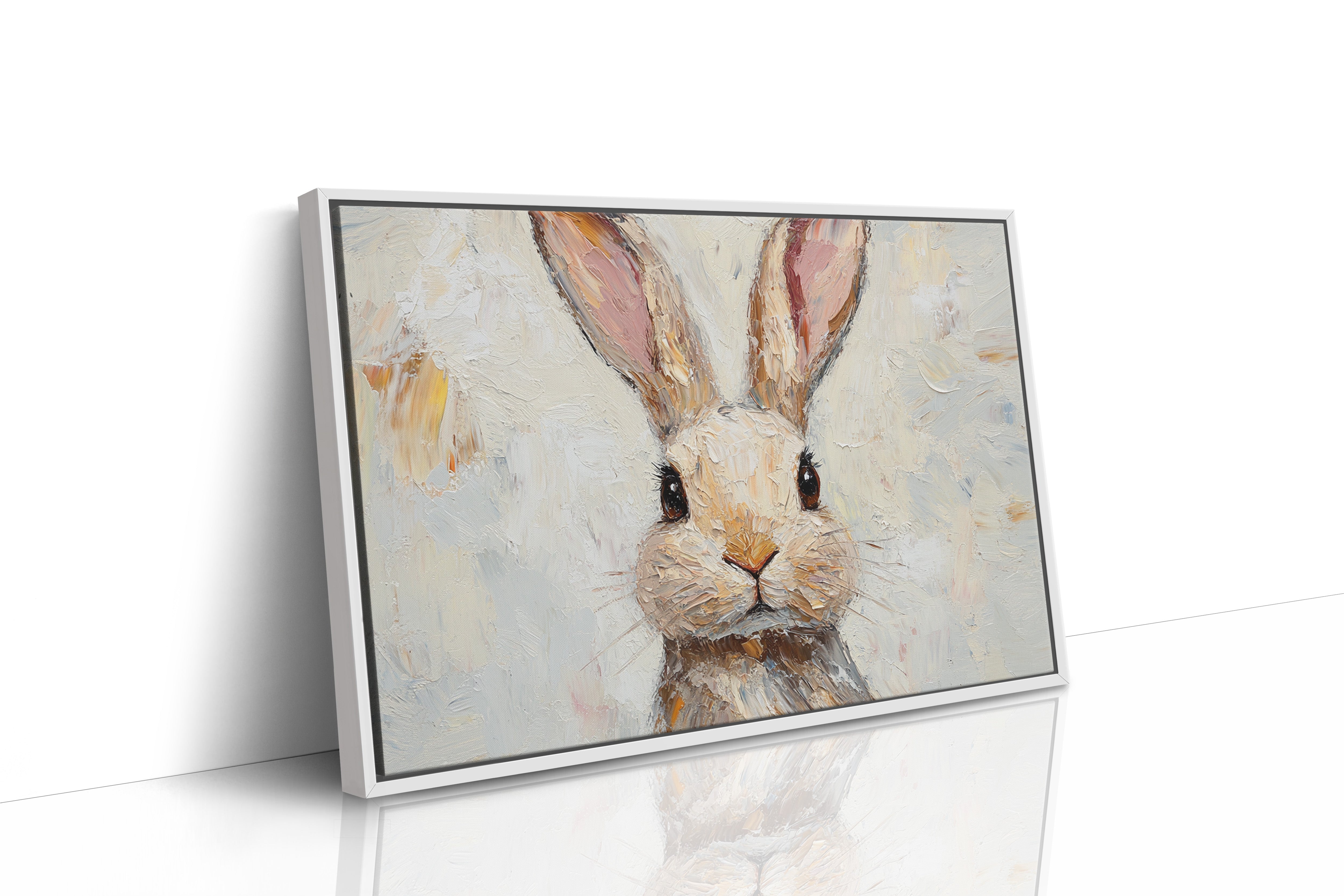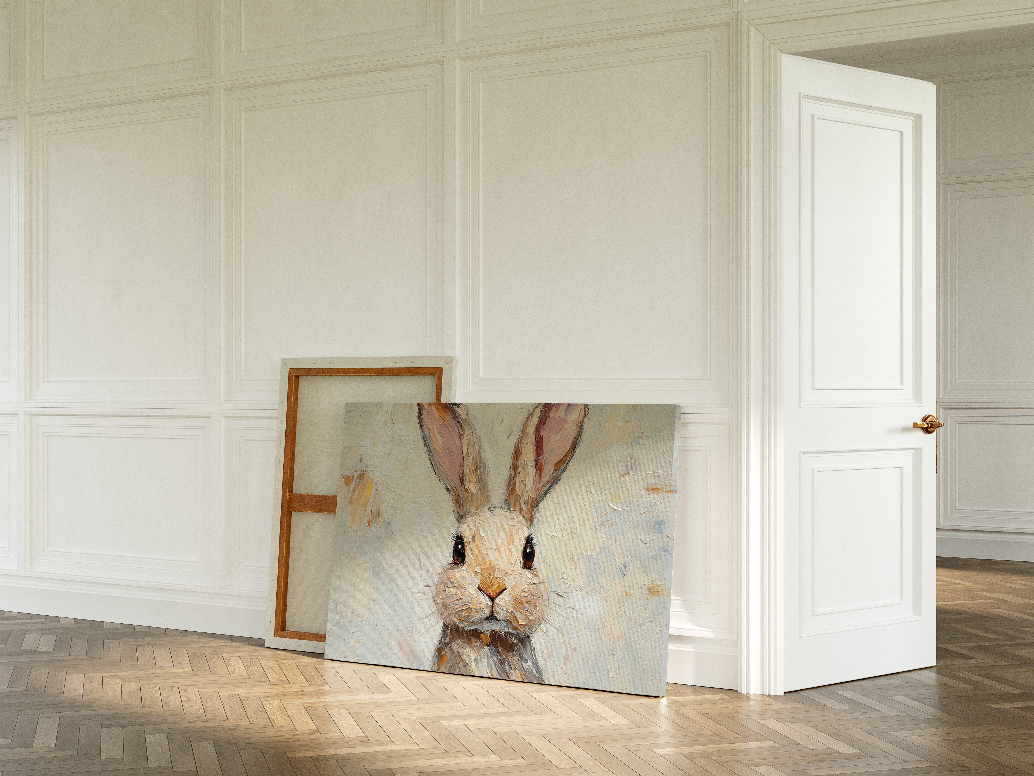 A close-up portrait captures the endearing gaze of a rabbit, its expression alive with gentle inquisitiveness. Thick, textured brushstrokes create a tactile fur effect, with delicate pink-tinged ears rising from a cream-colored face. The painting technique masterfully combines warm neutrals with subtle hints of blue and rose, bringing dimensional depth to each carefully placed stroke. This charming piece would bring a touch of whimsy and pastoral charm to a child's room or create an unexpected focal point in a modern farmhouse kitchen.