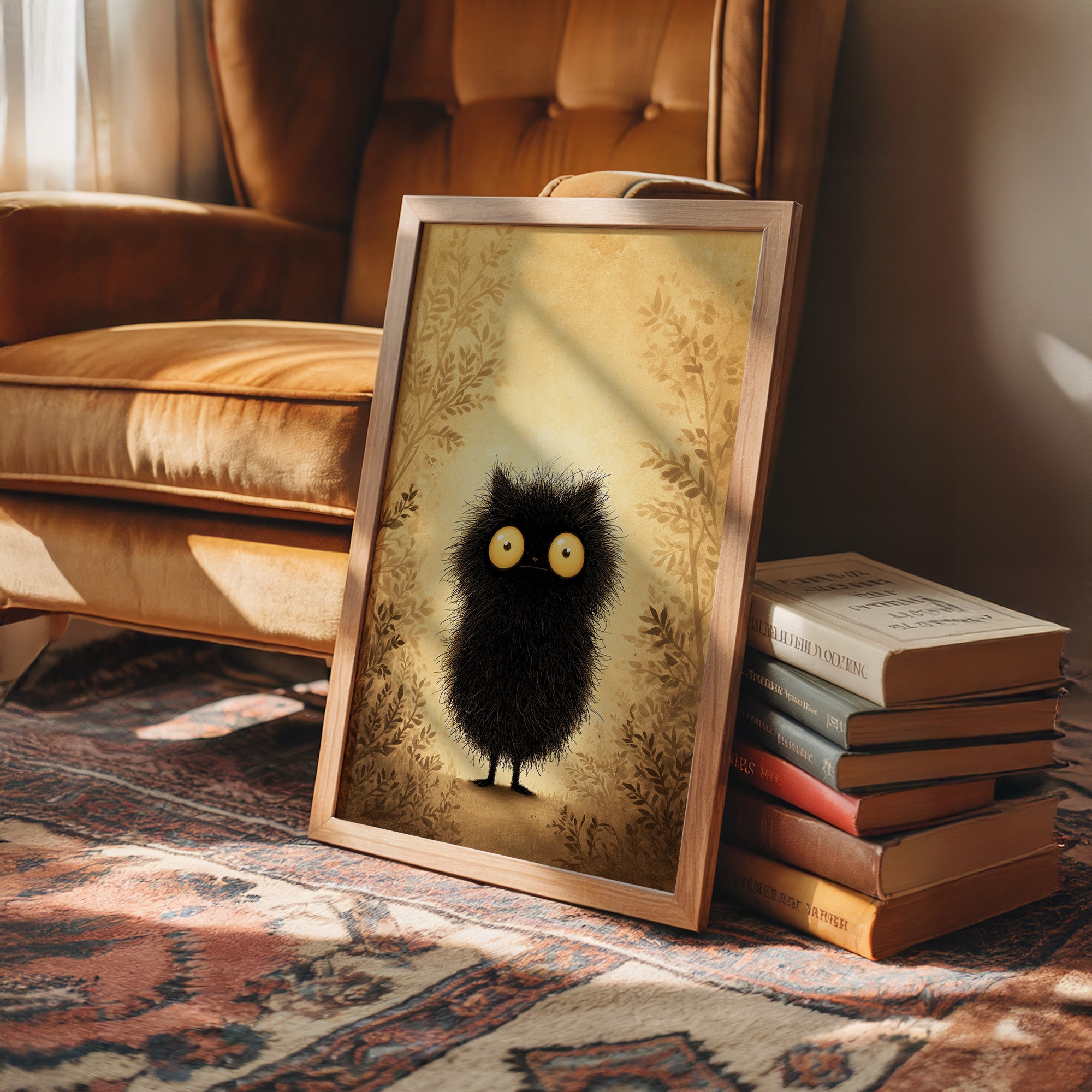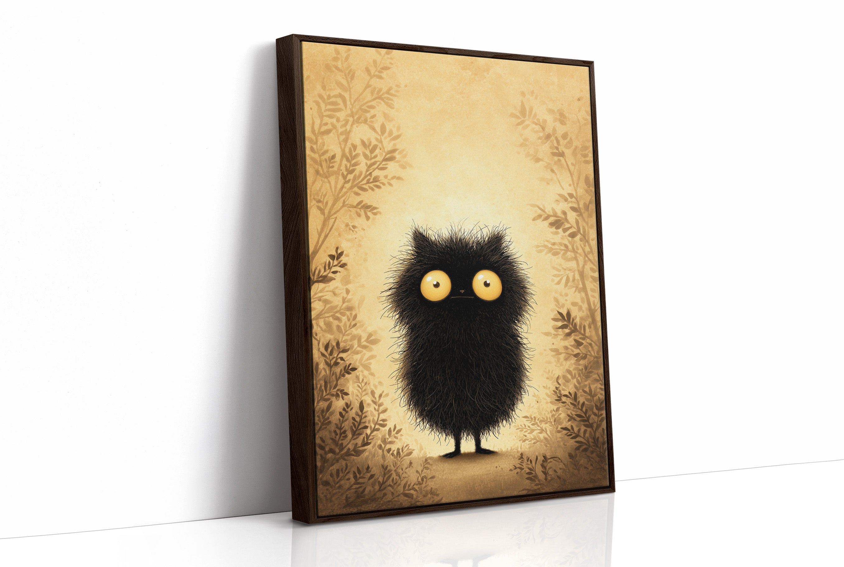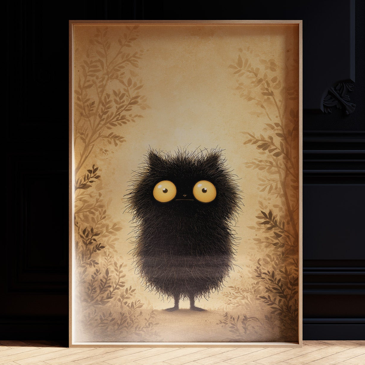 A whimsical creature peers out from its amber-hued world, round yellow eyes gleaming with innocent curiosity. The fuzzy black character stands in perfect contrast against the warm sepia background, its silhouette framed by delicate botanical illustrations that create a dreamlike forest boundary. This charming illustration balances playfulness with an air of mysterious storytelling, inviting viewers to imagine the adventures of this endearing character.