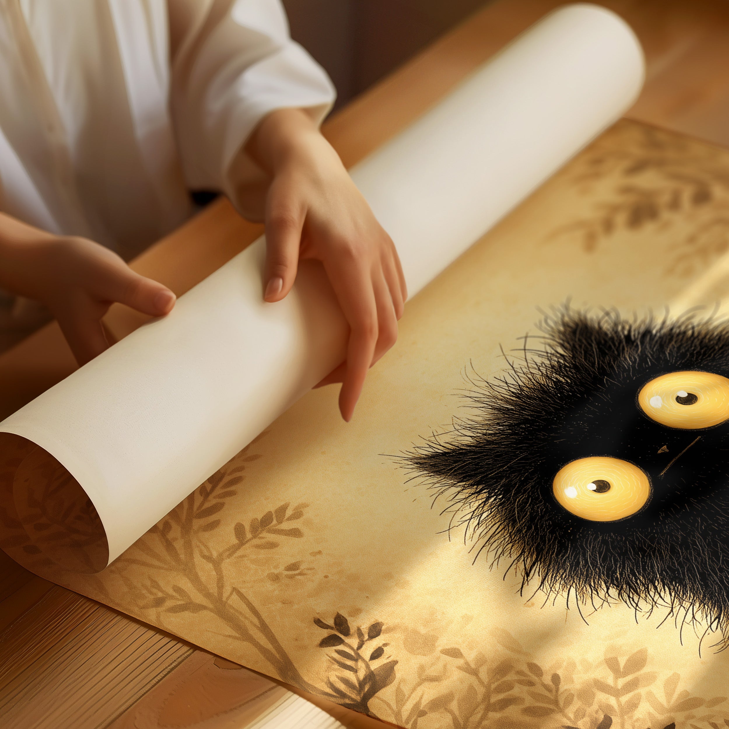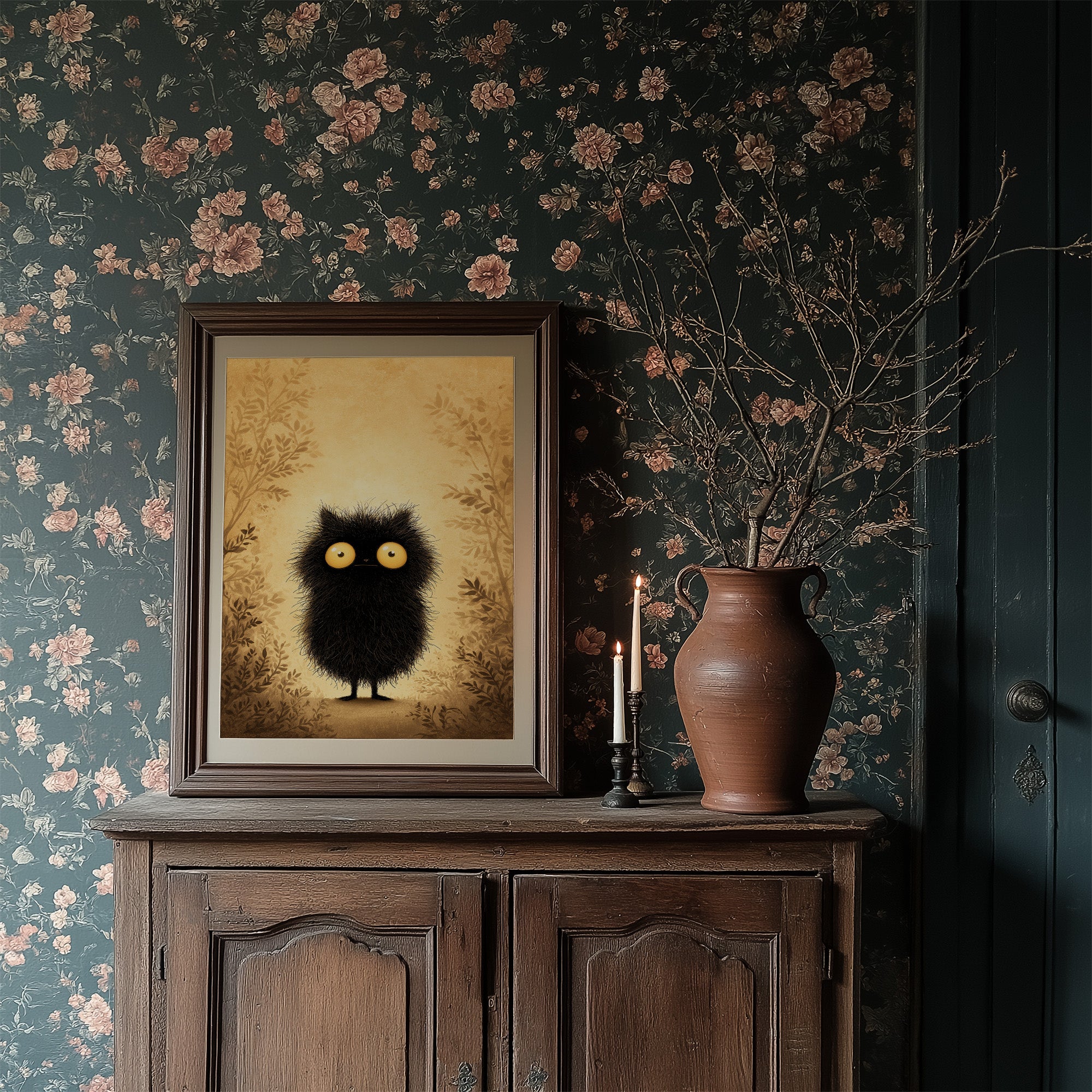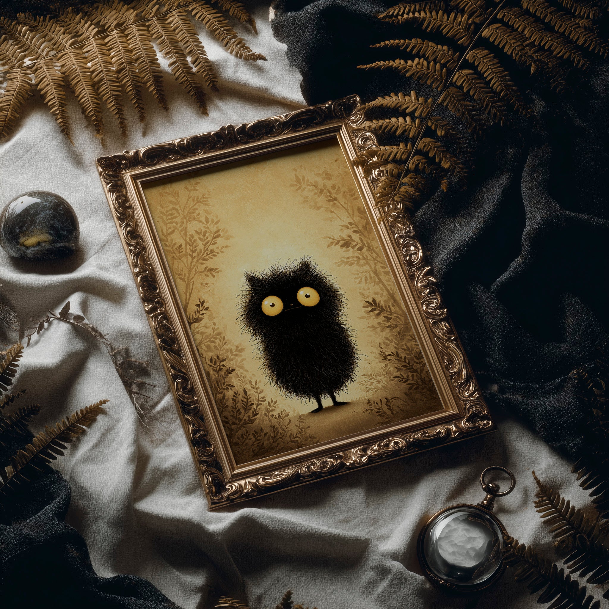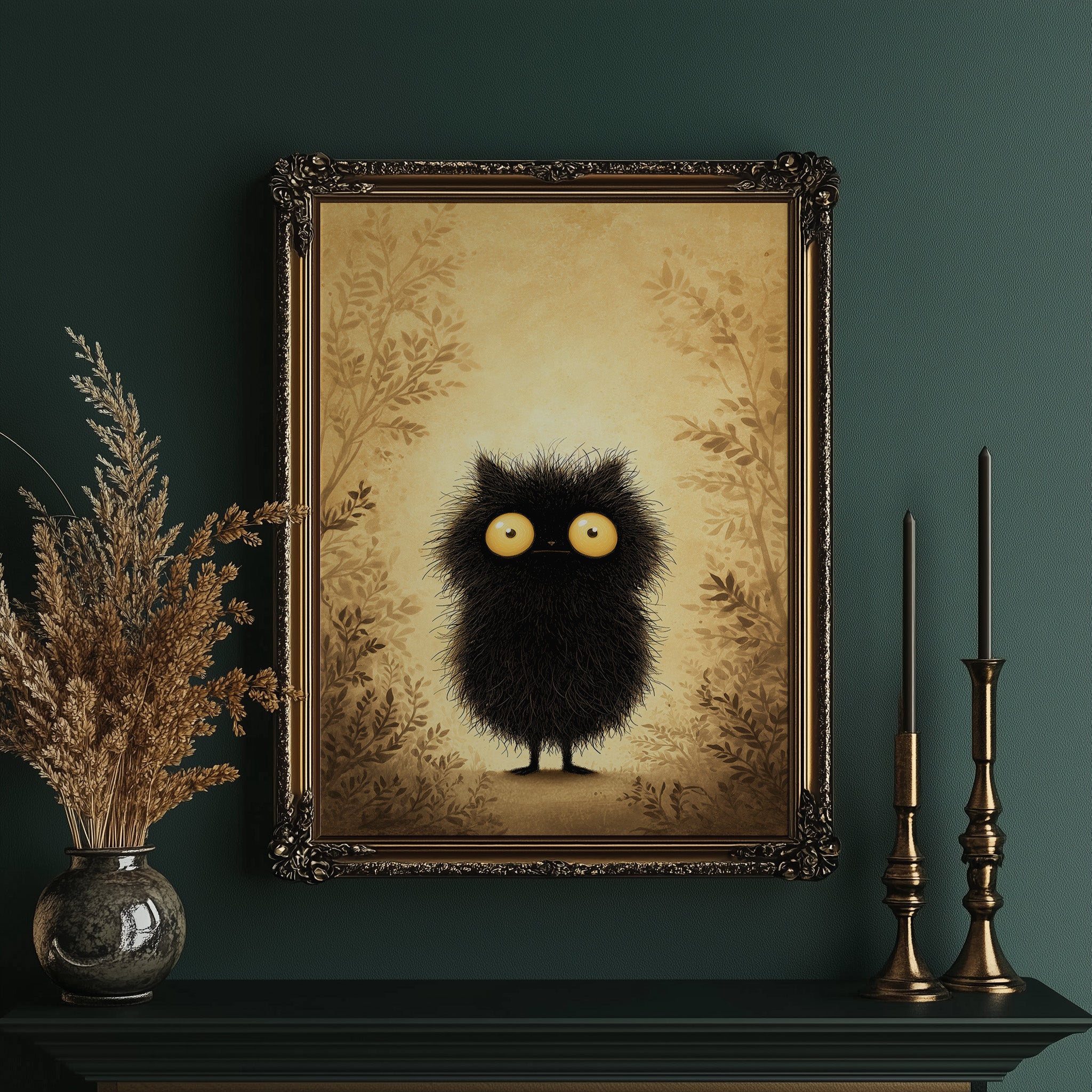 A whimsical creature peers out from its amber-hued world, round yellow eyes gleaming with innocent curiosity. The fuzzy black character stands in perfect contrast against the warm sepia background, its silhouette framed by delicate botanical illustrations that create a dreamlike forest boundary. This charming illustration balances playfulness with an air of mysterious storytelling, inviting viewers to imagine the adventures of this endearing character.