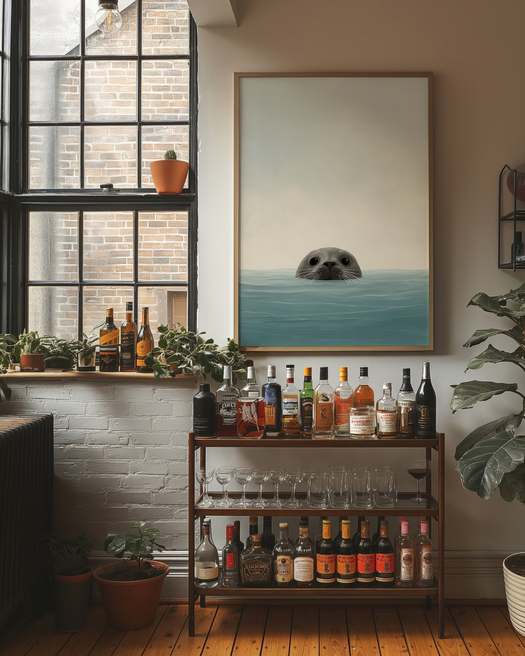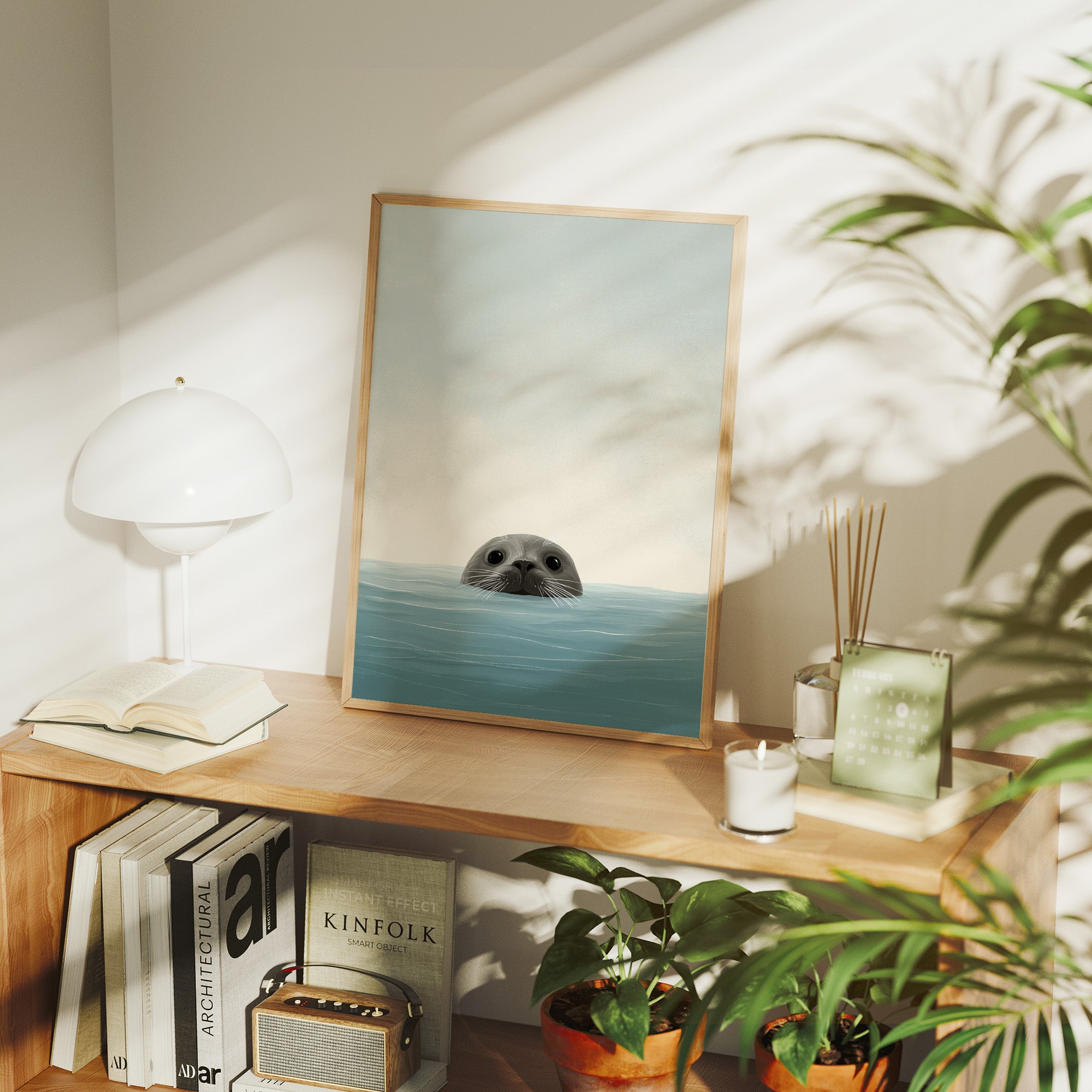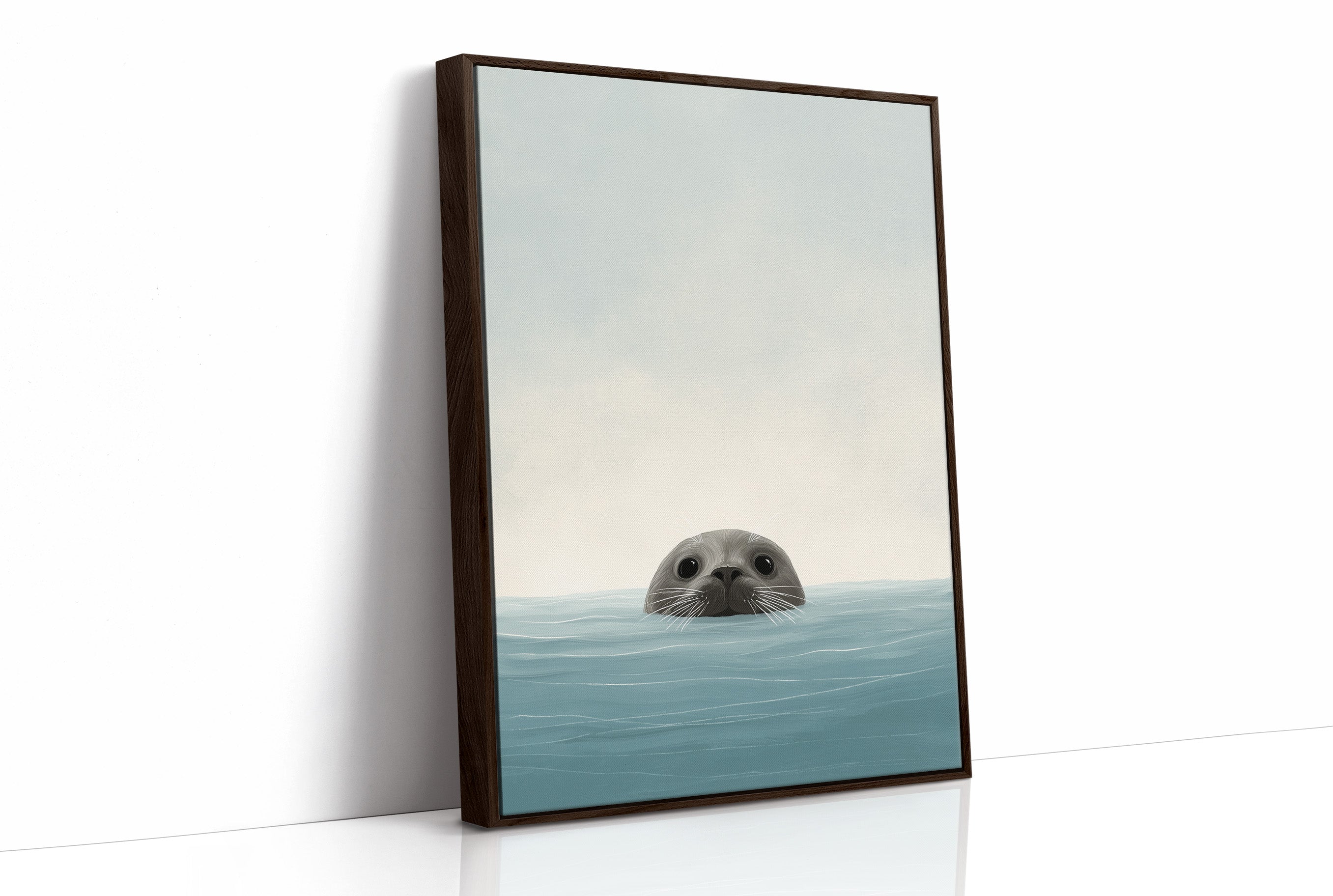 A gentle moment of discovery captured in soft aqua tones. The inquisitive seal's round eyes and whiskered snout emerge just above the waterline, creating a charming portrait of marine curiosity against a minimalist backdrop. The illustration's simple lines and soothing color palette bring a touch of coastal serenity to this contemporary piece, perfectly framed in warm wood.