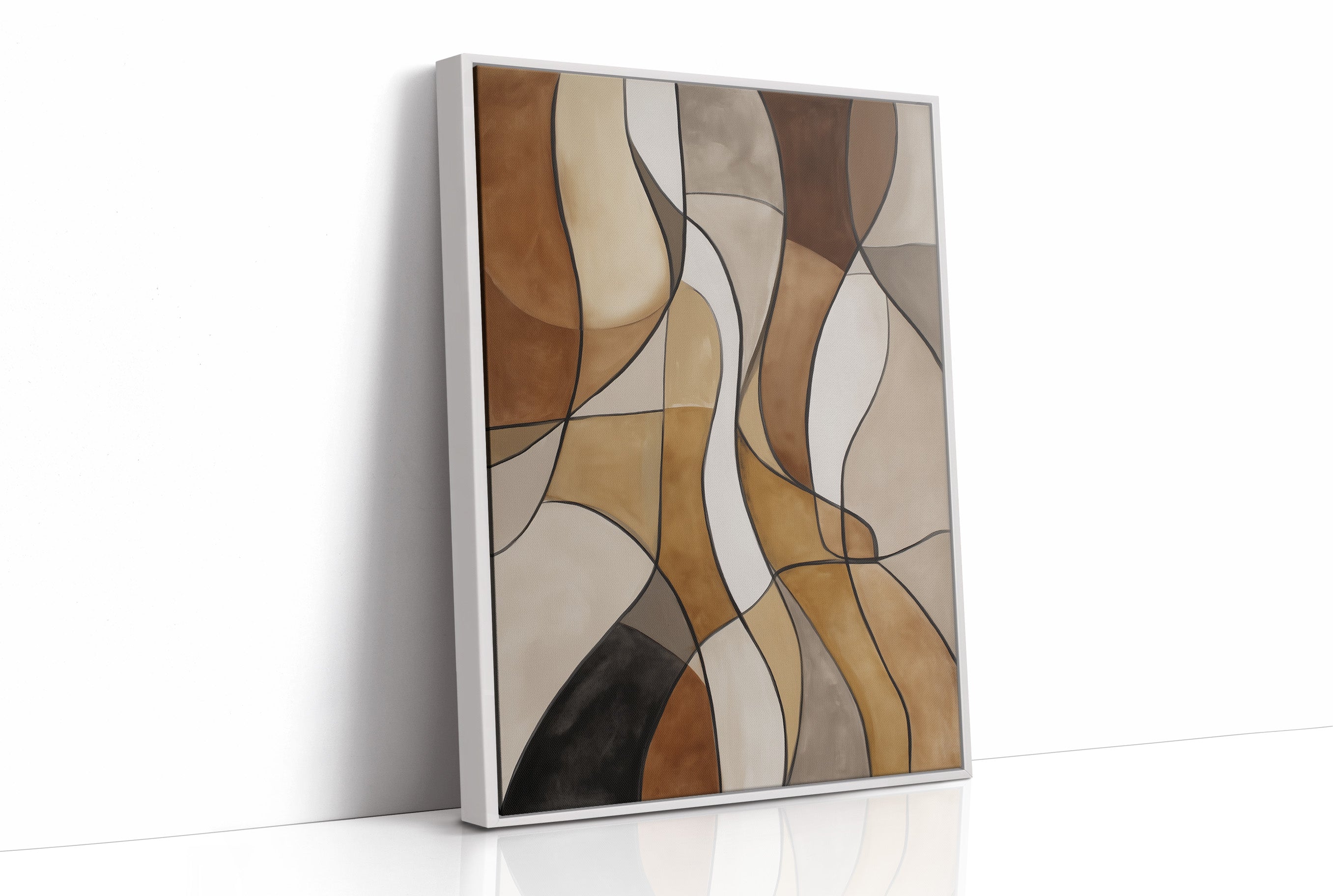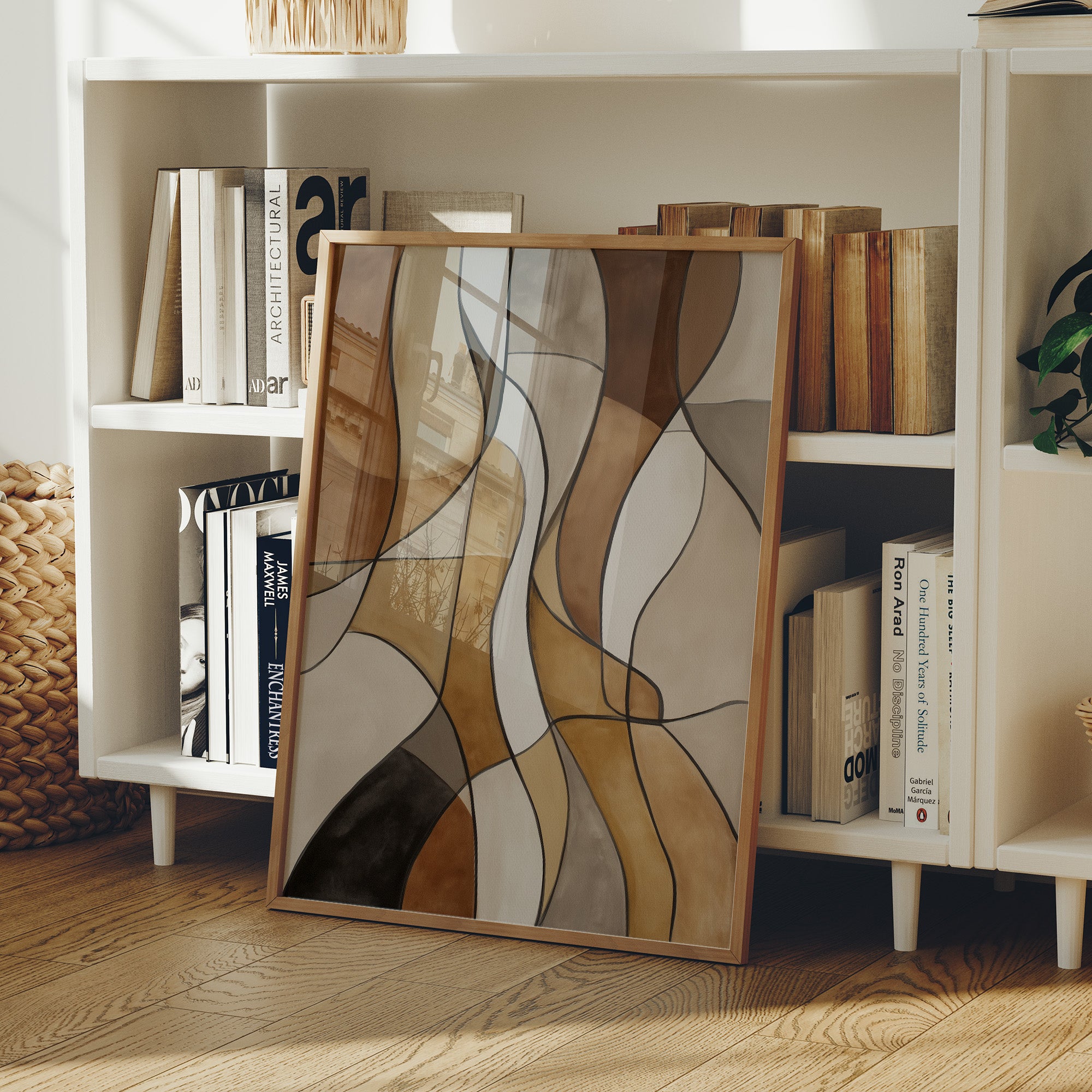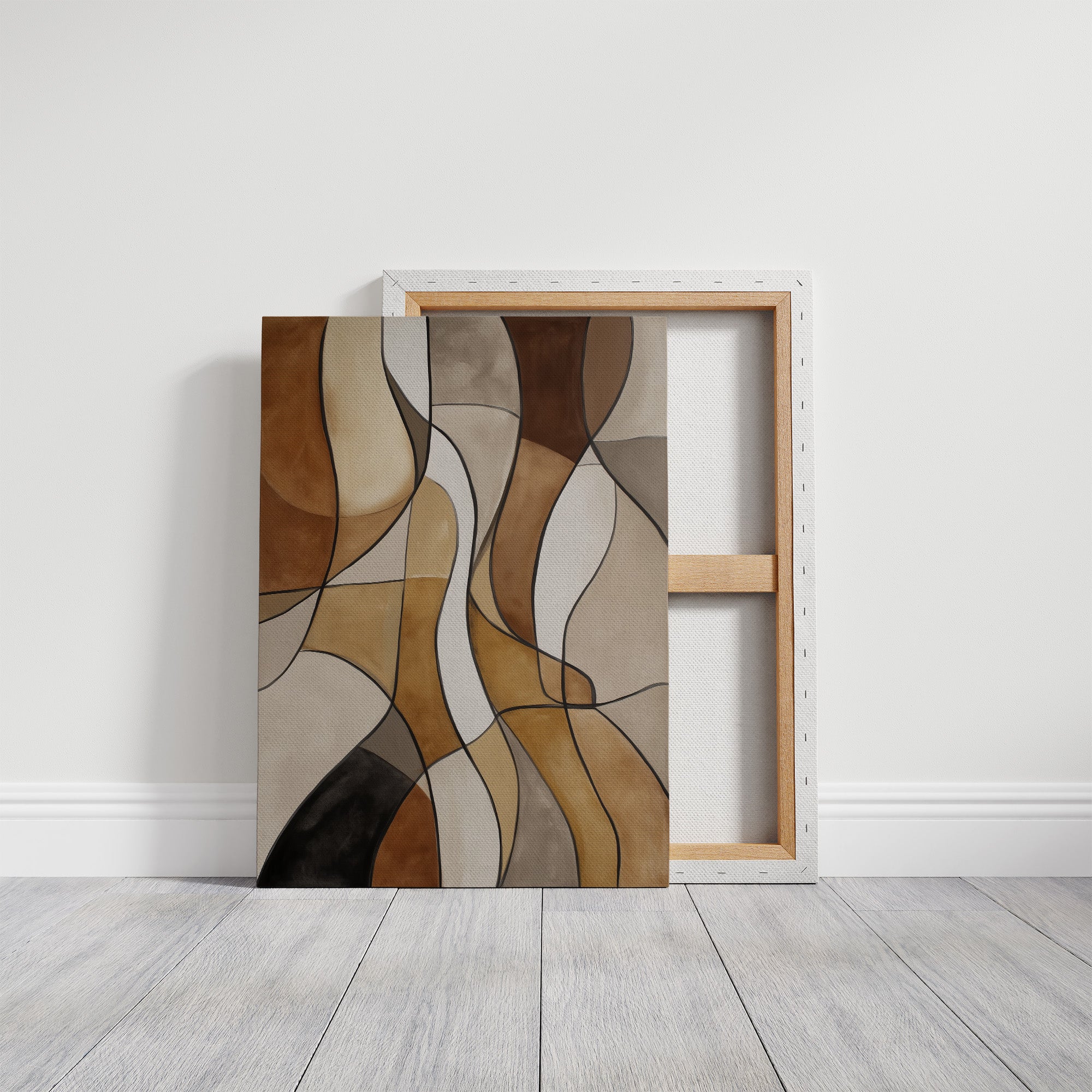 Gentle waves of ochre and cream dance across the canvas, creating a mesmerizing rhythm of organic movement. The abstract composition flows with purposeful curves, blending warm earth tones with crisp whites and deep browns in a sophisticated interplay of light and shadow. This contemporary piece brings a sense of natural harmony to any space, reminiscent of desert landscapes or flowing silk. This piece would elevate a modern living room or add artistic sophistication to a minimalist home office, where its neutral palette and flowing lines can create a focal point without overwhelming the space.