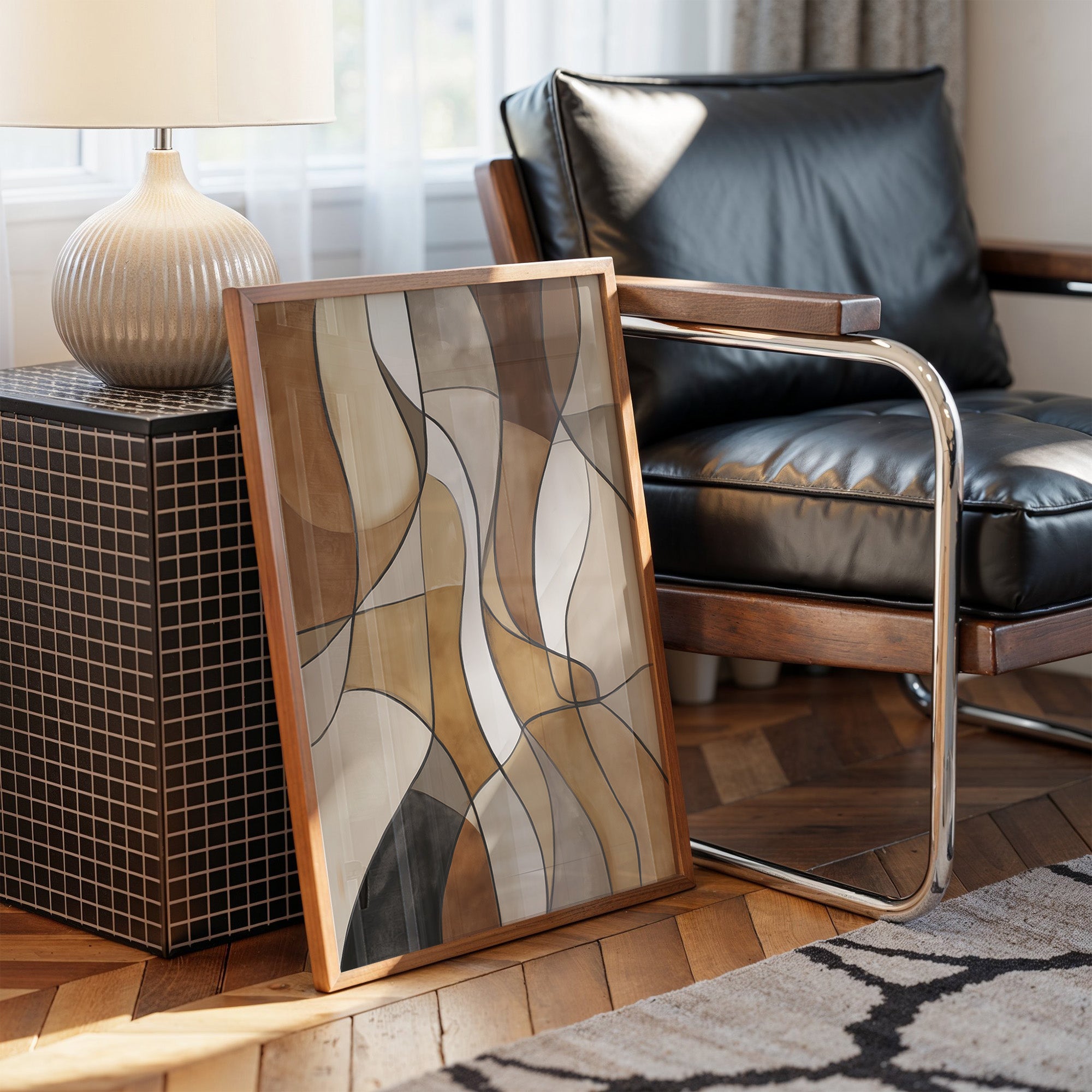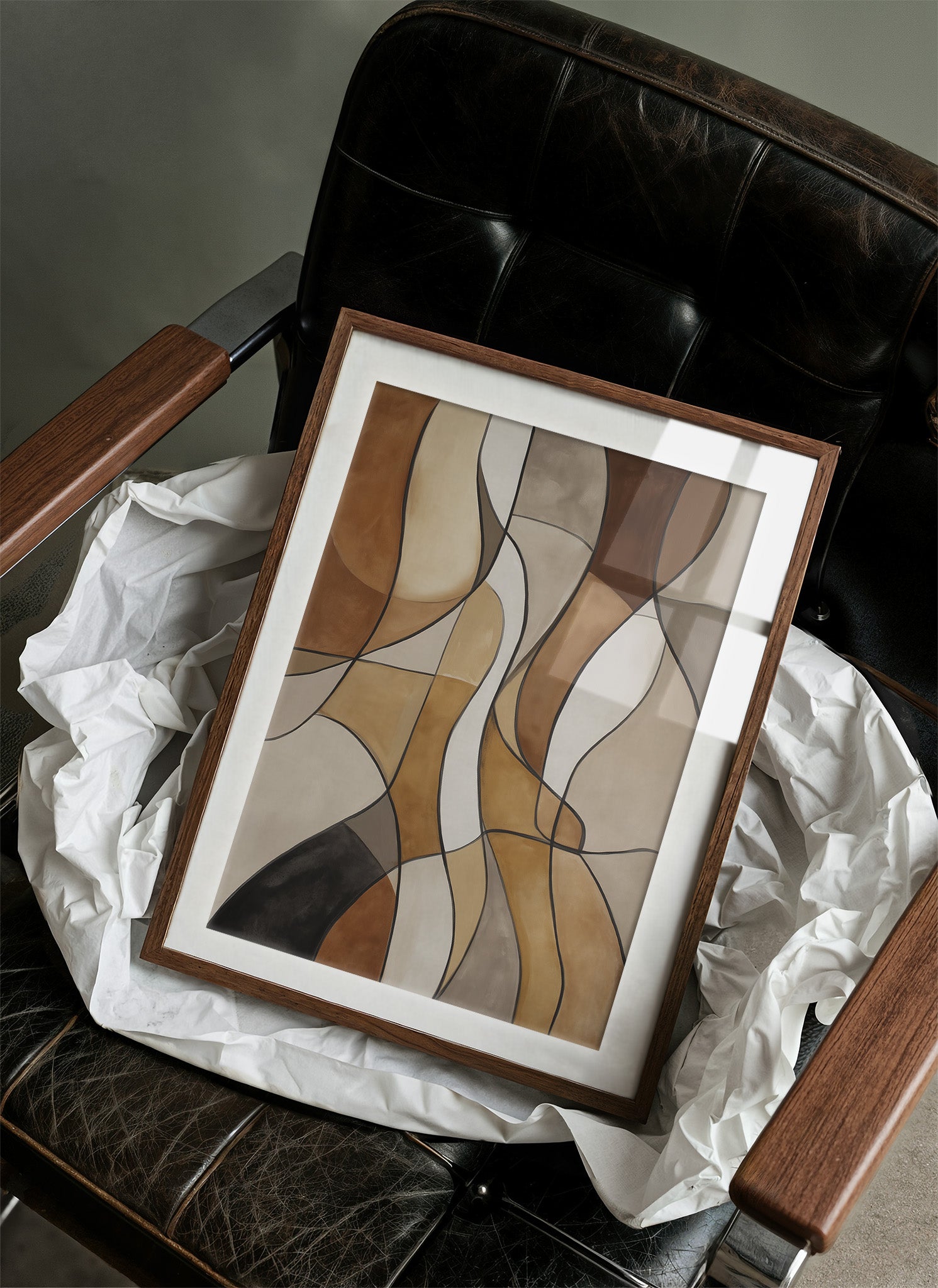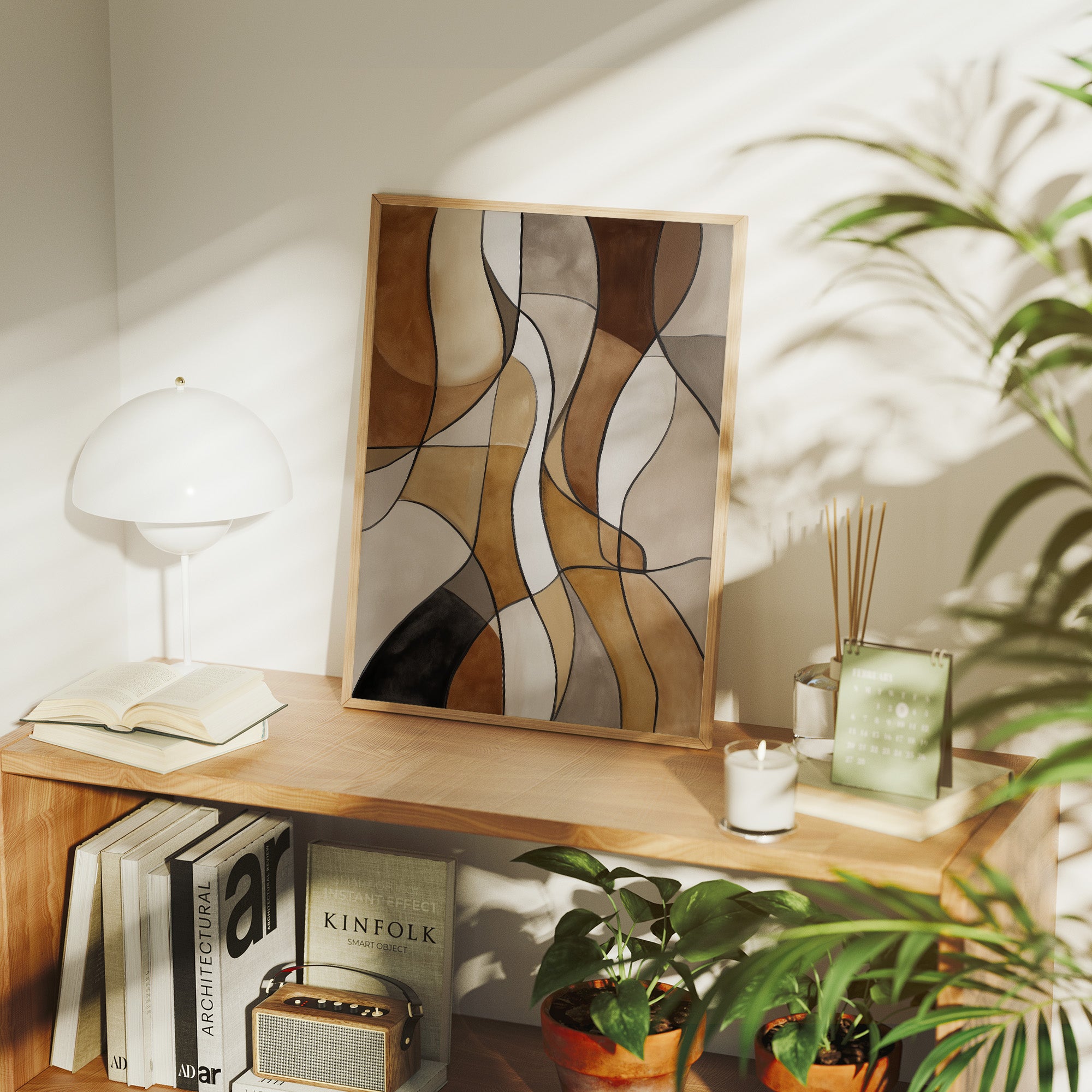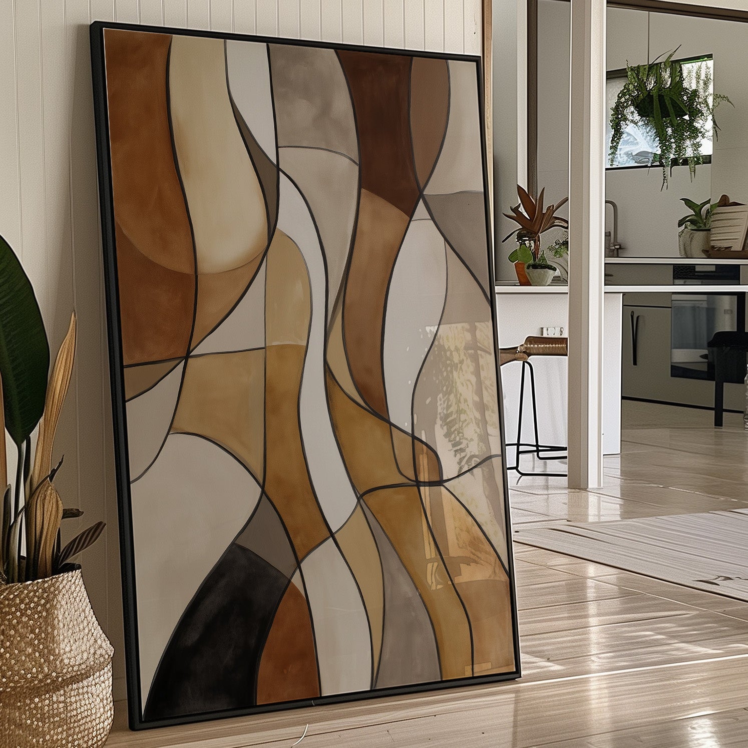 Gentle waves of ochre and cream dance across the canvas, creating a mesmerizing rhythm of organic movement. The abstract composition flows with purposeful curves, blending warm earth tones with crisp whites and deep browns in a sophisticated interplay of light and shadow. This contemporary piece brings a sense of natural harmony to any space, reminiscent of desert landscapes or flowing silk. This piece would elevate a modern living room or add artistic sophistication to a minimalist home office, where its neutral palette and flowing lines can create a focal point without overwhelming the space.