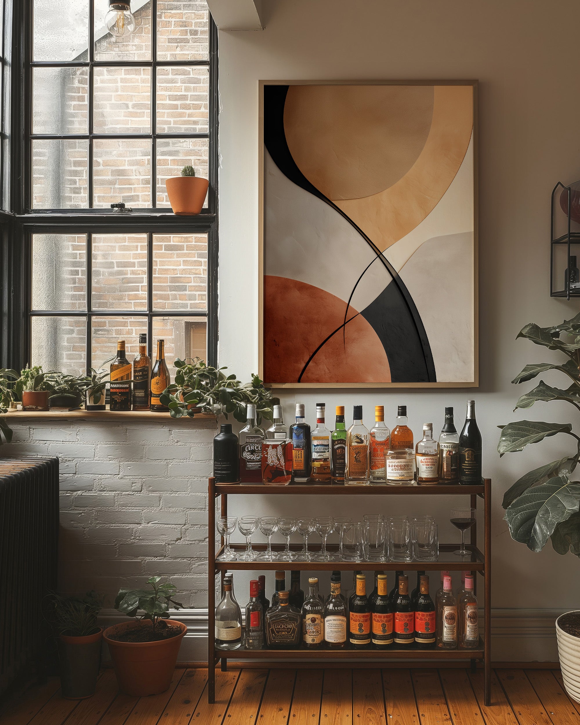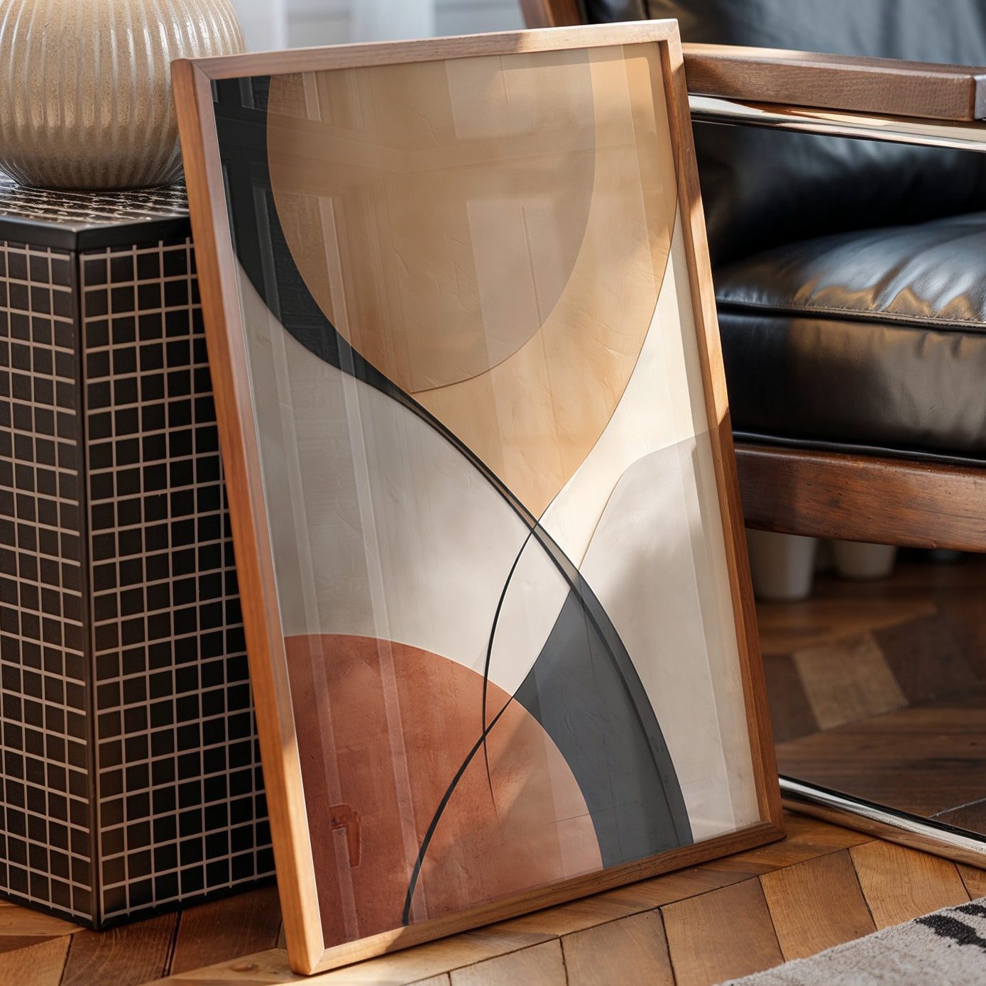 Gentle arcs sweep across the canvas like a modernist sunrise, blending warm terracotta with deep navy and cream tones. The composition's bold geometric shapes create a harmonious dance of form and shadow, while maintaining an air of sophisticated simplicity. The natural wood frame perfectly complements the earthy palette, creating a bridge between contemporary abstraction and organic warmth. This piece would bring a touch of refined elegance to a minimalist living room or add artistic sophistication to a modern home office.