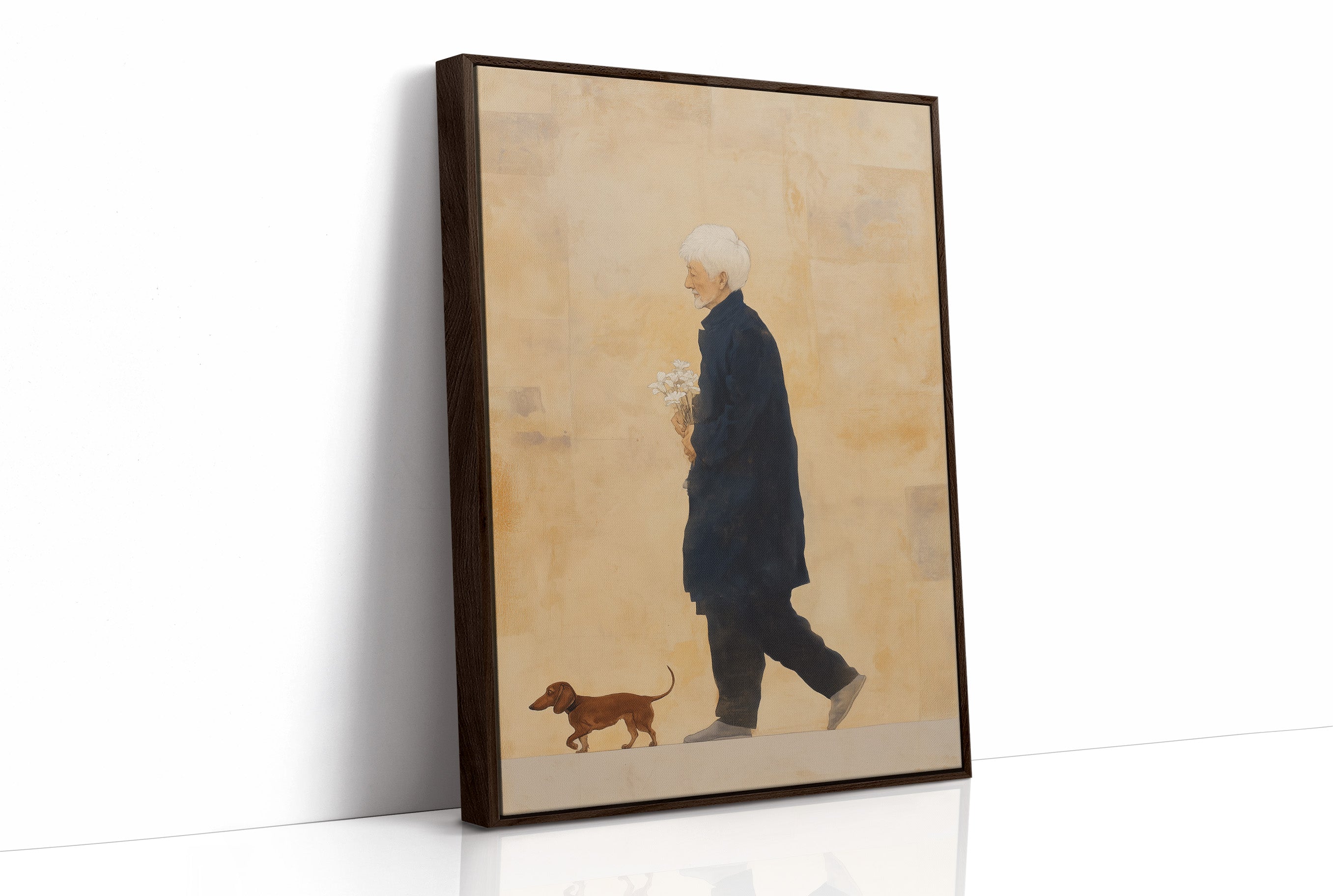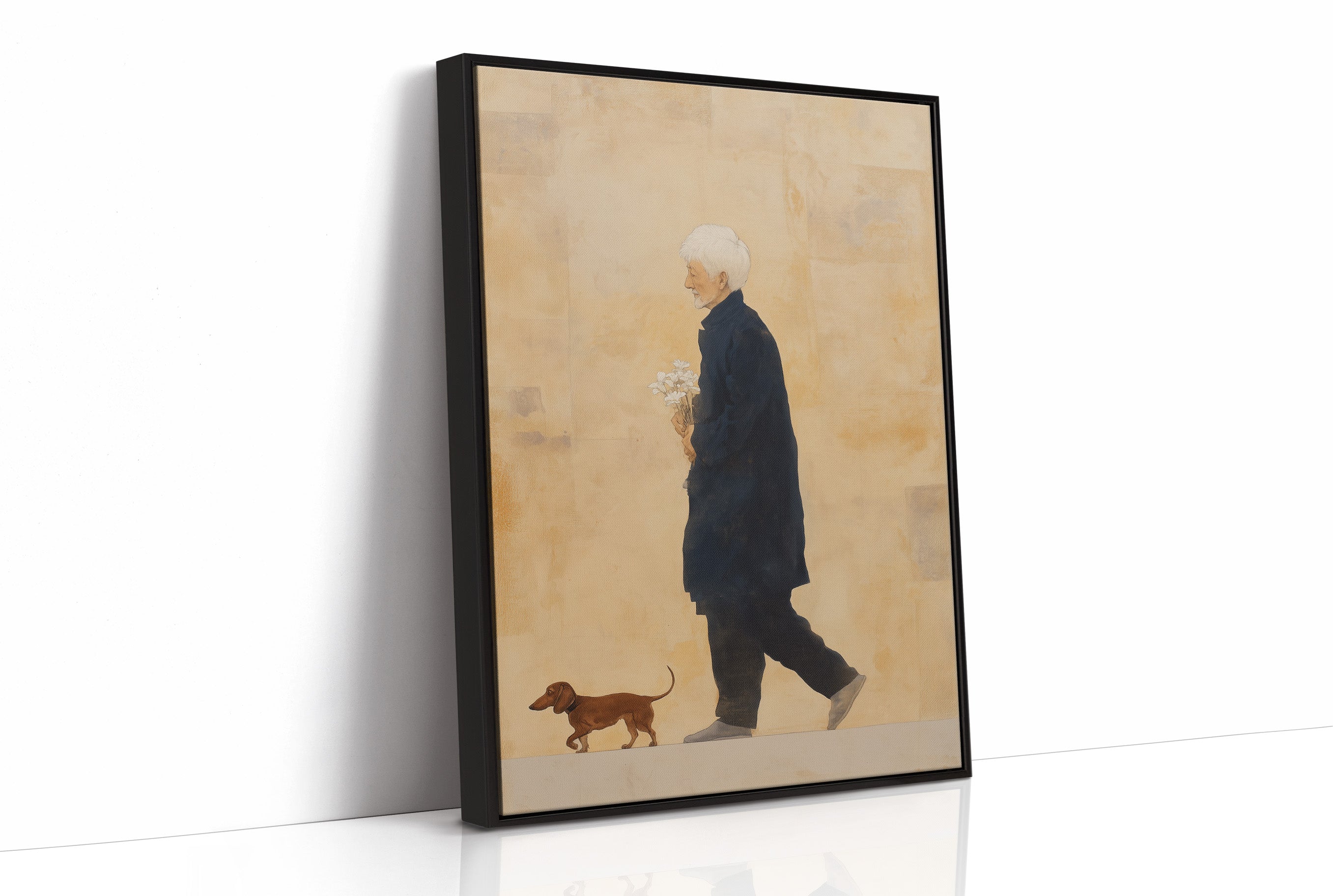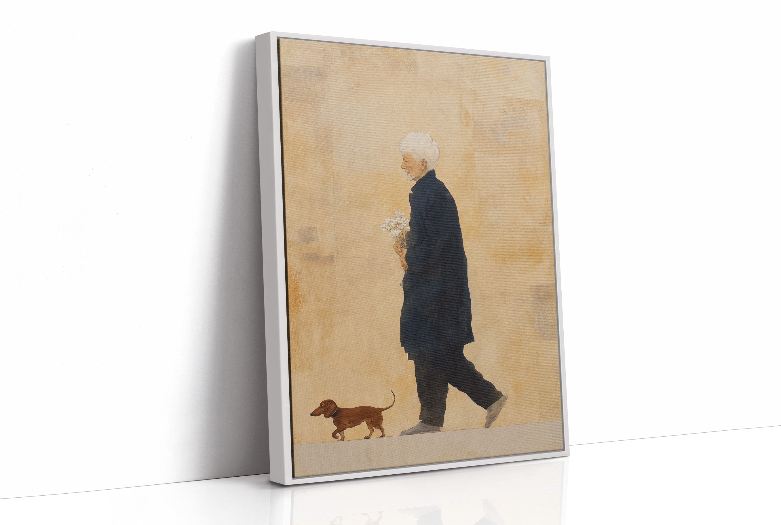 Gentle morning rays cast delicate shadows across a serene corner, illuminating a poignant illustration of companionship. The minimalist artwork captures a tender moment - a figure in a navy coat walking alongside their faithful dachshund, set against a warm ochre background that speaks of nostalgia and timeless bonds. This contemporary piece finds harmony among natural elements, from the crisp white lamp to the verdant plants, creating a thoughtful narrative about everyday joy.