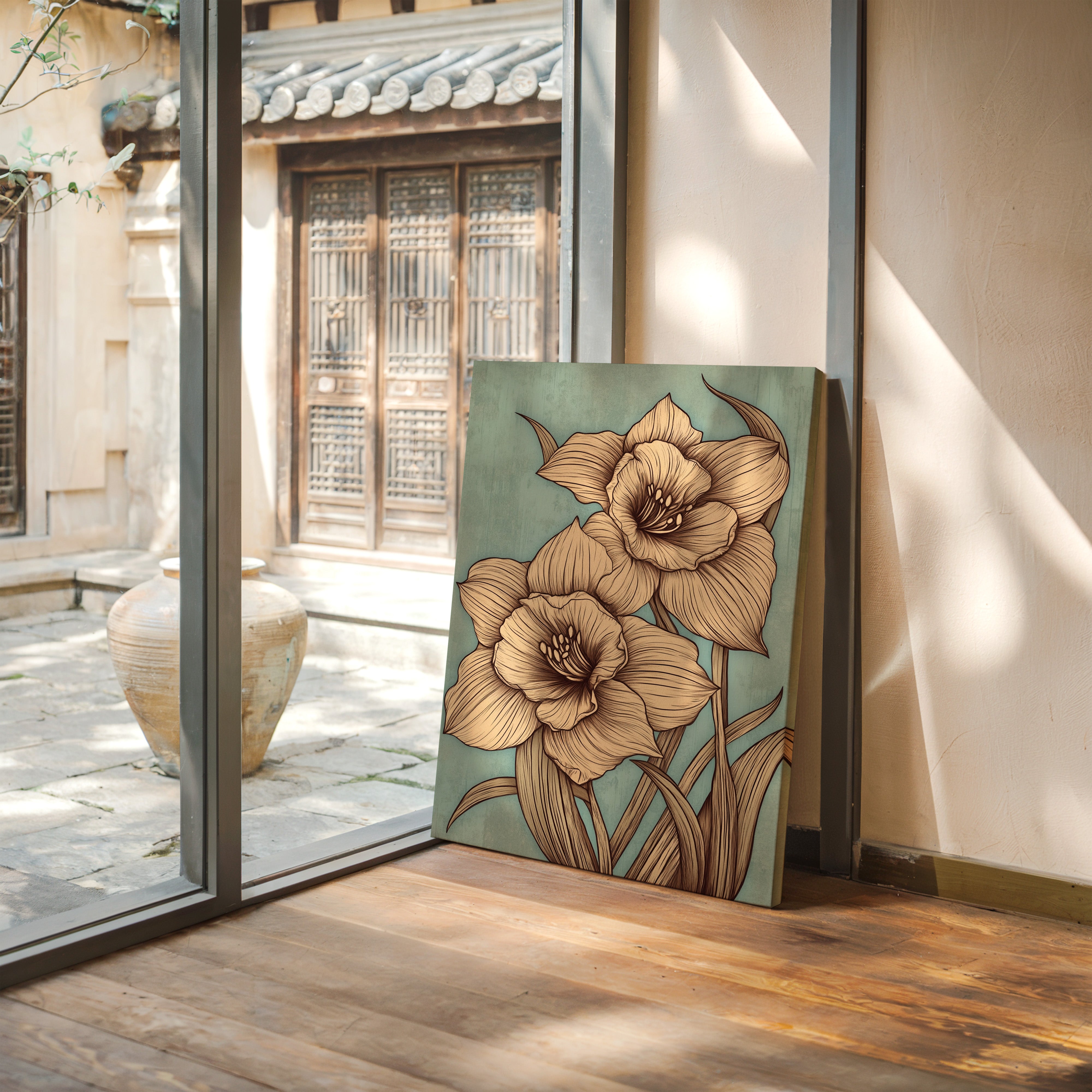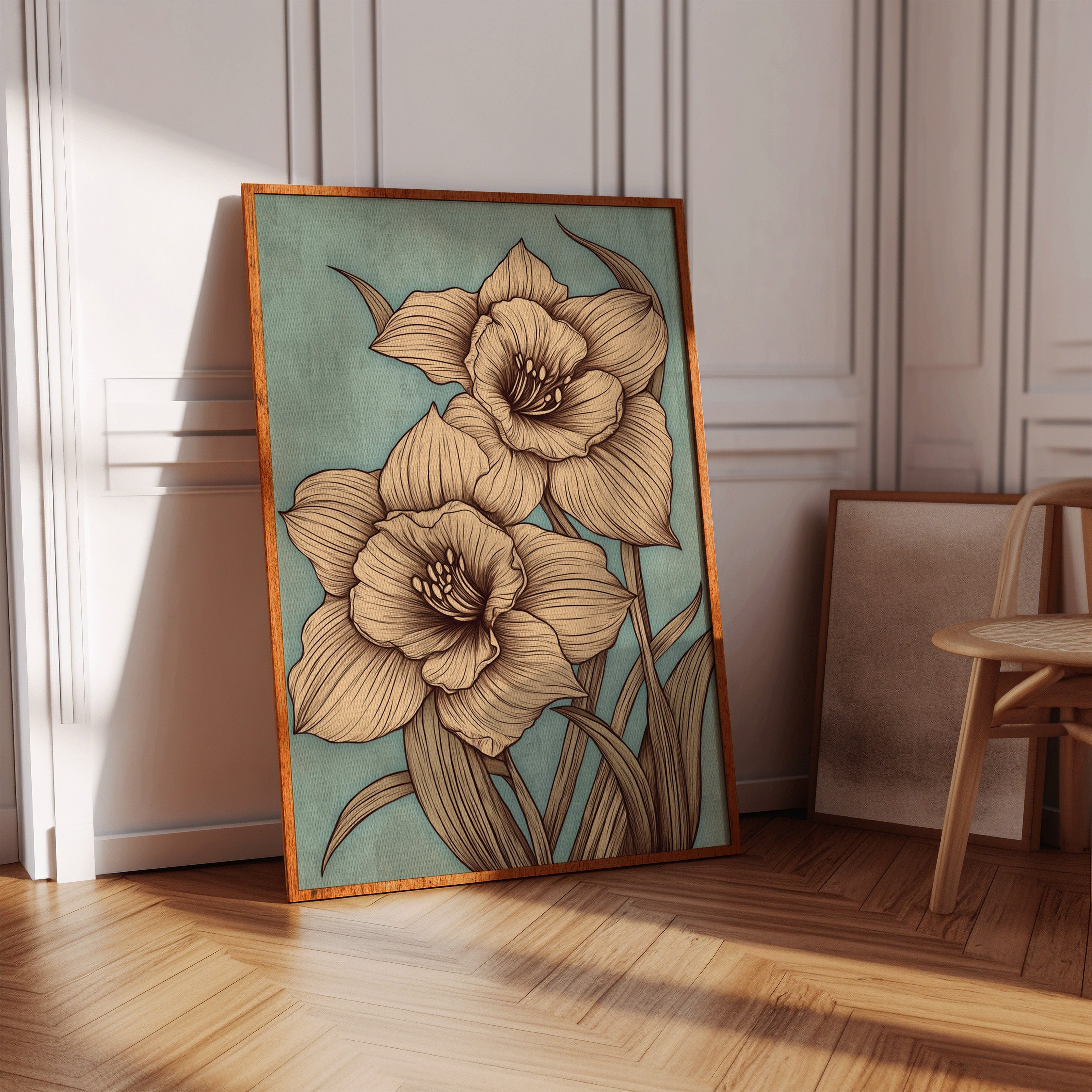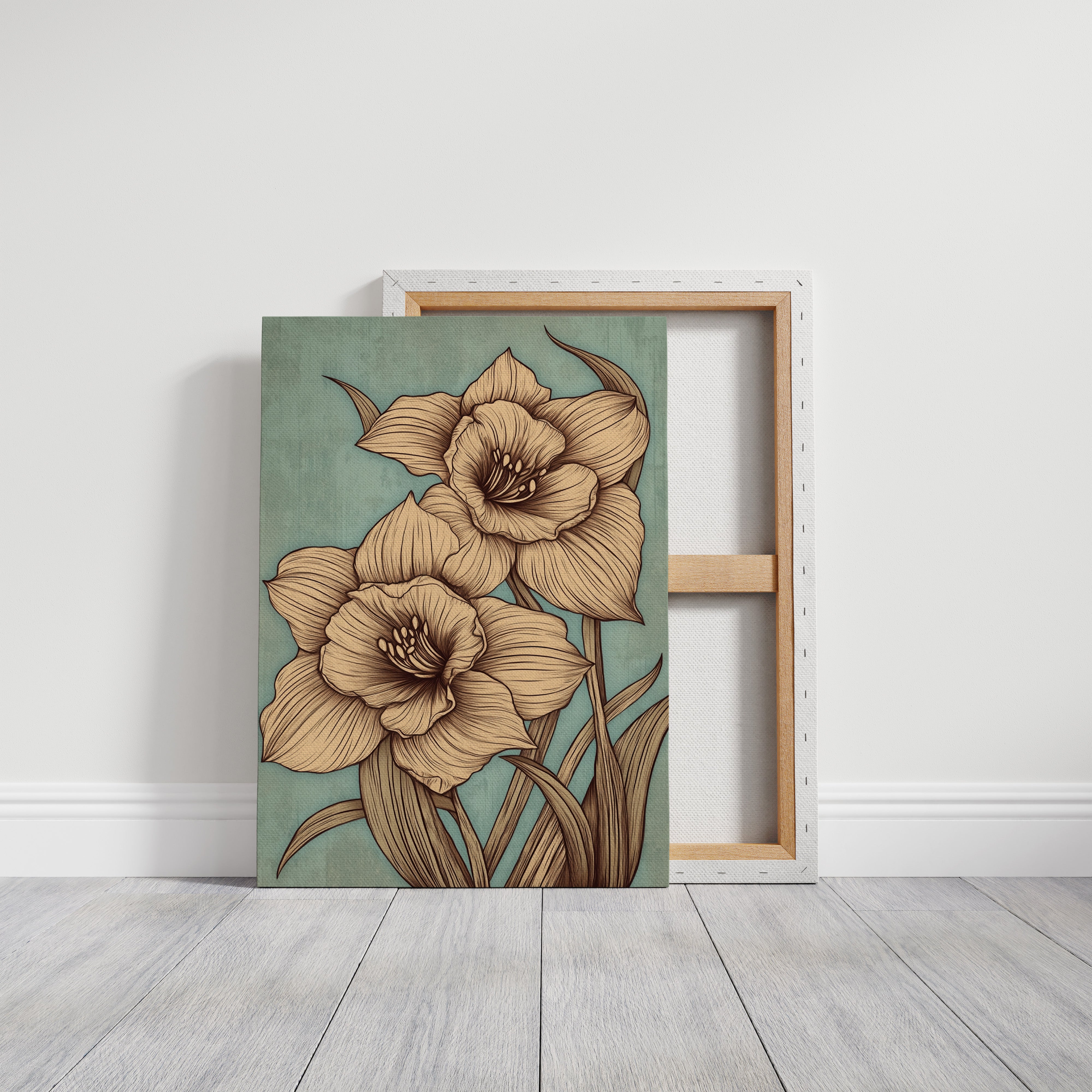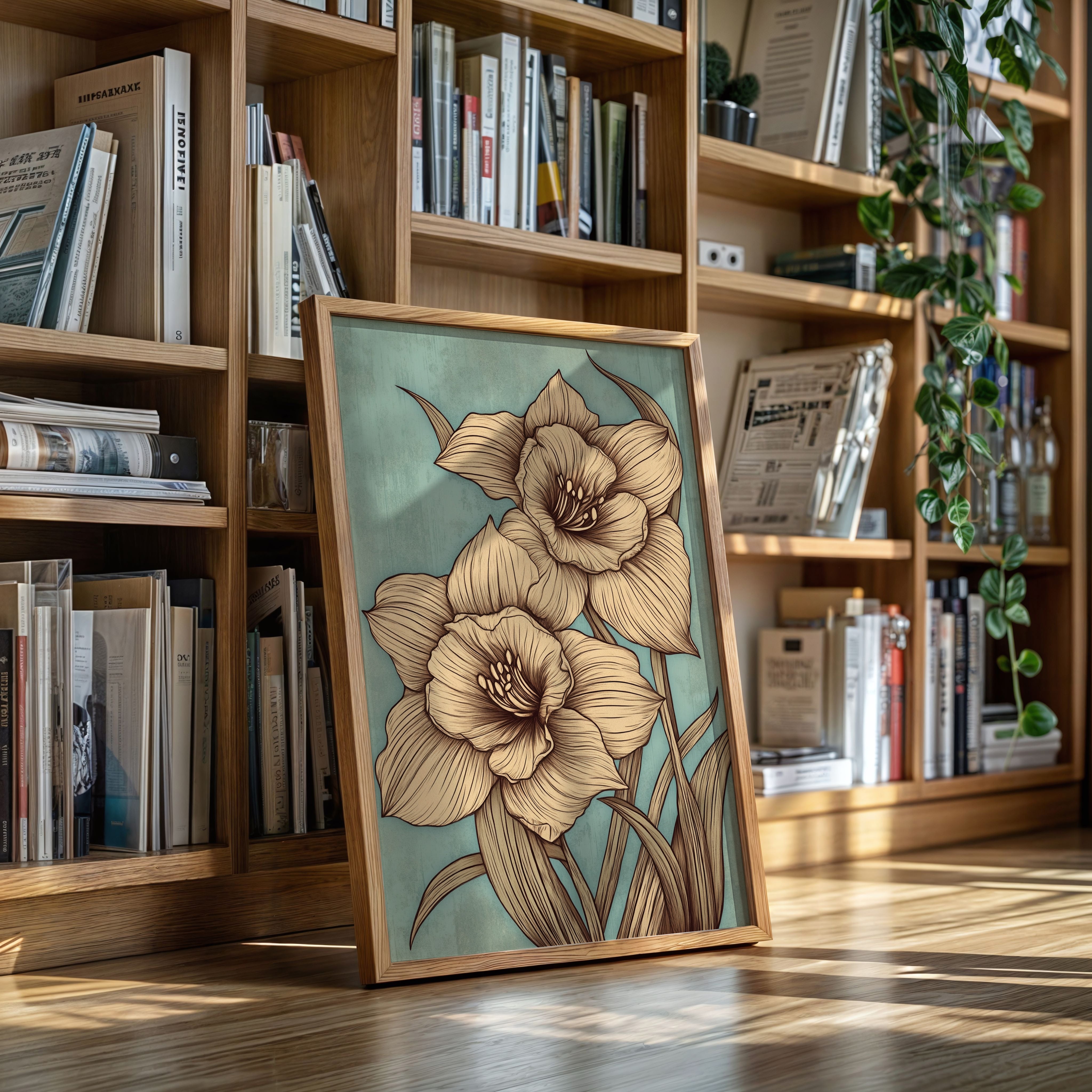 Delicate petals unfold against a misty sage backdrop, each line etched with the precision of nature's own artistry. The golden-hued daffodils command attention with their intricate details, their stems reaching skyward in an elegant dance of form and movement. Every curve and fold is captured in sophisticated sepia tones, creating a harmonious balance between botanical accuracy and artistic expression. This contemporary interpretation brings fresh perspective to a timeless spring symbol, perfect for spaces seeking both sophistication and natural beauty.
