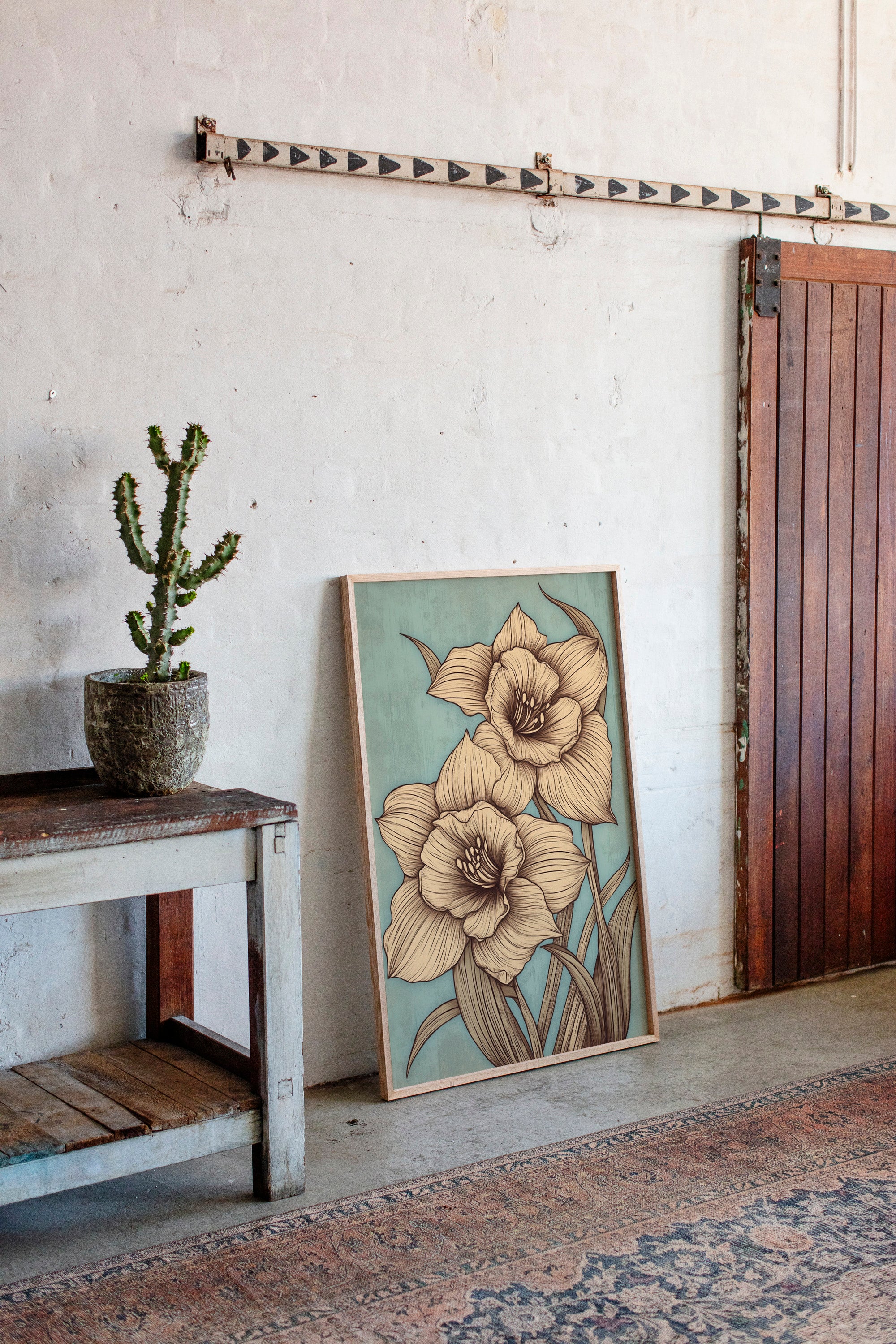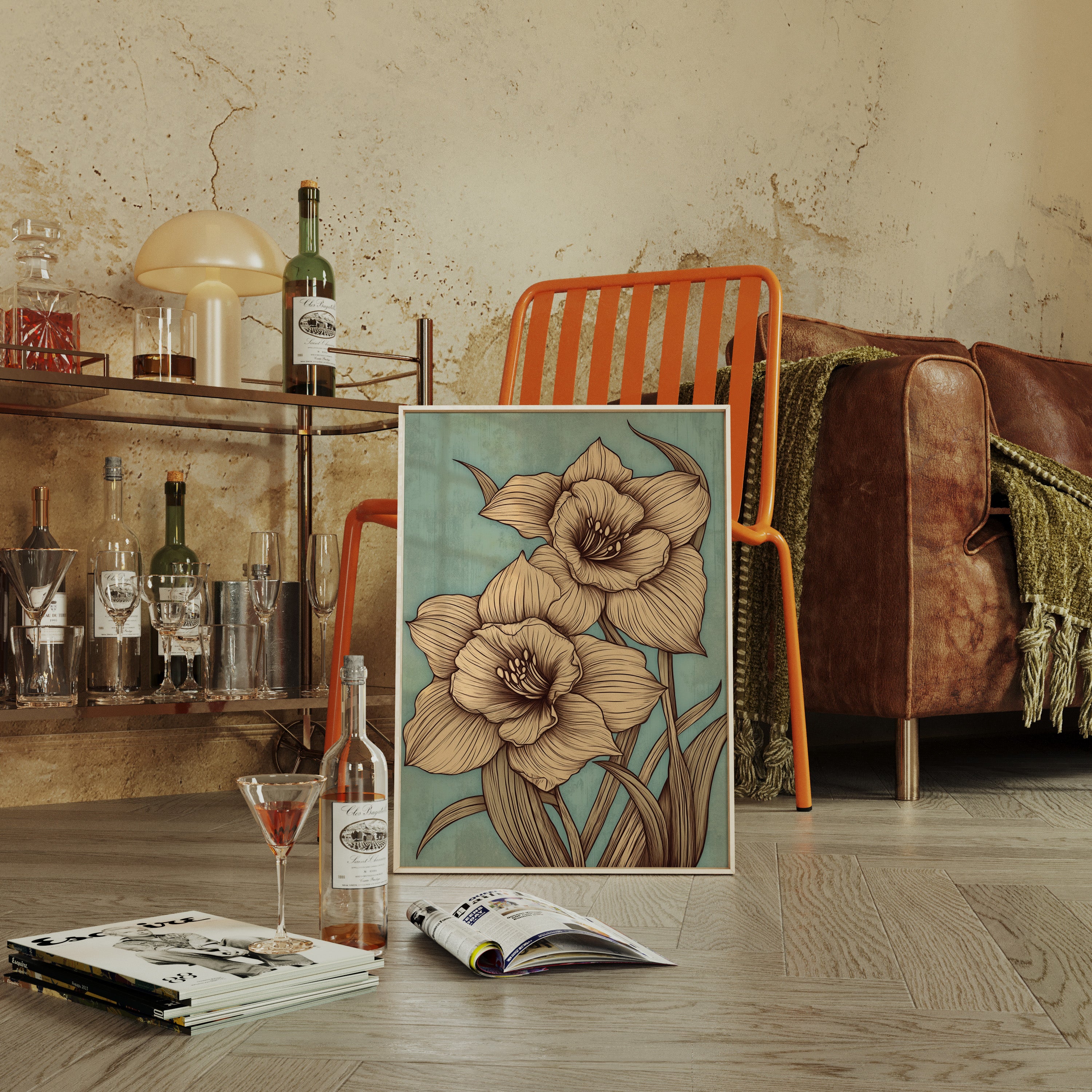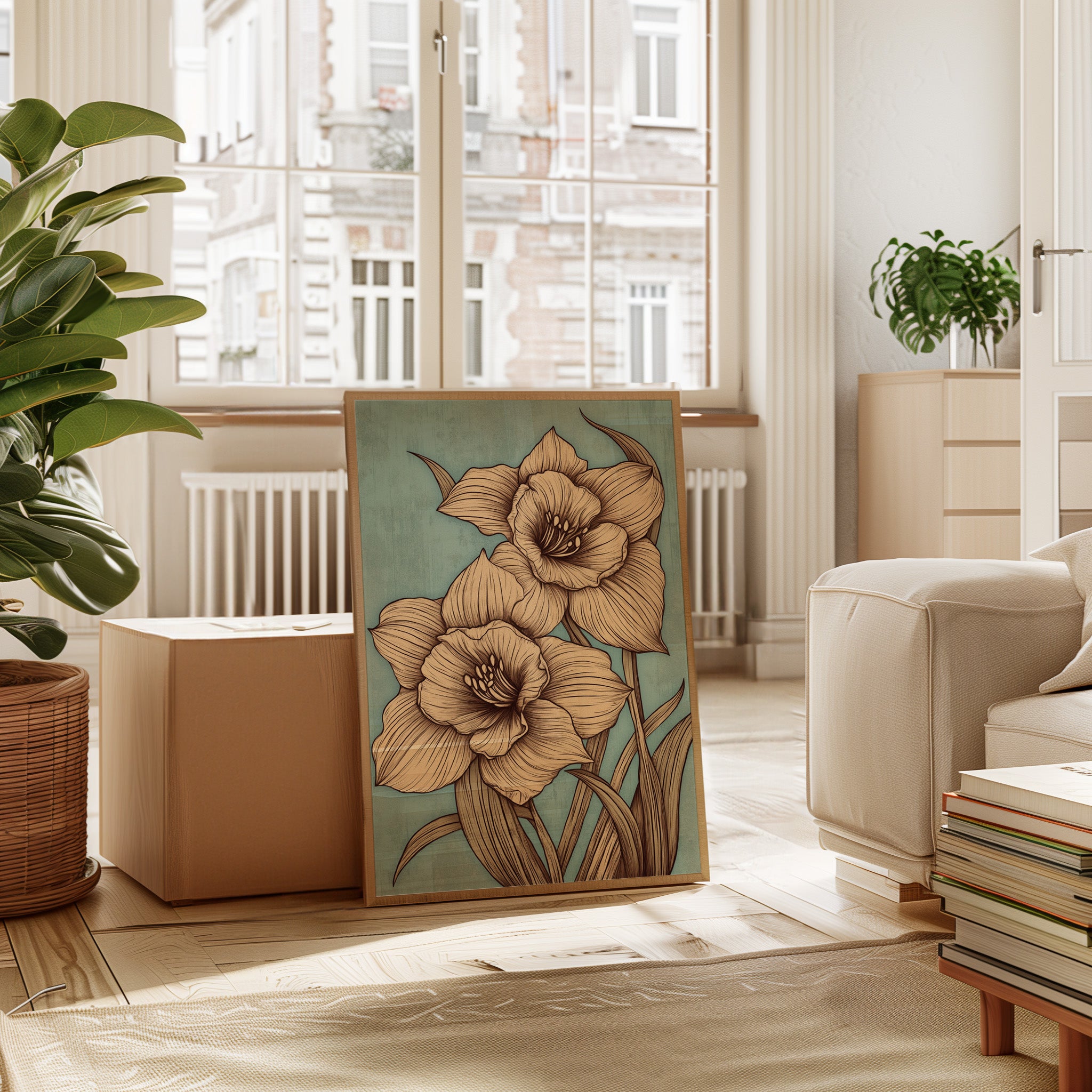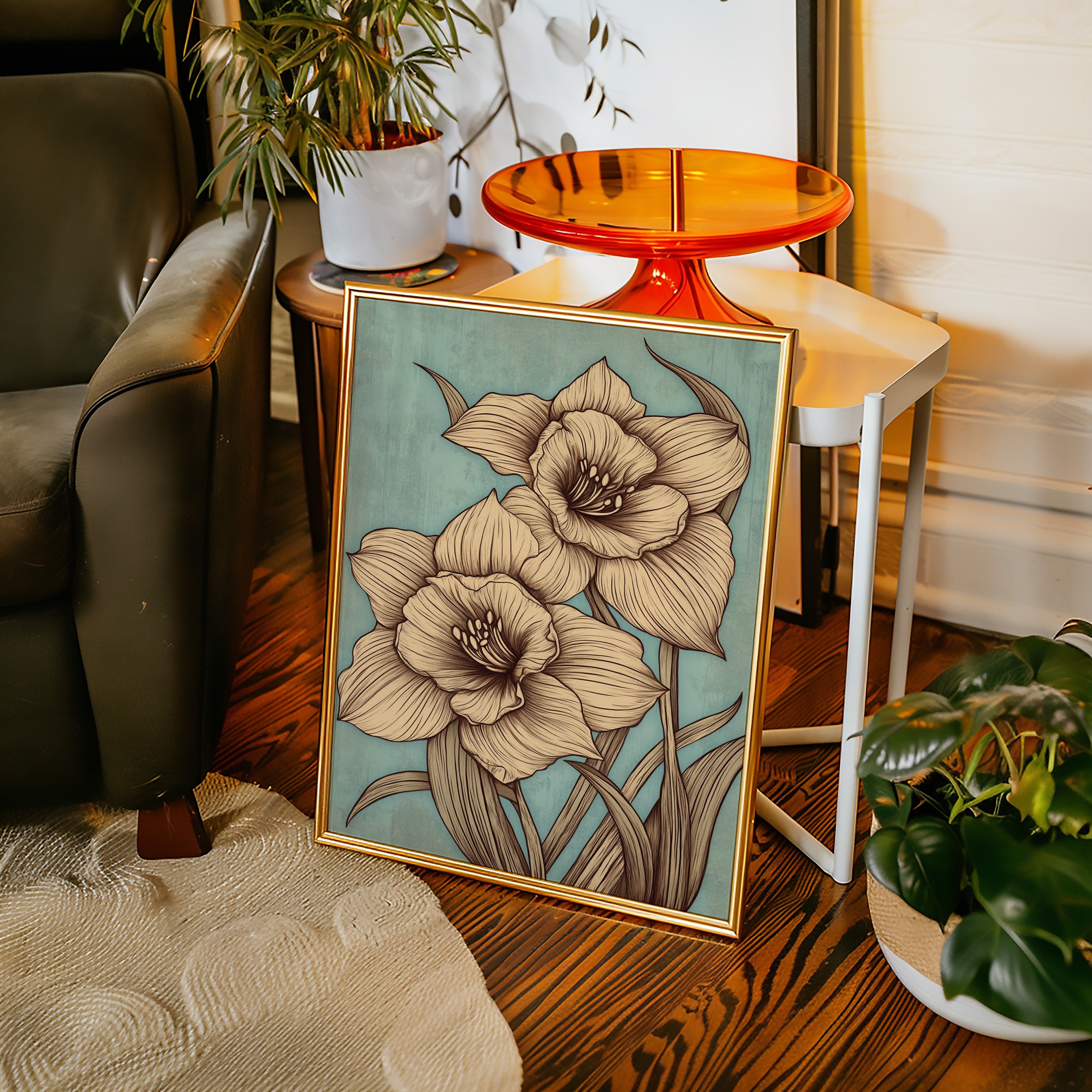 Delicate petals unfold against a misty sage backdrop, each line etched with the precision of nature's own artistry. The golden-hued daffodils command attention with their intricate details, their stems reaching skyward in an elegant dance of form and movement. Every curve and fold is captured in sophisticated sepia tones, creating a harmonious balance between botanical accuracy and artistic expression. This contemporary interpretation brings fresh perspective to a timeless spring symbol, perfect for spaces seeking both sophistication and natural beauty.