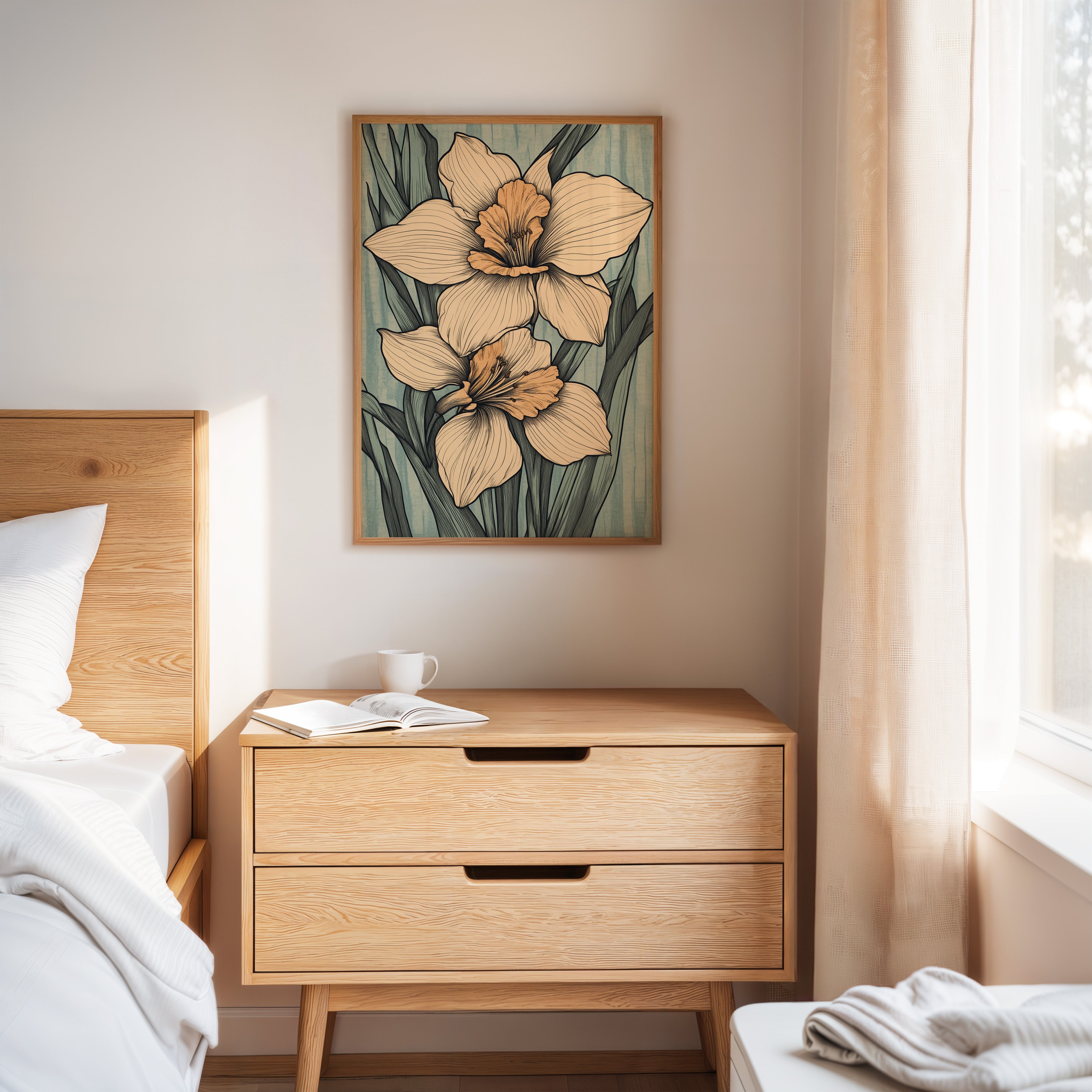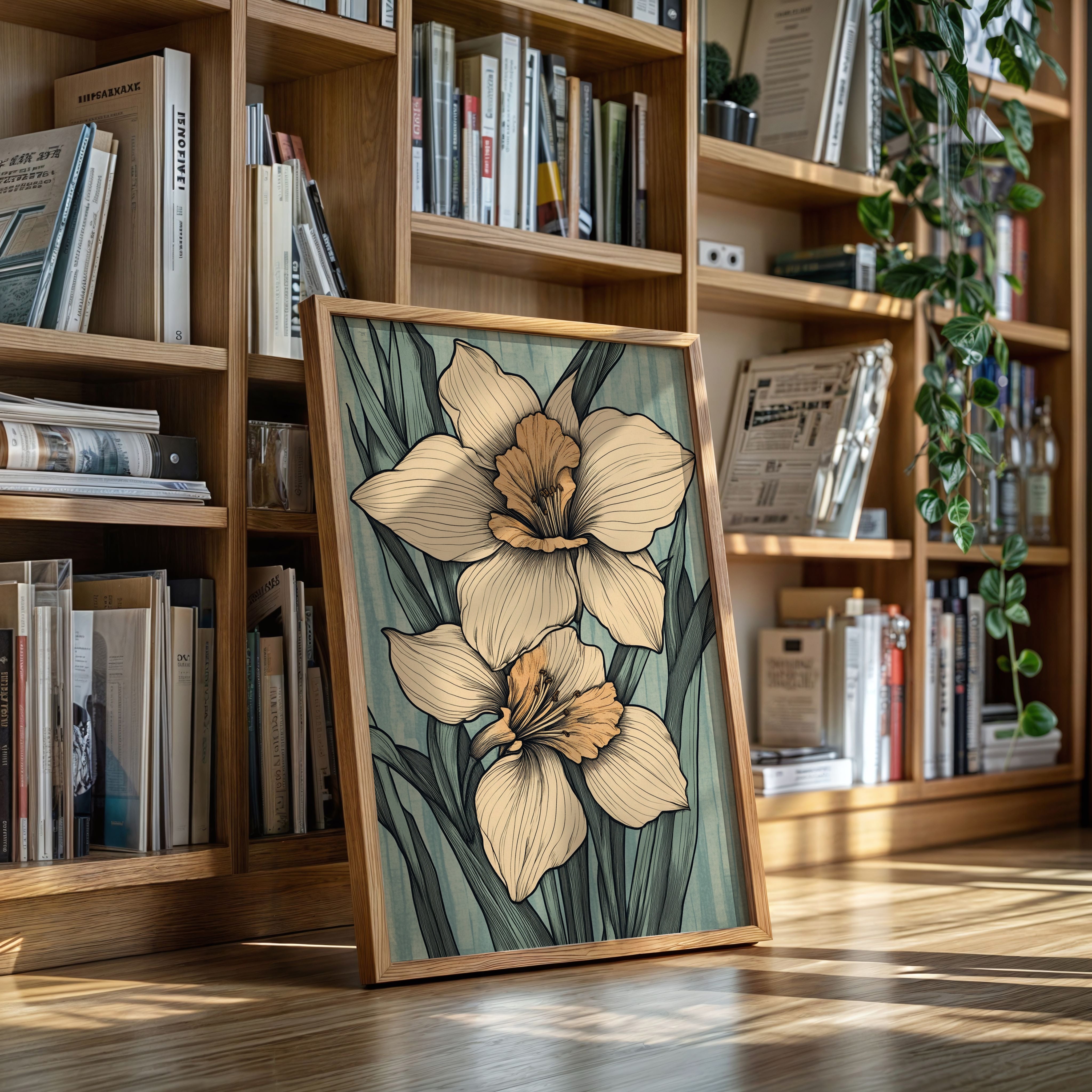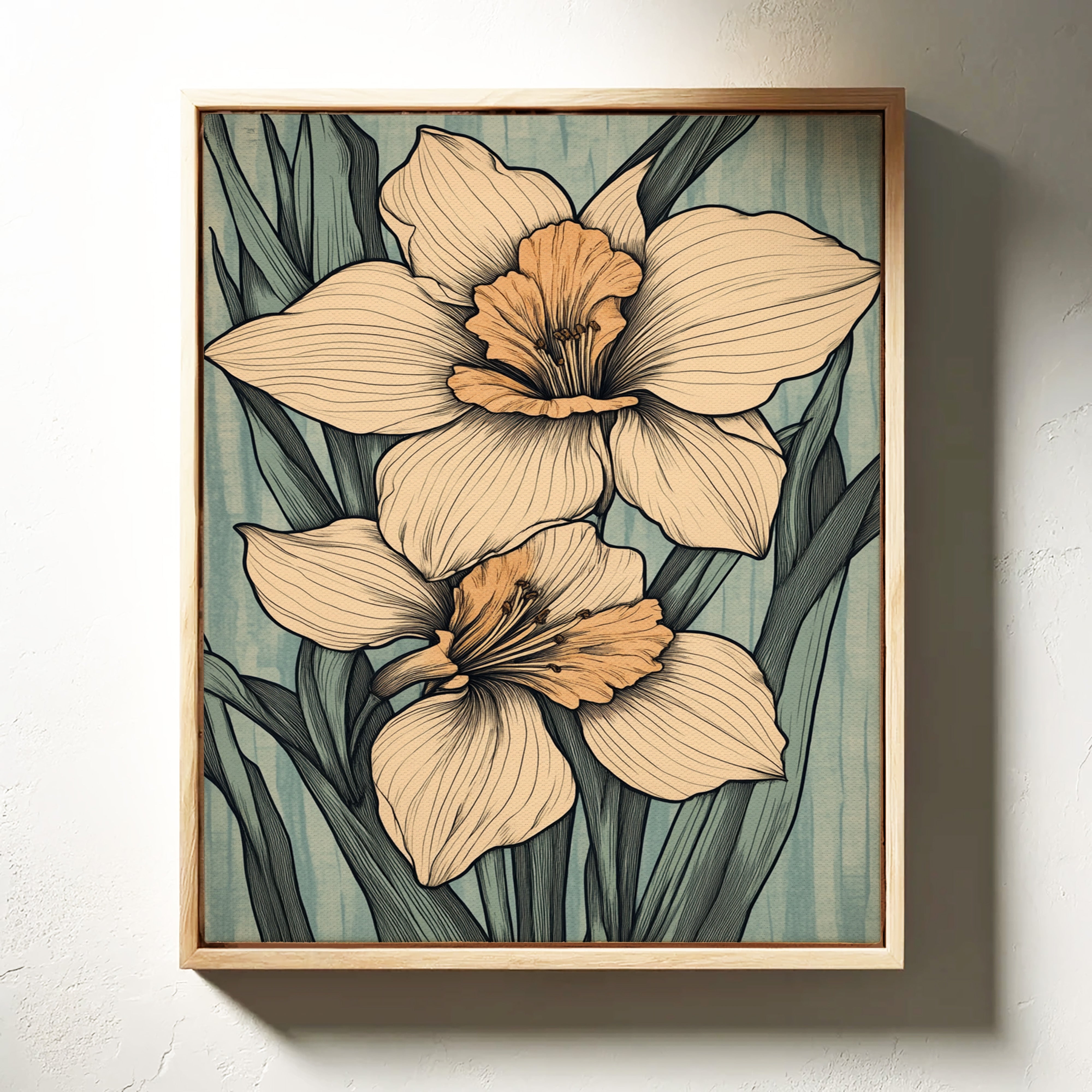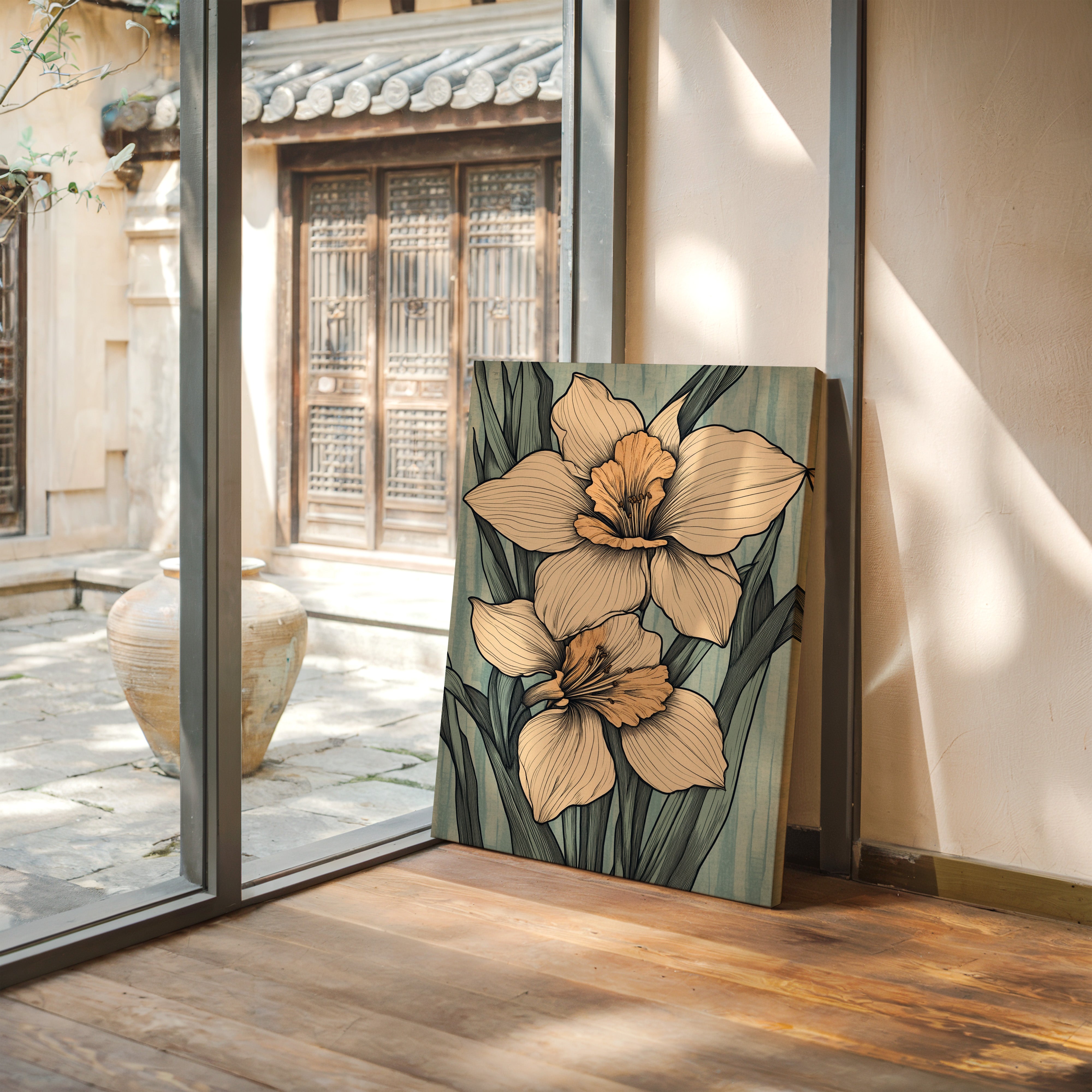 Delicate peach-toned daffodils emerge against a misty sage backdrop, their petals unfurling like pages of an ancient story. Each bloom reveals intricate linear details, with stems and leaves creating a dramatic vertical rhythm that guides the eye through the composition. The Japanese woodblock-inspired illustration style brings a contemporary edge to this classical subject, balancing bold graphic lines with subtle tonal variations. This piece would bring sophisticated botanical charm to a reading nook or creative workspace, where its serene palette and thoughtful composition can inspire quiet contemplation.