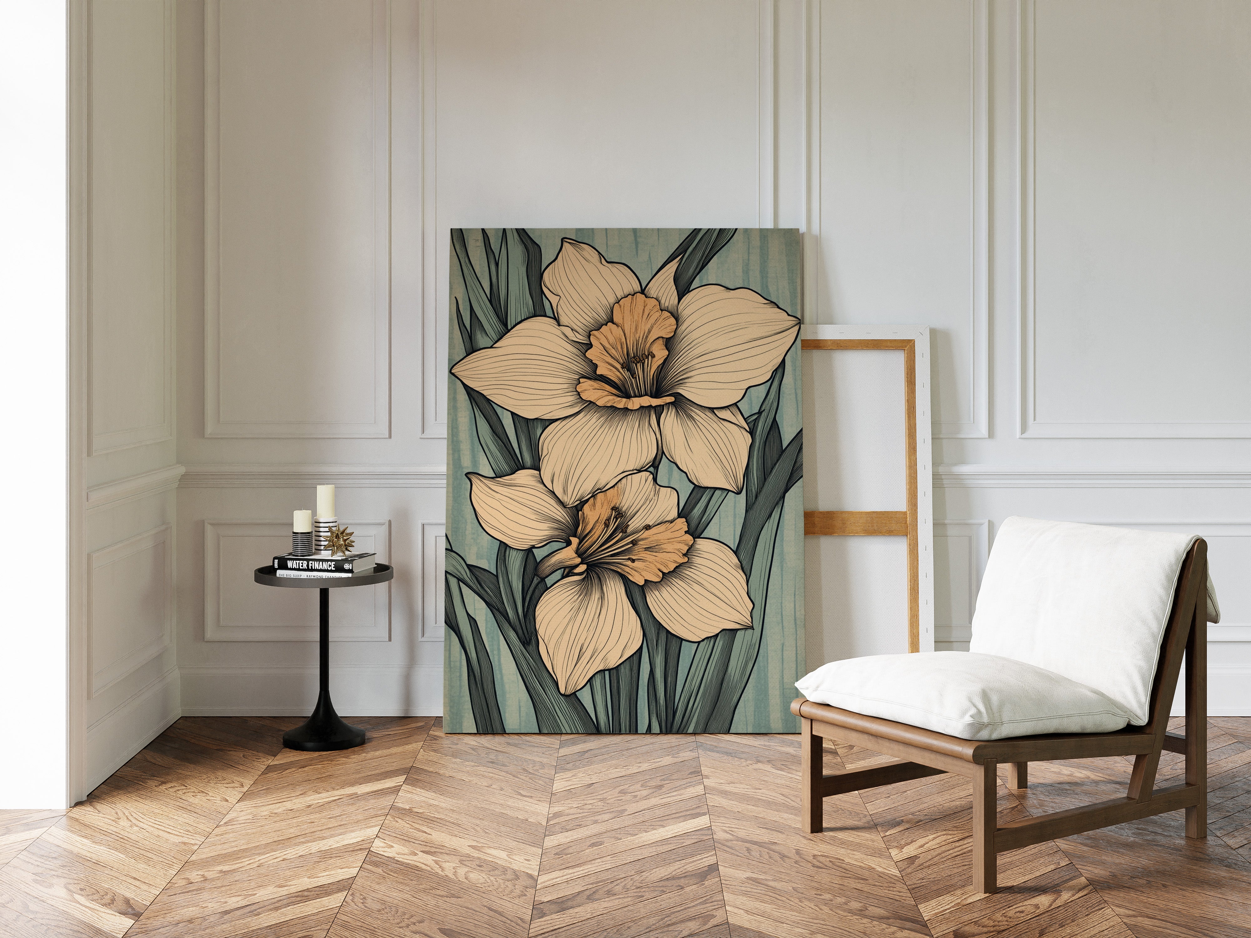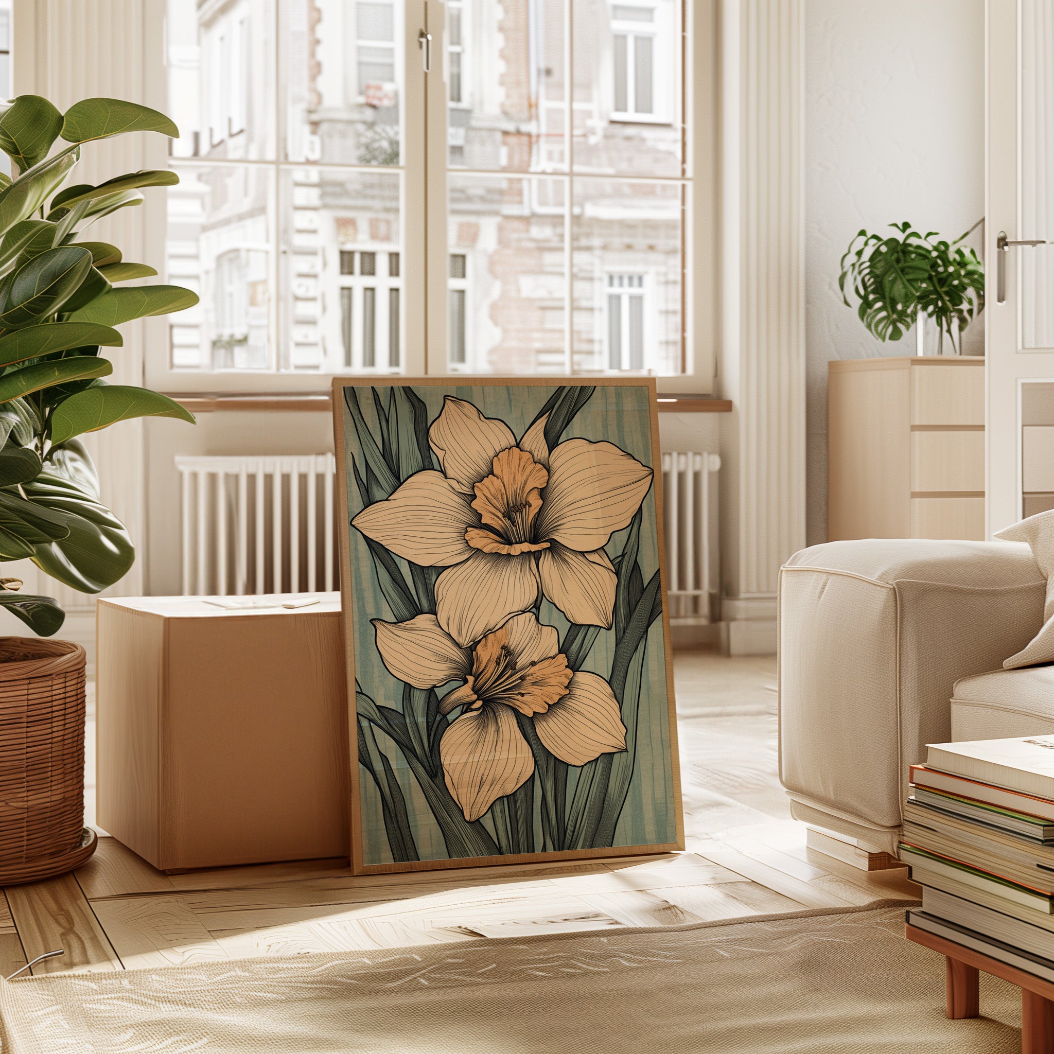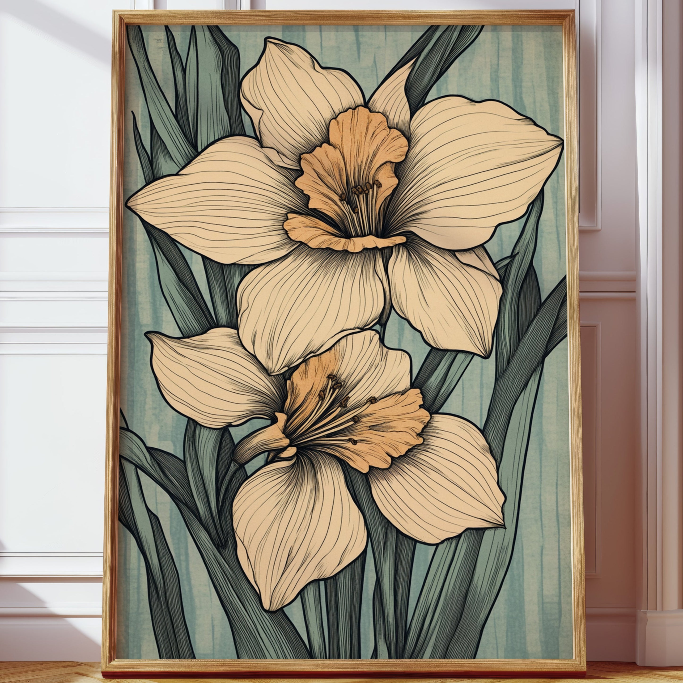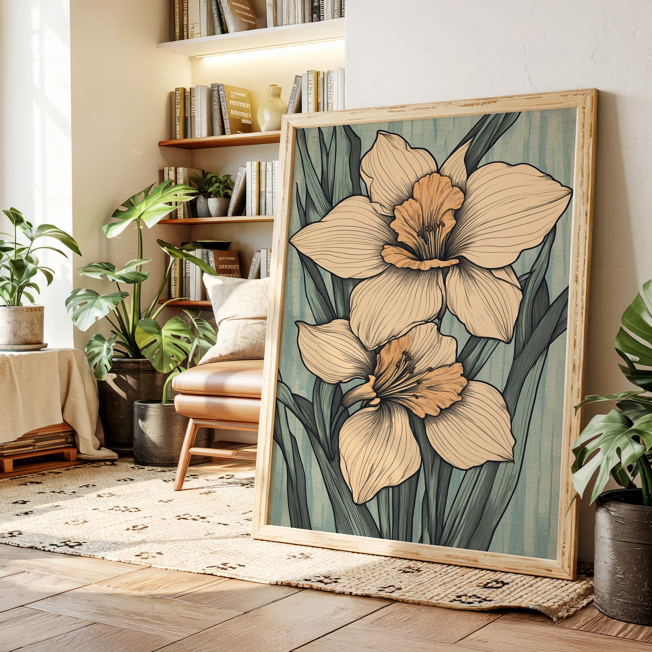 Delicate peach-toned daffodils emerge against a misty sage backdrop, their petals unfurling like pages of an ancient story. Each bloom reveals intricate linear details, with stems and leaves creating a dramatic vertical rhythm that guides the eye through the composition. The Japanese woodblock-inspired illustration style brings a contemporary edge to this classical subject, balancing bold graphic lines with subtle tonal variations. This piece would bring sophisticated botanical charm to a reading nook or creative workspace, where its serene palette and thoughtful composition can inspire quiet contemplation.