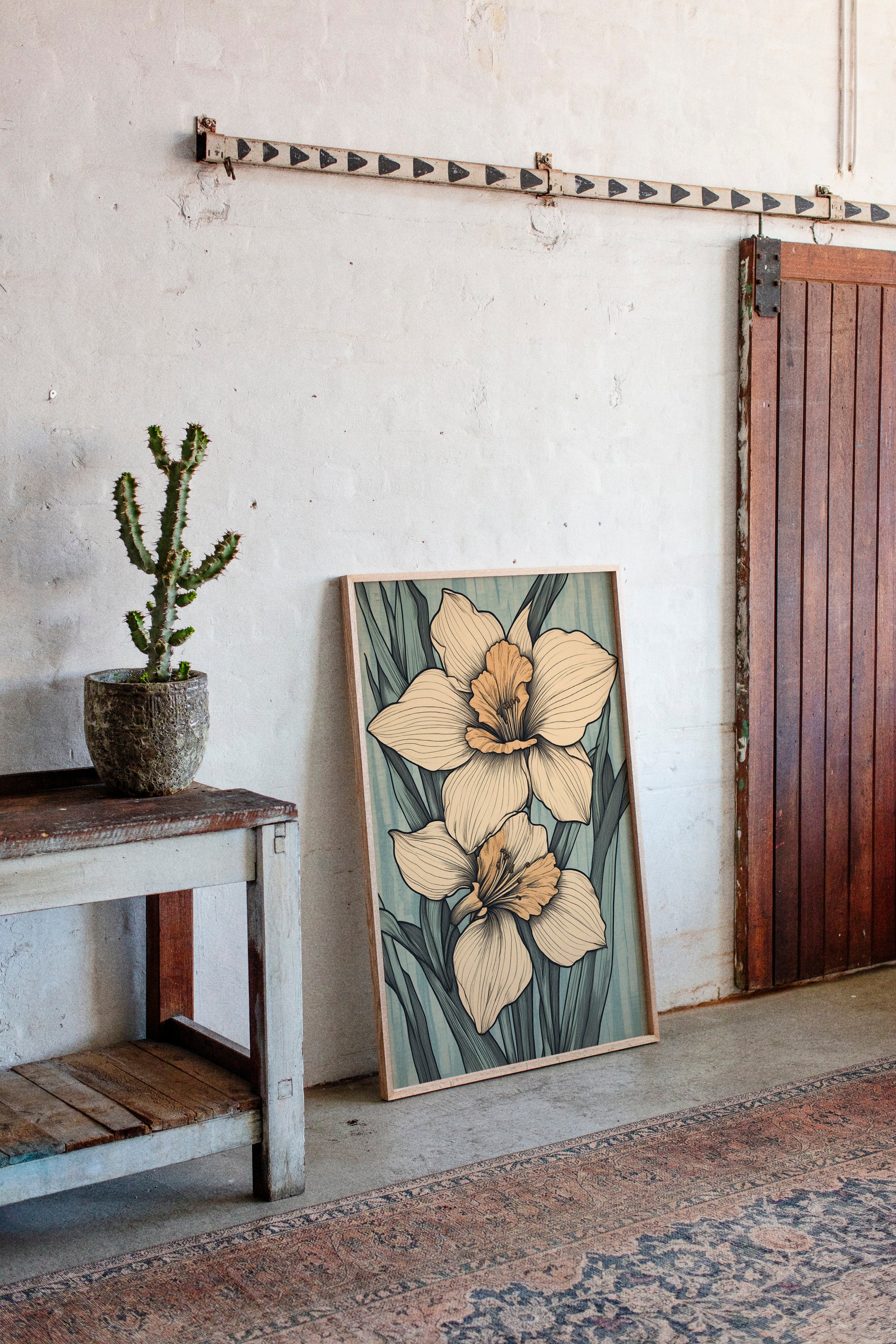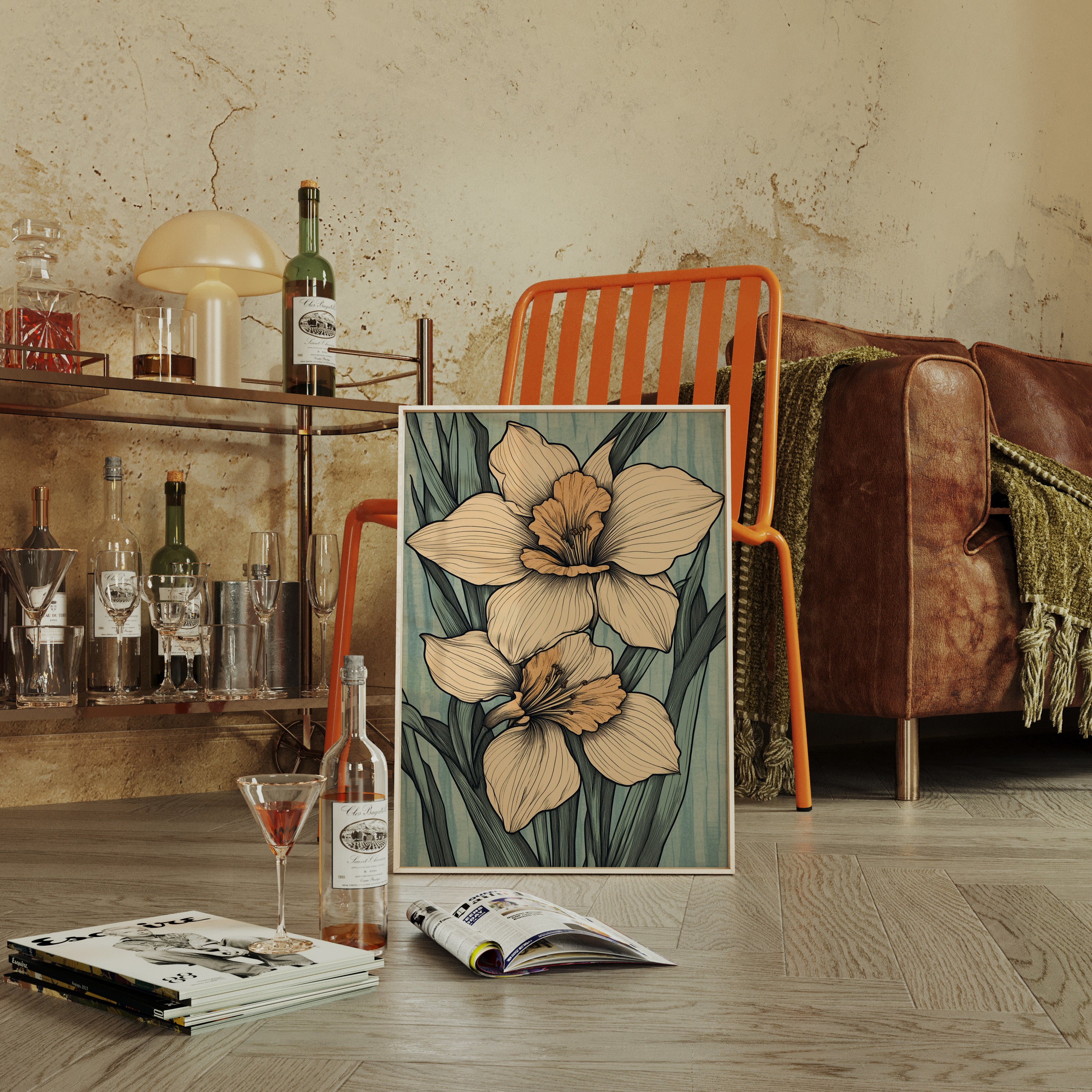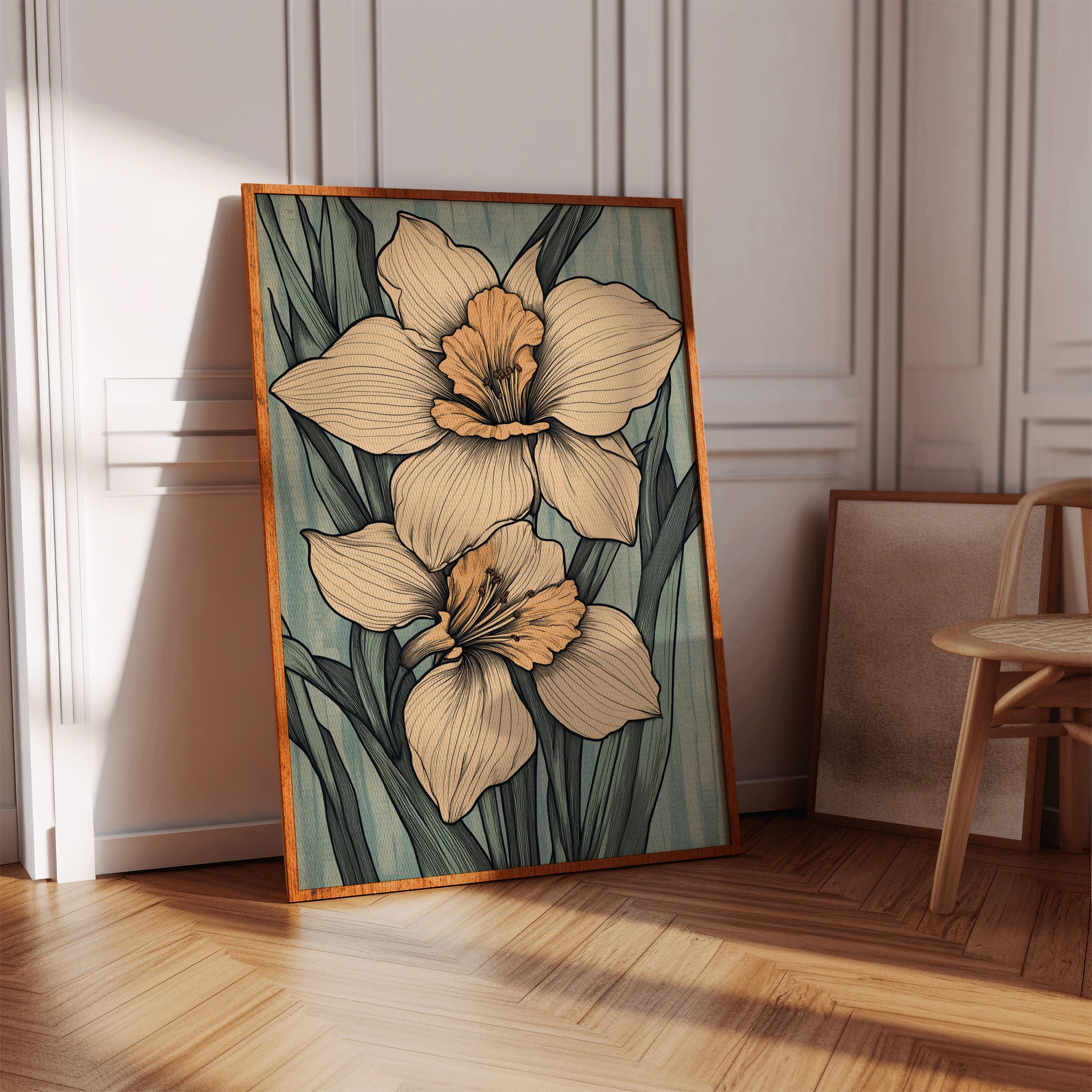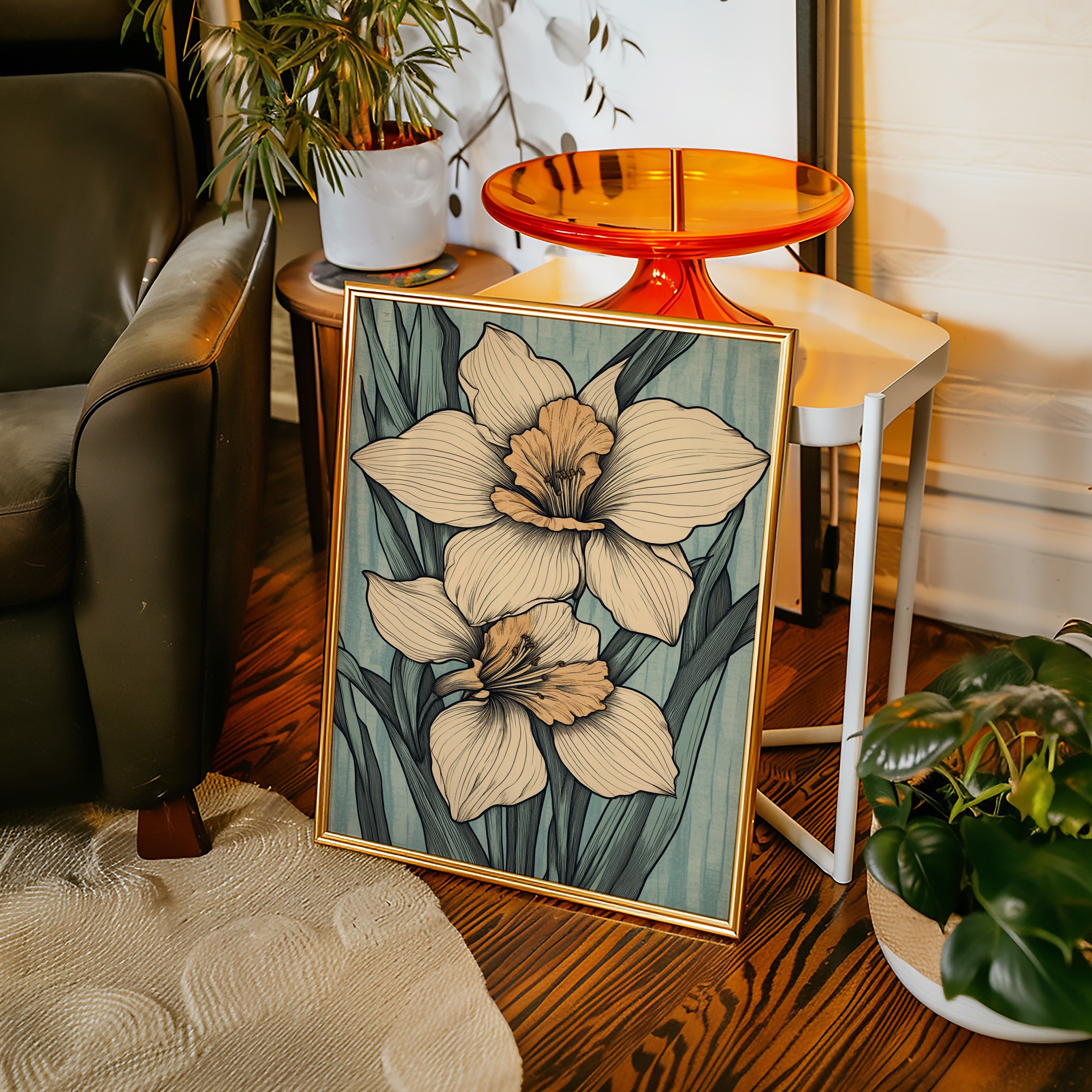 Delicate peach-toned daffodils emerge against a misty sage backdrop, their petals unfurling like pages of an ancient story. Each bloom reveals intricate linear details, with stems and leaves creating a dramatic vertical rhythm that guides the eye through the composition. The Japanese woodblock-inspired illustration style brings a contemporary edge to this classical subject, balancing bold graphic lines with subtle tonal variations. This piece would bring sophisticated botanical charm to a reading nook or creative workspace, where its serene palette and thoughtful composition can inspire quiet contemplation.