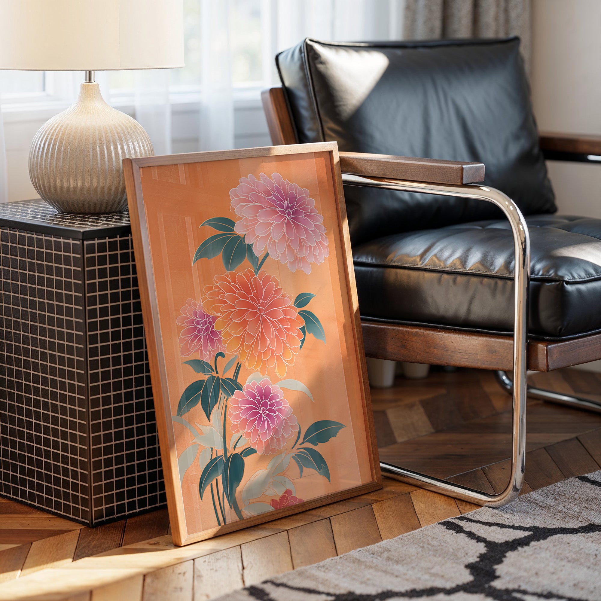 Delicate petals unfold against a warm coral backdrop, creating a moment of botanical elegance. The pink dahlias bloom with graceful intensity, their layered forms complemented by deep emerald leaves that add structure and depth to the composition. Natural light plays across the scene, casting gentle shadows that enhance the dimensional quality of these beloved summer flowers. This piece would bring a sophisticated pop of color to a reading nook, home office, or any space where you want to create a mood of creative inspiration.