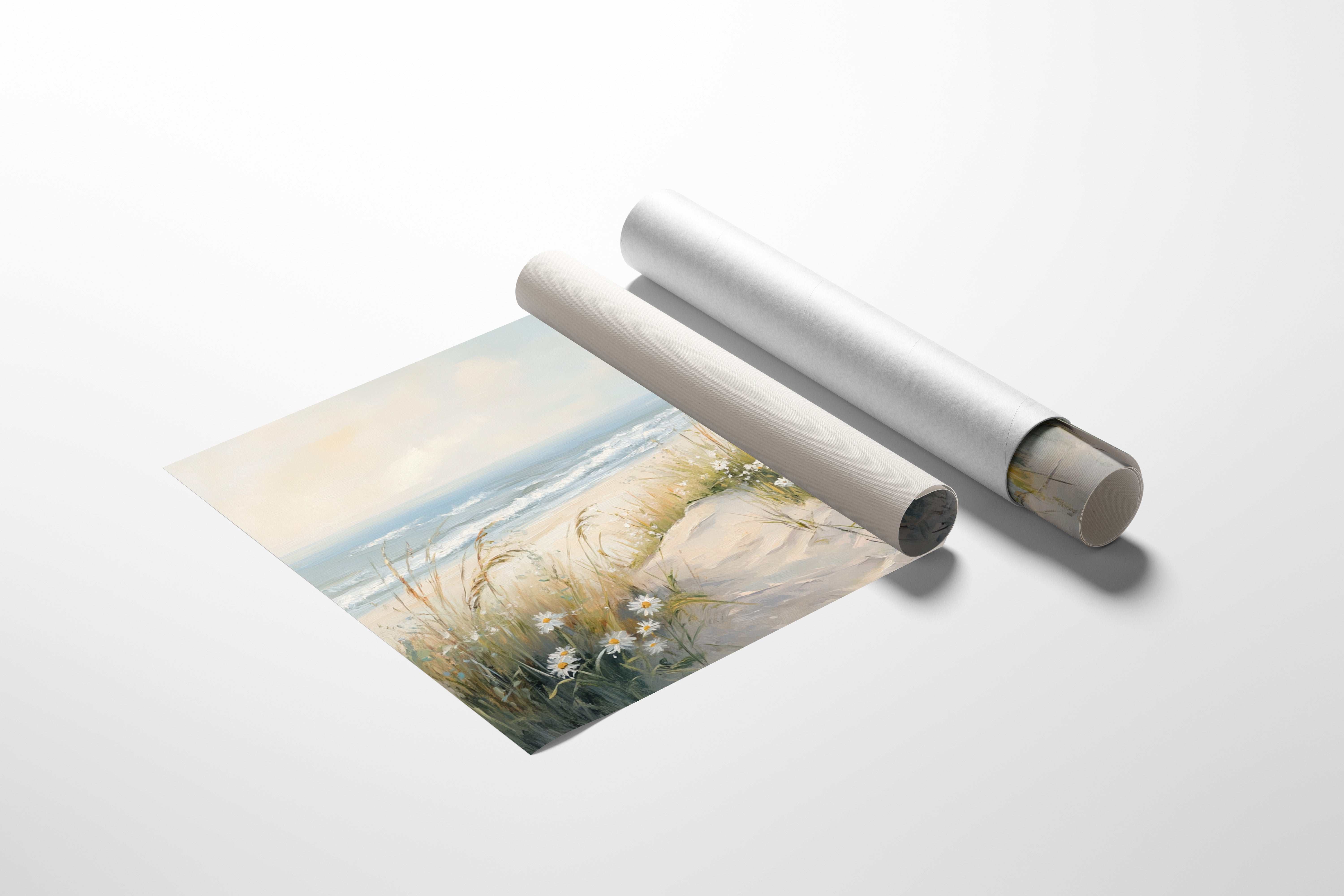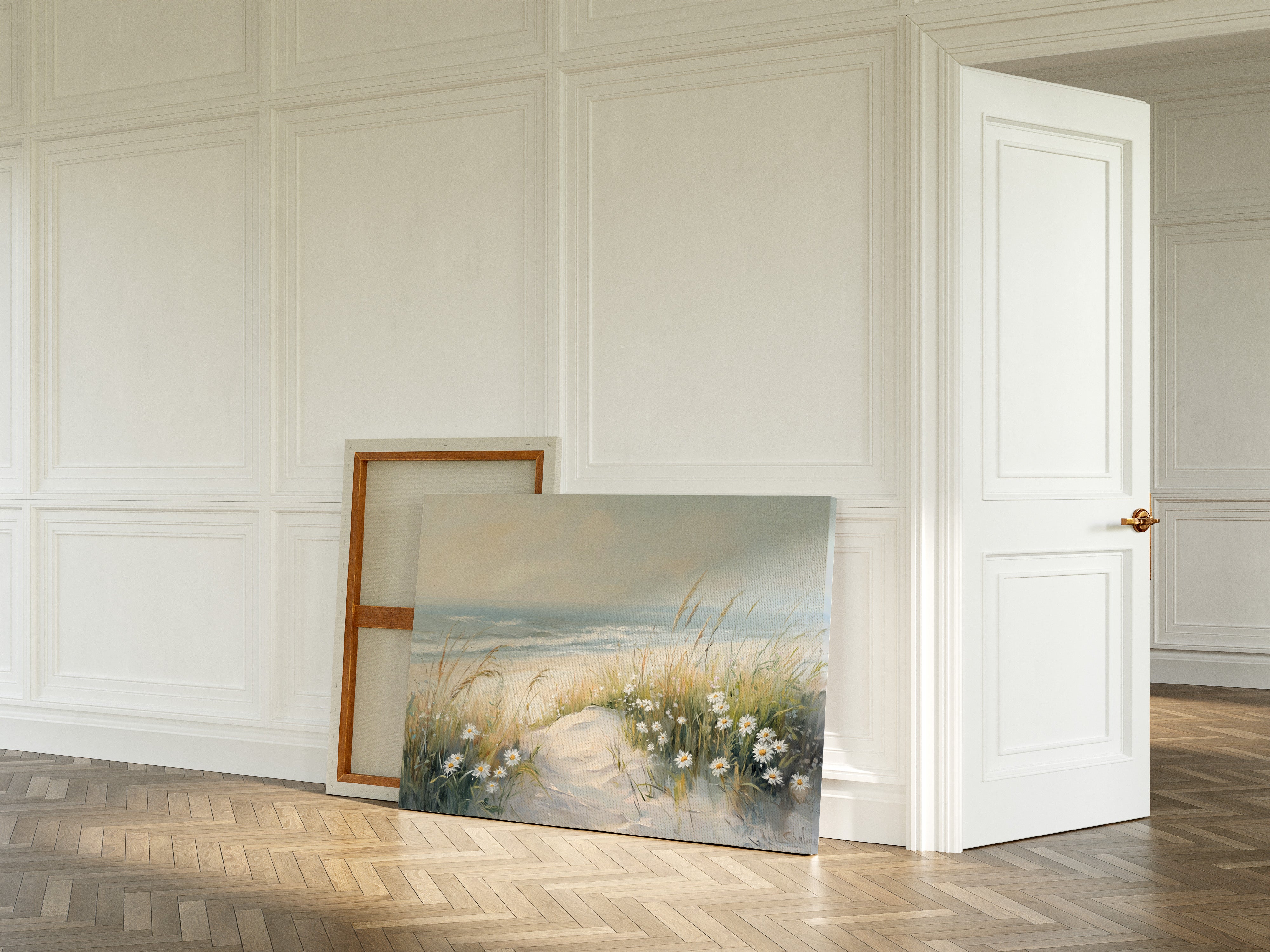 Morning light bathes the coastal scene in gentle warmth, where wild daisies peek through swaying beach grass. The composition captures the delicate balance between untamed nature and serene beauty, as white-capped waves roll against distant shores while dune flowers stand bright against sun-bleached sand. The artist's brushstrokes create a dreamy atmosphere, blending soft blues, creamy whites, and golden wheat tones in perfect harmony. This peaceful coastal vista would bring a sense of calm to a beach house primary bedroom or create a serene focal point in a light-filled living room.