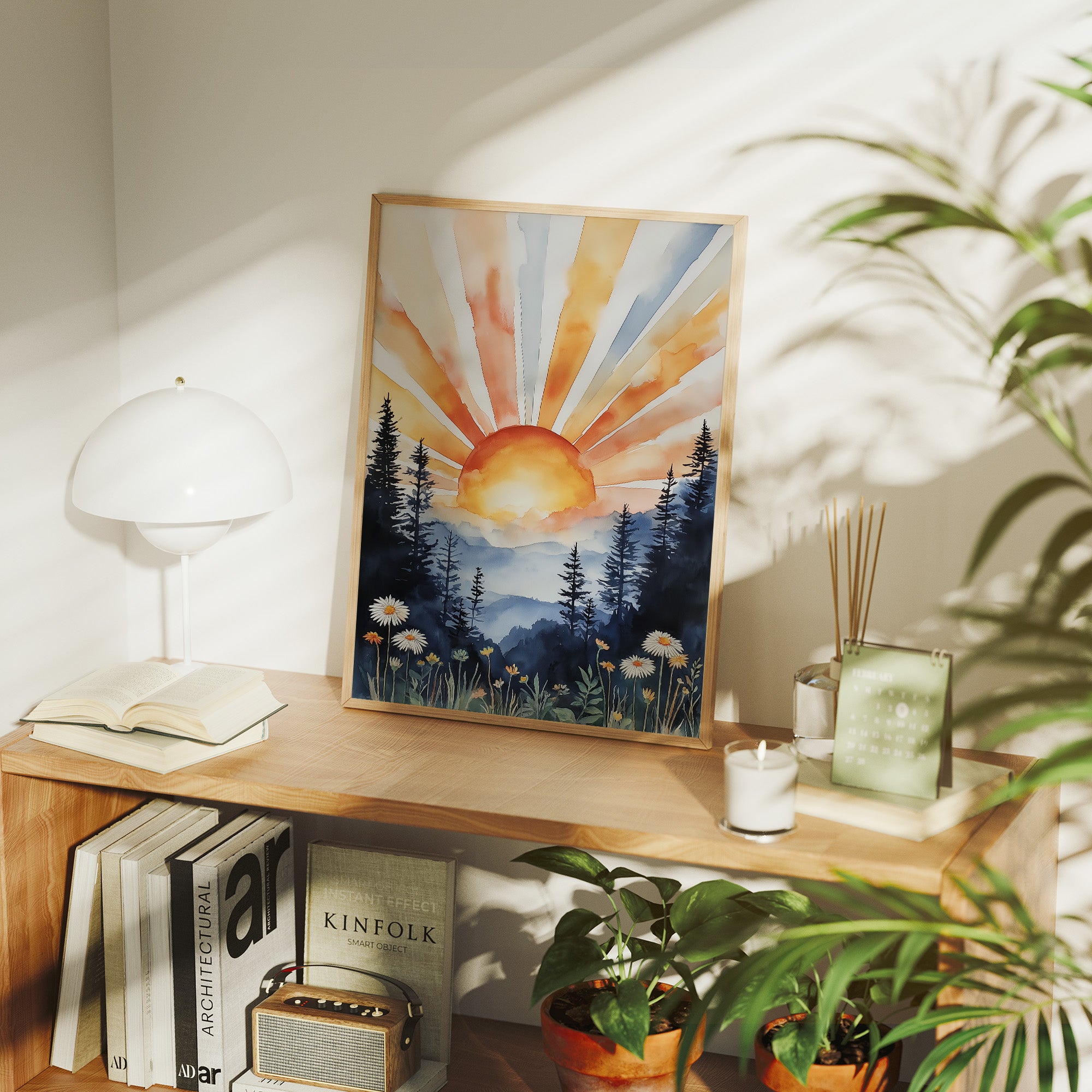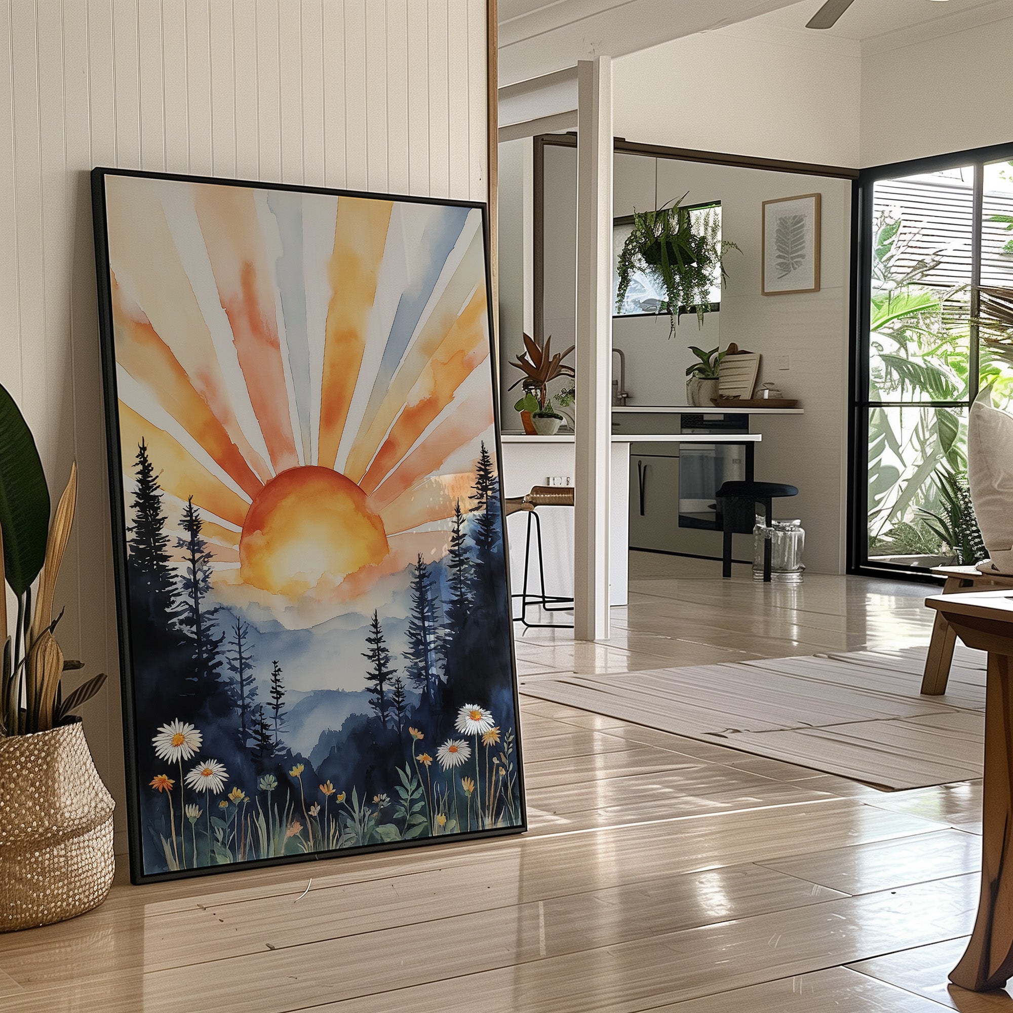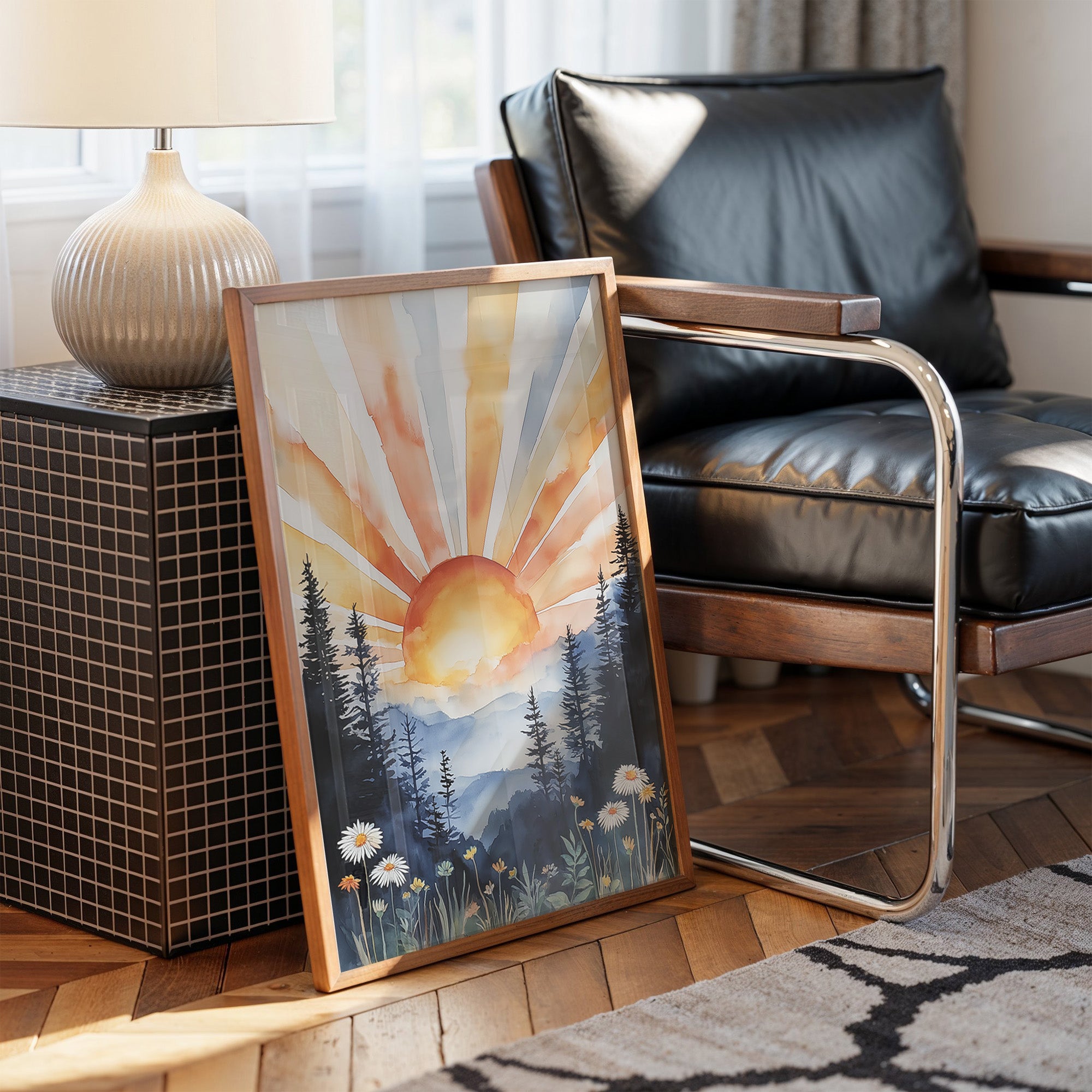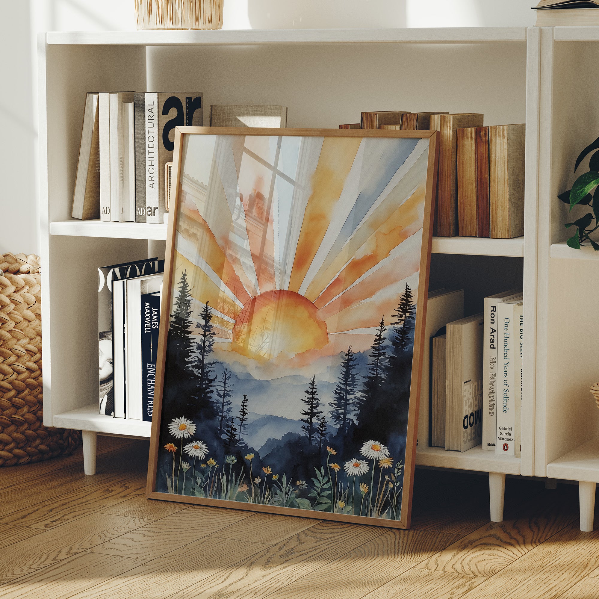 A radiant sunrise bursts through mountain peaks, its golden rays stretching across the morning sky like nature's own crown. Deep indigo forests of evergreens stand sentinel against the warming horizon, while delicate daisies and wildflowers sway in the foreground, their petals catching the day's first light. The watercolor technique creates a dreamy intersection between dawn's gentle awakening and the enduring strength of the mountain landscape. Perfect for bringing natural warmth to a reading nook or creating a focal point in a modern farmhouse bedroom, where its blend of dramatic sunrise and gentle florals can inspire peaceful morning moments.