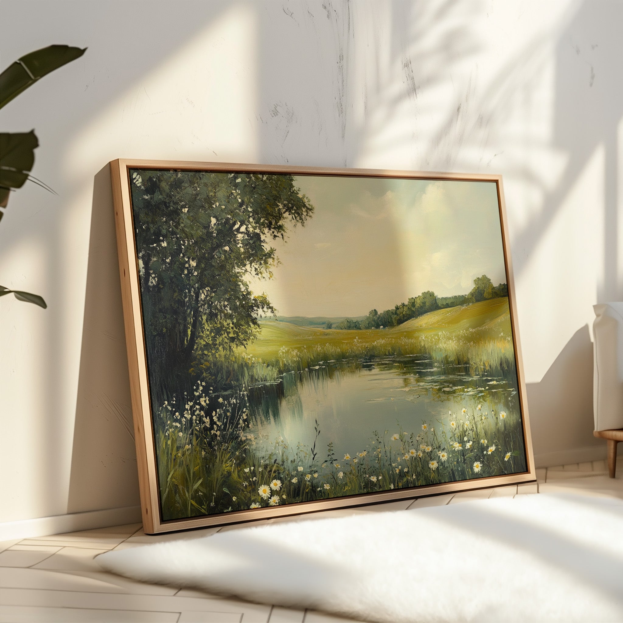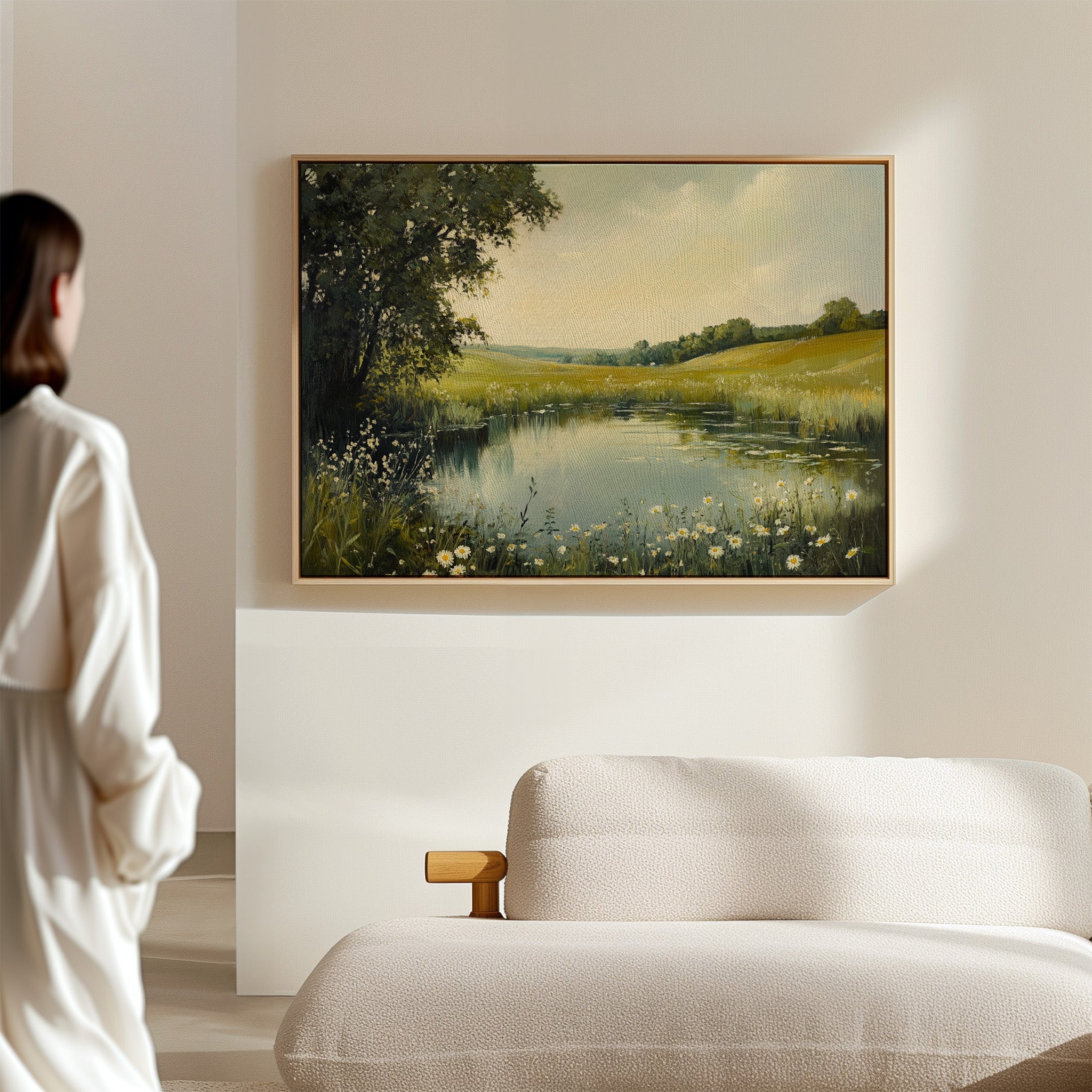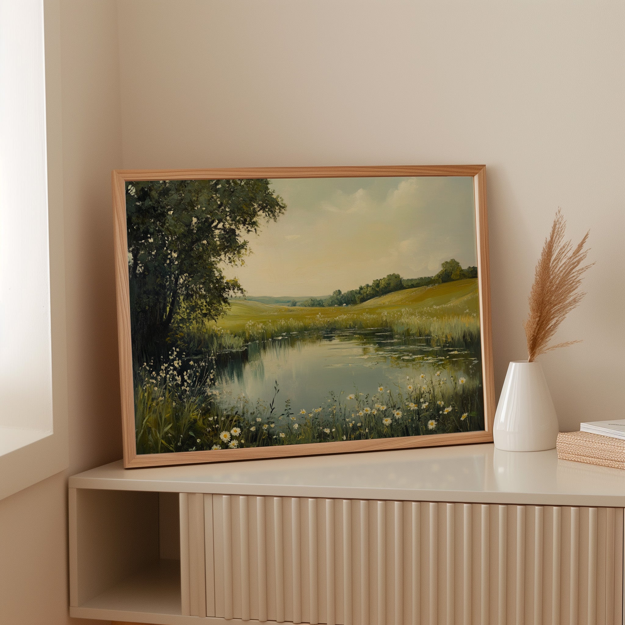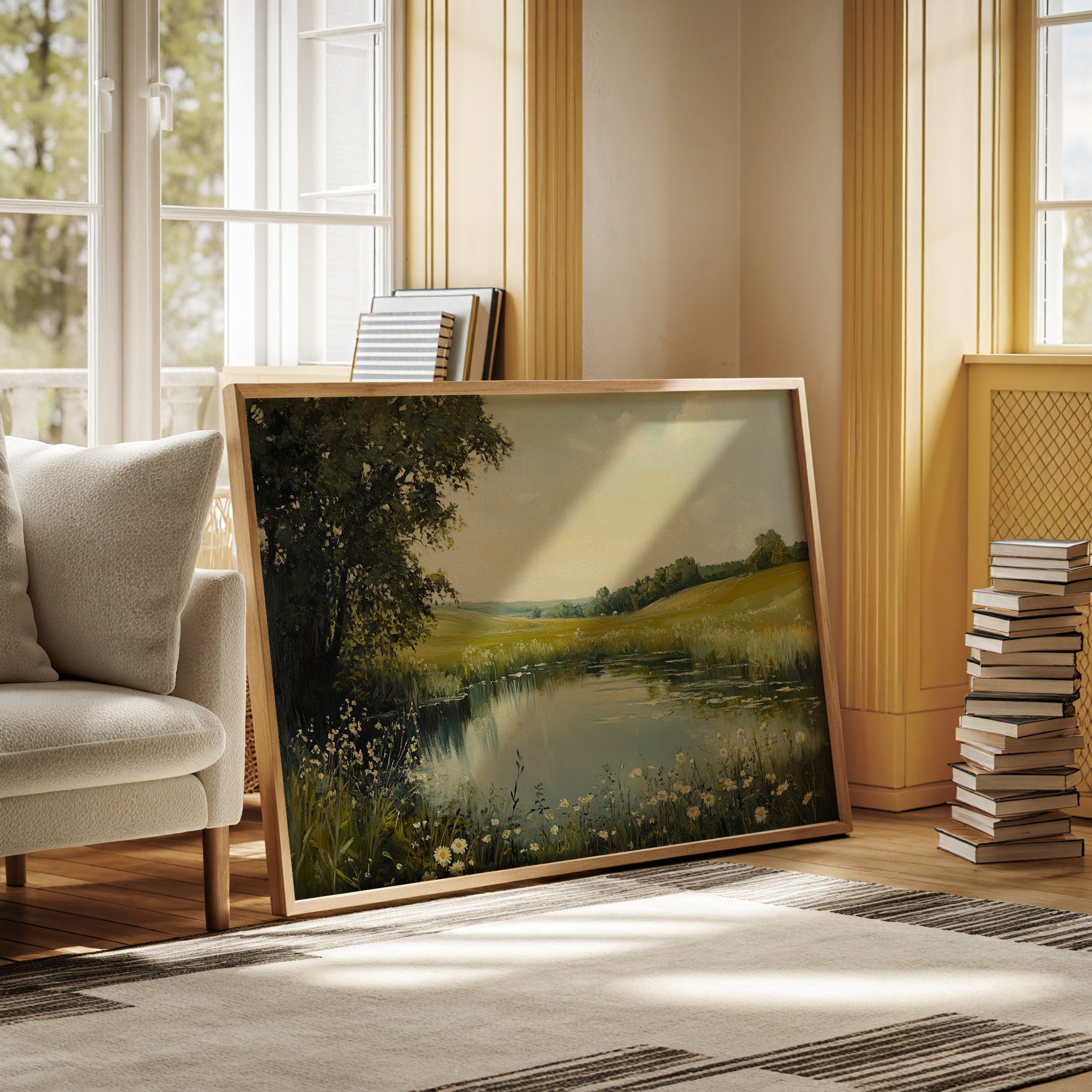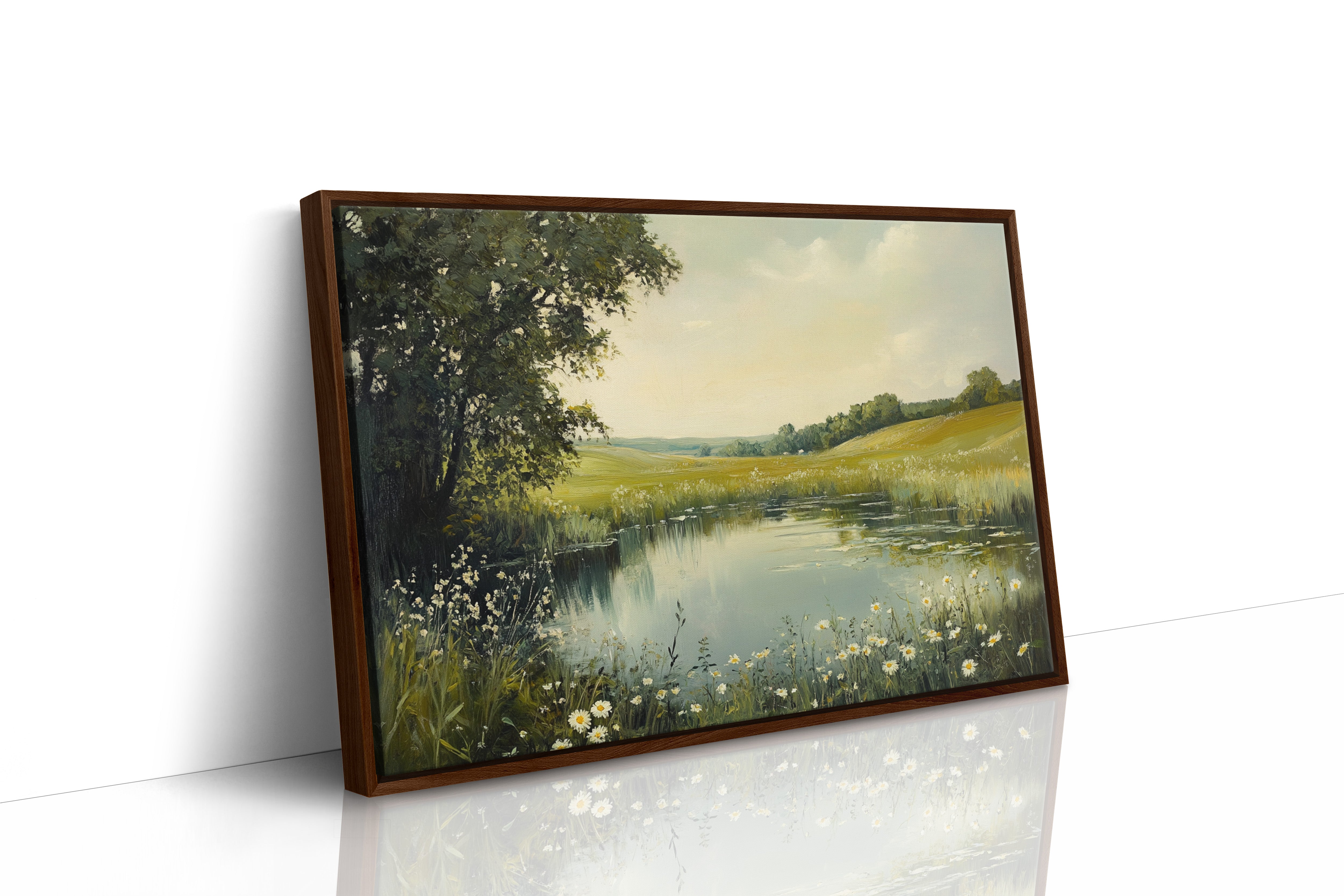Morning light spills across a tranquil pond, where wild daisies nod their heads in the gentle breeze. The water mirrors the soft yellow sky, creating a perfect reflection of serenity. Rolling hills stretch into the distance, their golden grasses blending with clusters of deep green trees, while delicate white petals frame the water's edge like nature's own lace trim. This pastoral scene captures the essence of a perfect summer day, where time seems to stand still. Perfect for bringing a sense of peace and natural beauty to a bedroom or living space where quiet contemplation is valued.