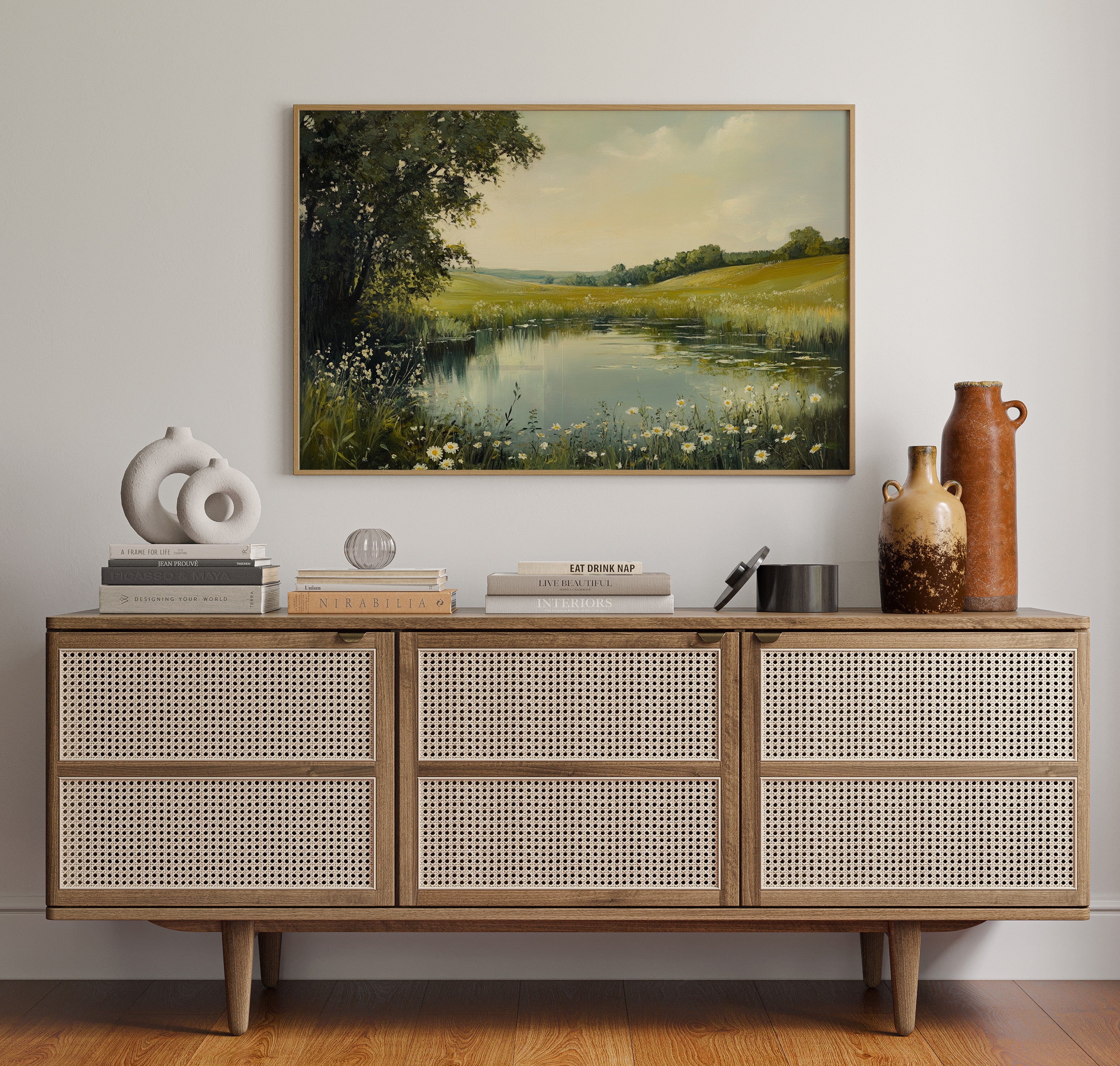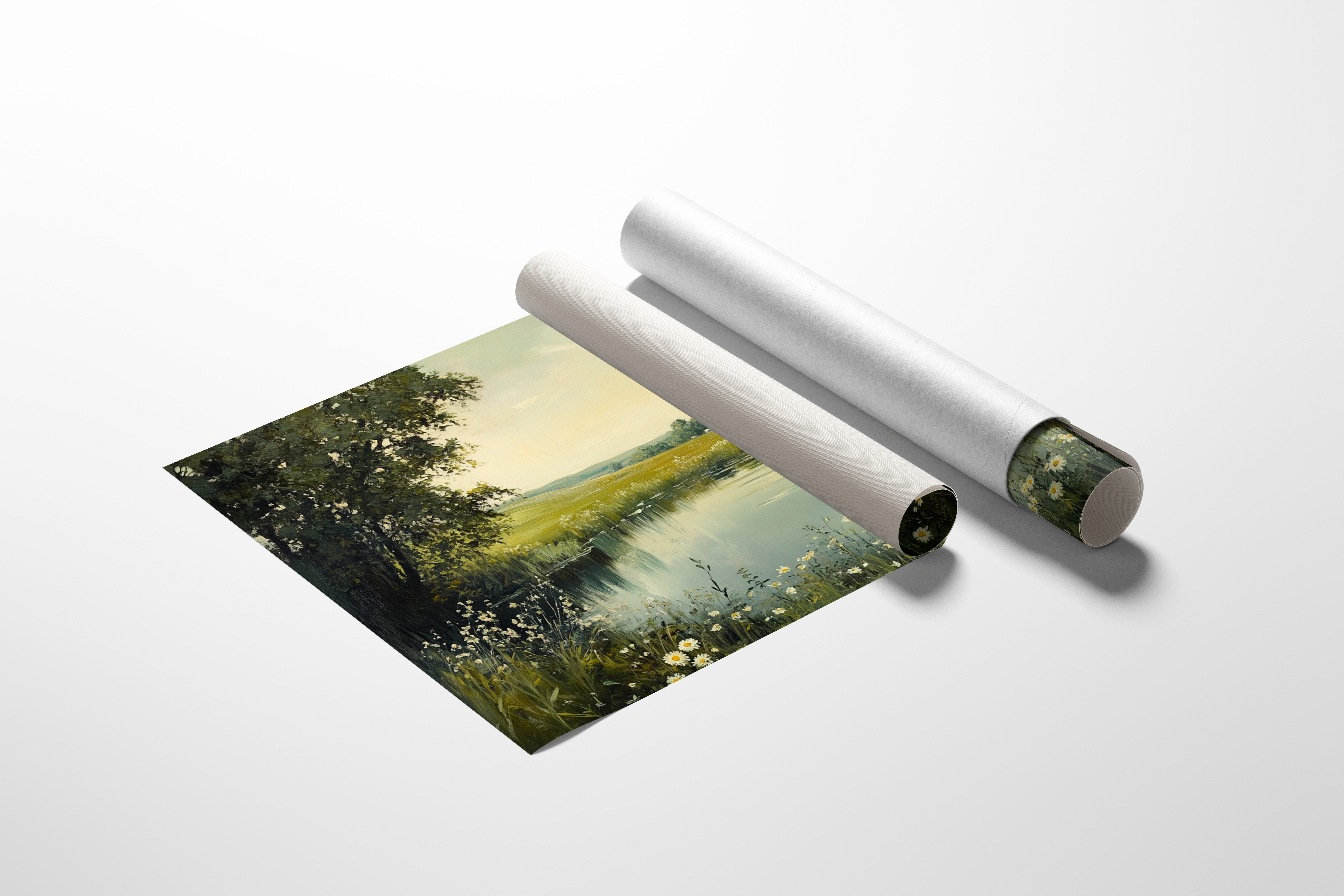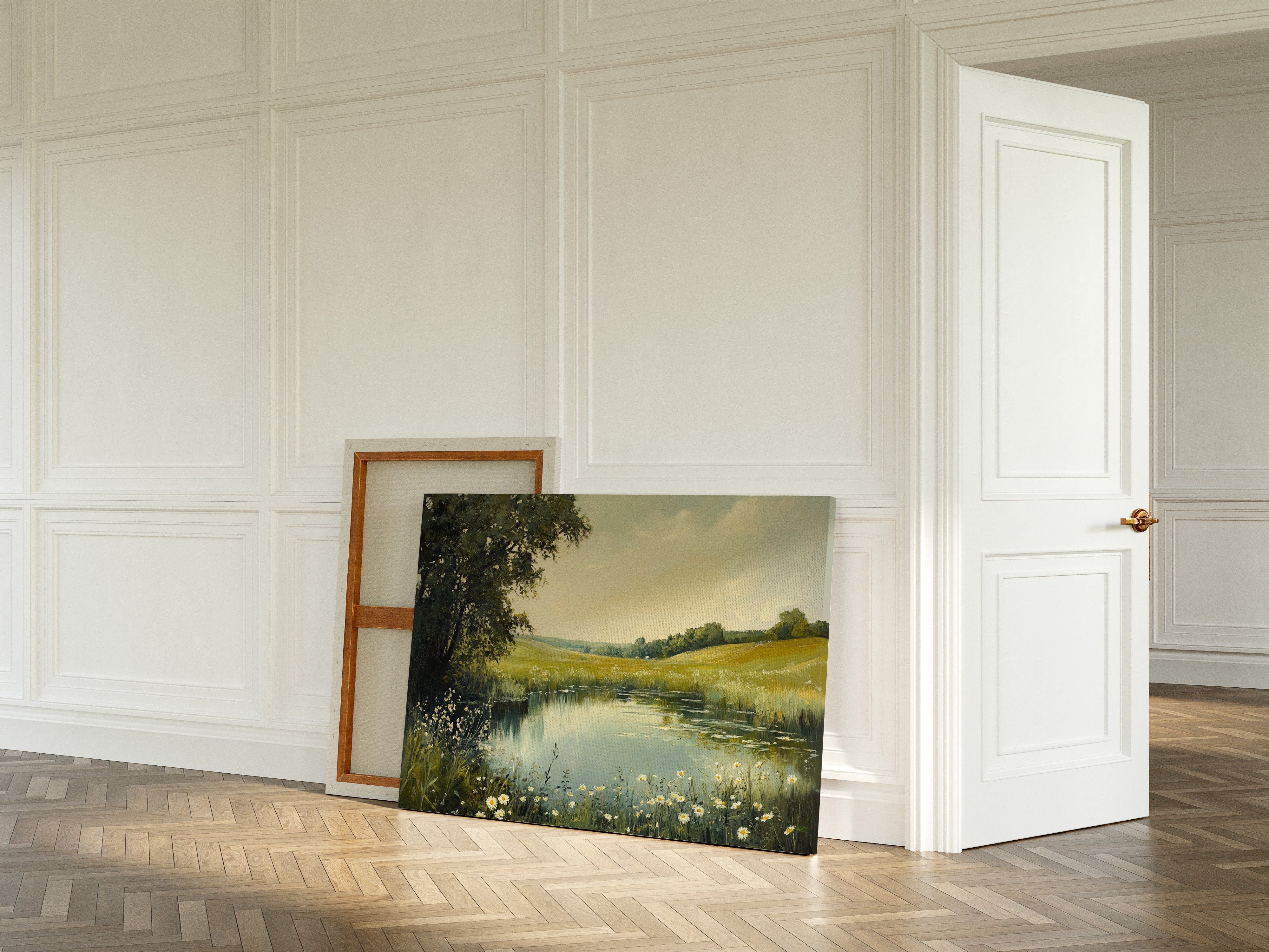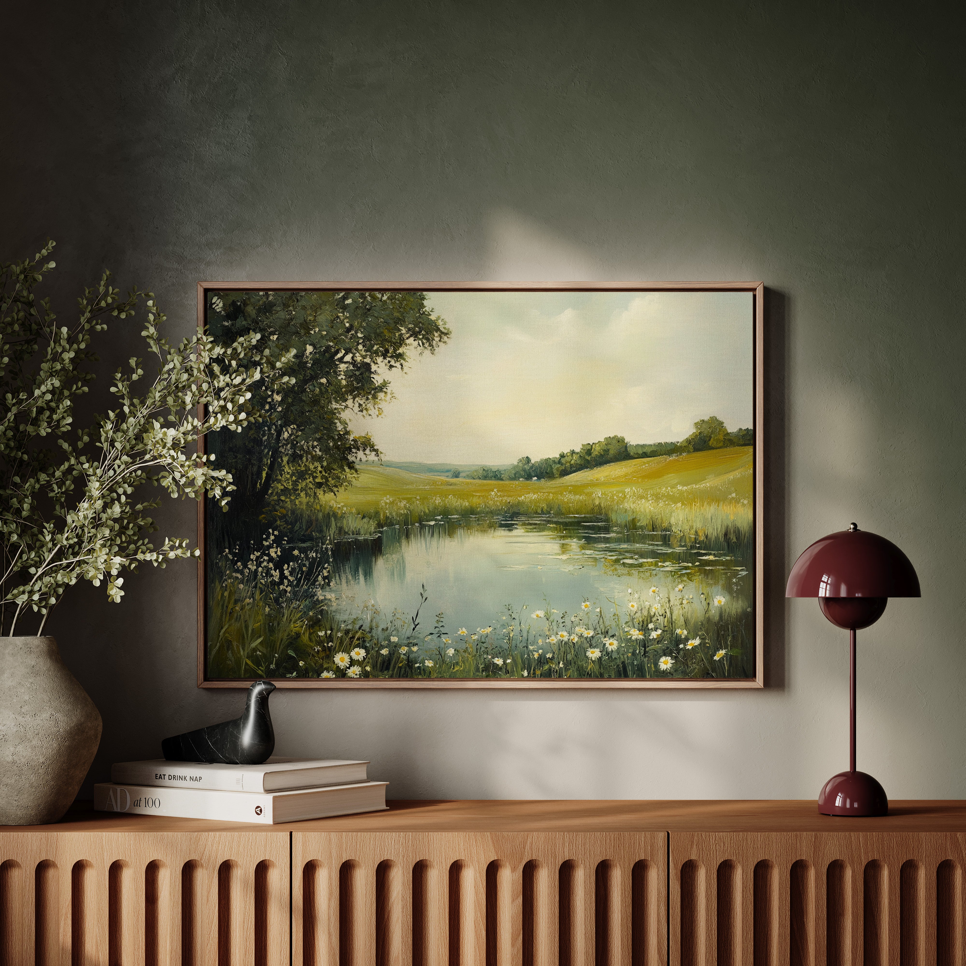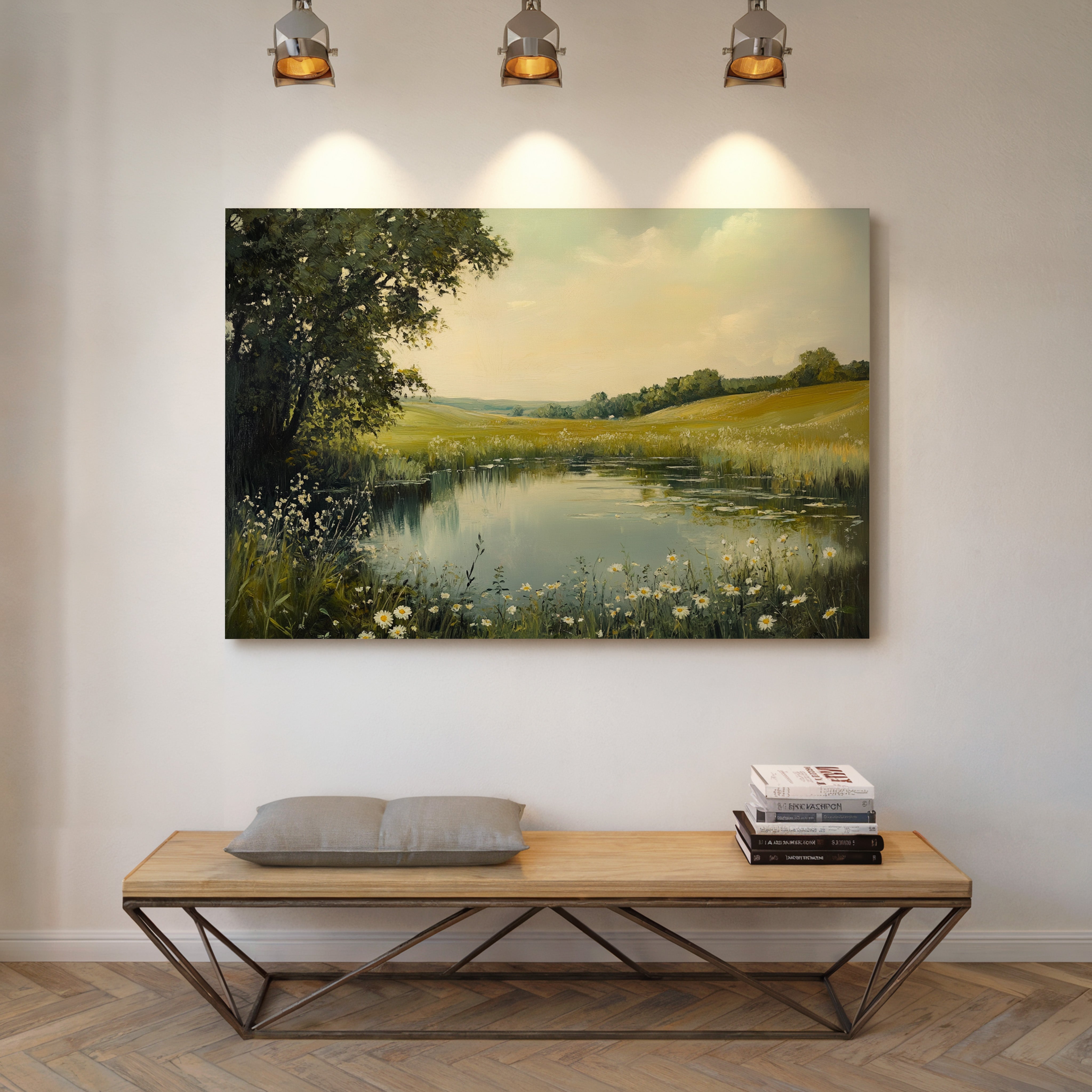 Morning light spills across a tranquil pond, where wild daisies nod their heads in the gentle breeze. The water mirrors the soft yellow sky, creating a perfect reflection of serenity. Rolling hills stretch into the distance, their golden grasses blending with clusters of deep green trees, while delicate white petals frame the water's edge like nature's own lace trim. This pastoral scene captures the essence of a perfect summer day, where time seems to stand still. Perfect for bringing a sense of peace and natural beauty to a bedroom or living space where quiet contemplation is valued.
