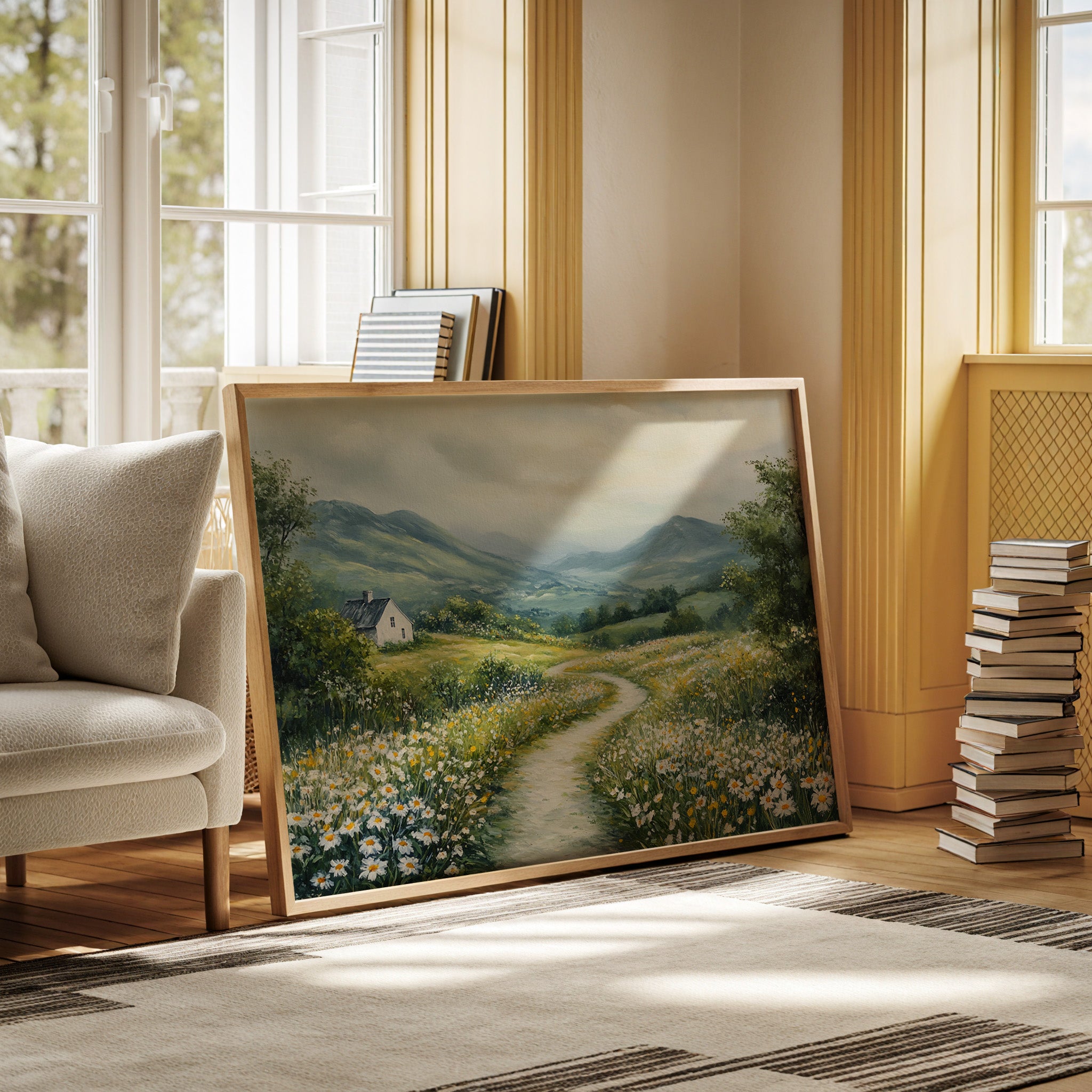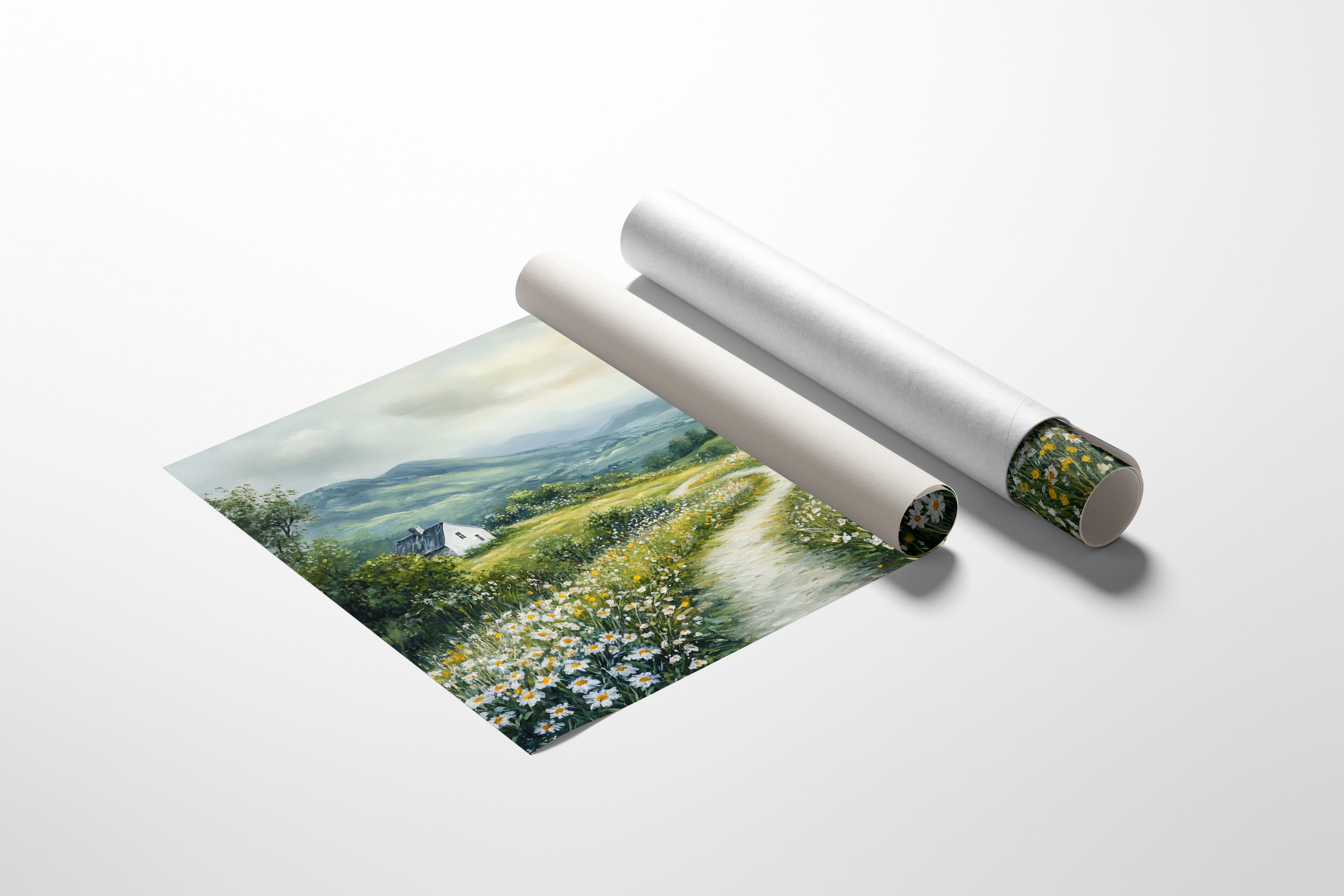 A winding path cuts through a sea of wild daisies, their white petals dancing in the summer breeze. The gentle curve leads to a solitary white cottage nestled against emerald hillsides, a quiet sentinel in the valley. Soft blues and greens paint the distant mountains, while golden buttercups scatter among the daisies like drops of sunshine. This pastoral scene captures the essence of peaceful solitude, where nature's wild beauty meets human dwelling in perfect harmony. Perfect for bringing a sense of tranquility and escape to a reading nook, bedroom, or any space where you seek a moment of countryside serenity.