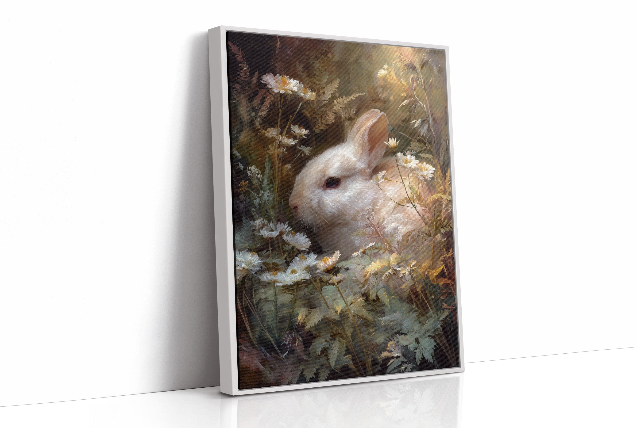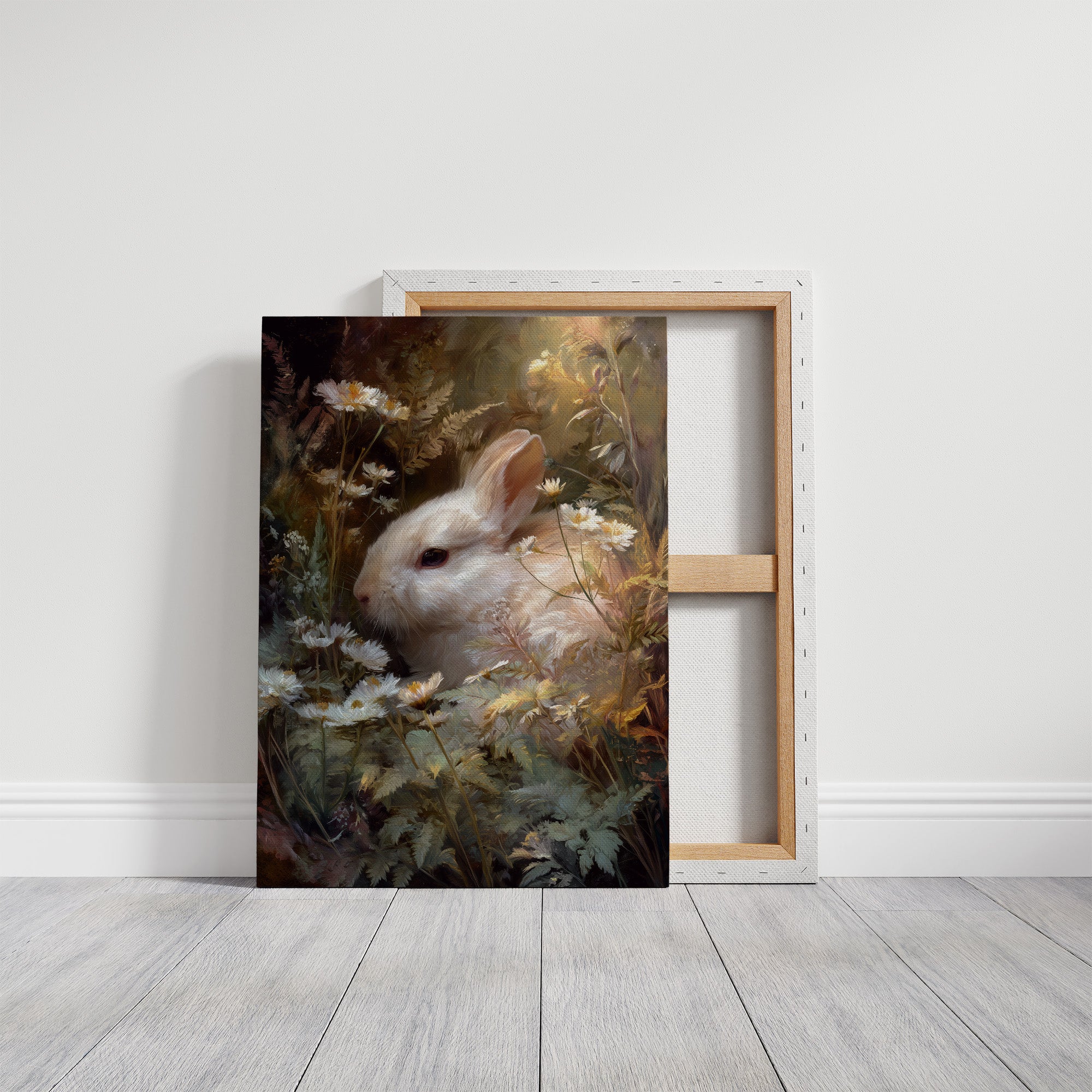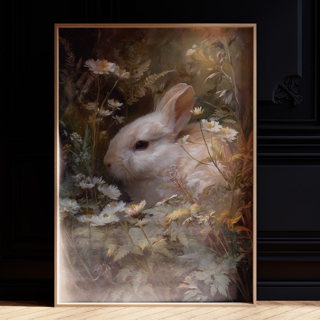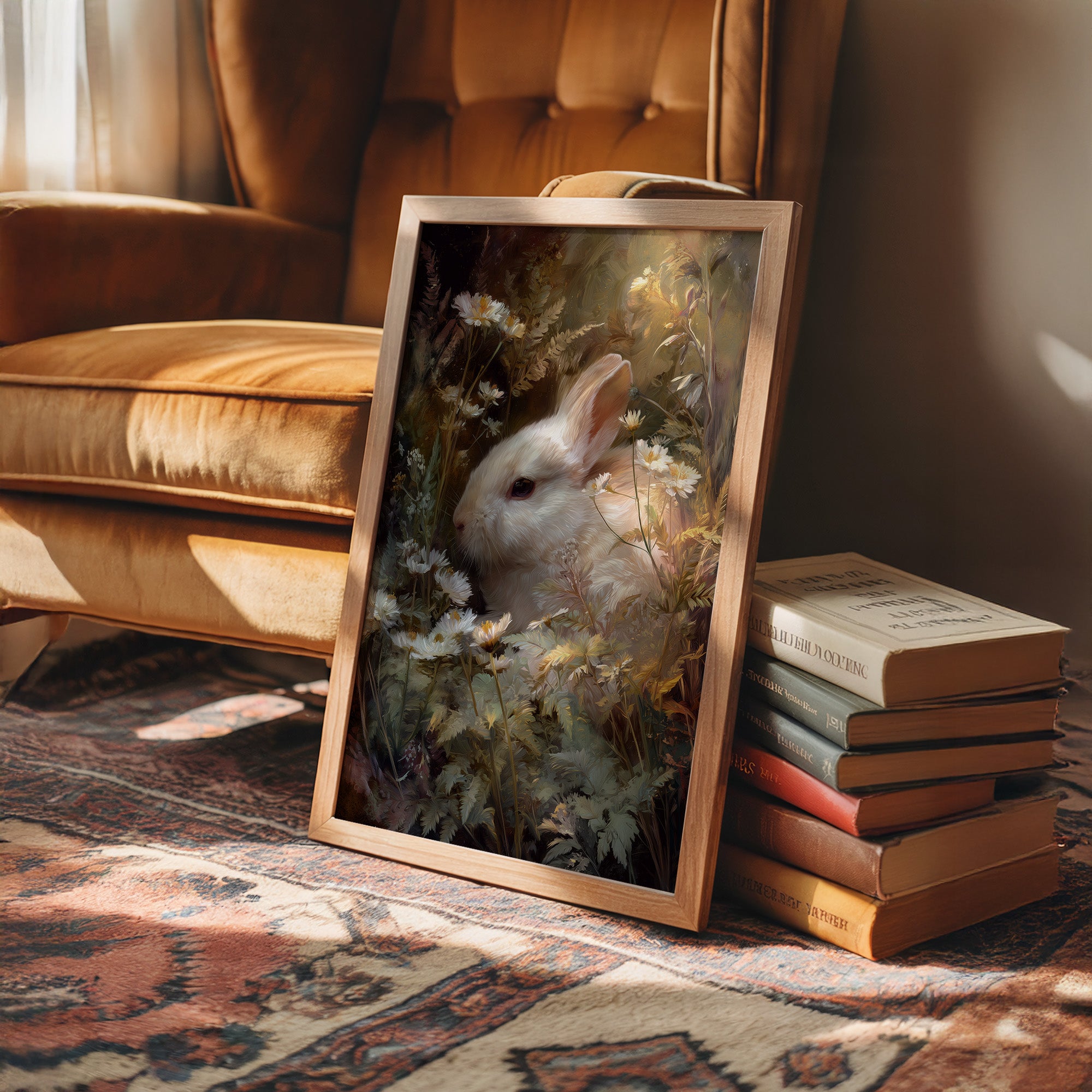 A white rabbit nestles among delicate daisies, caught in a moment of quiet curiosity. Warm golden light filters through foliage, casting a dreamlike glow across the scene where innocence meets wilderness. The painterly technique creates a nostalgic atmosphere, blending soft textures of fur with the feathery petals and wild grasses that provide both sanctuary and adventure.