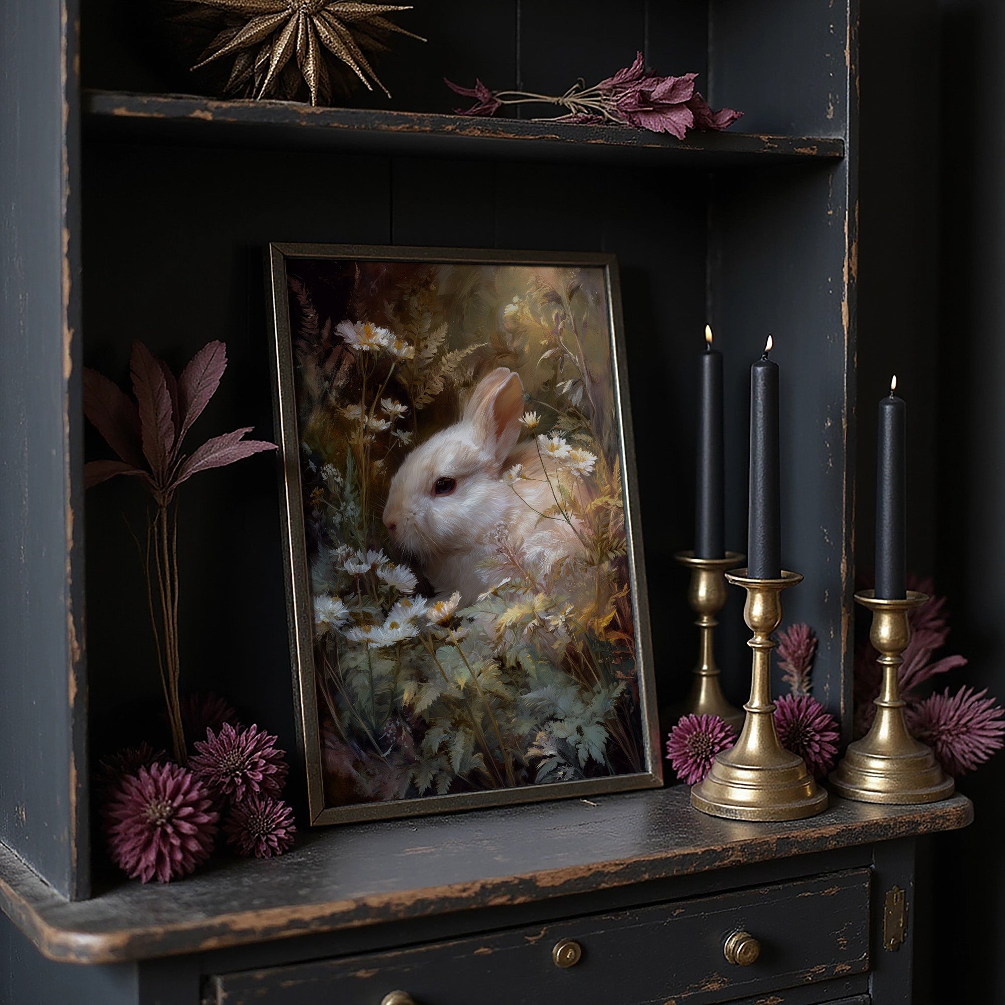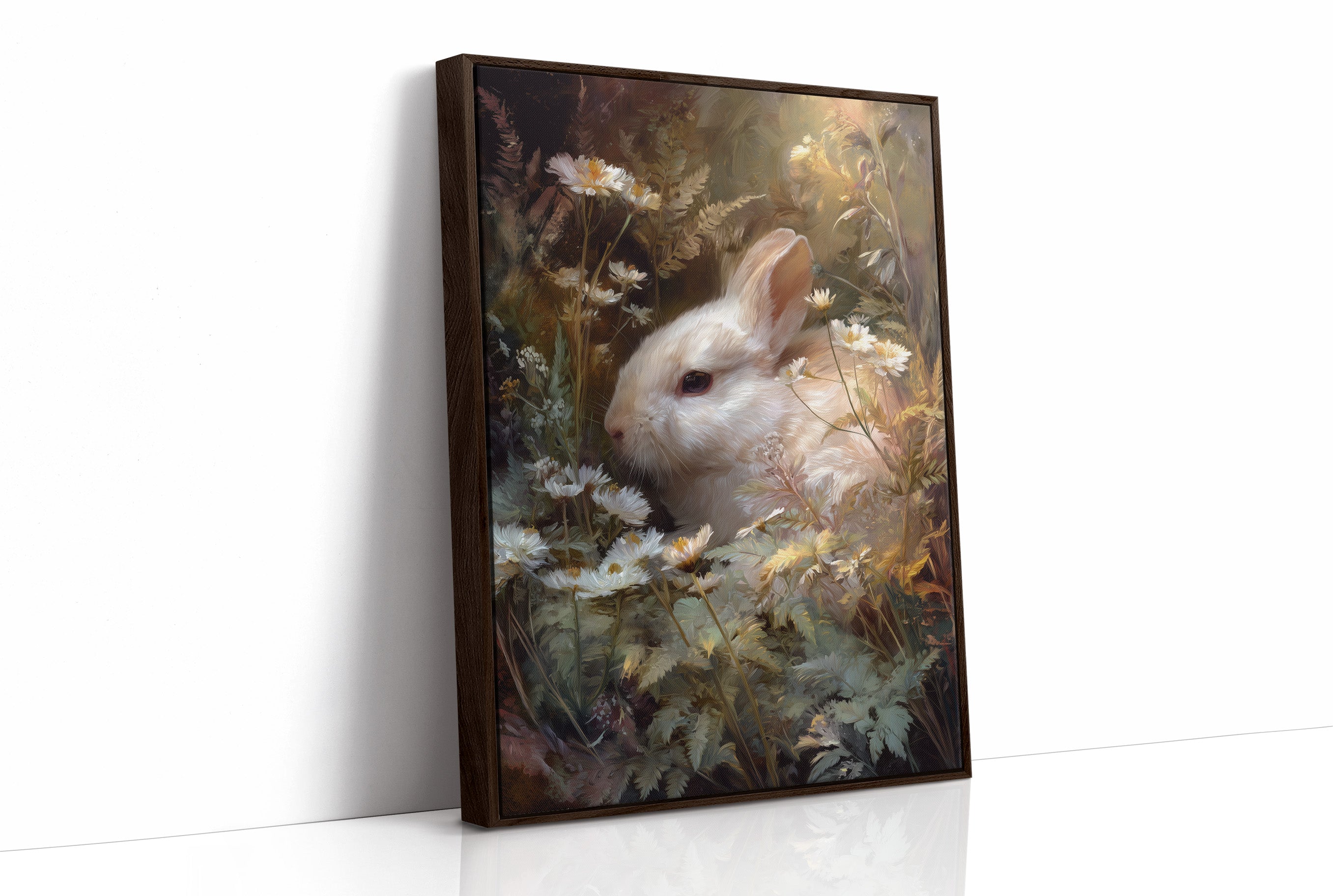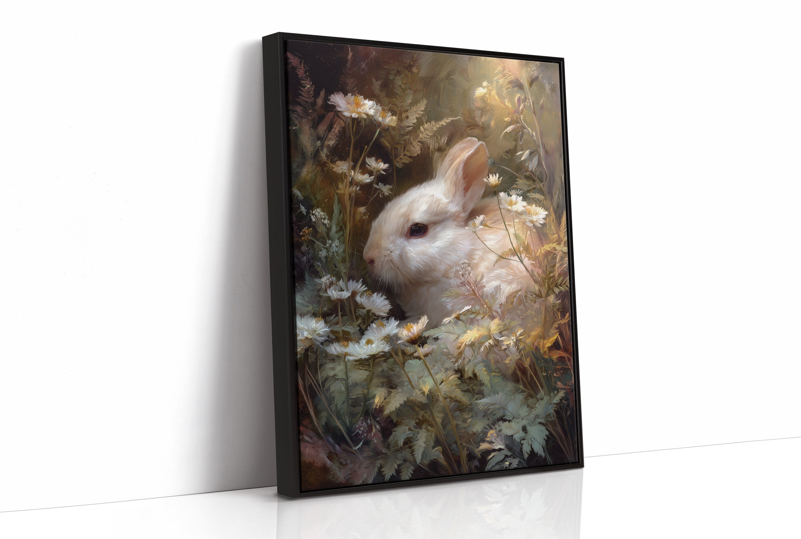 A white rabbit nestles among delicate daisies, caught in a moment of quiet curiosity. Warm golden light filters through foliage, casting a dreamlike glow across the scene where innocence meets wilderness. The painterly technique creates a nostalgic atmosphere, blending soft textures of fur with the feathery petals and wild grasses that provide both sanctuary and adventure.