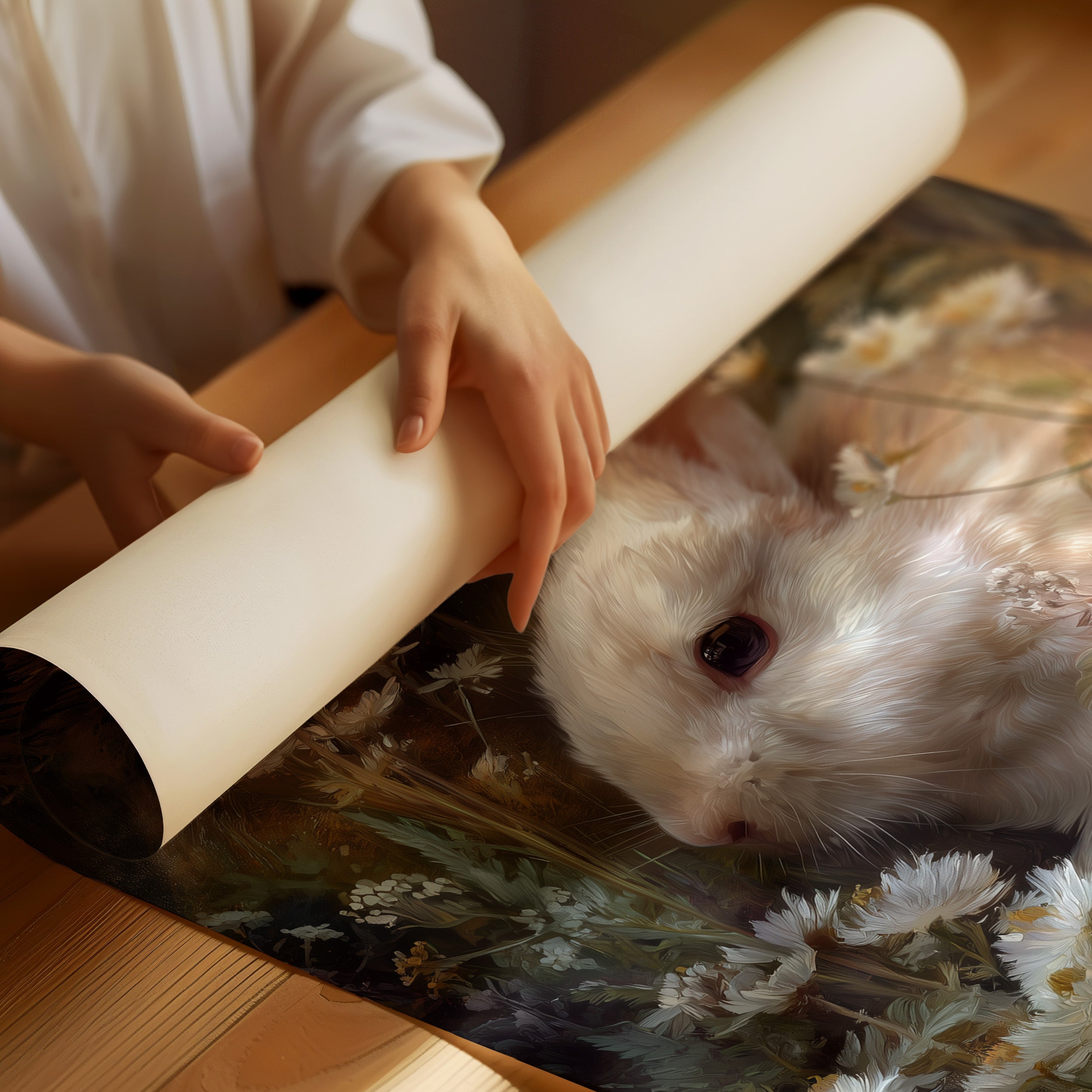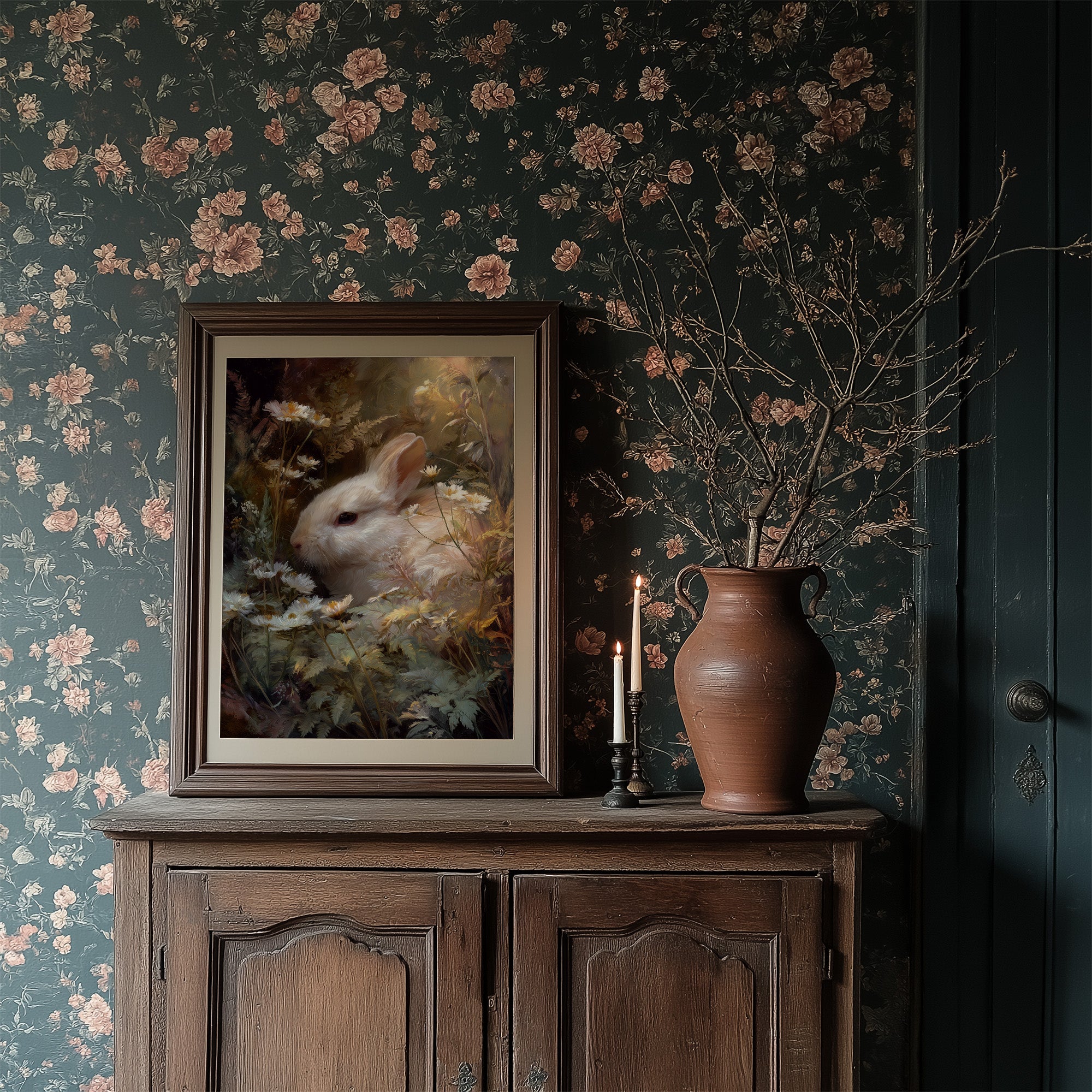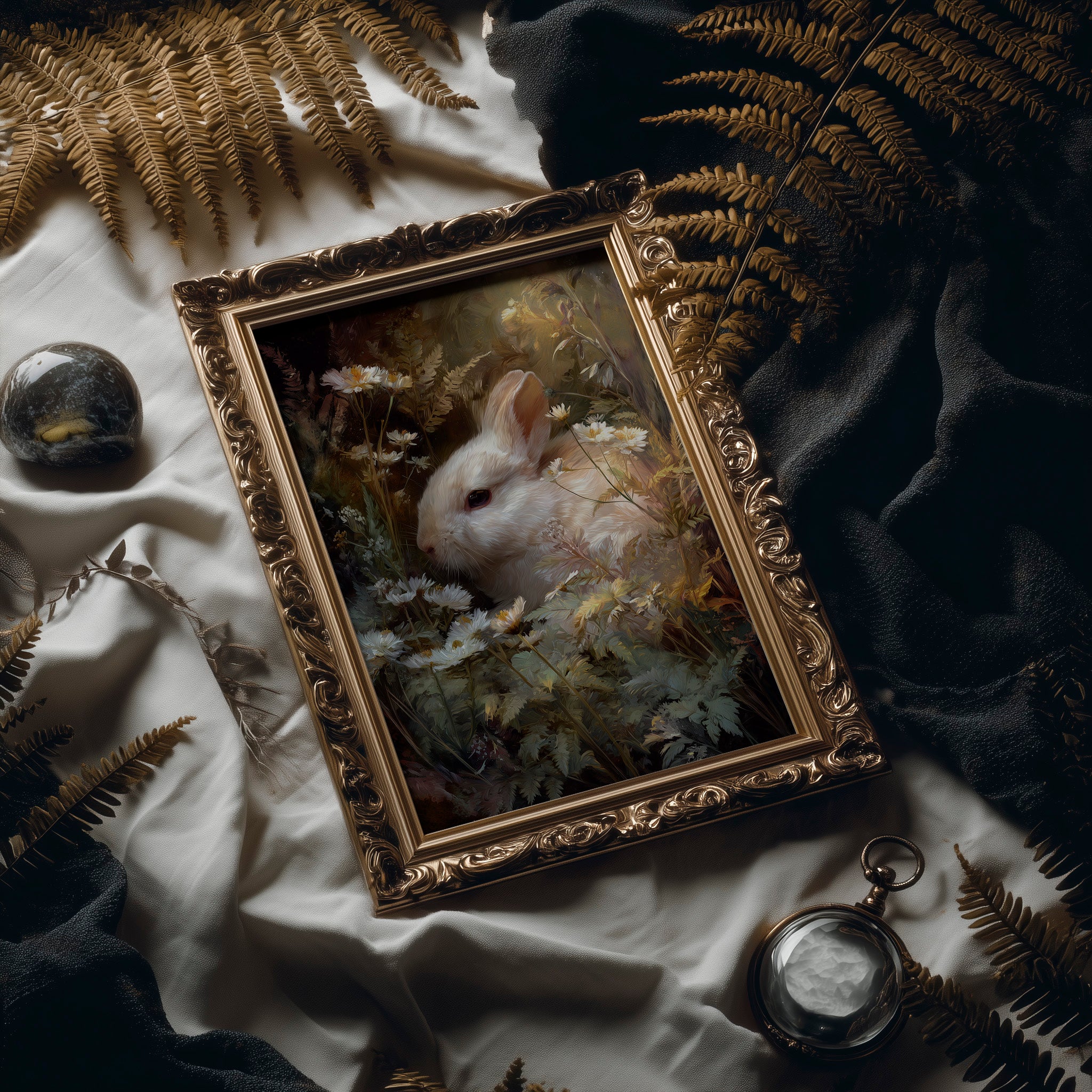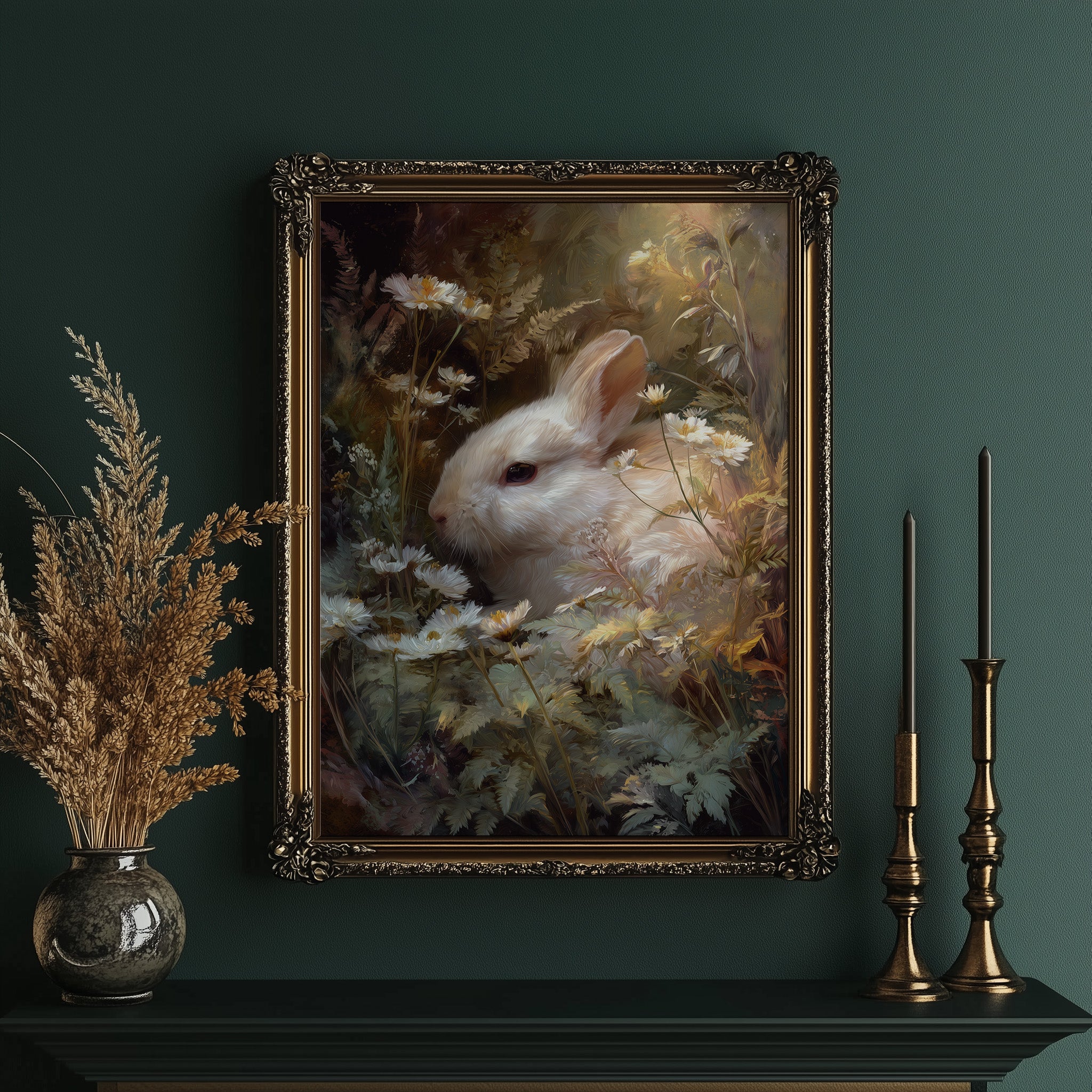 A white rabbit nestles among delicate daisies, caught in a moment of quiet curiosity. Warm golden light filters through foliage, casting a dreamlike glow across the scene where innocence meets wilderness. The painterly technique creates a nostalgic atmosphere, blending soft textures of fur with the feathery petals and wild grasses that provide both sanctuary and adventure.