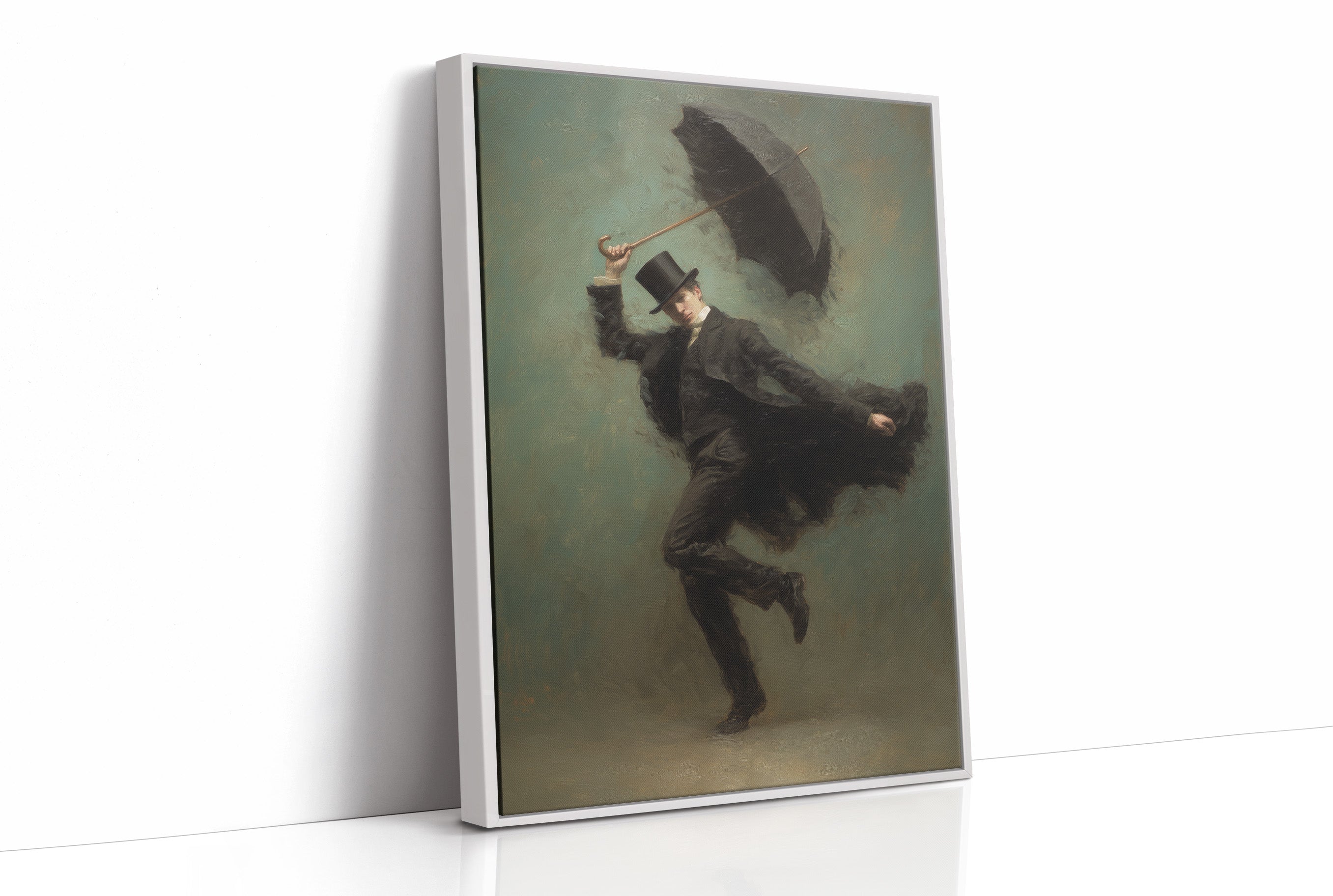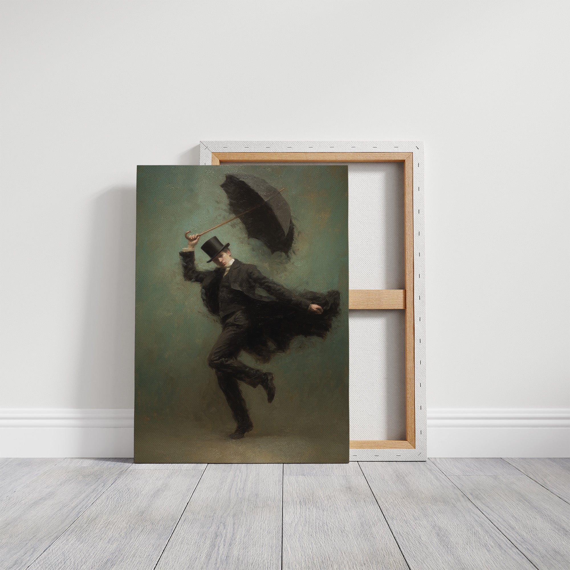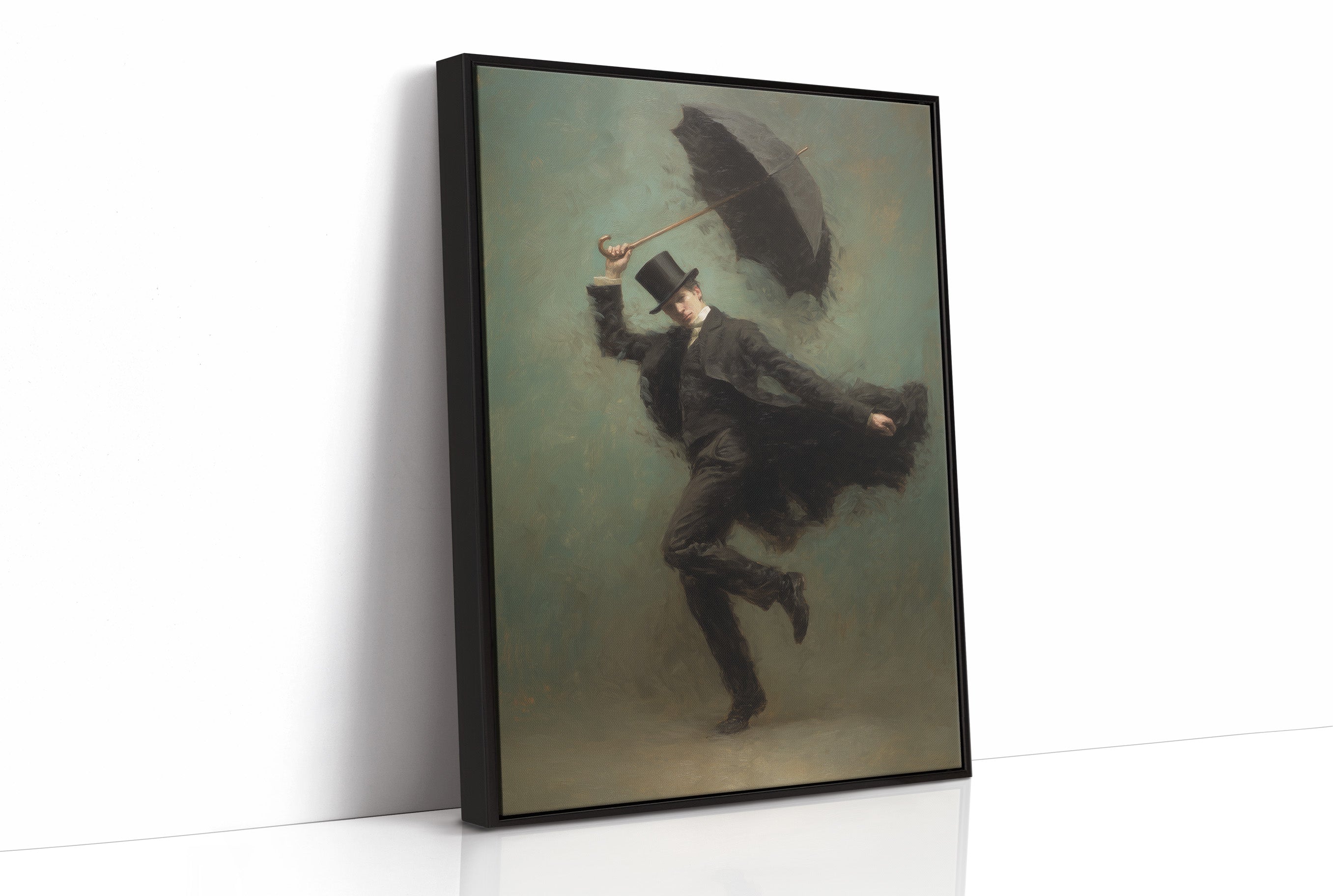 A moment suspended between gravity and flight, where a gentleman in Victorian attire defies the pull of earth. The muted palette of charcoals and sage greens creates a dreamlike quality, as his coat billows dramatically while he balances precariously with his umbrella. Set against a minimalist backdrop, this elegant portrait captures the tension between proper societal constraints and the wild freedom of movement.