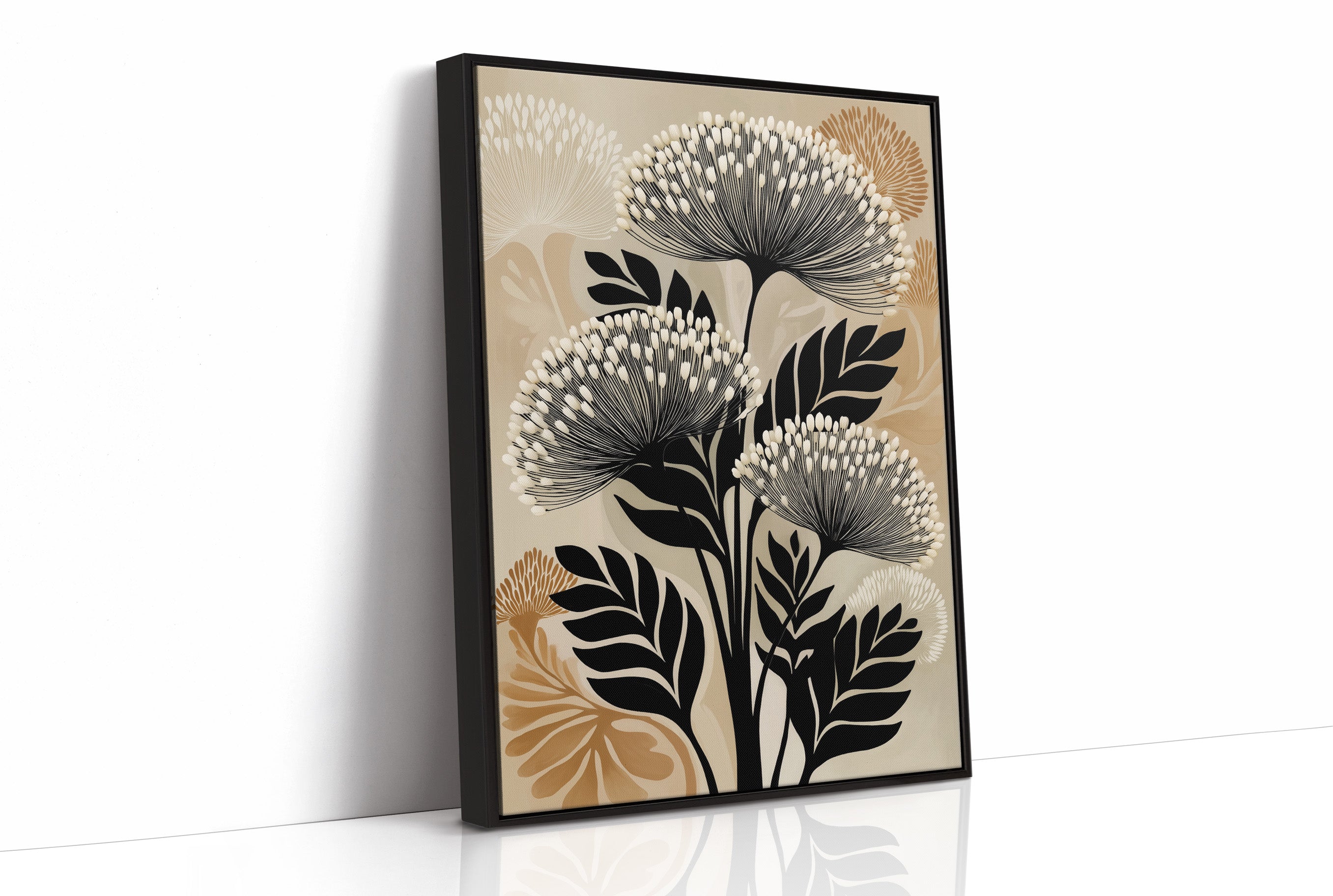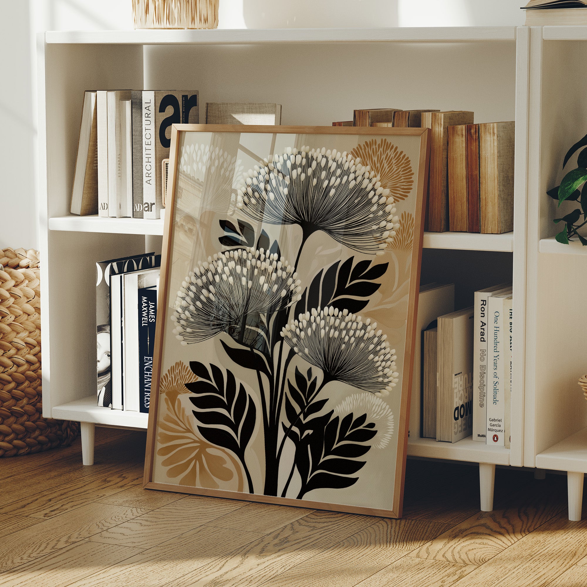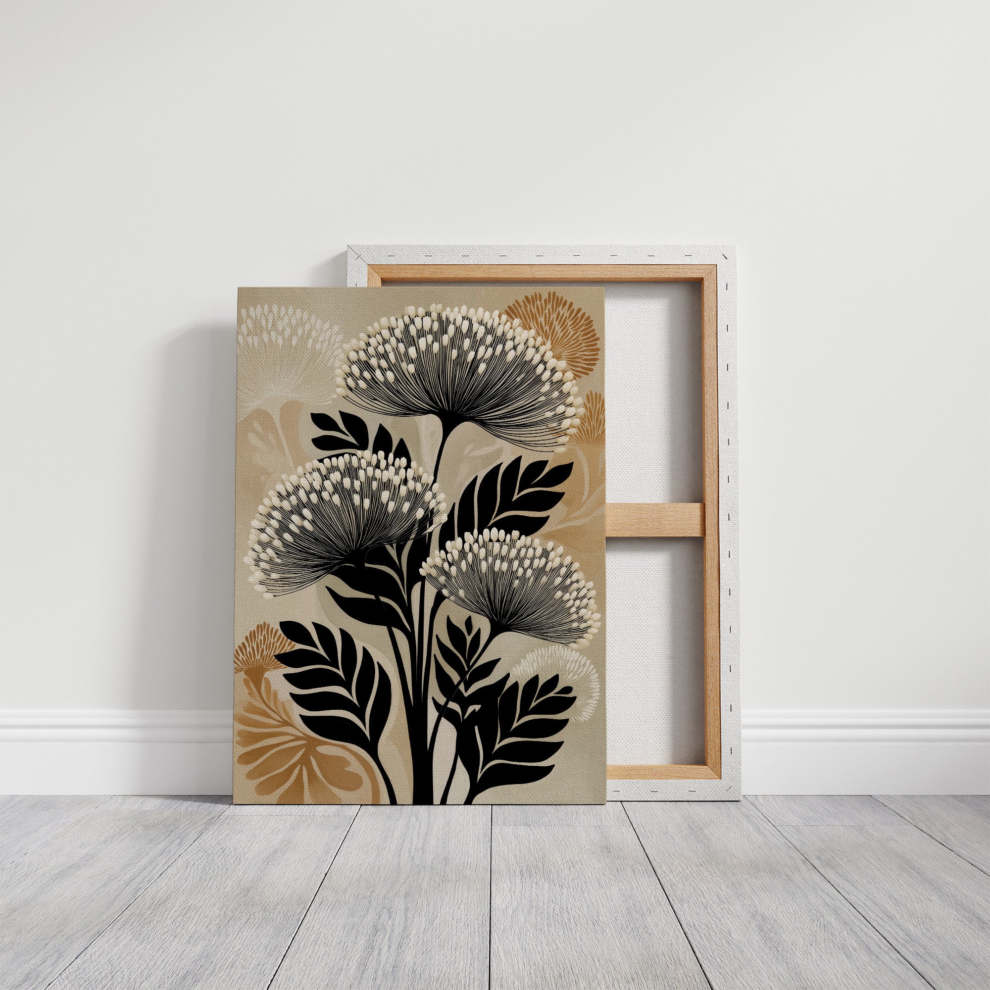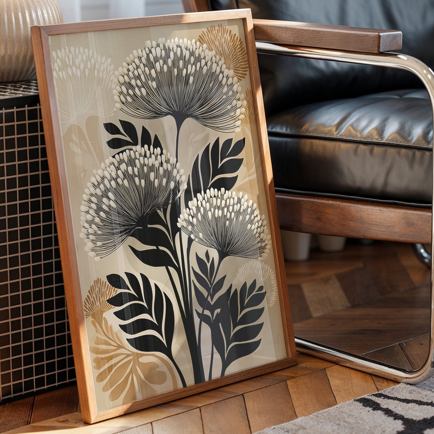 Delicate spheres of dandelion blooms stretch skyward against a warm beige backdrop, their intricate patterns creating a mesmerizing botanical ballet. Bold black leaves frame the ethereal seedheads, while subtle copper accents add depth and warmth to this modern botanical study. The composition's clean lines and contemporary interpretation of natural forms creates a sophisticated harmony between organic shapes and graphic design. This striking piece would elevate any modern living space, particularly suited for a reading nook, home office, or anywhere you seek to blend natural elements with contemporary design.
