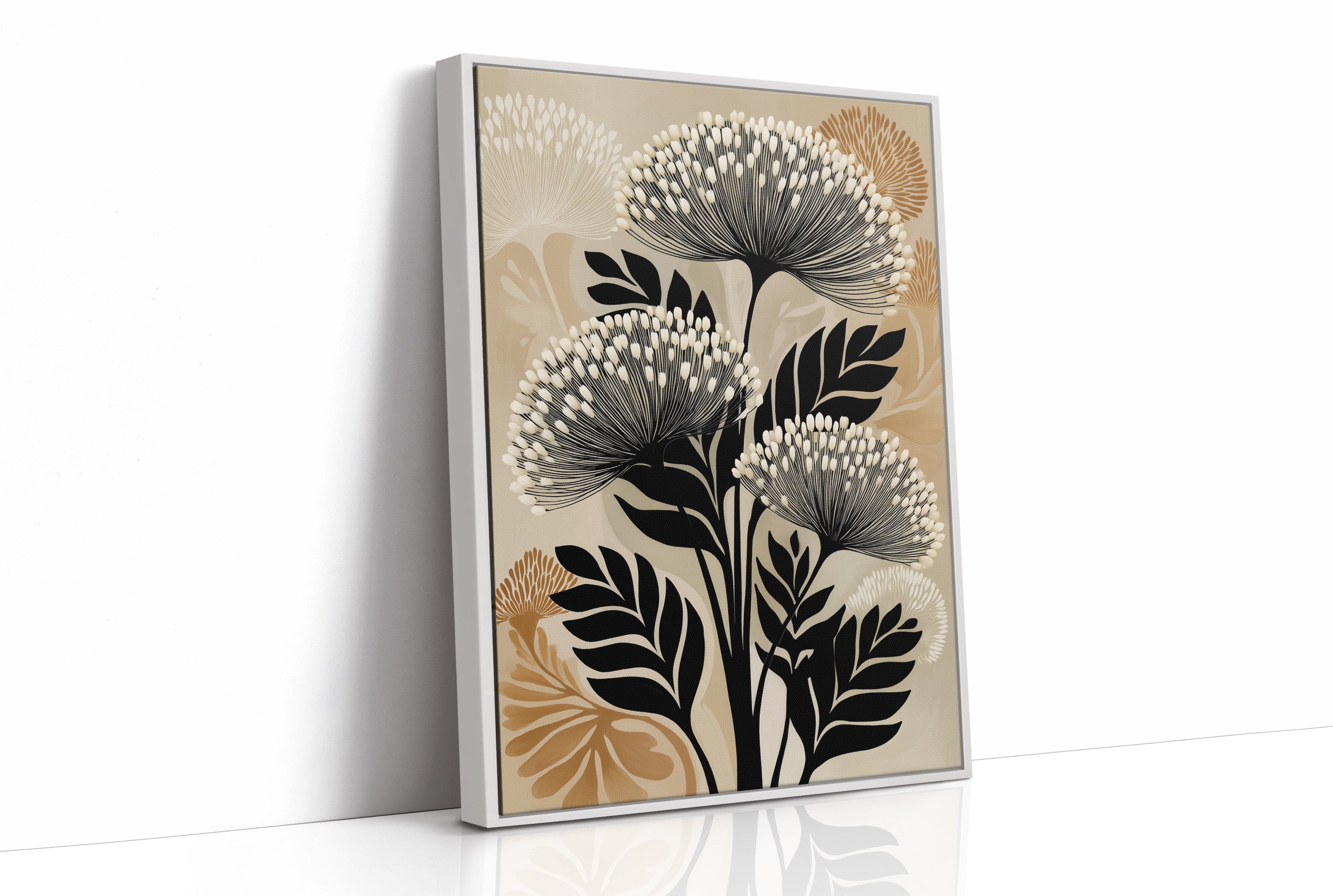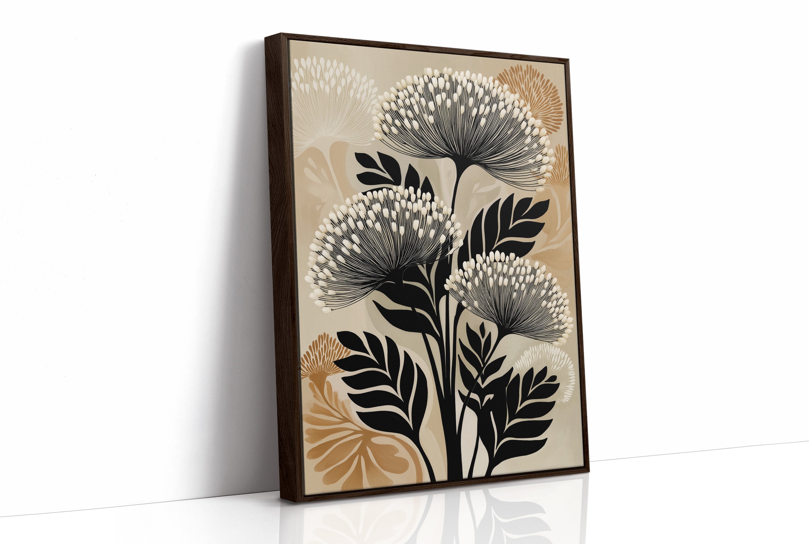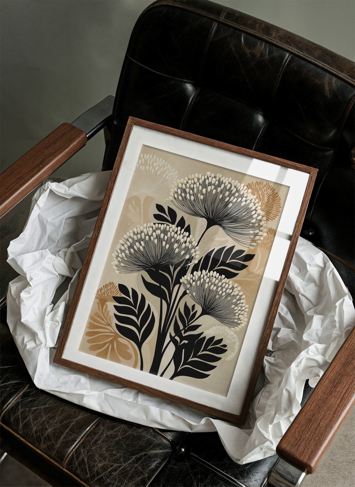Delicate spheres of dandelion blooms stretch skyward against a warm beige backdrop, their intricate patterns creating a mesmerizing botanical ballet. Bold black leaves frame the ethereal seedheads, while subtle copper accents add depth and warmth to this modern botanical study. The composition's clean lines and contemporary interpretation of natural forms creates a sophisticated harmony between organic shapes and graphic design. This striking piece would elevate any modern living space, particularly suited for a reading nook, home office, or anywhere you seek to blend natural elements with contemporary design.
