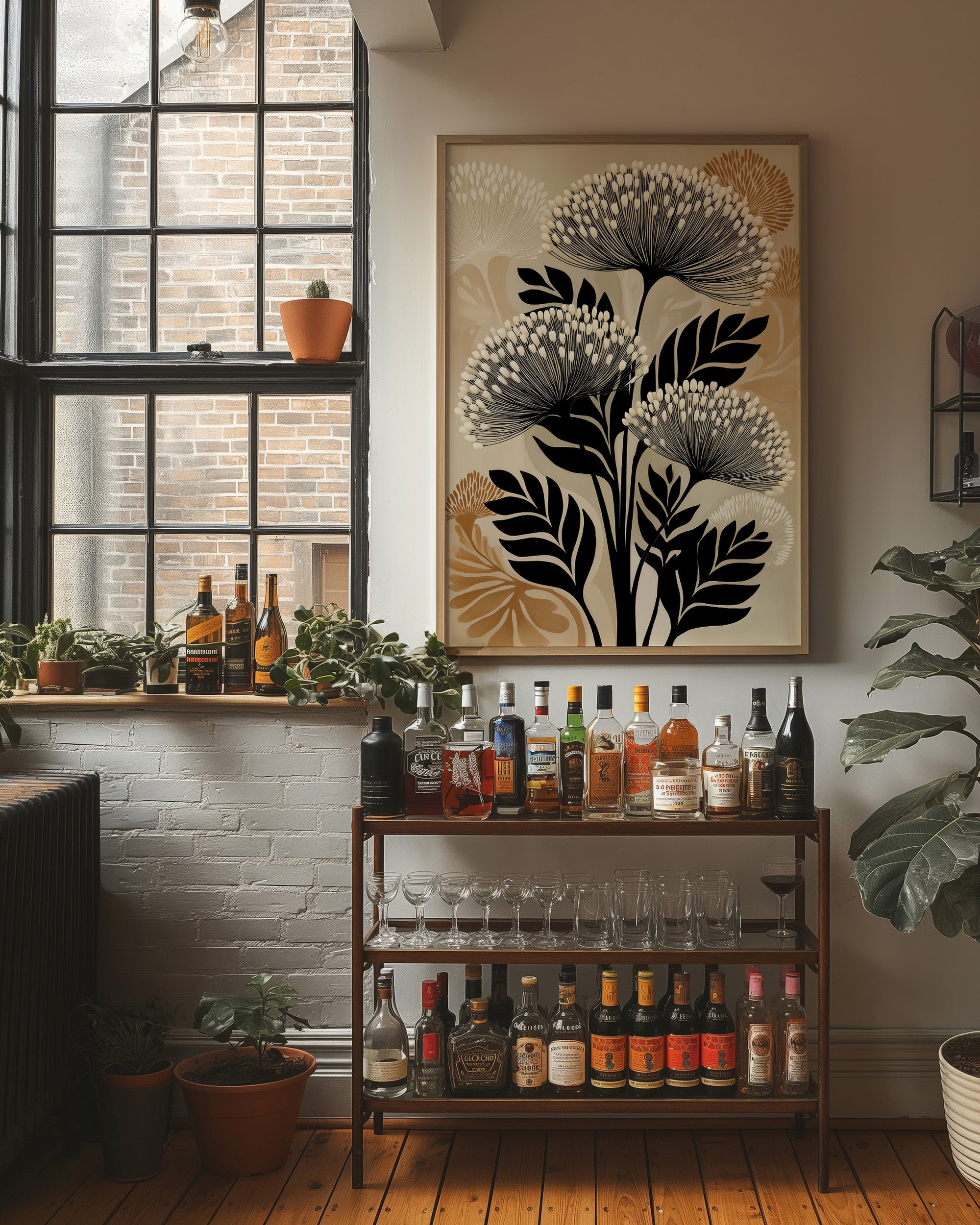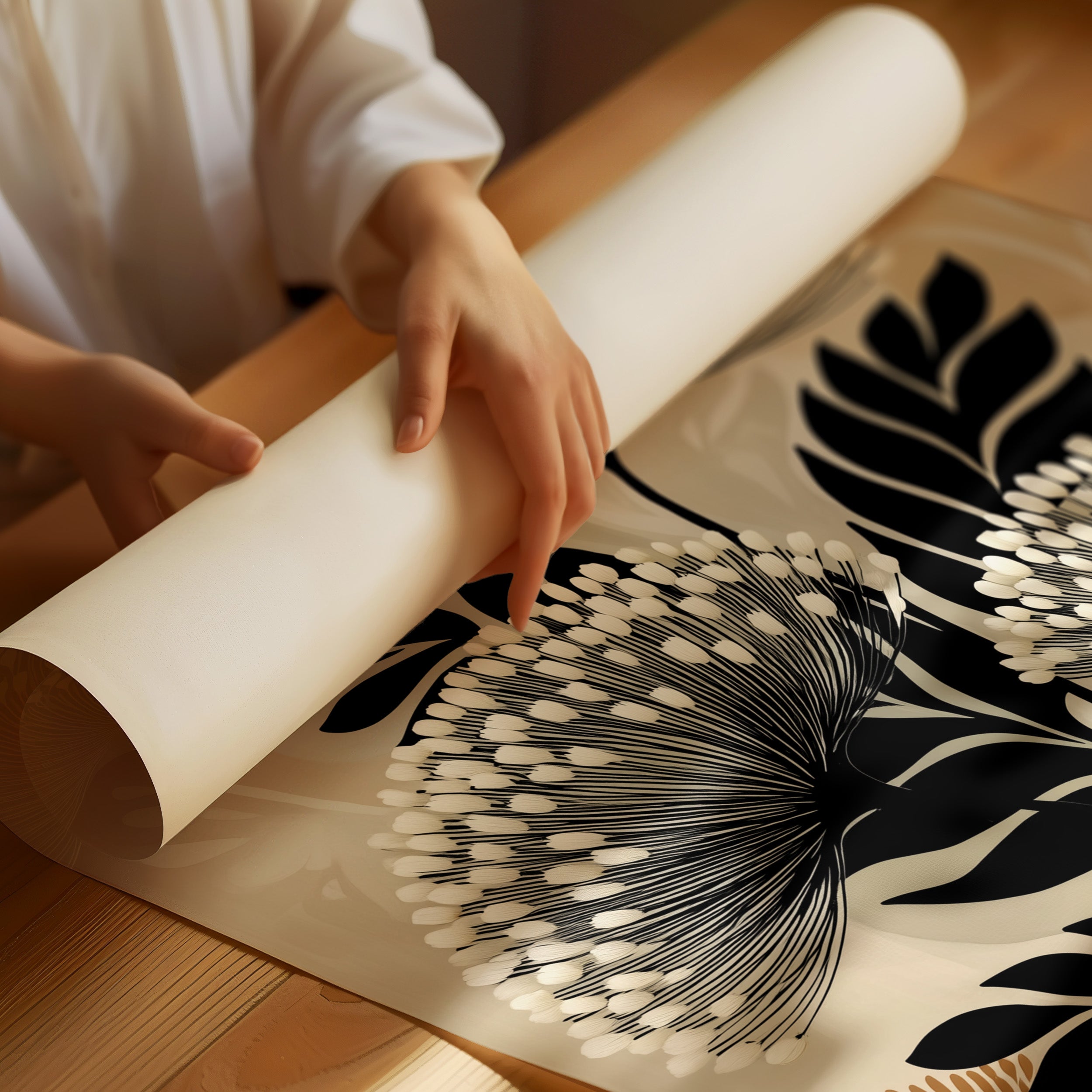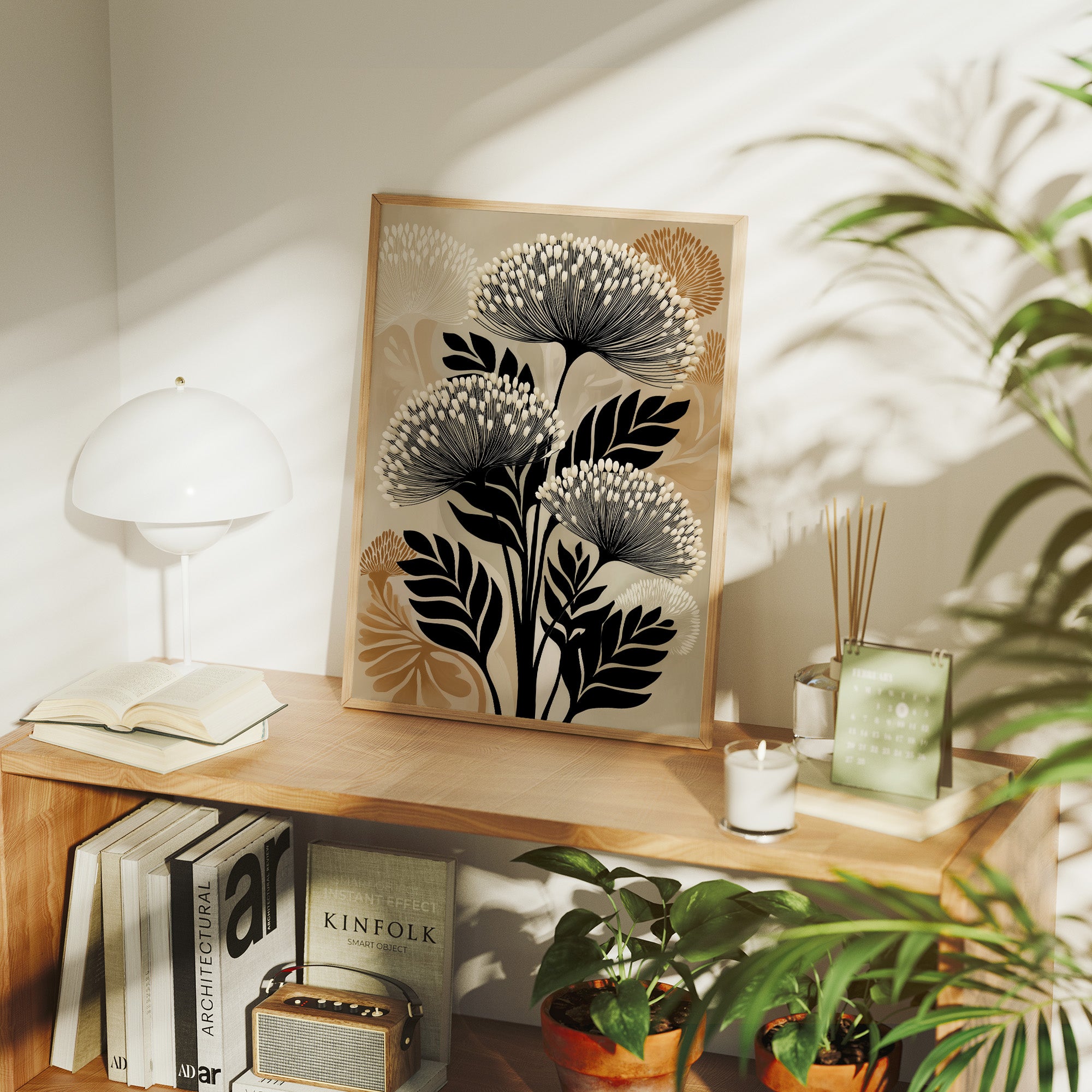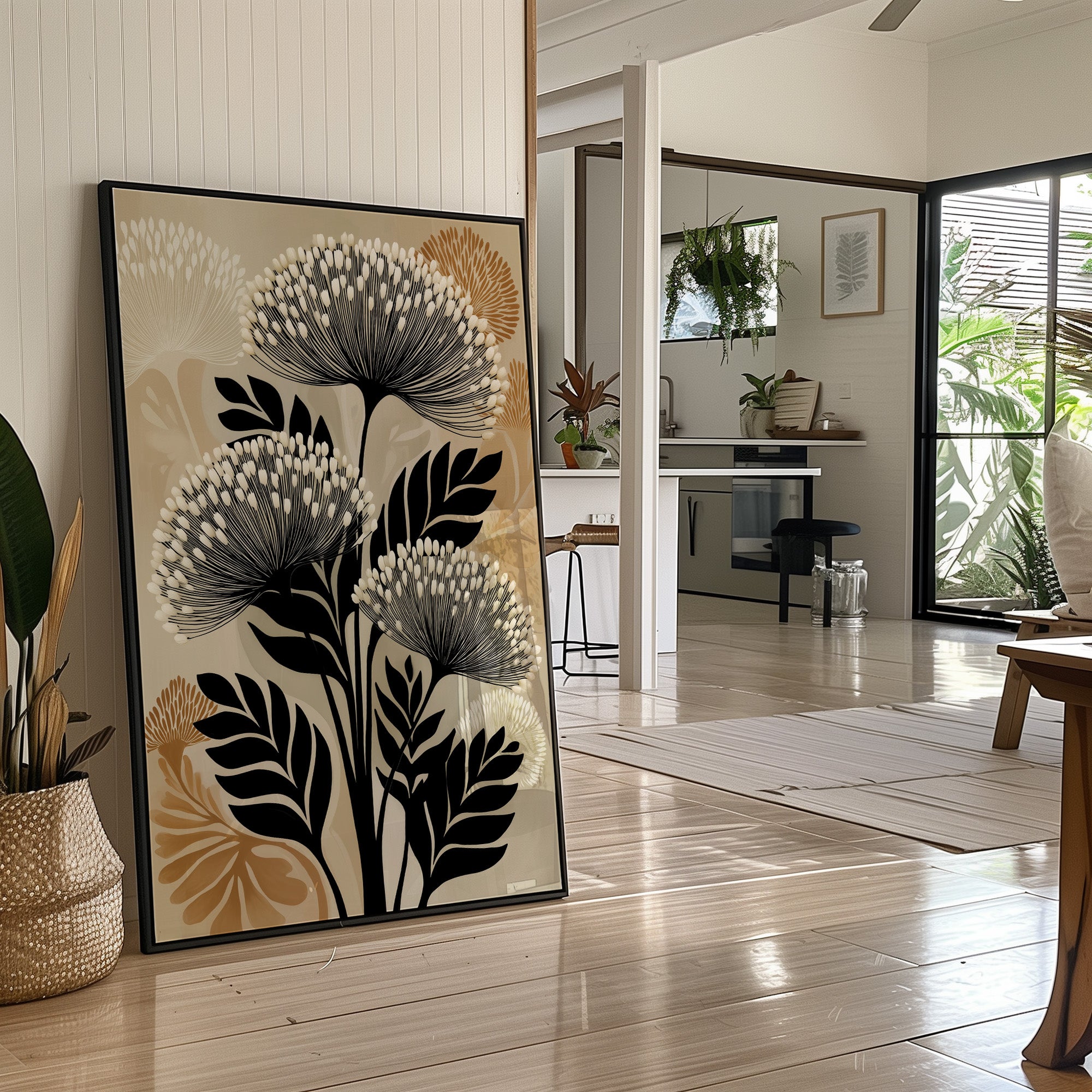 Delicate spheres of dandelion blooms stretch skyward against a warm beige backdrop, their intricate patterns creating a mesmerizing botanical ballet. Bold black leaves frame the ethereal seedheads, while subtle copper accents add depth and warmth to this modern botanical study. The composition's clean lines and contemporary interpretation of natural forms creates a sophisticated harmony between organic shapes and graphic design. This striking piece would elevate any modern living space, particularly suited for a reading nook, home office, or anywhere you seek to blend natural elements with contemporary design.