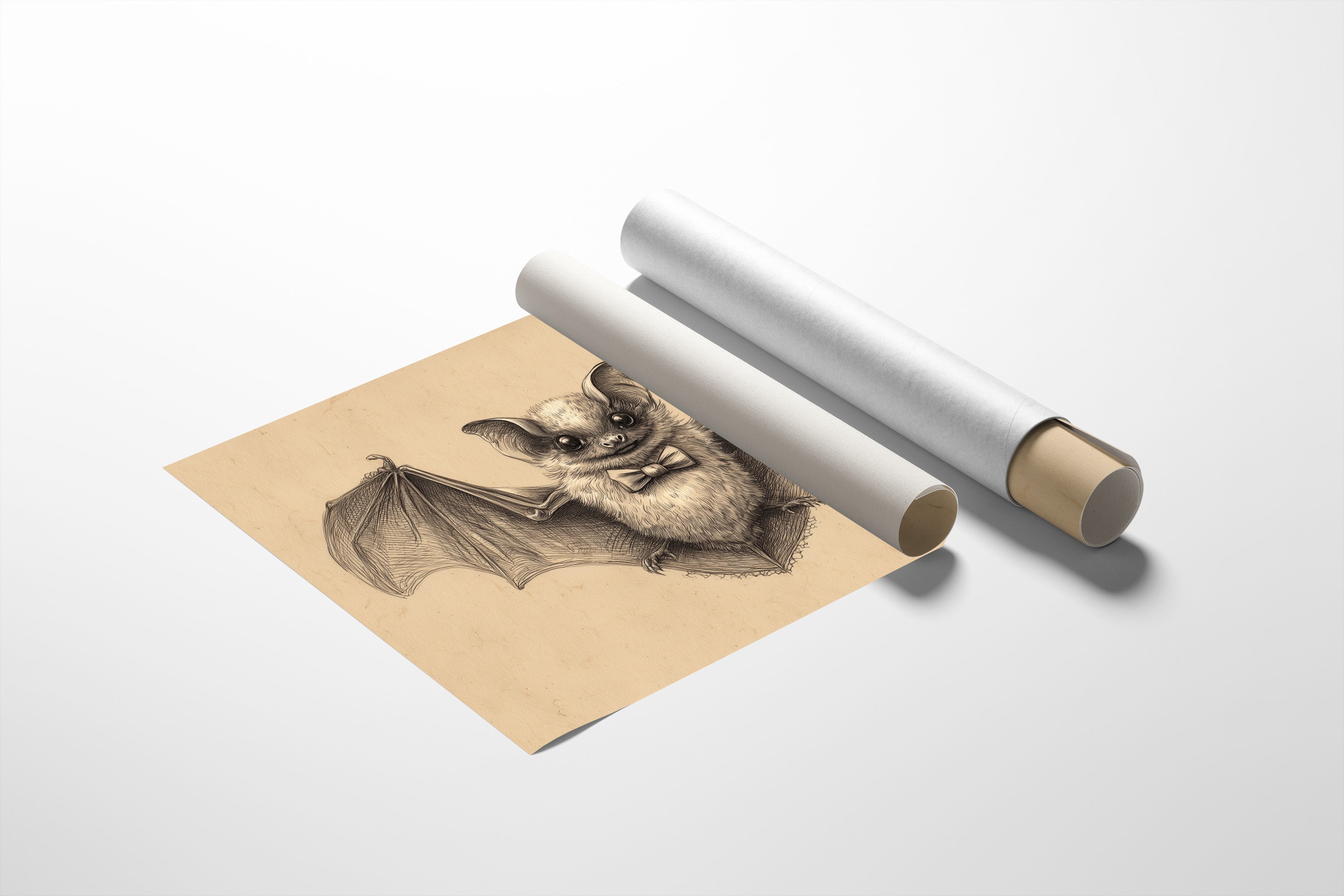 A charming pencil illustration of a bow-tied bat perches against aged parchment, inviting viewers into a world where the nocturnal meets the whimsical. The detailed rendering captures every delicate wing membrane and fur texture, creating an unexpected character that bridges Victorian curiosity and contemporary charm. This sophisticated piece finds its perfect home in a study, reading nook, or alongside collected volumes in a personal library where it adds personality without overwhelming the space.