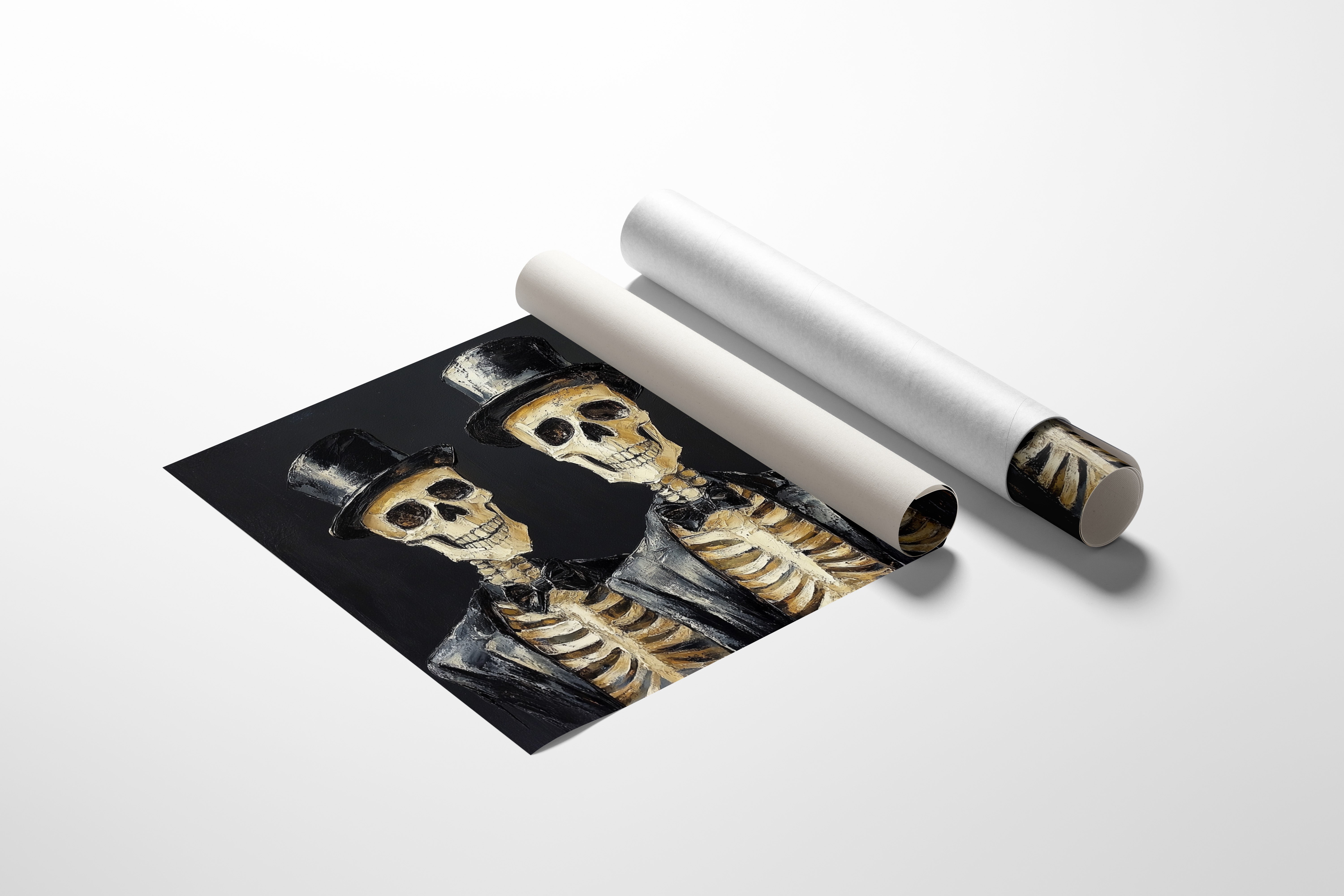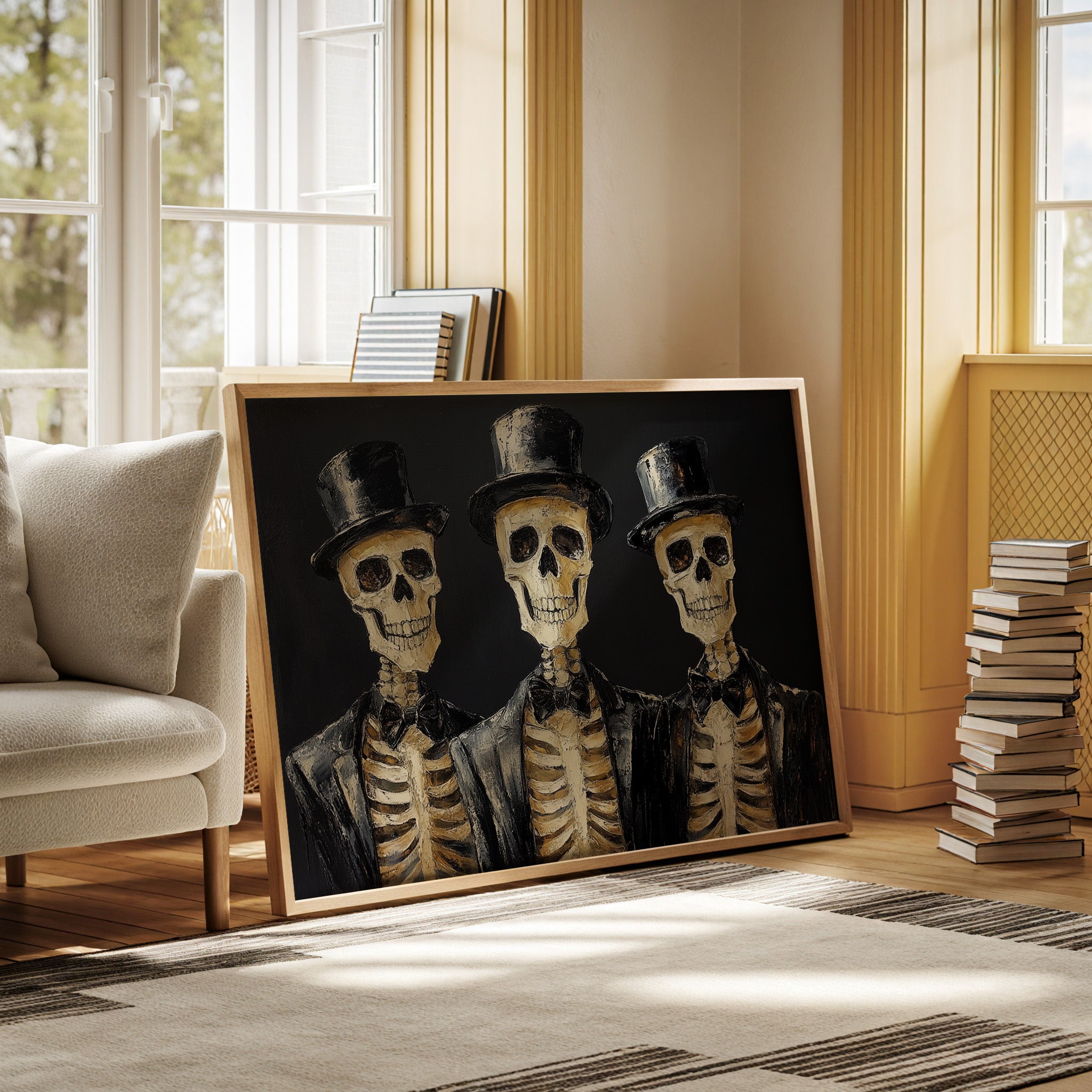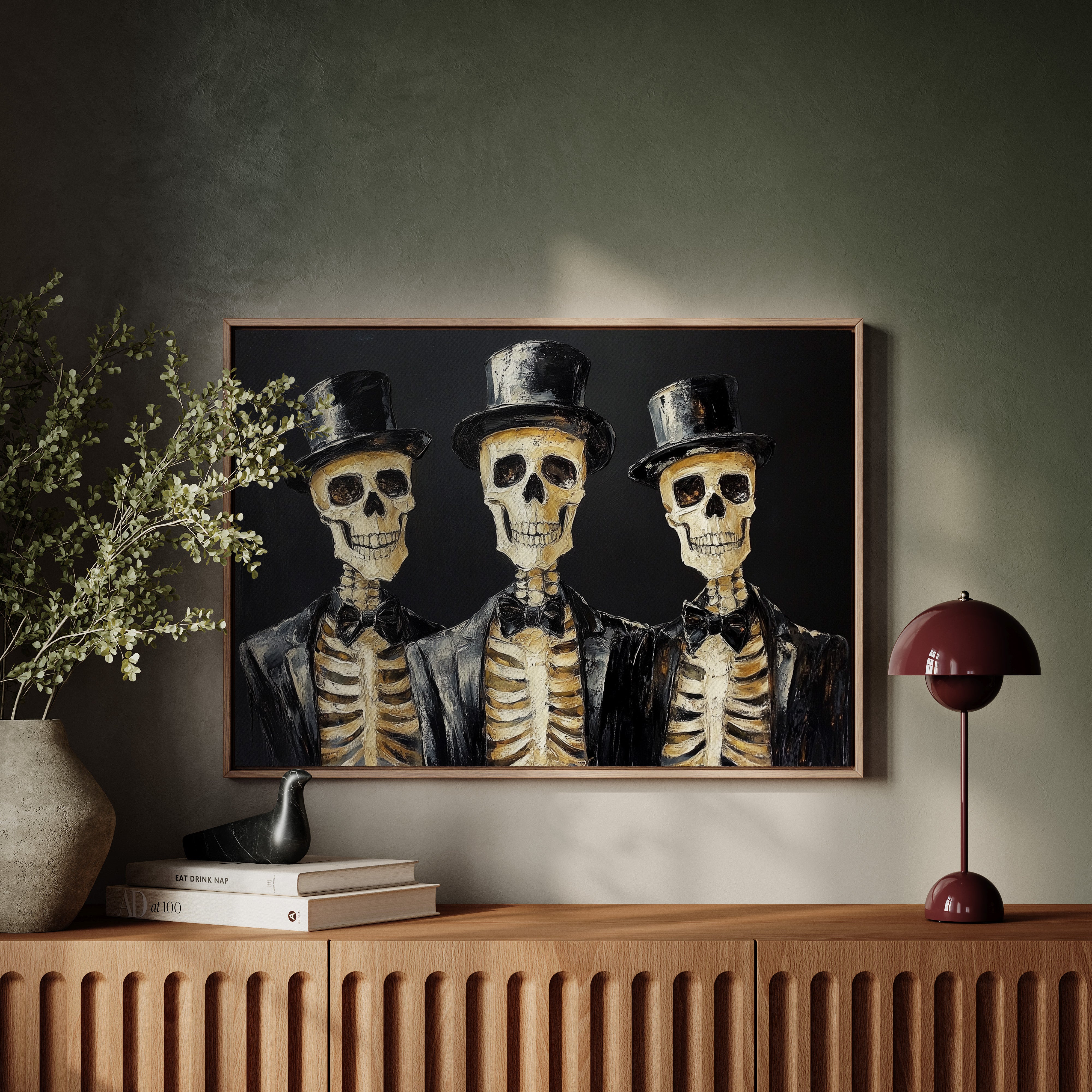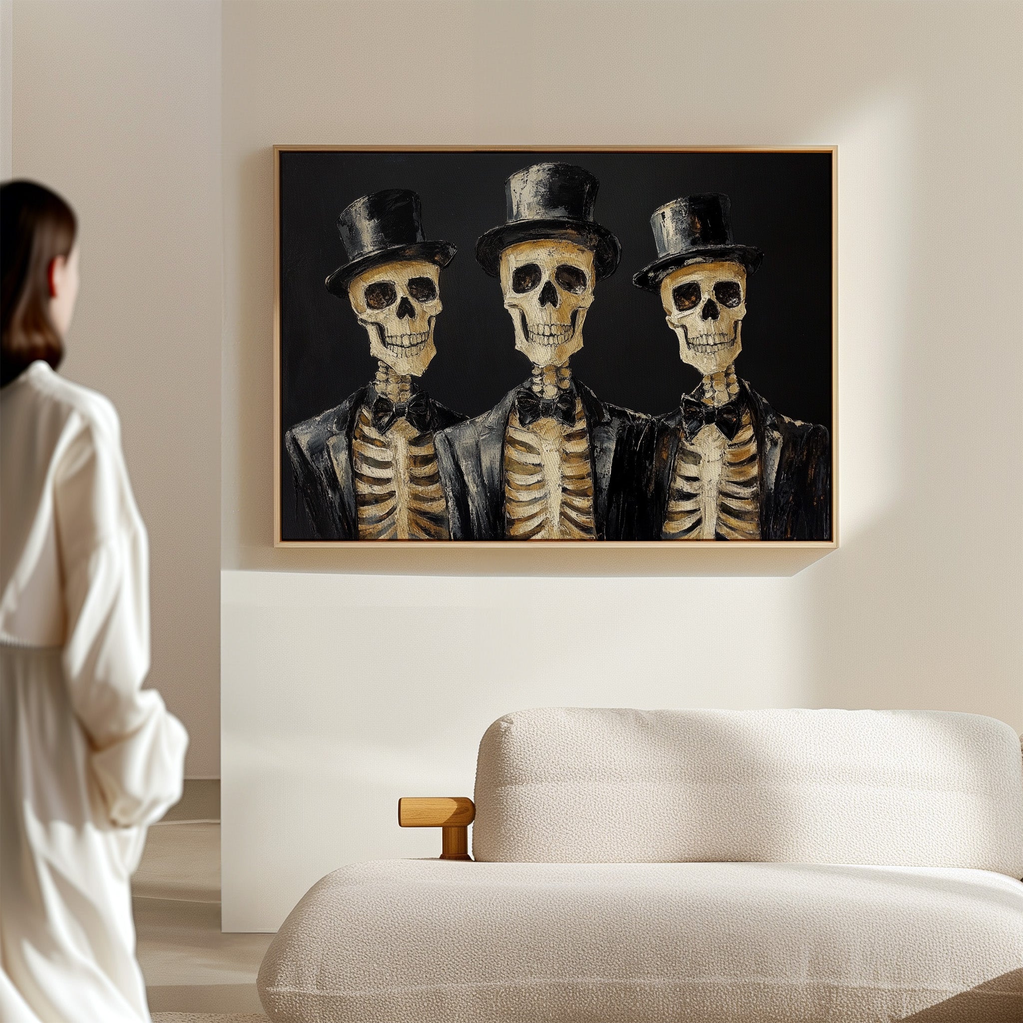 Three skeletal gentlemen stand with aristocratic poise, their top hats and bow ties a stark contrast to their macabre nature. The textured brushstrokes create depth in their formal attire, while ivory bones gleam against the deep black background. These distinguished figures merge Victorian elegance with gothic charm, their eternal grins suggesting both humor and mystery. Perfect for adding a sophisticated yet playful edge to a home office, creative studio, or as a striking focal point in a modern dining room.
