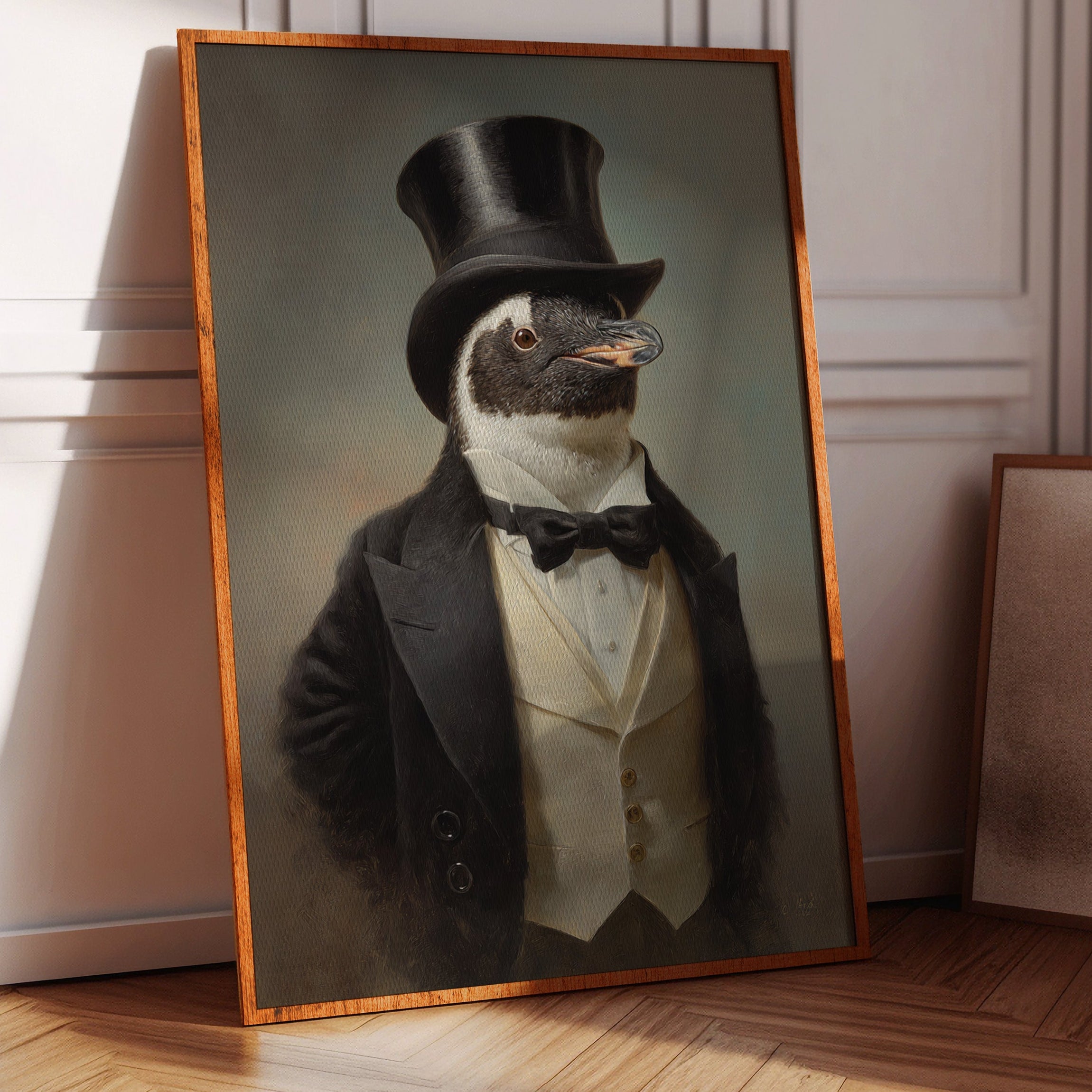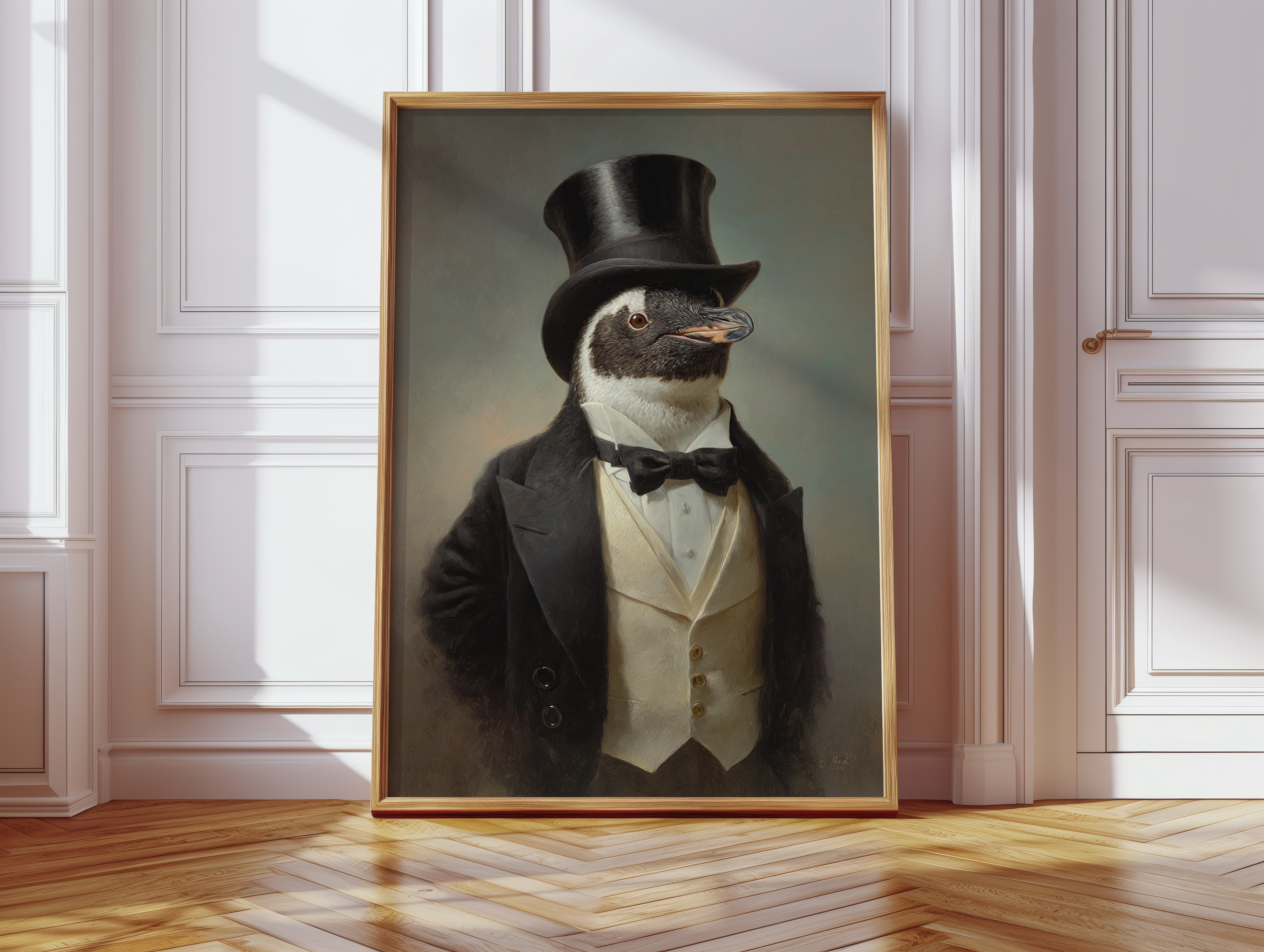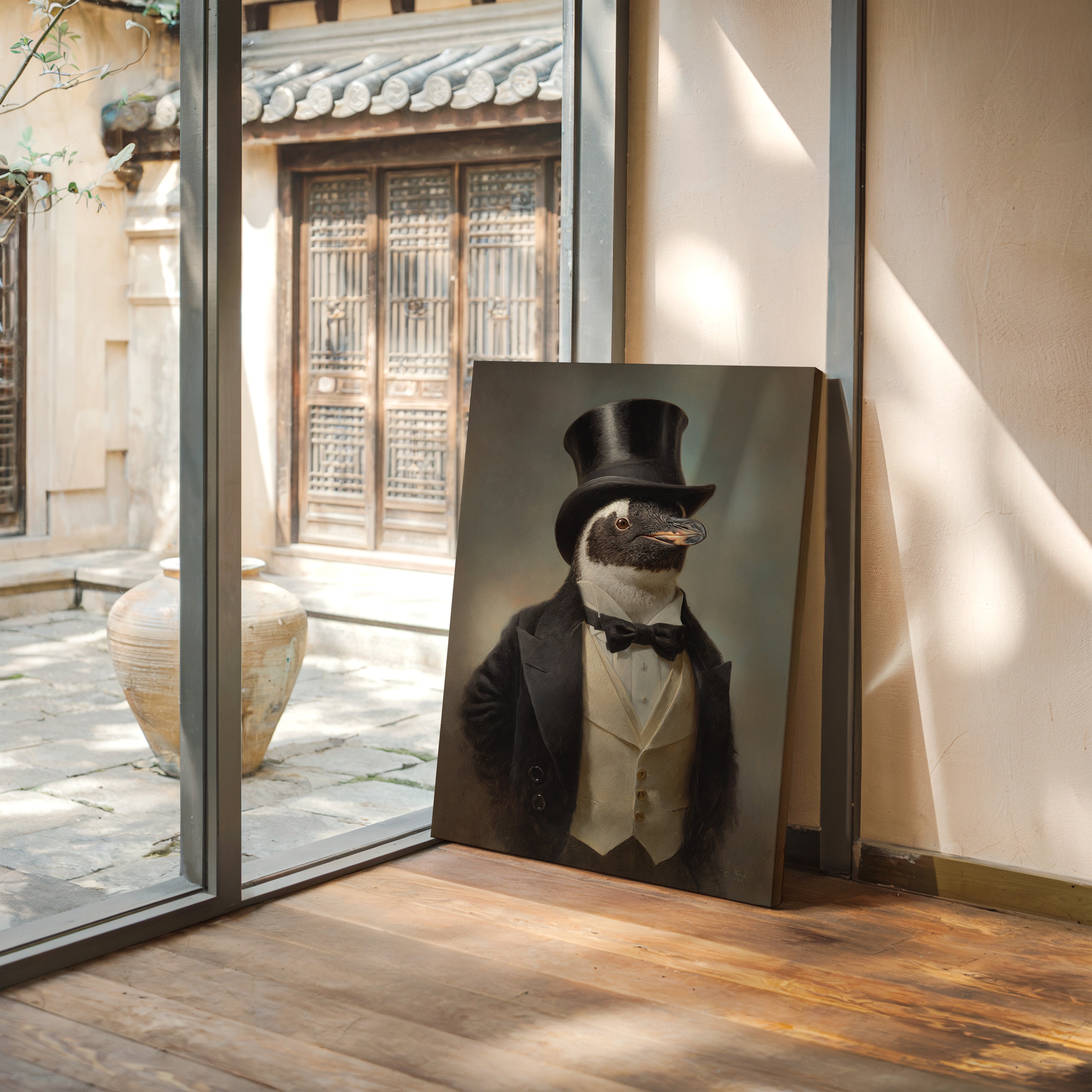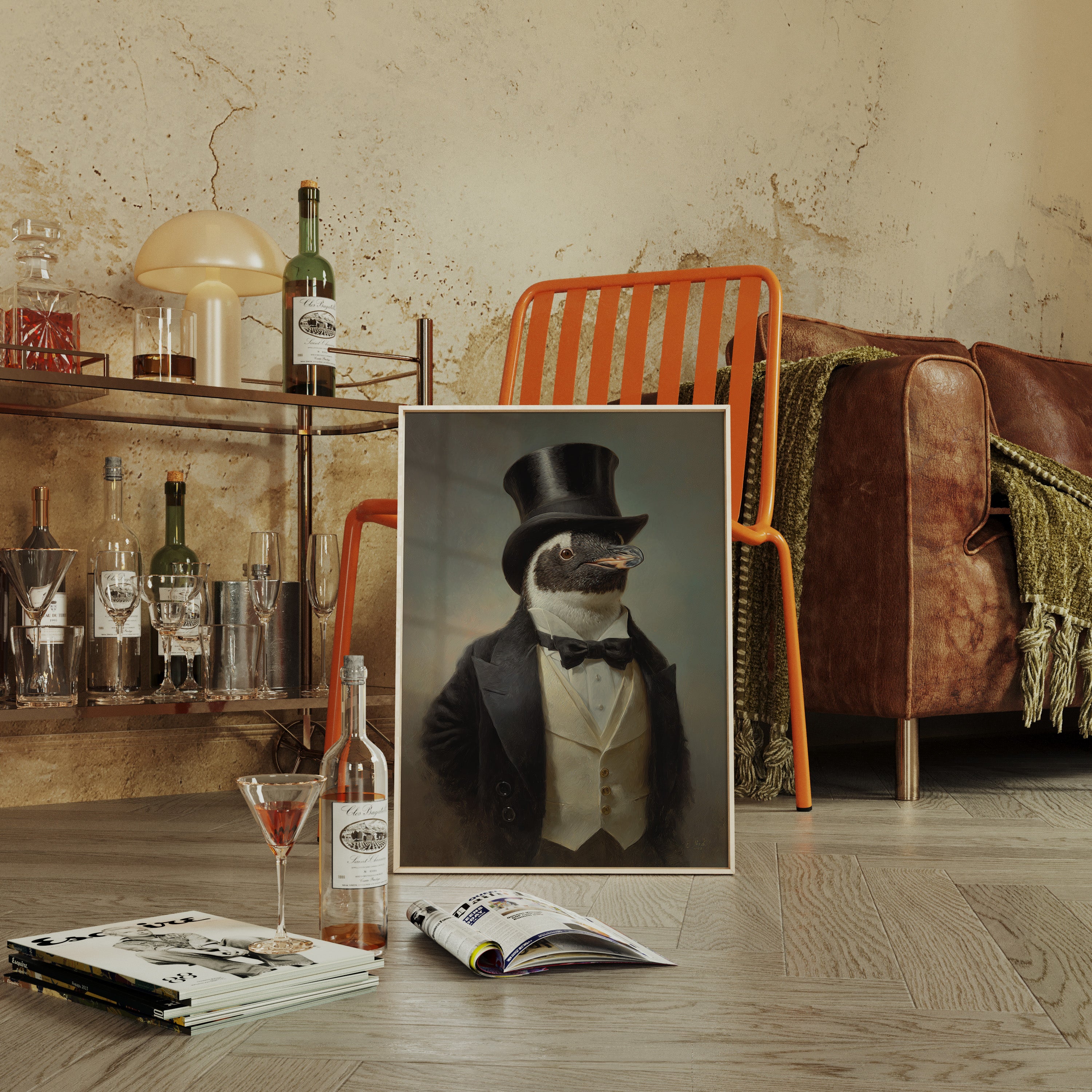 In a world where elegance meets whimsy, a penguin dons a top hat and tails, embodying a celebration of lifes quirks. This piece effortlessly marries humor with sophistication, reflecting the charm of the unexpected. Rich textures and warm tones bring the character to life, inviting smiles and sparking joy in any space. Perfect for a lounge or entryway, this artwork sets a playful yet refined tone for gatherings and conversations.
