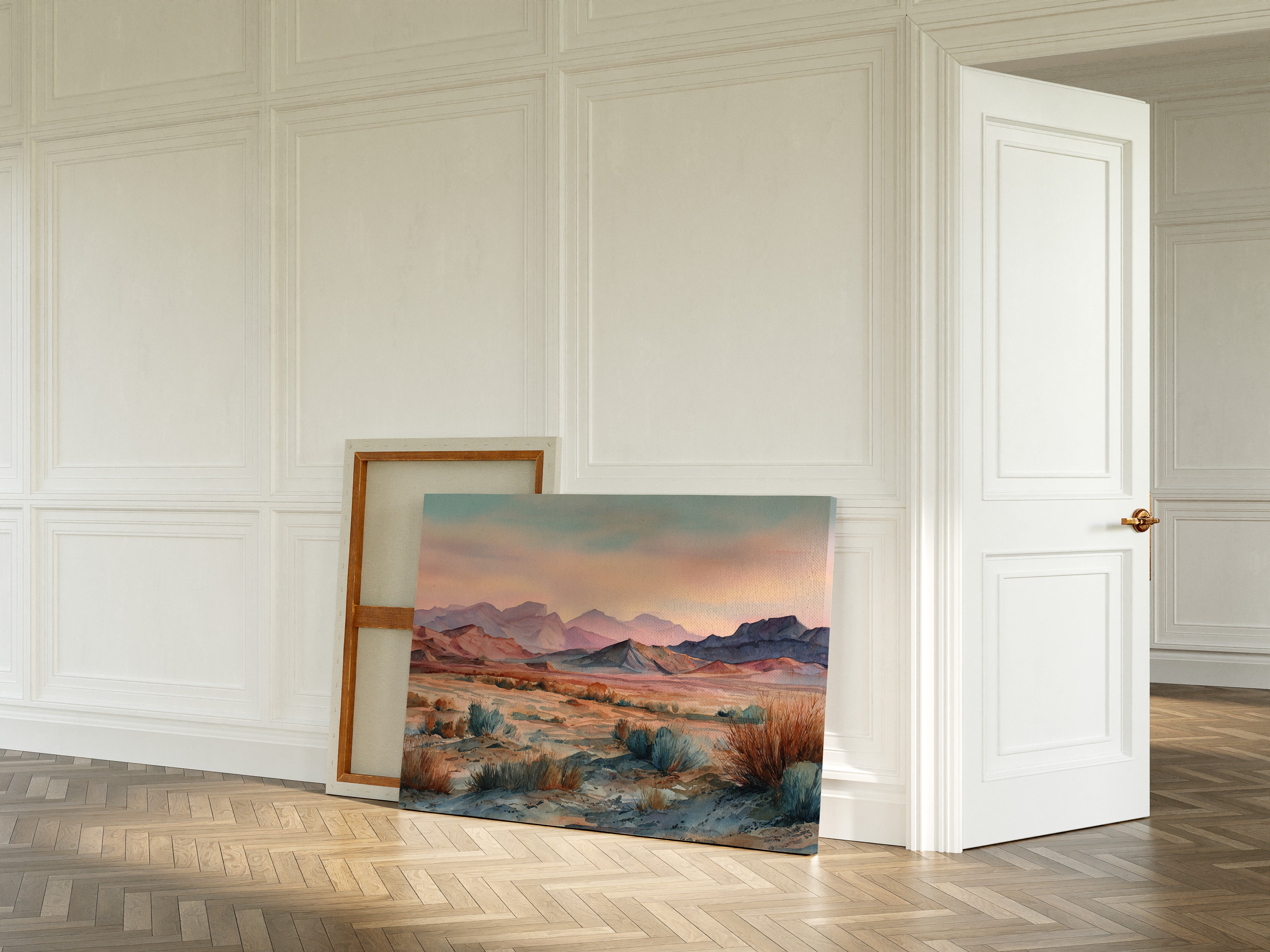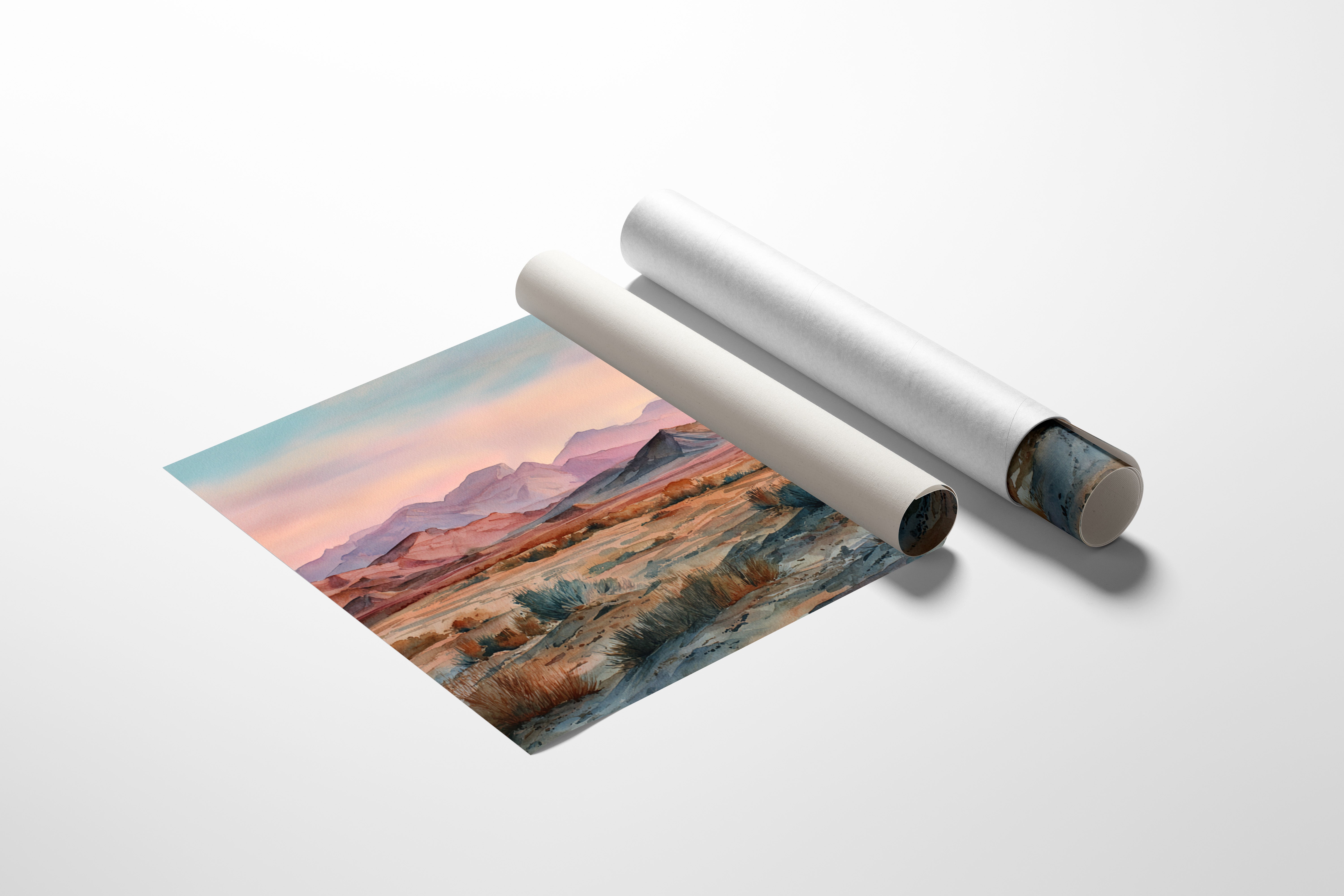 First light spills across the desert floor, painting the landscape in delicate washes of coral and rose. The rugged mountains rise like ancient guardians, their peaks softened by the morning's tender glow. Sage and desert brush dot the foreground in muted blues and rusty oranges, creating a natural rhythm across the sandy terrain. The watercolor technique captures the ethereal quality of daybreak, where cool shadows still linger in the valleys while warm light bathes the mountain ridges. This piece would bring a sense of expansive tranquility to a reading nook or meditation space, where its gentle palette can inspire moments of peaceful reflection.