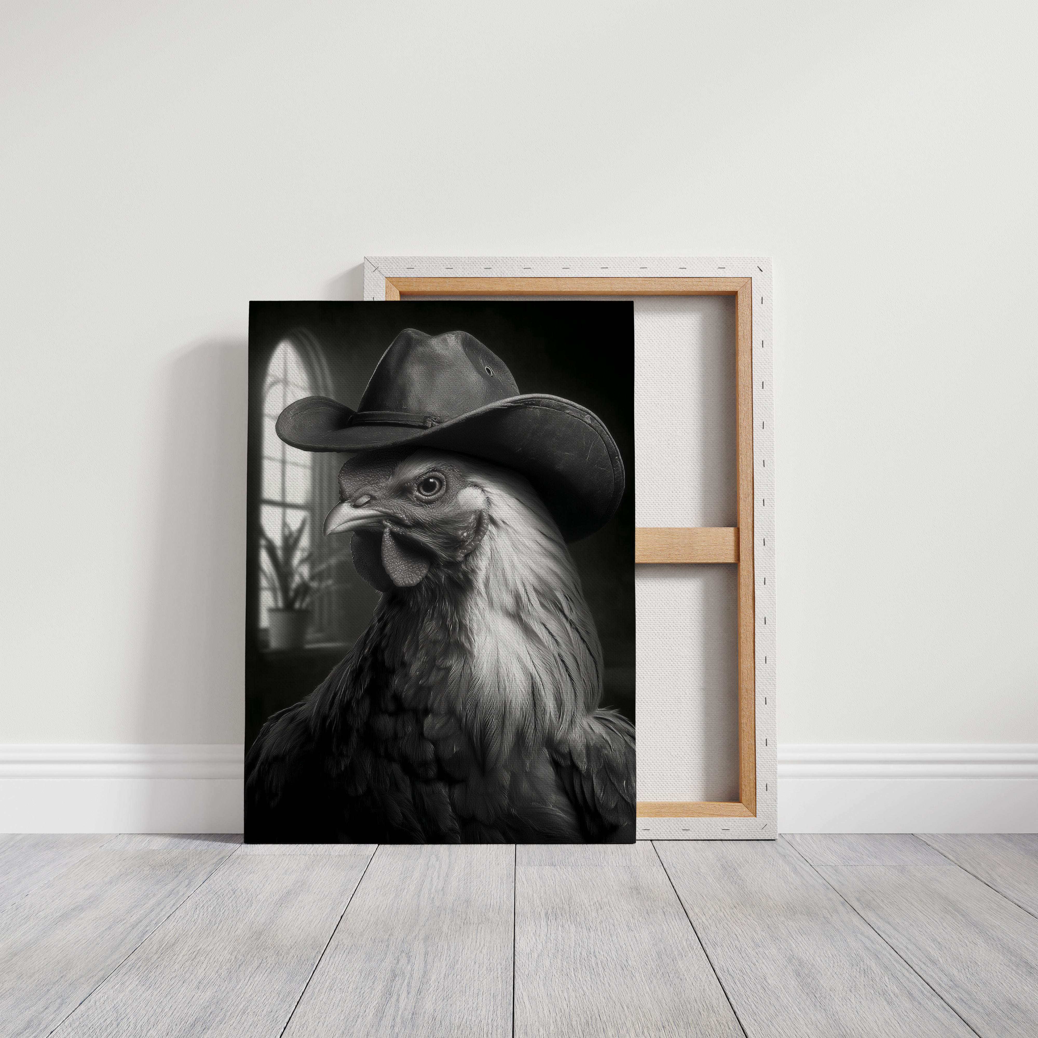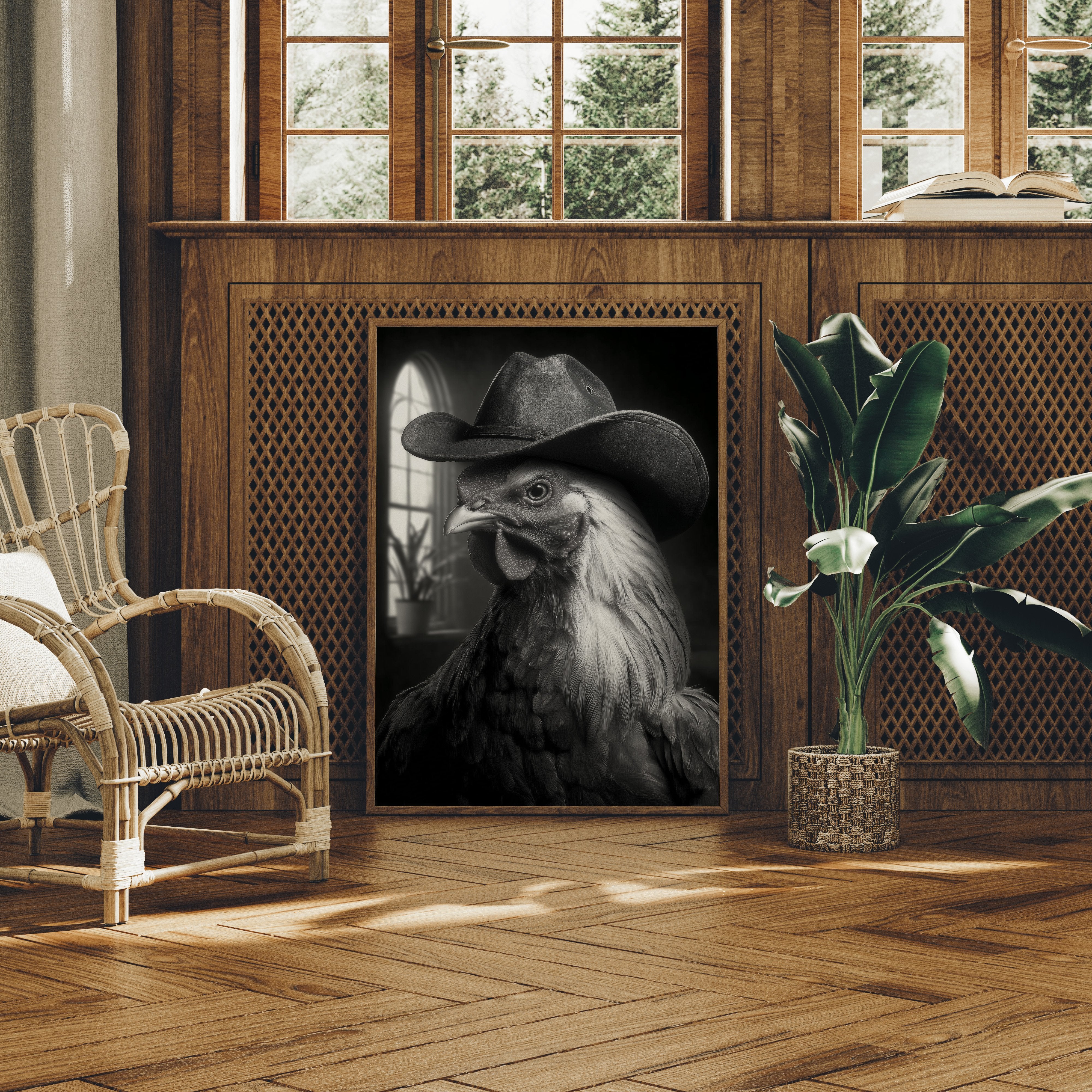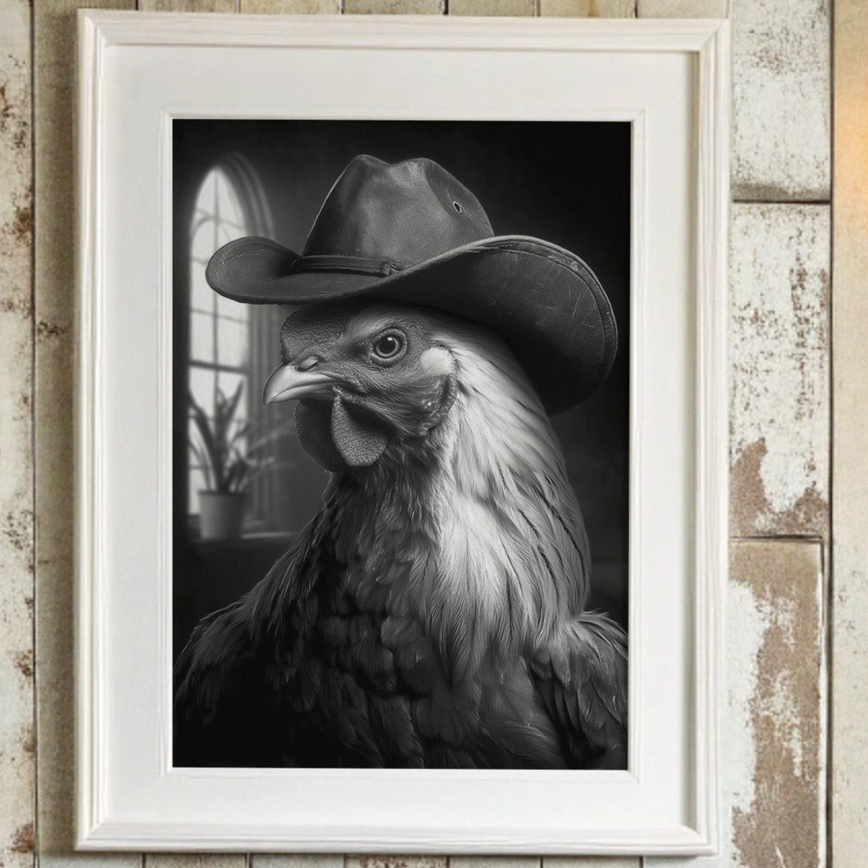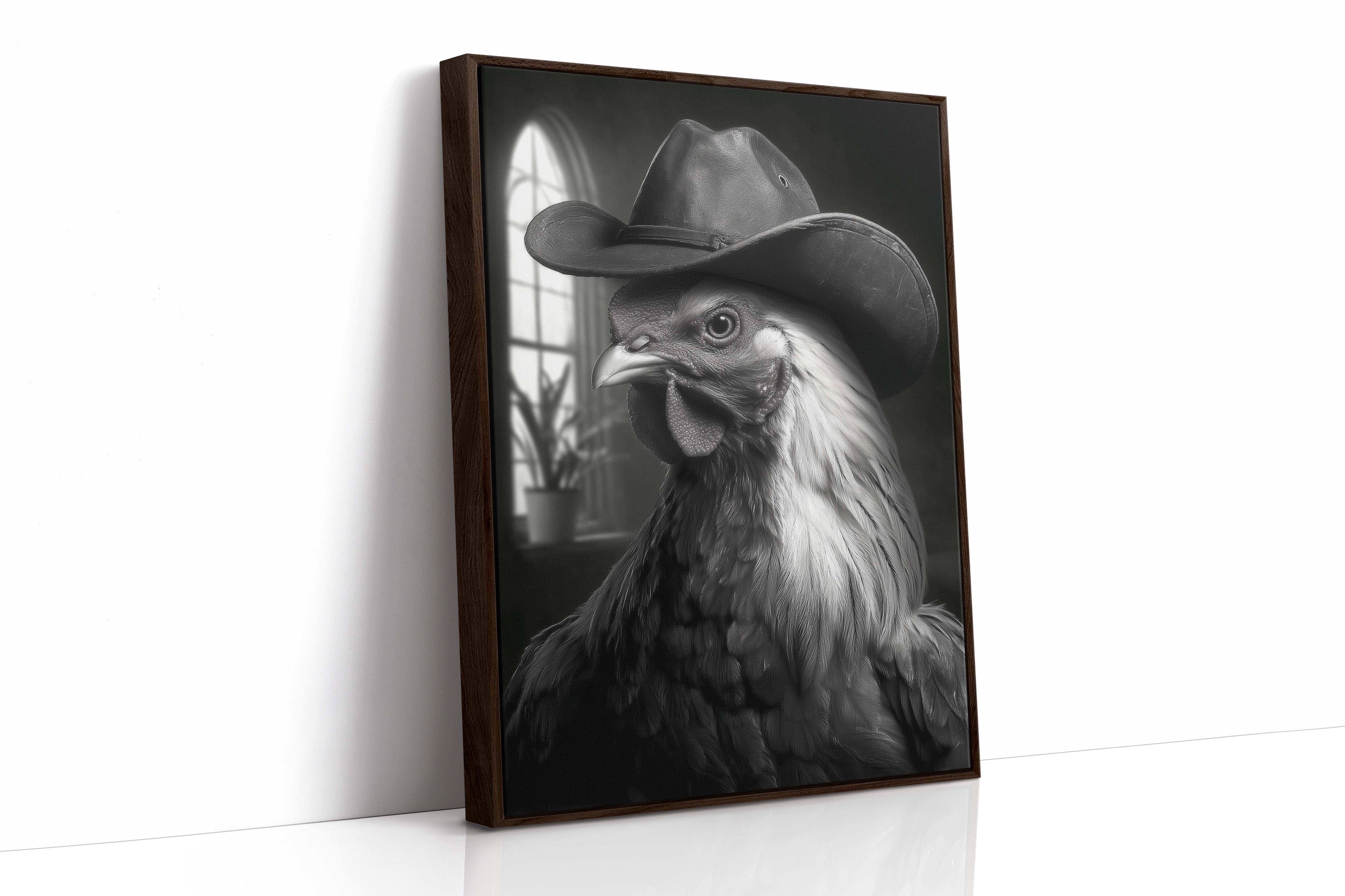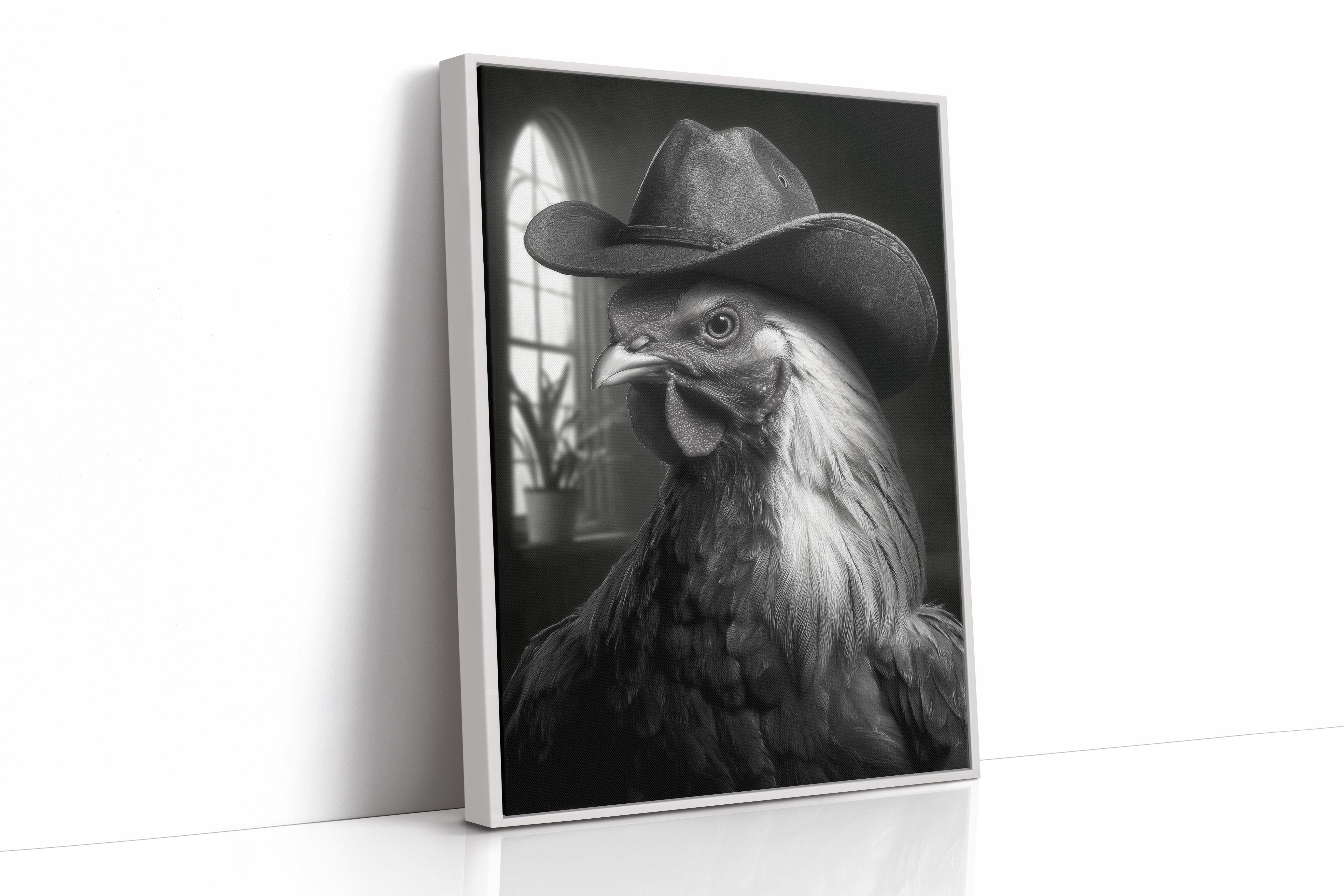 A dignified rooster stands proud in monochromatic majesty, his weathered cowboy hat tilted just so against the soft morning light. This striking portrait from our Contemporary collection reimagines farmyard nobility with a touch of whimsy and Western charm. The intricate detail of each feather catches the light differently, creating a symphony of textures that dance between light and shadow, while the window's glow creates an almost ethereal backdrop for this unlikely cowboy. Perfect for adding a conversation-starting focal point to a modern farmhouse kitchen or bringing unexpected character to a rustic dining room. This piece invites viewers to see the extraordinary in the ordinary, transforming a humble rooster into an icon of pastoral elegance.