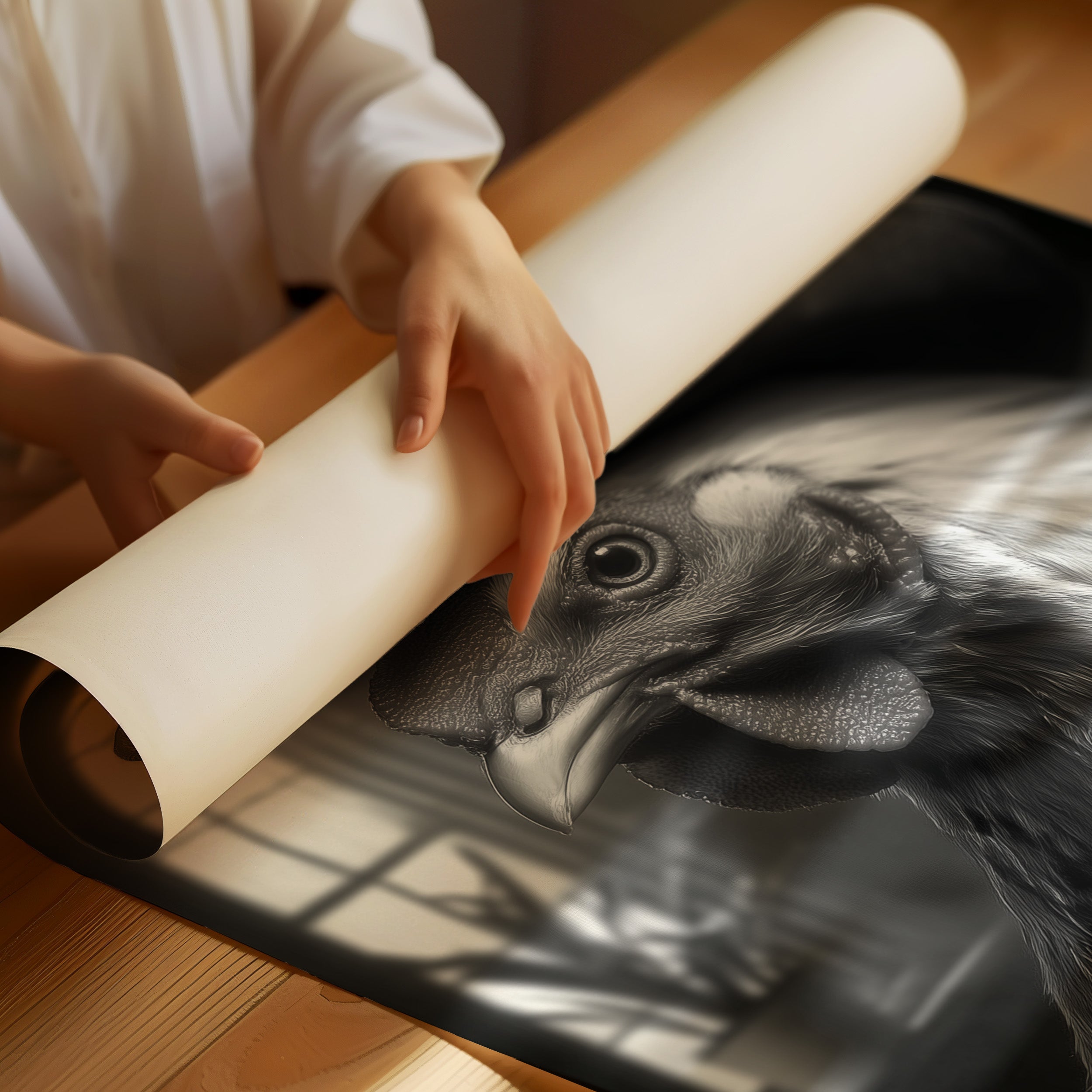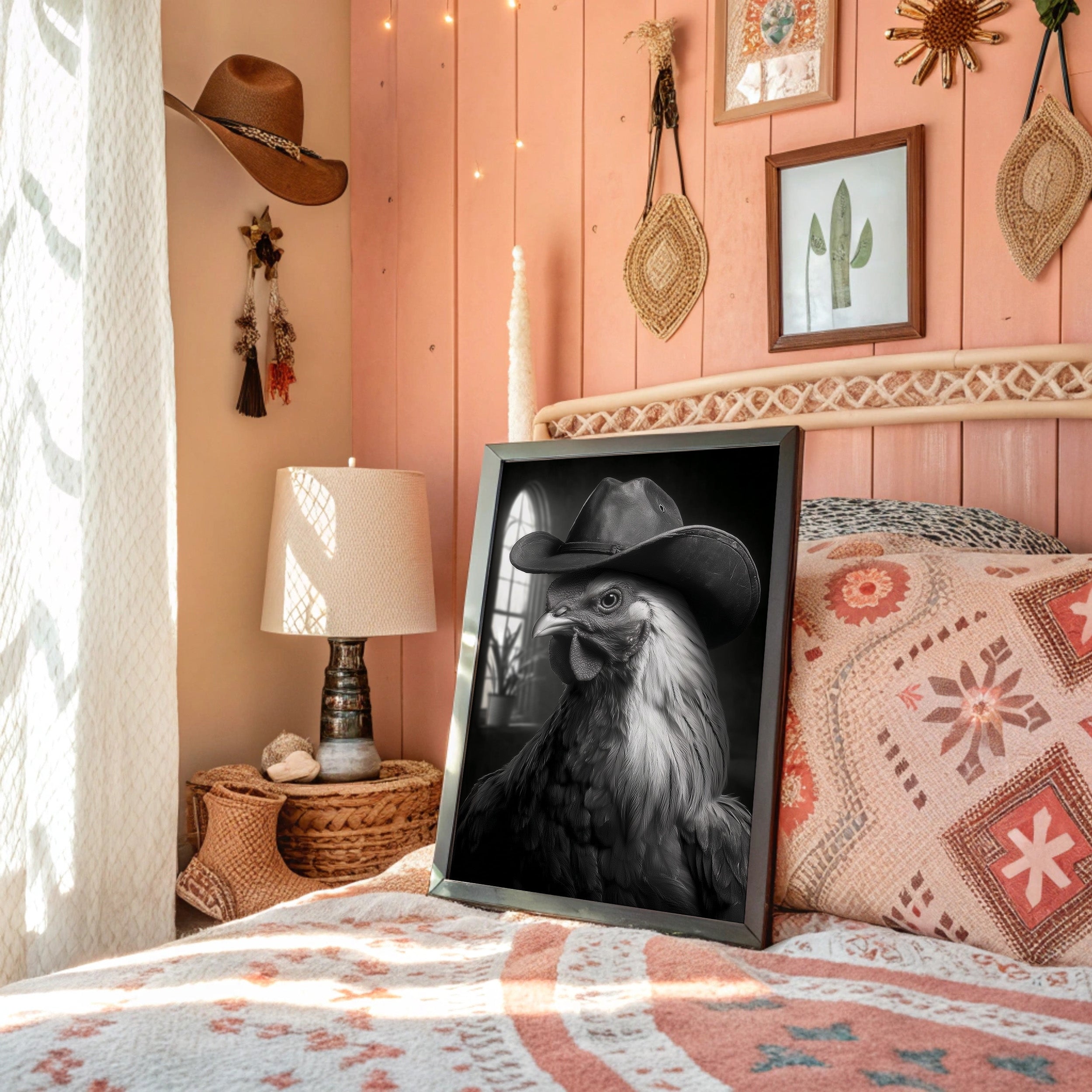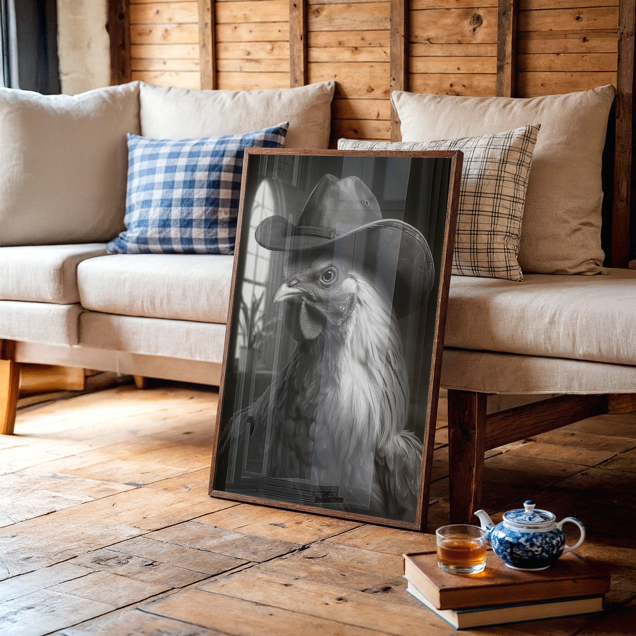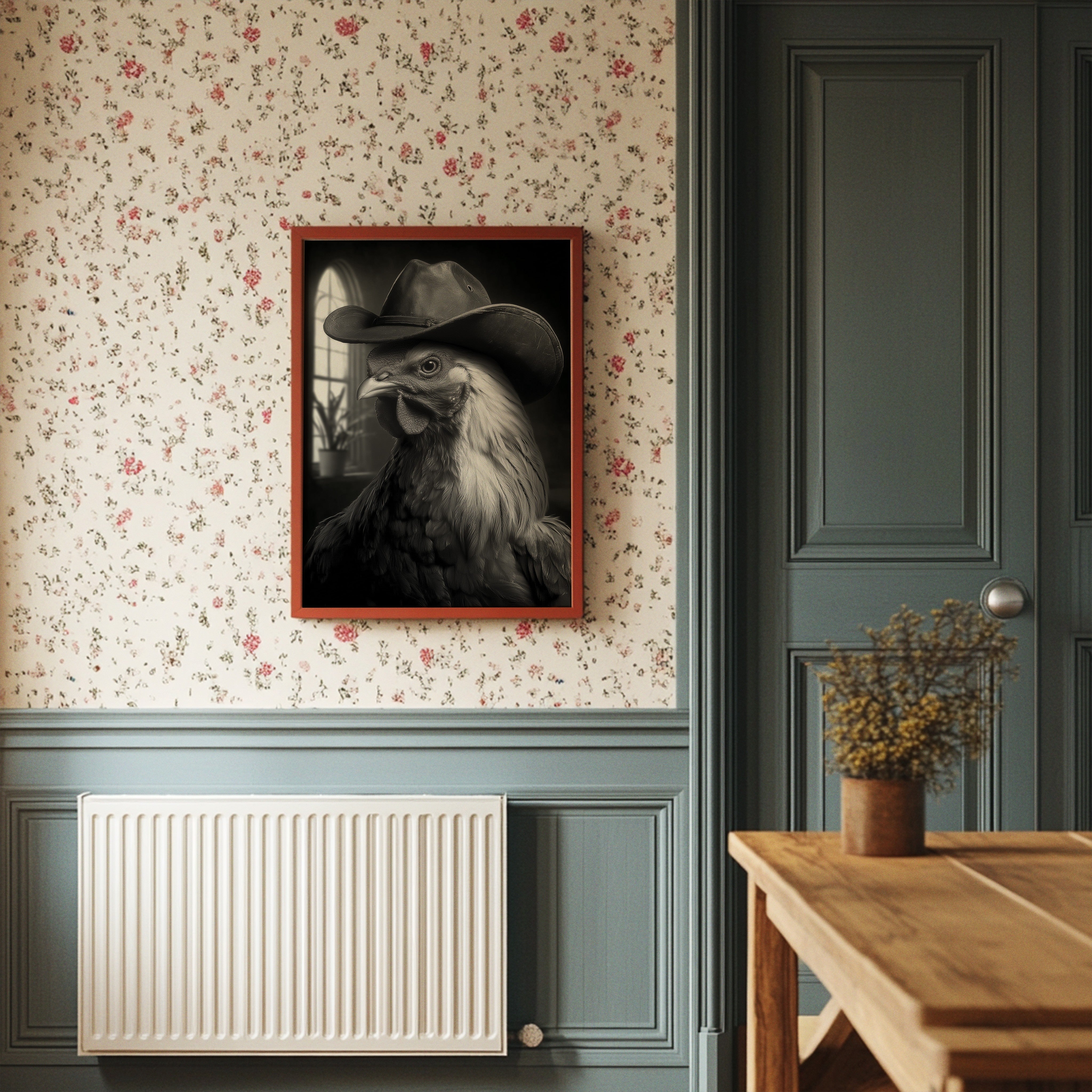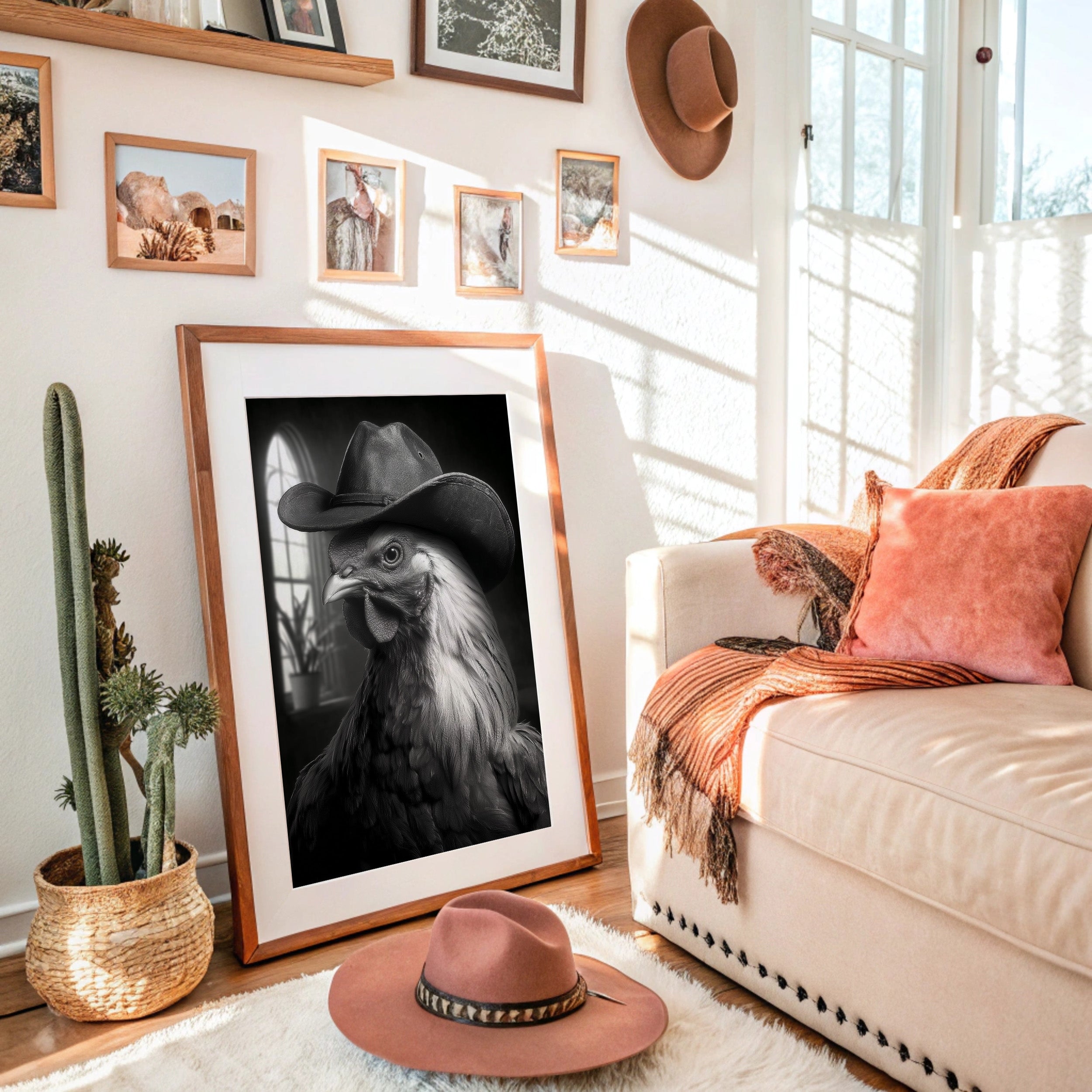 A dignified rooster stands proud in monochromatic majesty, his weathered cowboy hat tilted just so against the soft morning light. This striking portrait from our Contemporary collection reimagines farmyard nobility with a touch of whimsy and Western charm. The intricate detail of each feather catches the light differently, creating a symphony of textures that dance between light and shadow, while the window's glow creates an almost ethereal backdrop for this unlikely cowboy. Perfect for adding a conversation-starting focal point to a modern farmhouse kitchen or bringing unexpected character to a rustic dining room. This piece invites viewers to see the extraordinary in the ordinary, transforming a humble rooster into an icon of pastoral elegance.