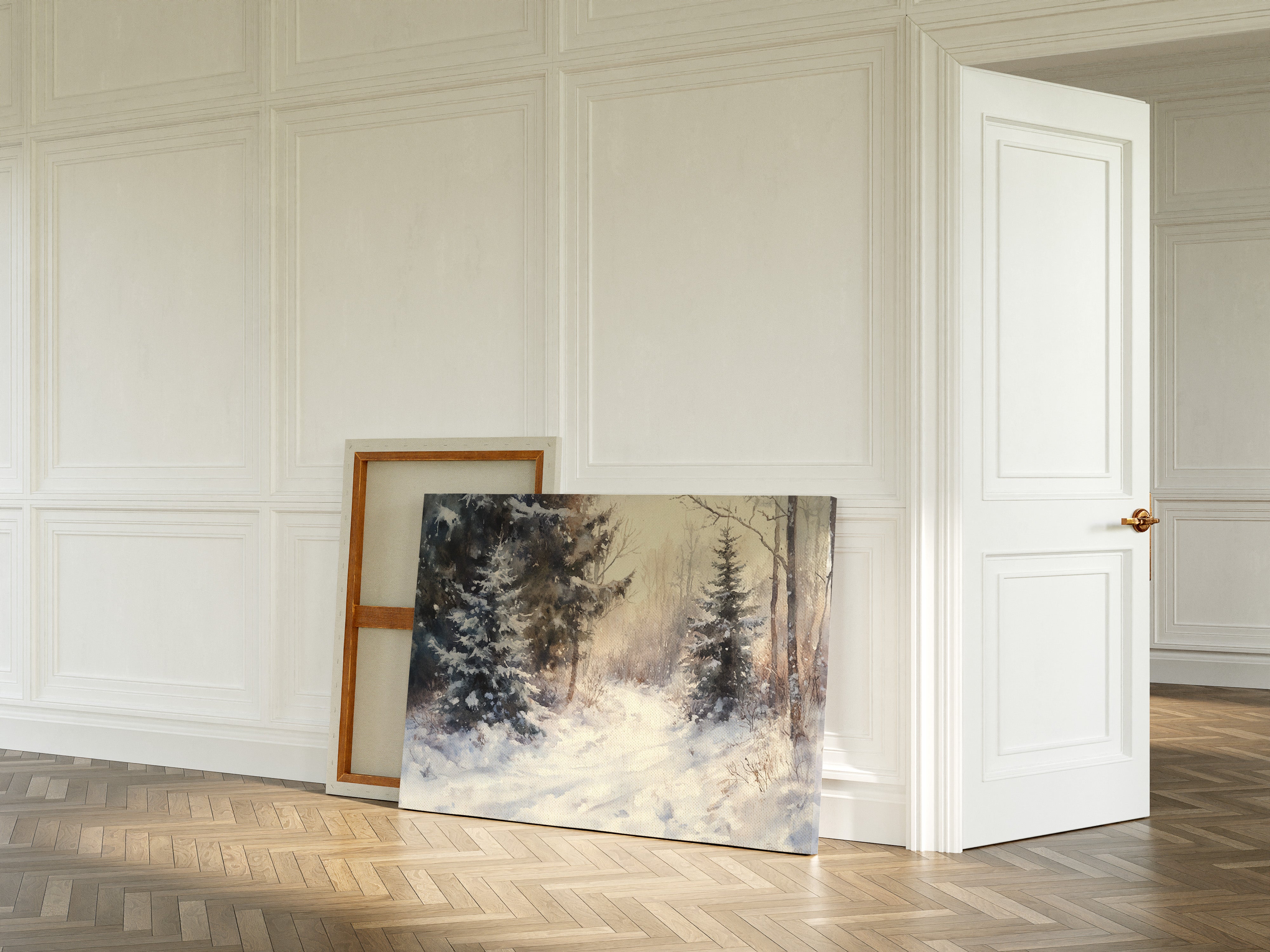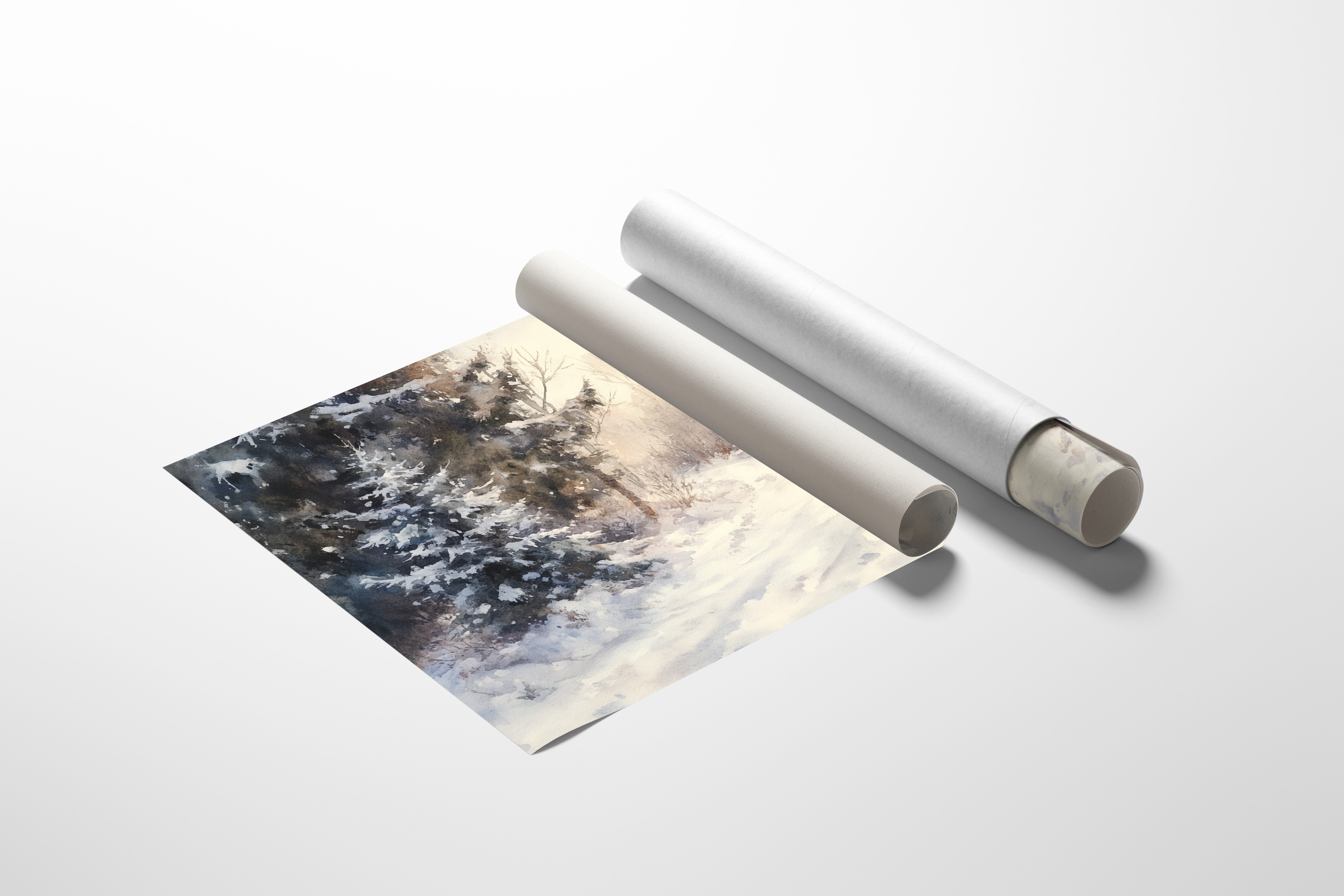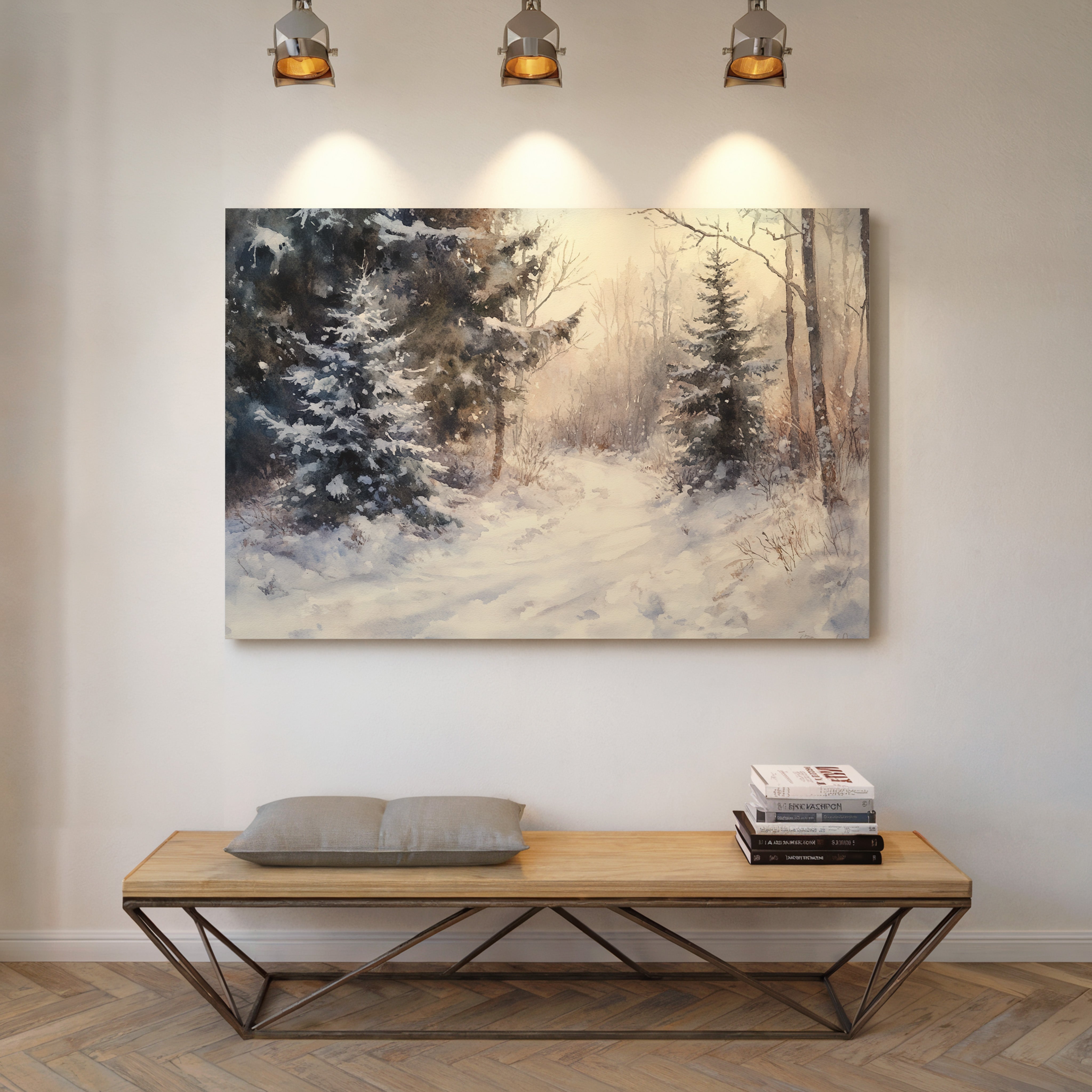 Fresh snow blankets the winding forest path, each step promising adventure in the hushed winter wonderland. Evergreen sentinels stand draped in white, their branches heavy with nature's quiet gift, while golden morning light filters through the misty air. The delicate watercolor technique captures the ethereal quality of winter, where deep blues and purples of the sheltered forest give way to warm, creamy highlights along the sunlit trail. This peaceful scene would bring a sense of seasonal serenity to a reading nook or bedroom, inviting quiet contemplation of winter's gentle beauty.