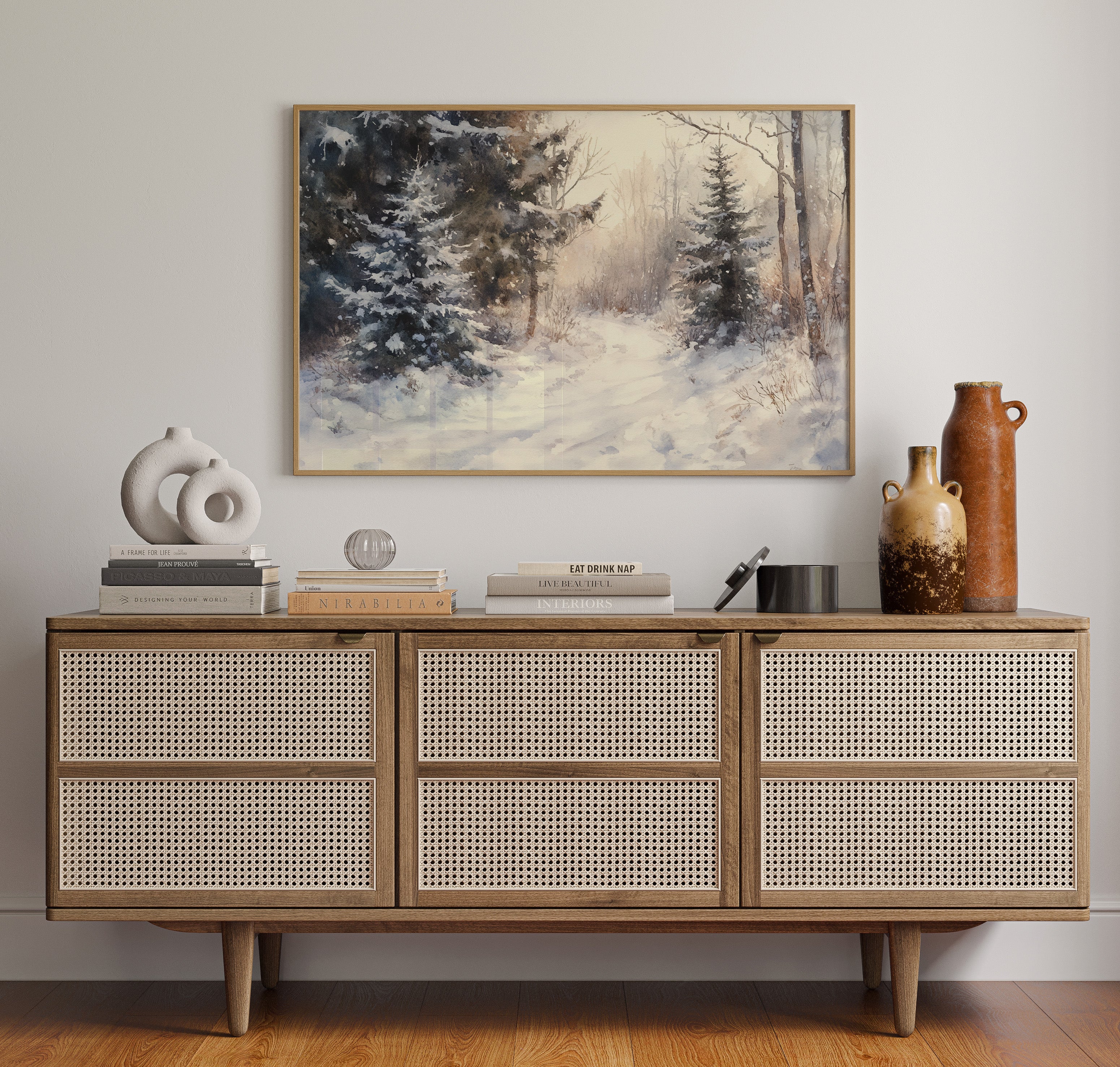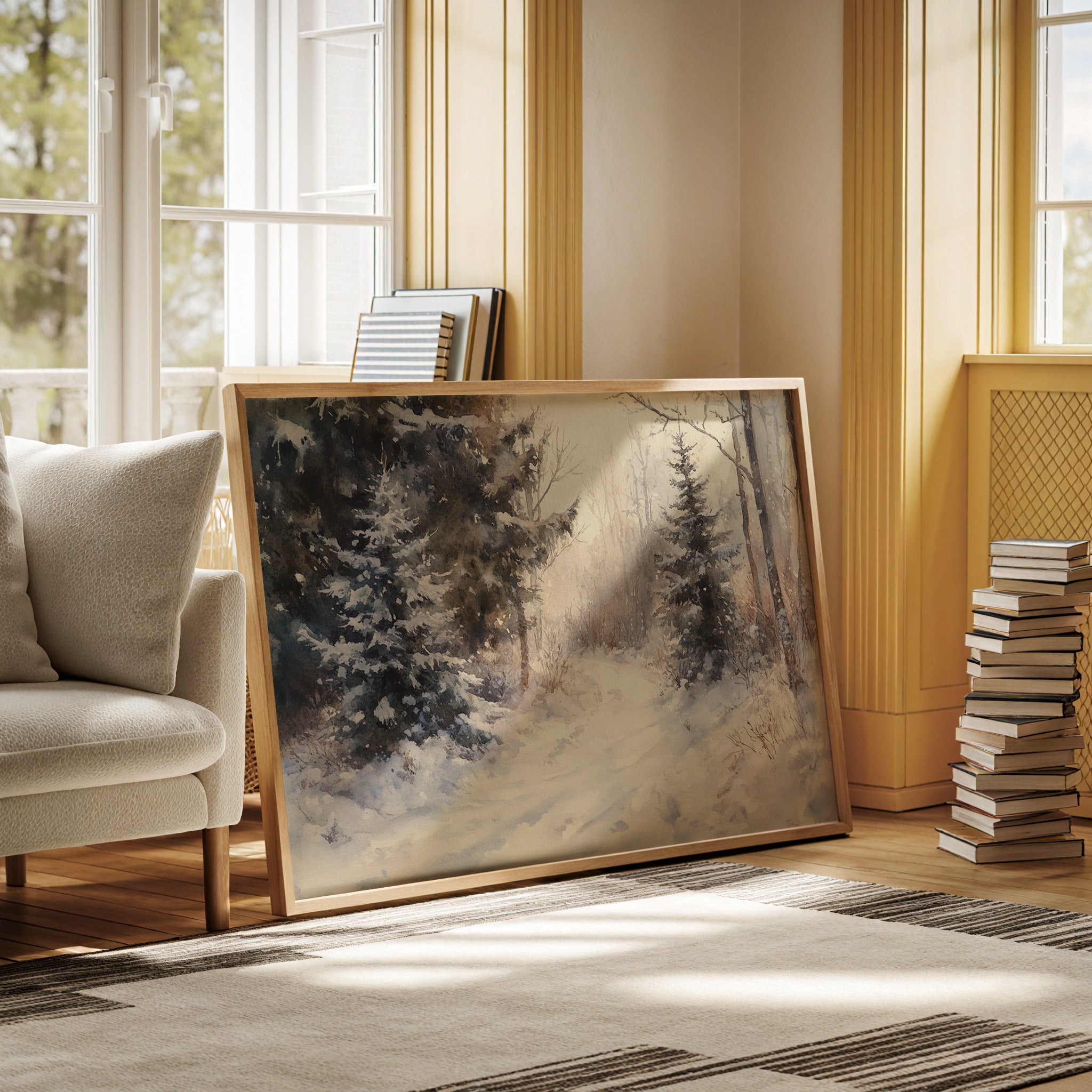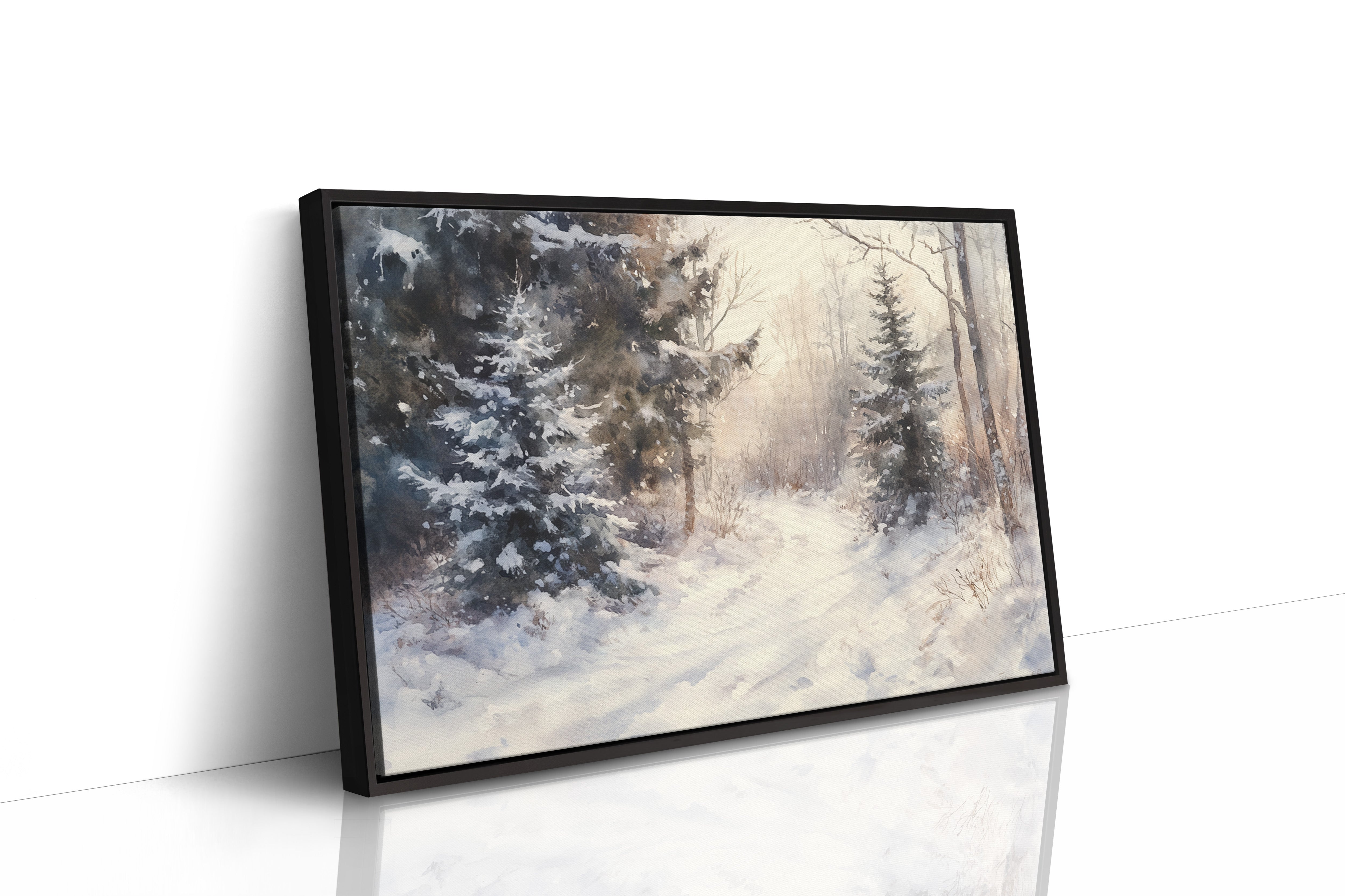 Fresh snow blankets the winding forest path, each step promising adventure in the hushed winter wonderland. Evergreen sentinels stand draped in white, their branches heavy with nature's quiet gift, while golden morning light filters through the misty air. The delicate watercolor technique captures the ethereal quality of winter, where deep blues and purples of the sheltered forest give way to warm, creamy highlights along the sunlit trail. This peaceful scene would bring a sense of seasonal serenity to a reading nook or bedroom, inviting quiet contemplation of winter's gentle beauty.