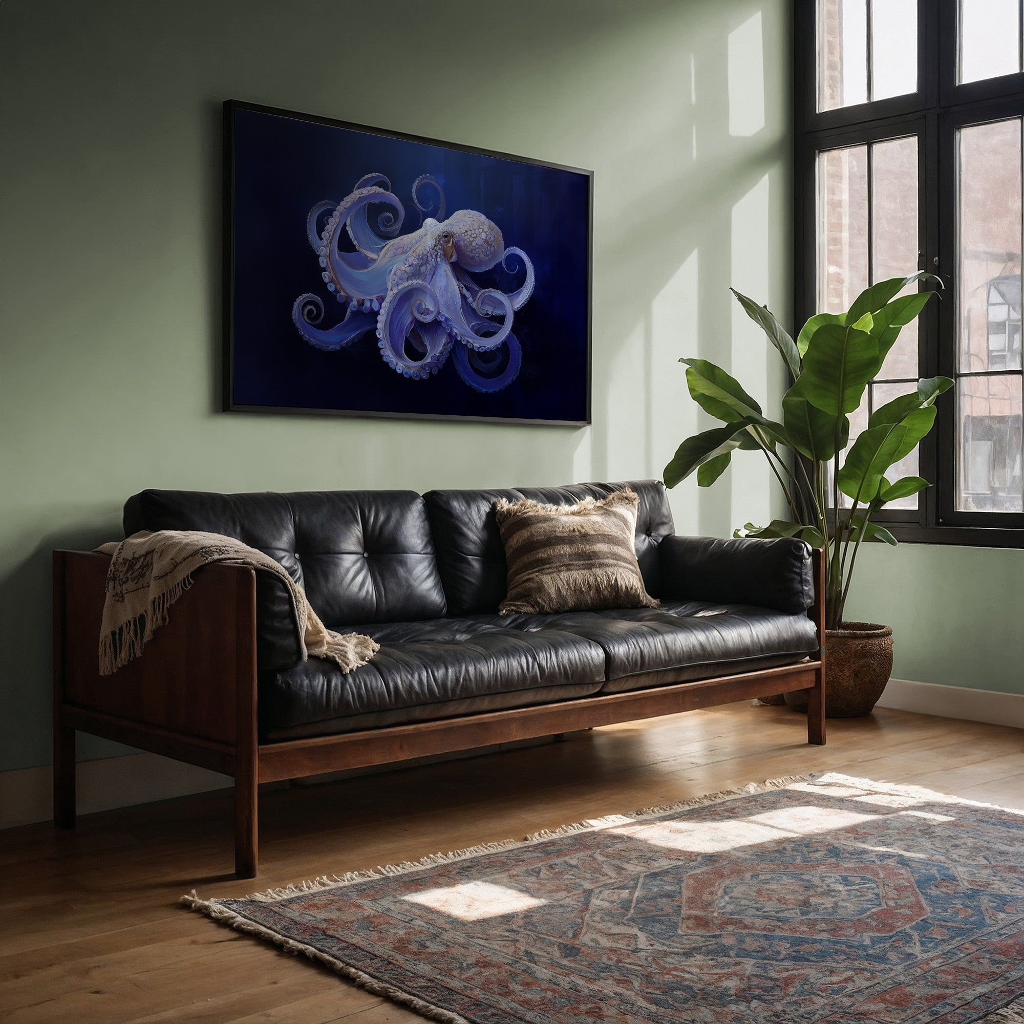 Luminous tentacles curl through midnight waters, suspended in a moment of graceful motion. The octopus's pearlescent body glows against the indigo depths, its intelligent eye watching from another world as tendrils spiral outward in a hypnotic ballet of biology and artistry. The rich contrast between the creature's lavender-white form and the mysterious dark blue background creates a portal-like effect, drawing viewers into the ocean's silent poetry. This striking marine portrait brings sophisticated drama to living rooms, dining areas, or creative workspaces seeking a touch of elegant wonder.