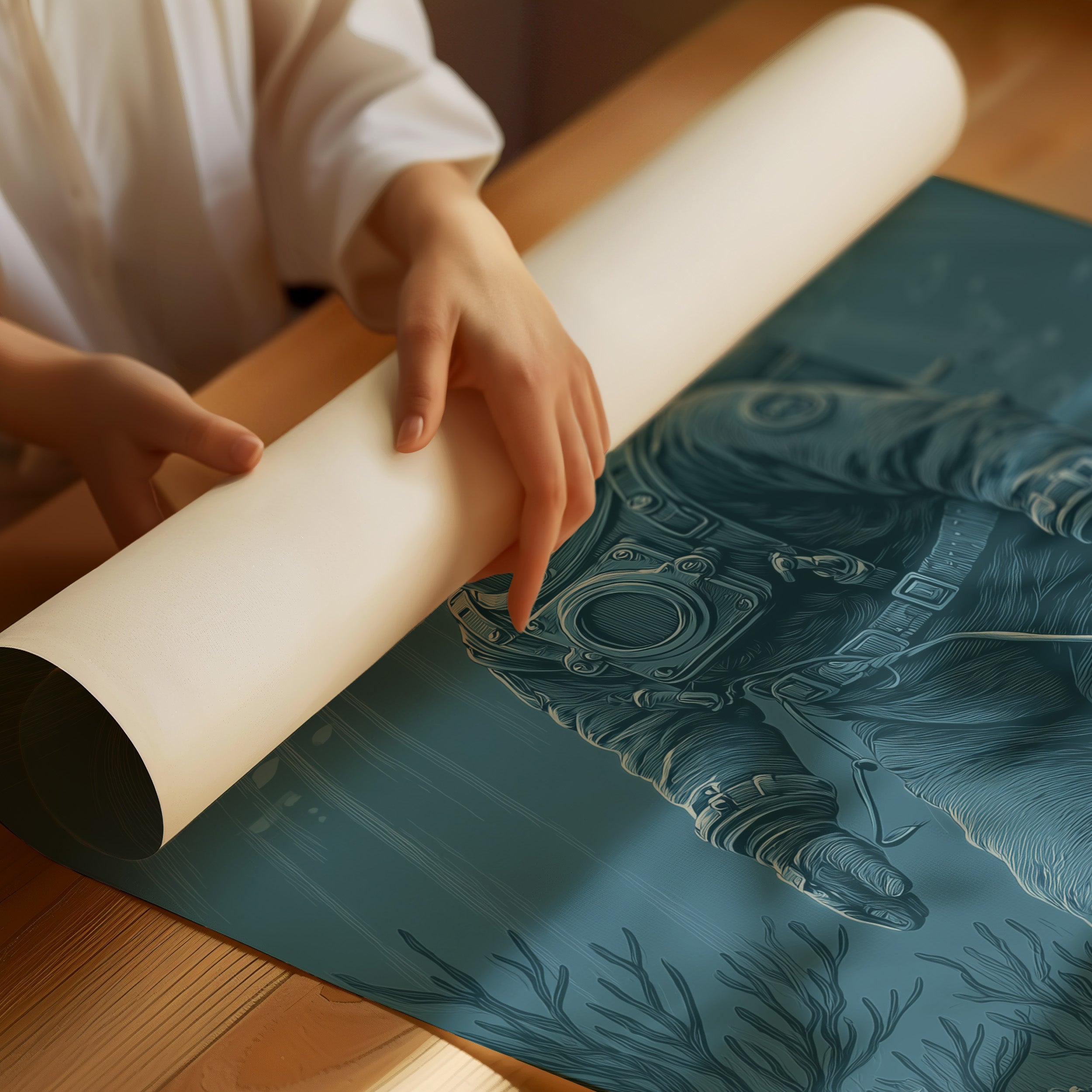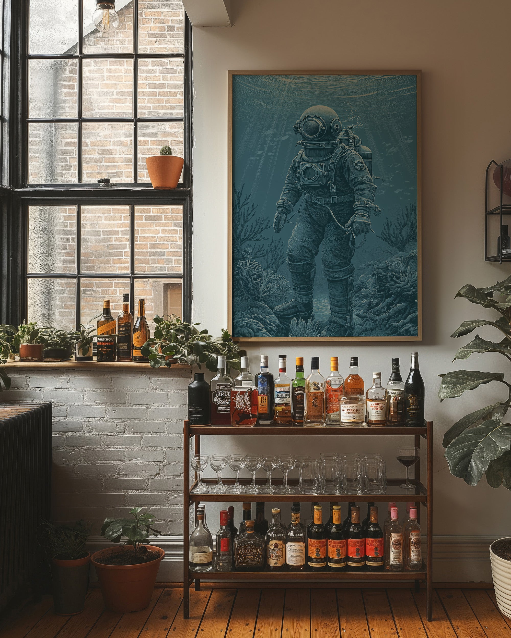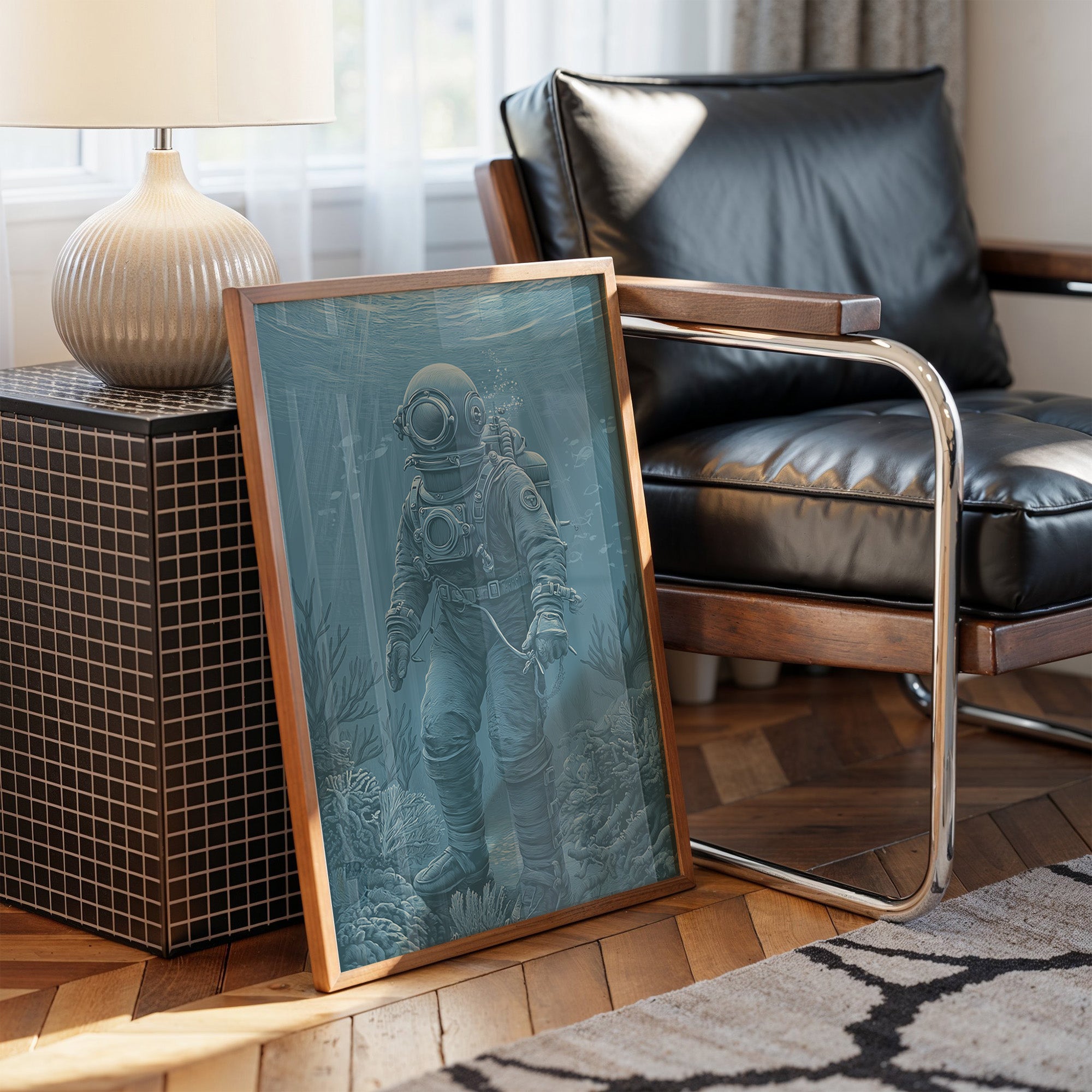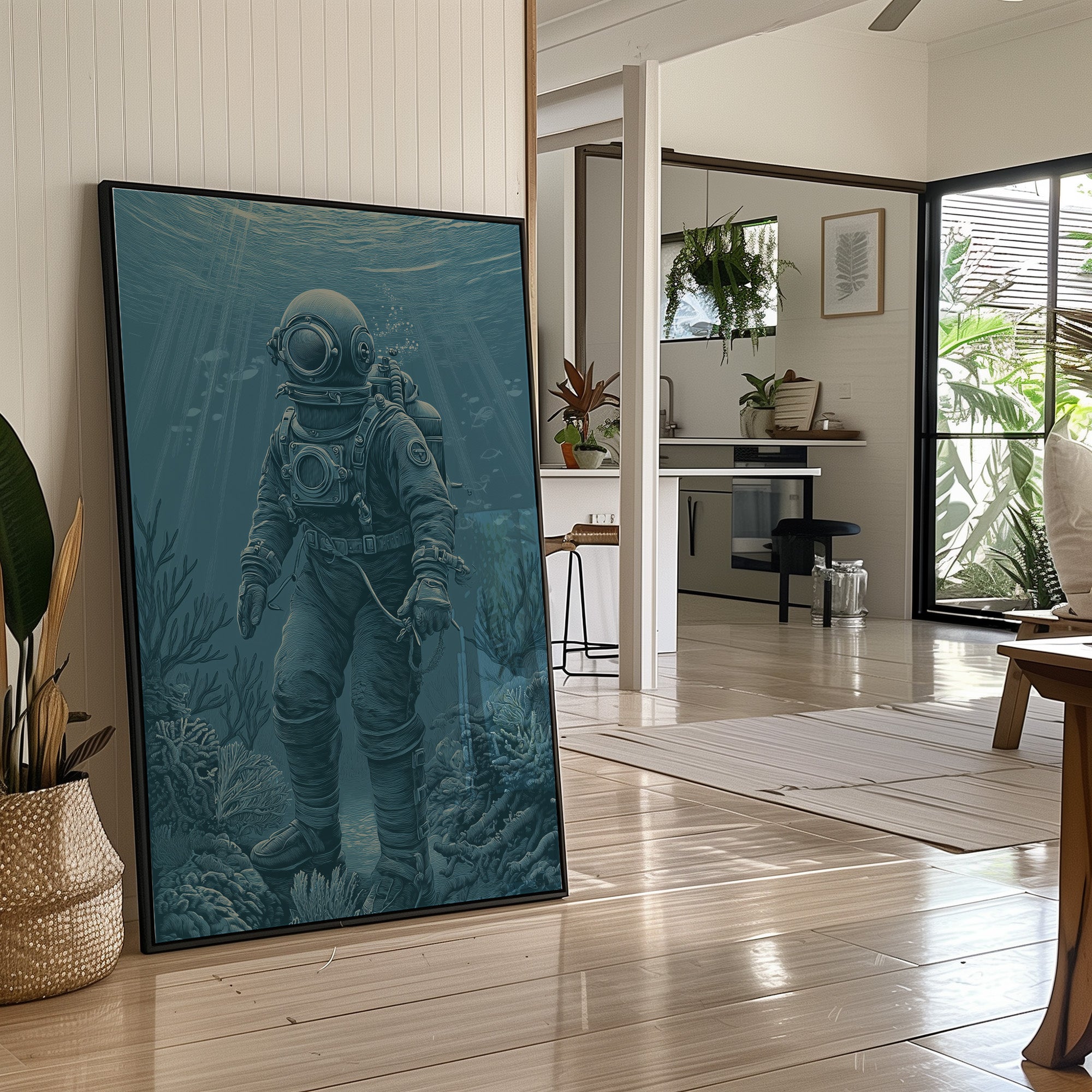 Sunlight dances across the wooden frame, illuminating a world where time stands still beneath aquamarine depths. A vintage diver, helmet gleaming with quiet determination, stands sentinel among swaying coral and forgotten seafloor secrets. The monochromatic teal tones create a nostalgic underwater dreamscape, merging historical adventure with tranquil underwater solitude. This piece brings sophisticated nautical charm to a modern living space, perfectly balancing contemporary furnishings with a touch of maritime mystique.
